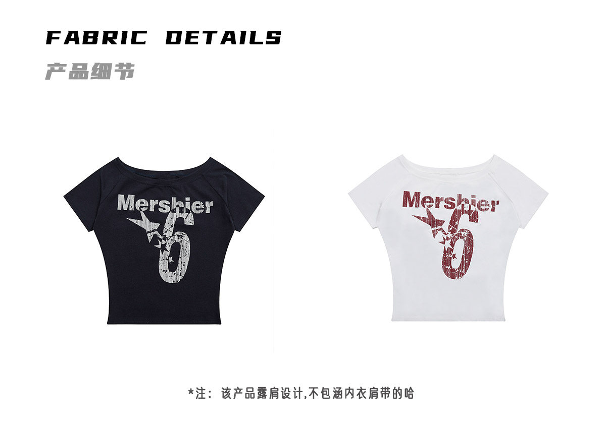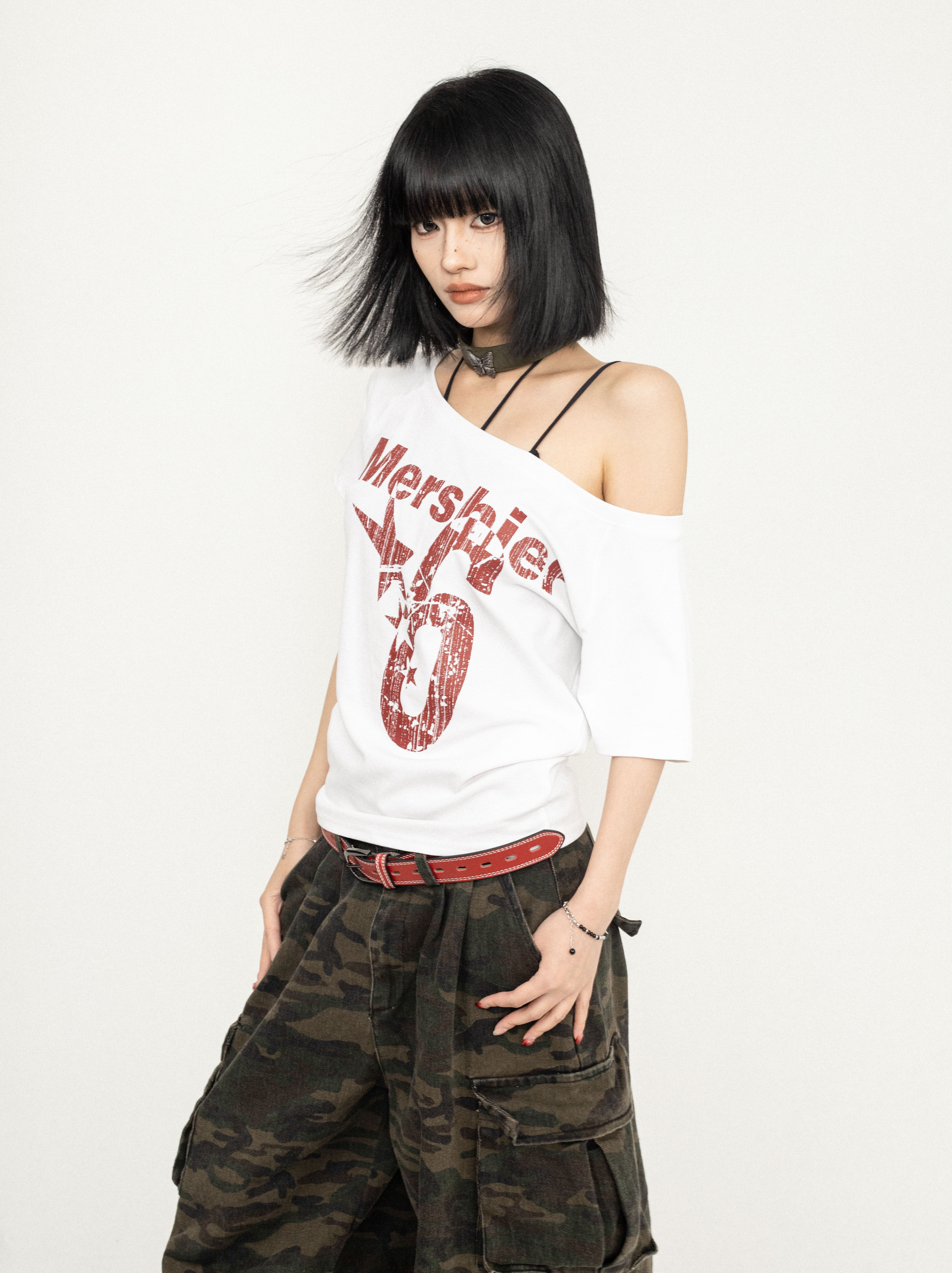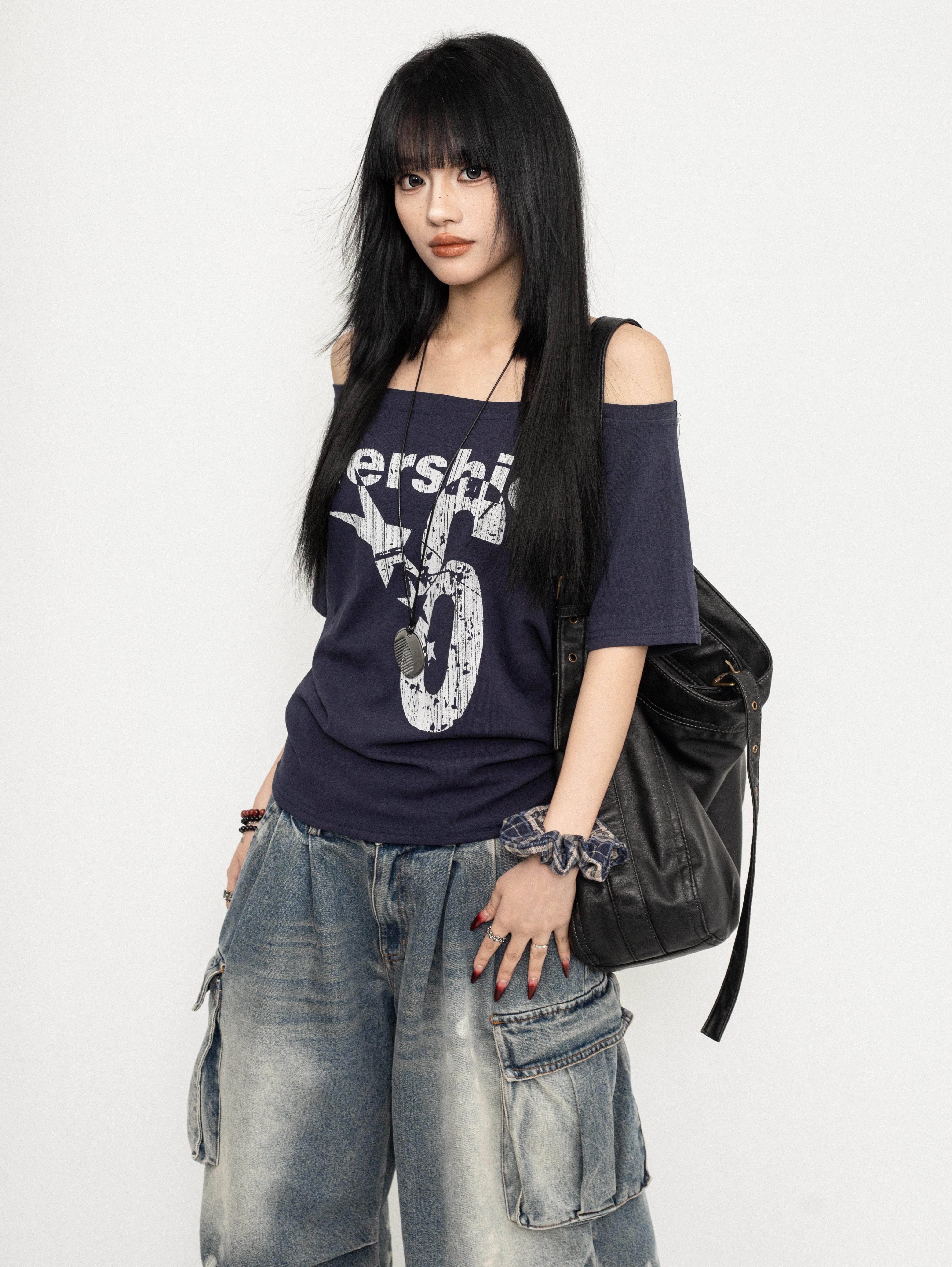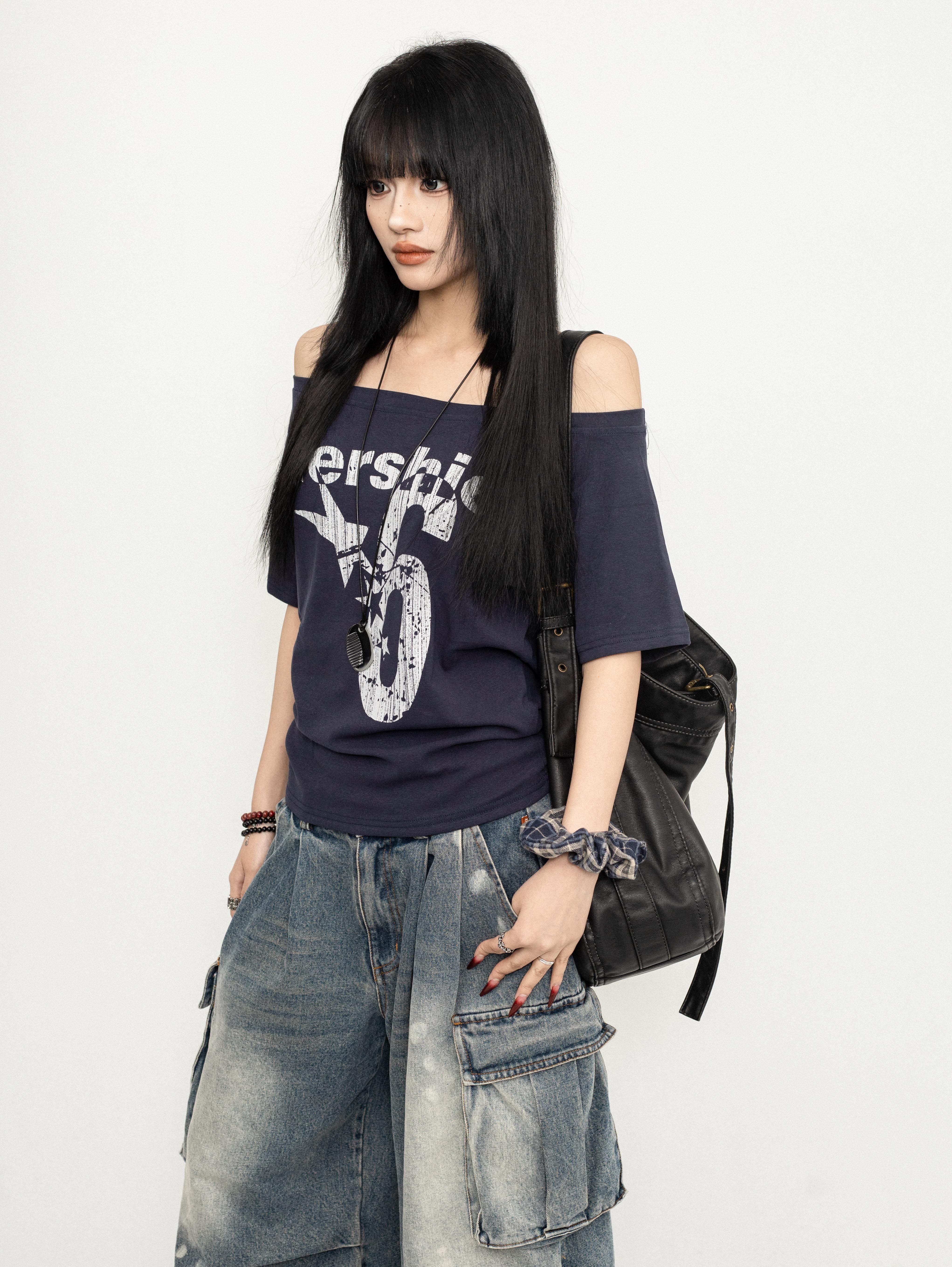 Octtflab/American Retro One-Shoulder Off-Shoulder Top Loose Sexy Short T-Shirt for Women 2025 New Short-Sleeve