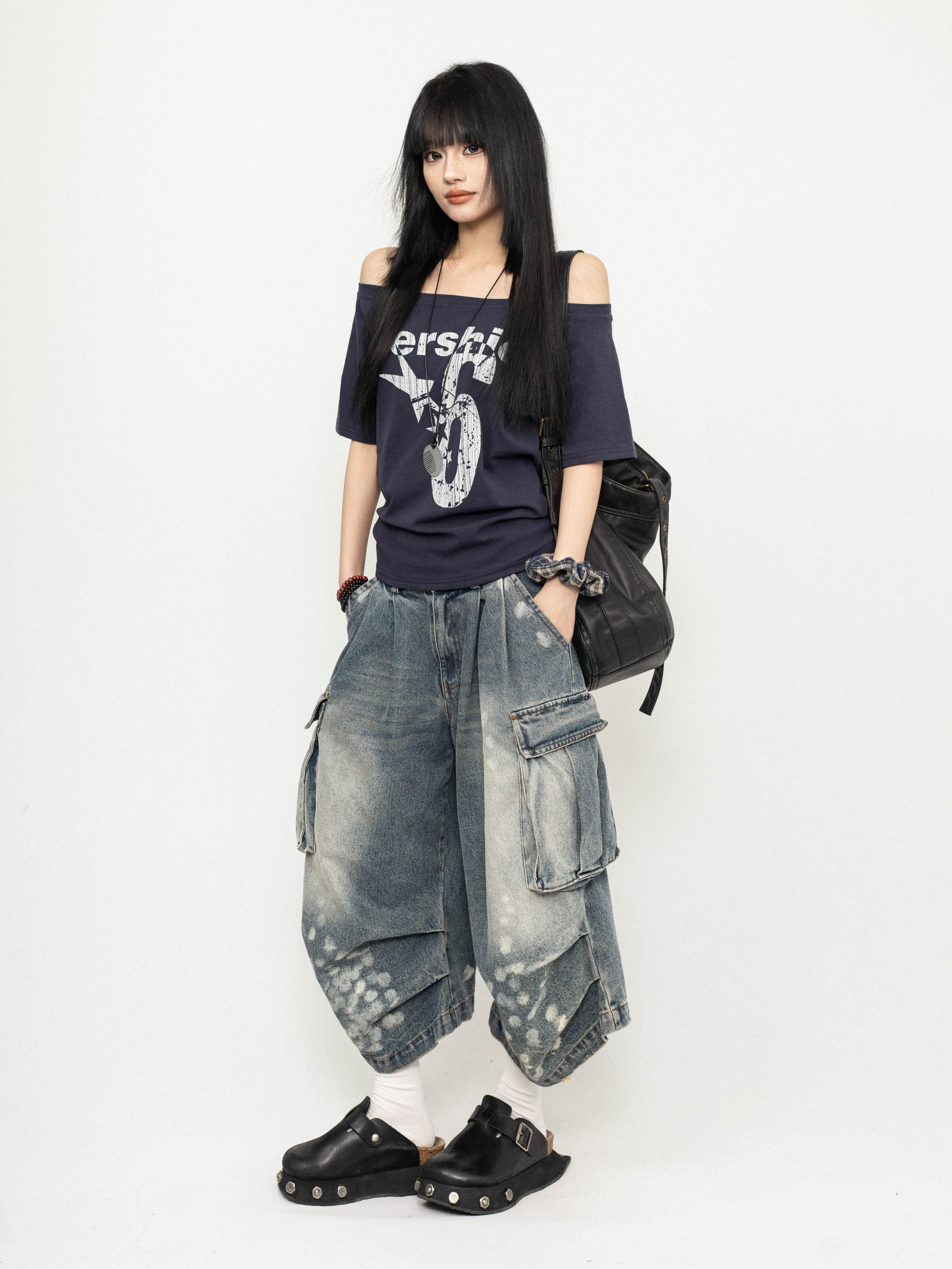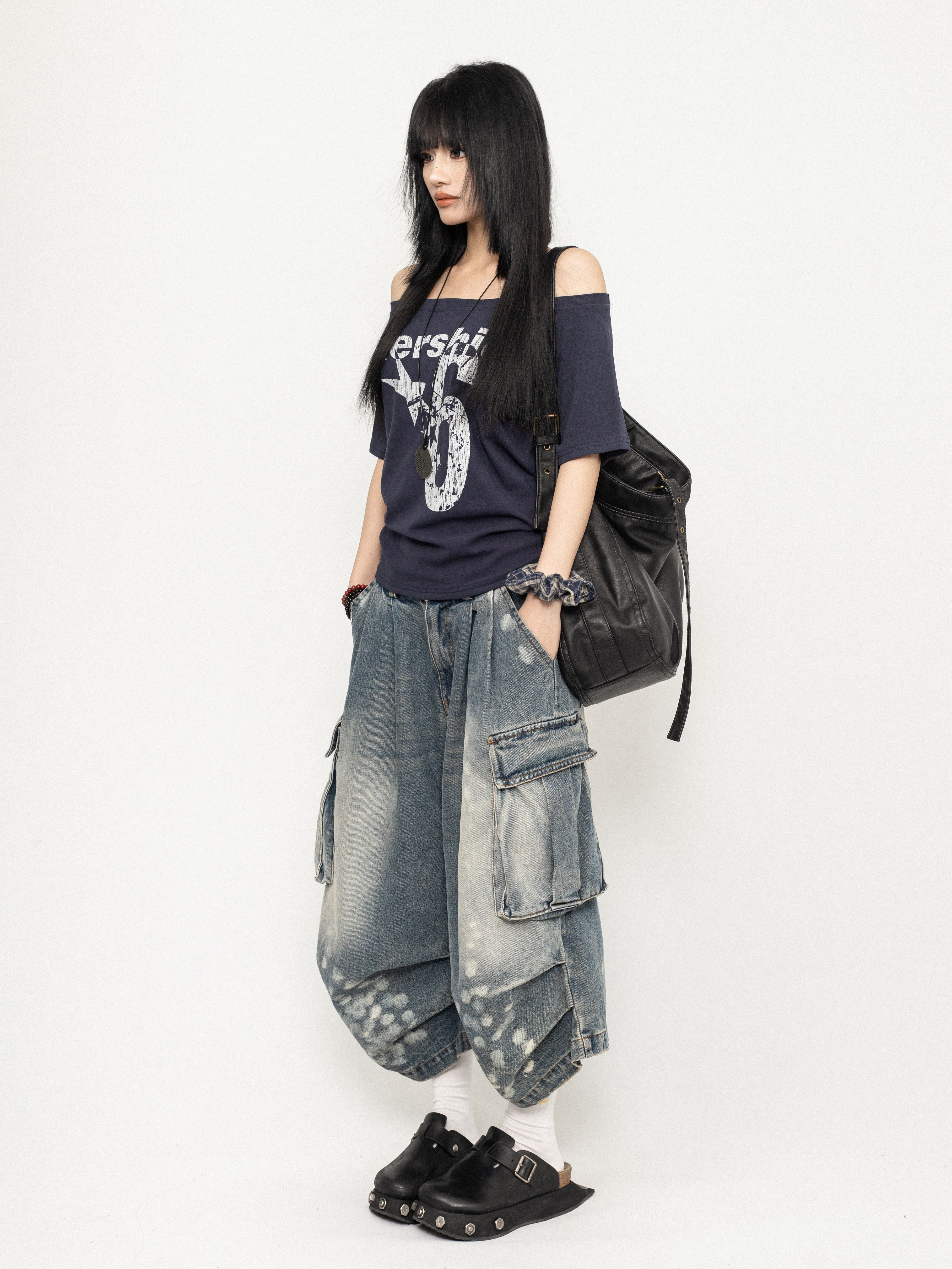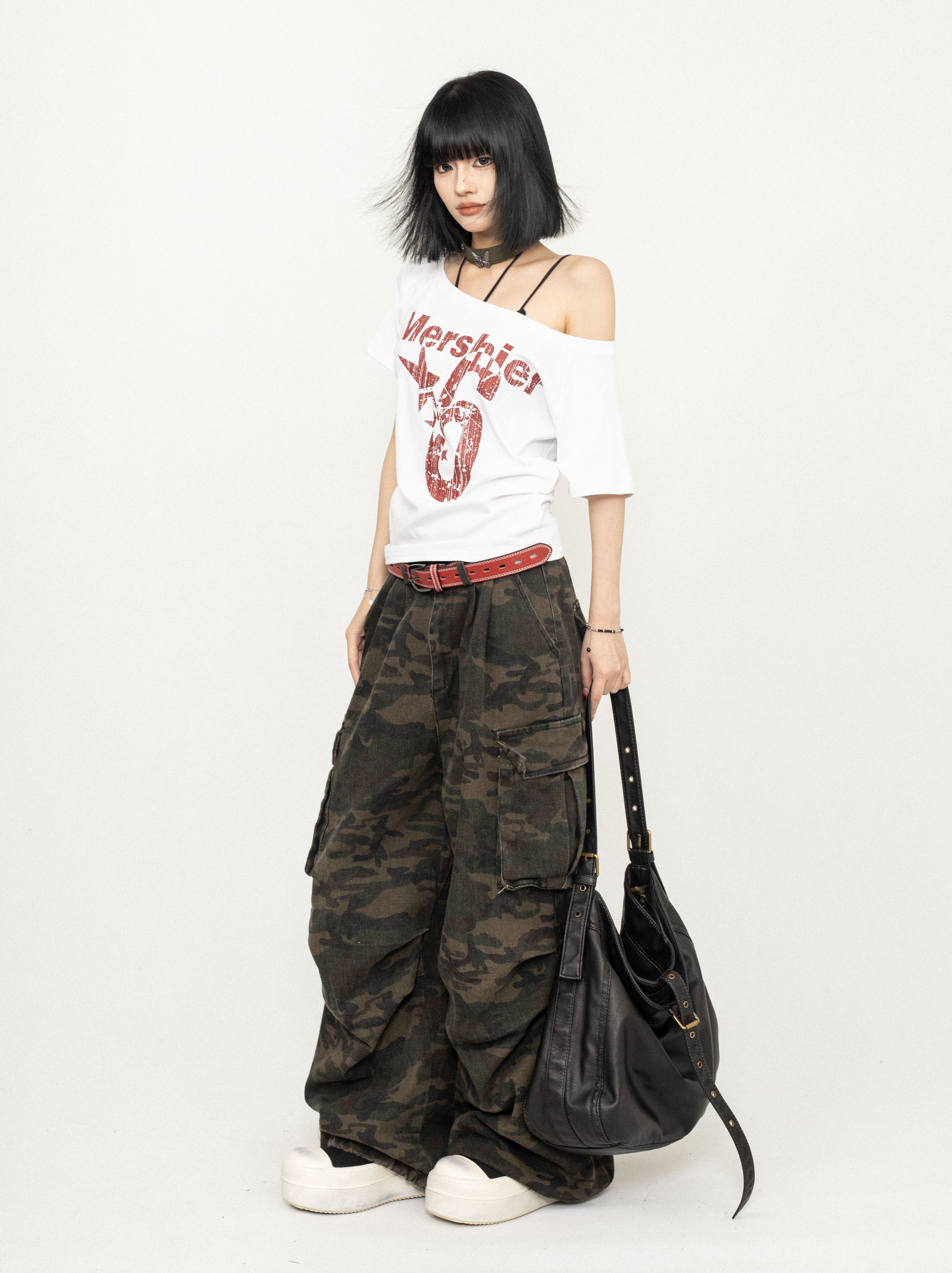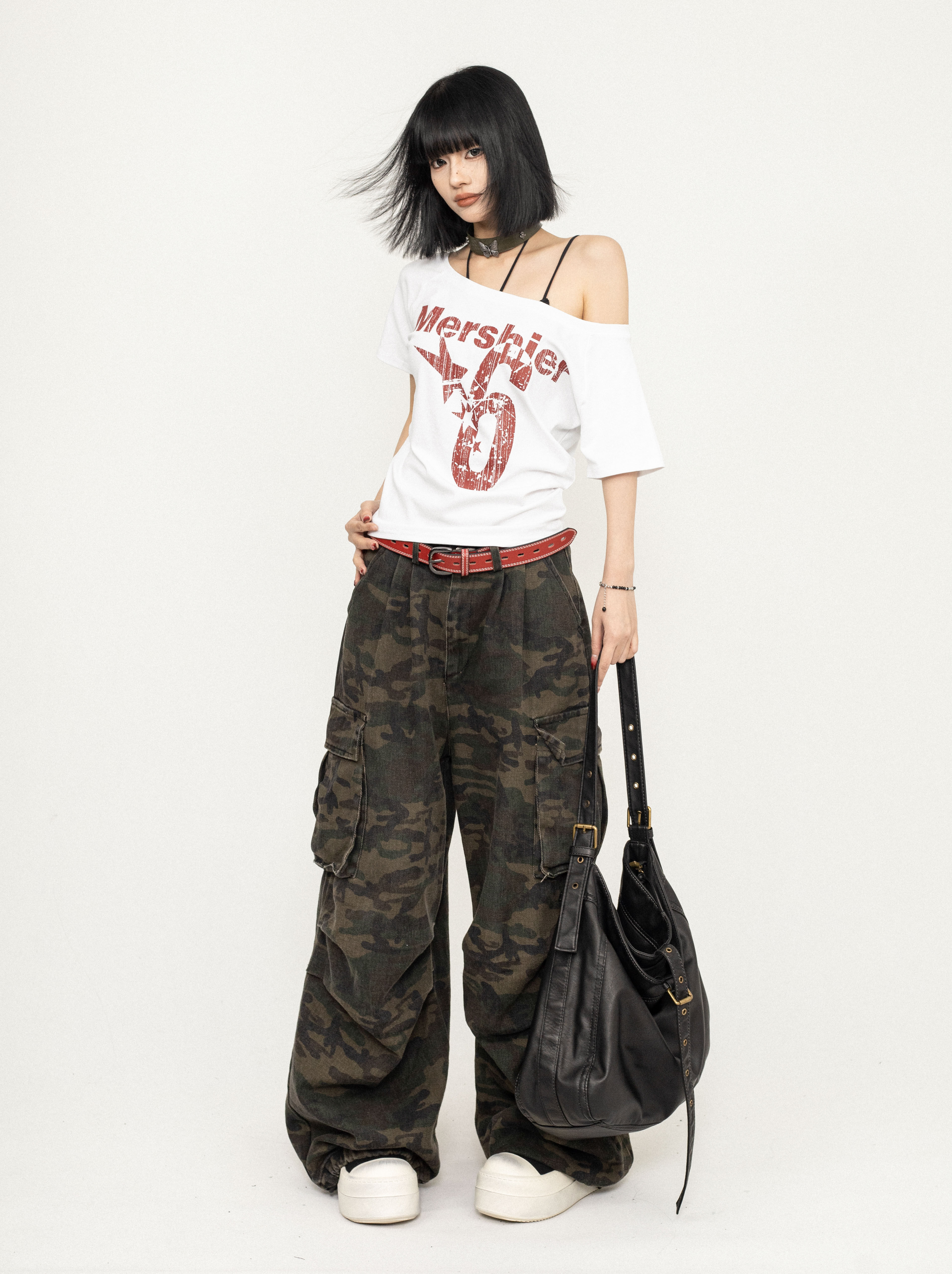 Octtflab/American Retro One-Shoulder Off-Shoulder Top Loose Sexy Short T-Shirt for Women 2025 New Short-Sleeve