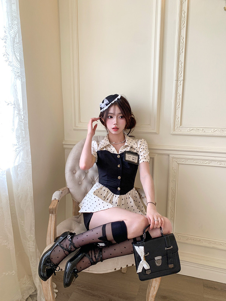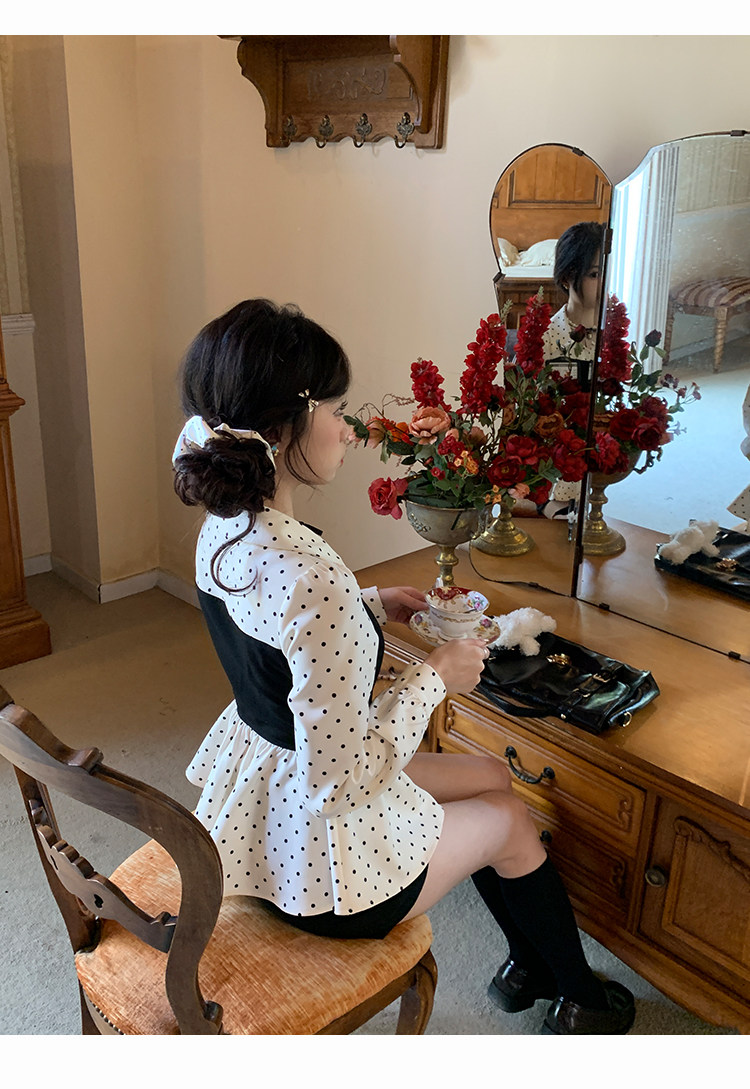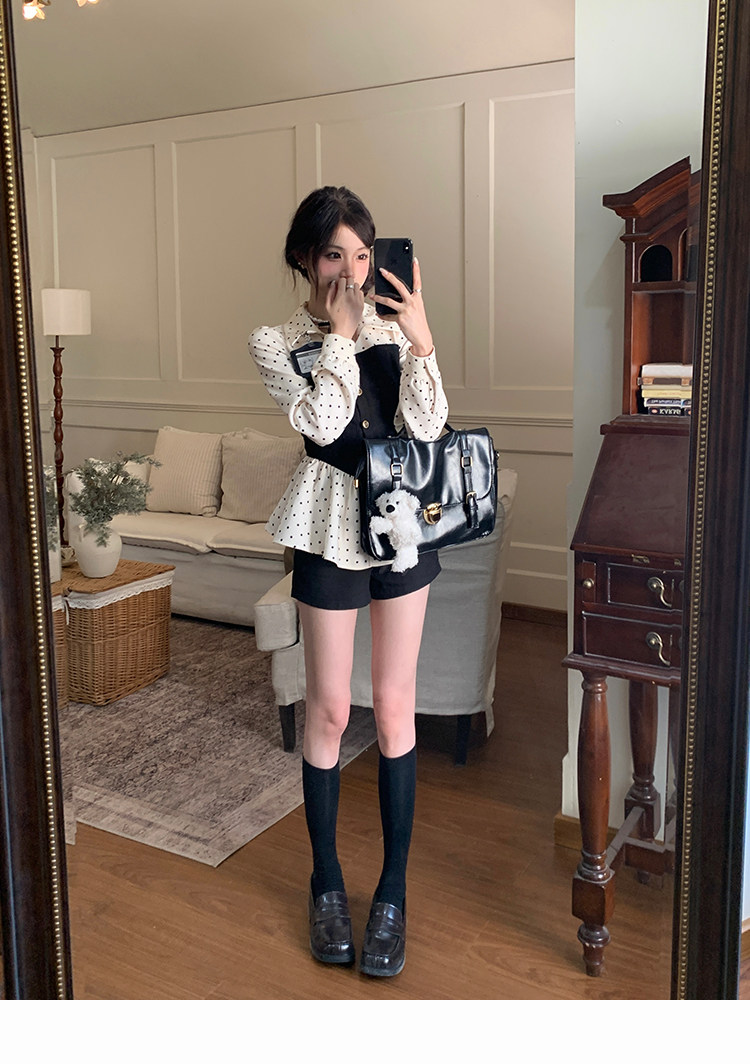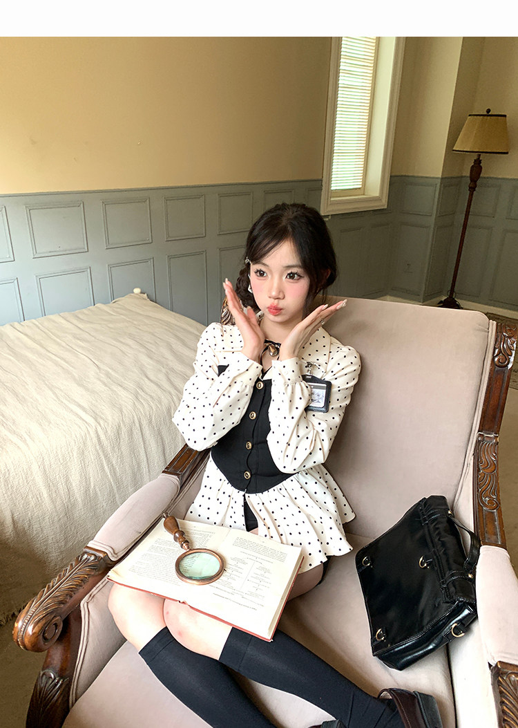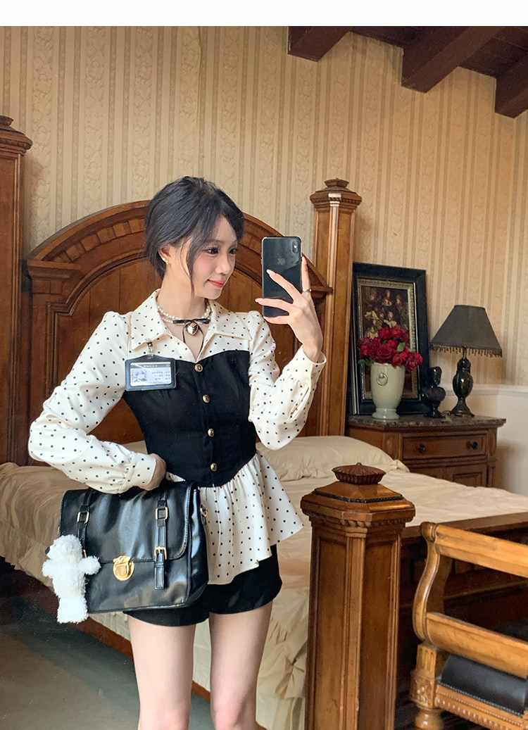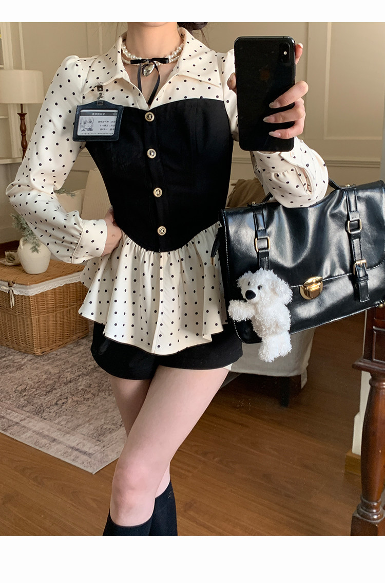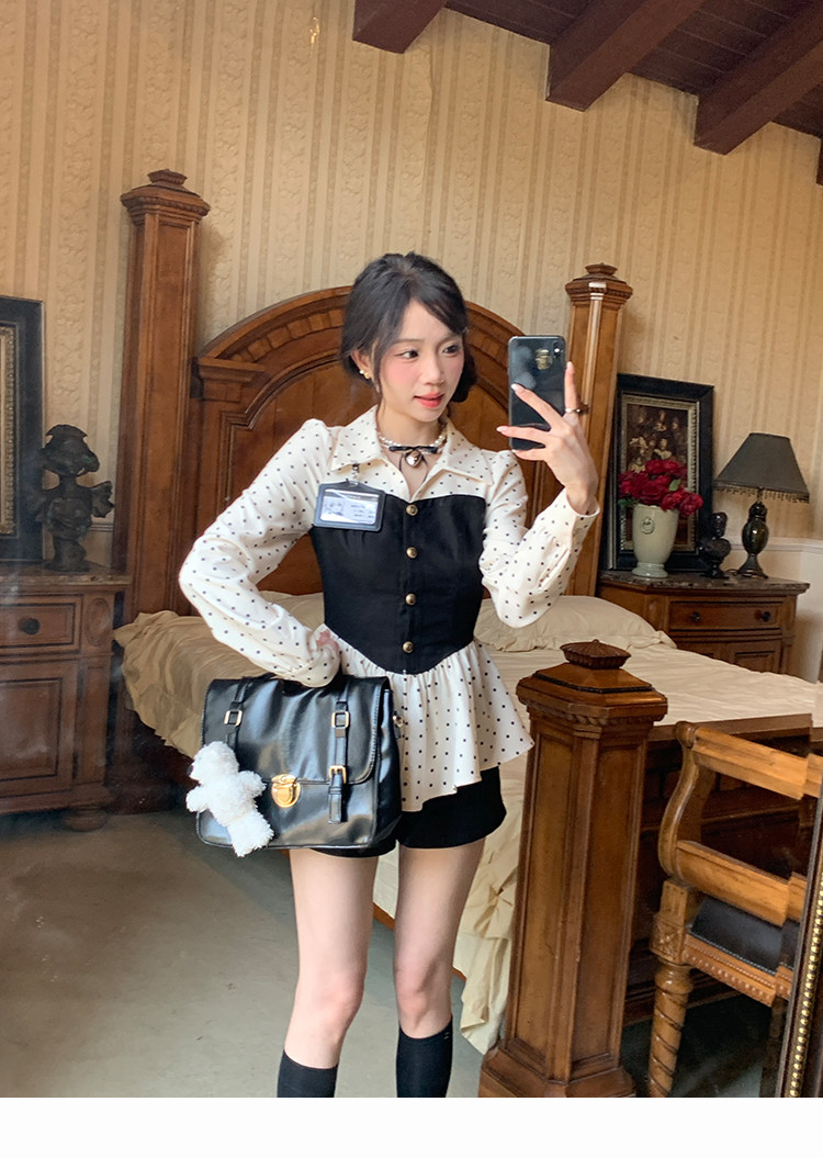 Fabric Pig Cream Mousse Miu Style Elegant Blouse with Ruffles, Autumn Outfit, Waist-Cinching, Slimming, Color-Blocked Top