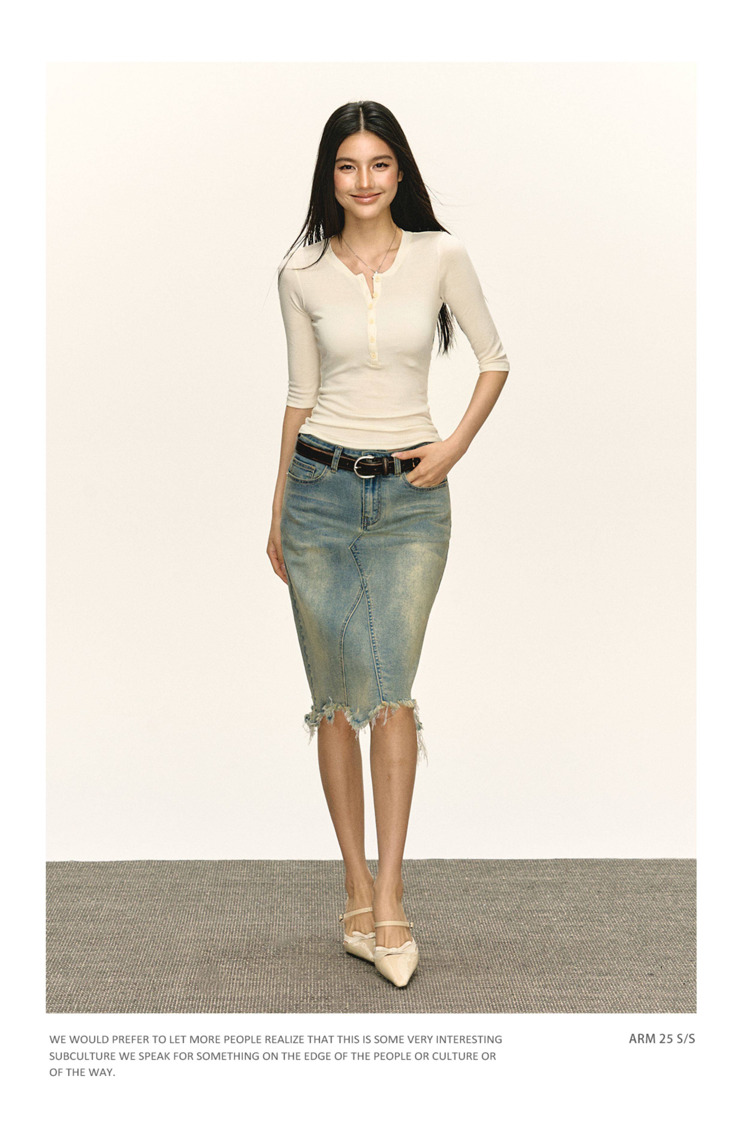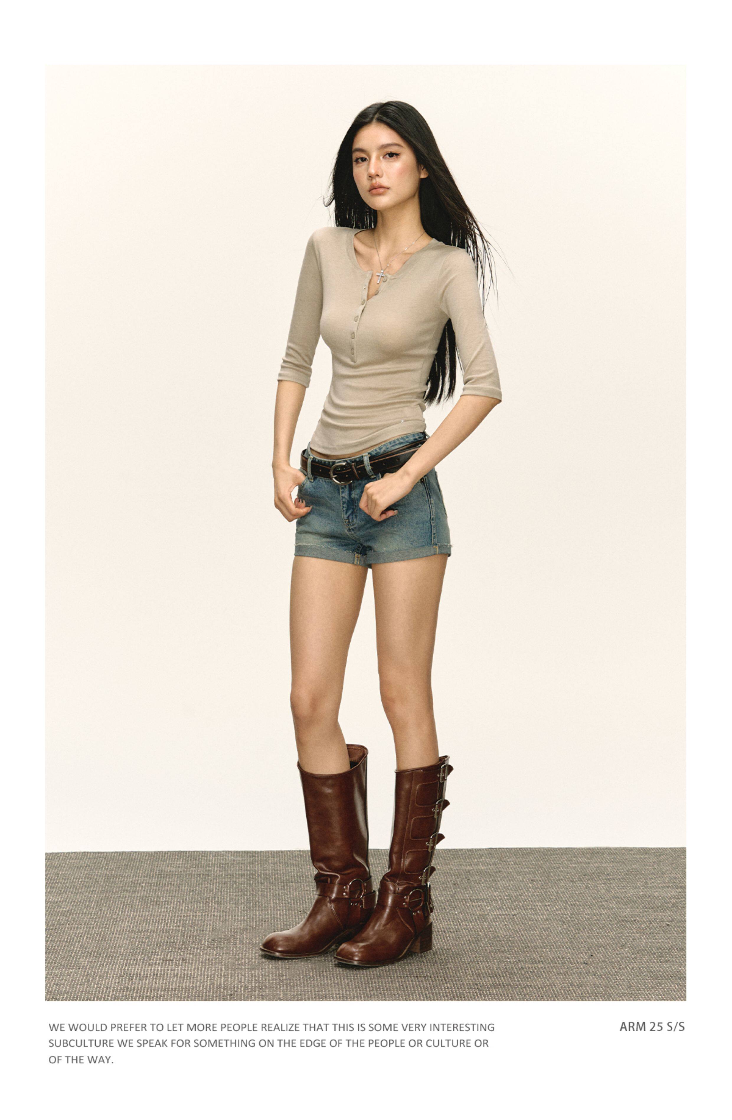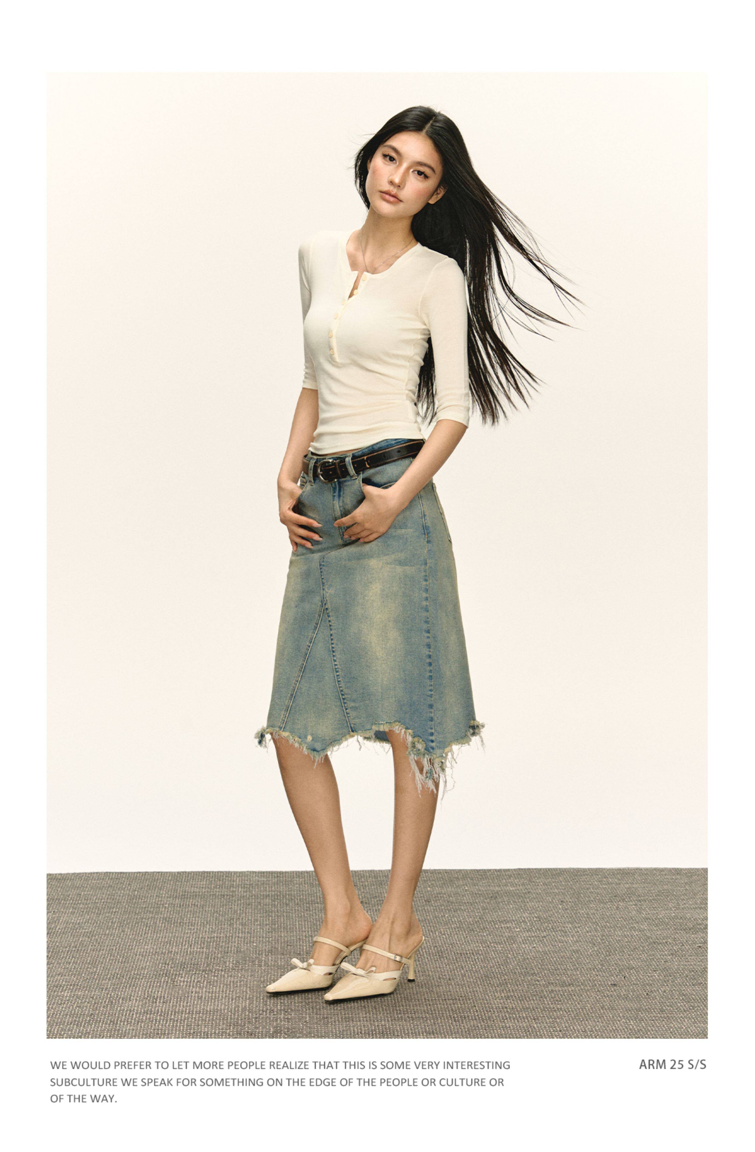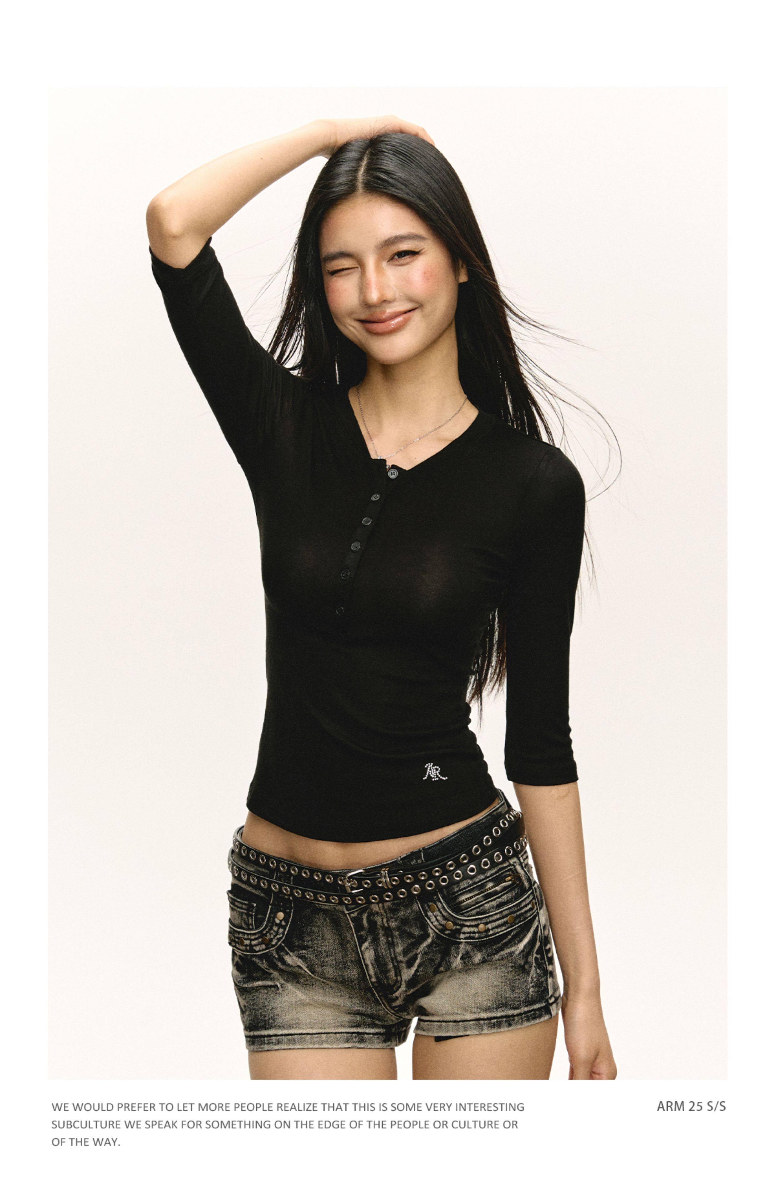 Ariseism American Retro Henry Collar Slim Long-Sleeve T-Shirt for Women, New Autumn Slim-Fit Mid-Sleeve Base Top