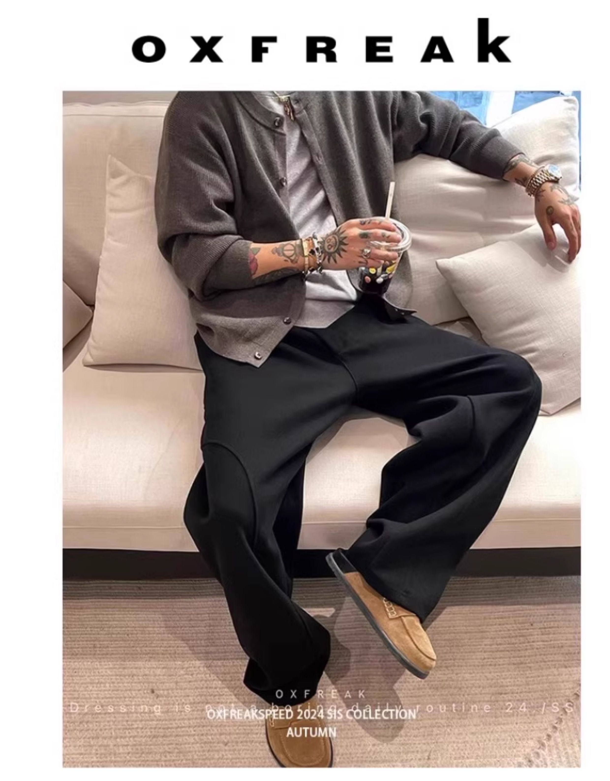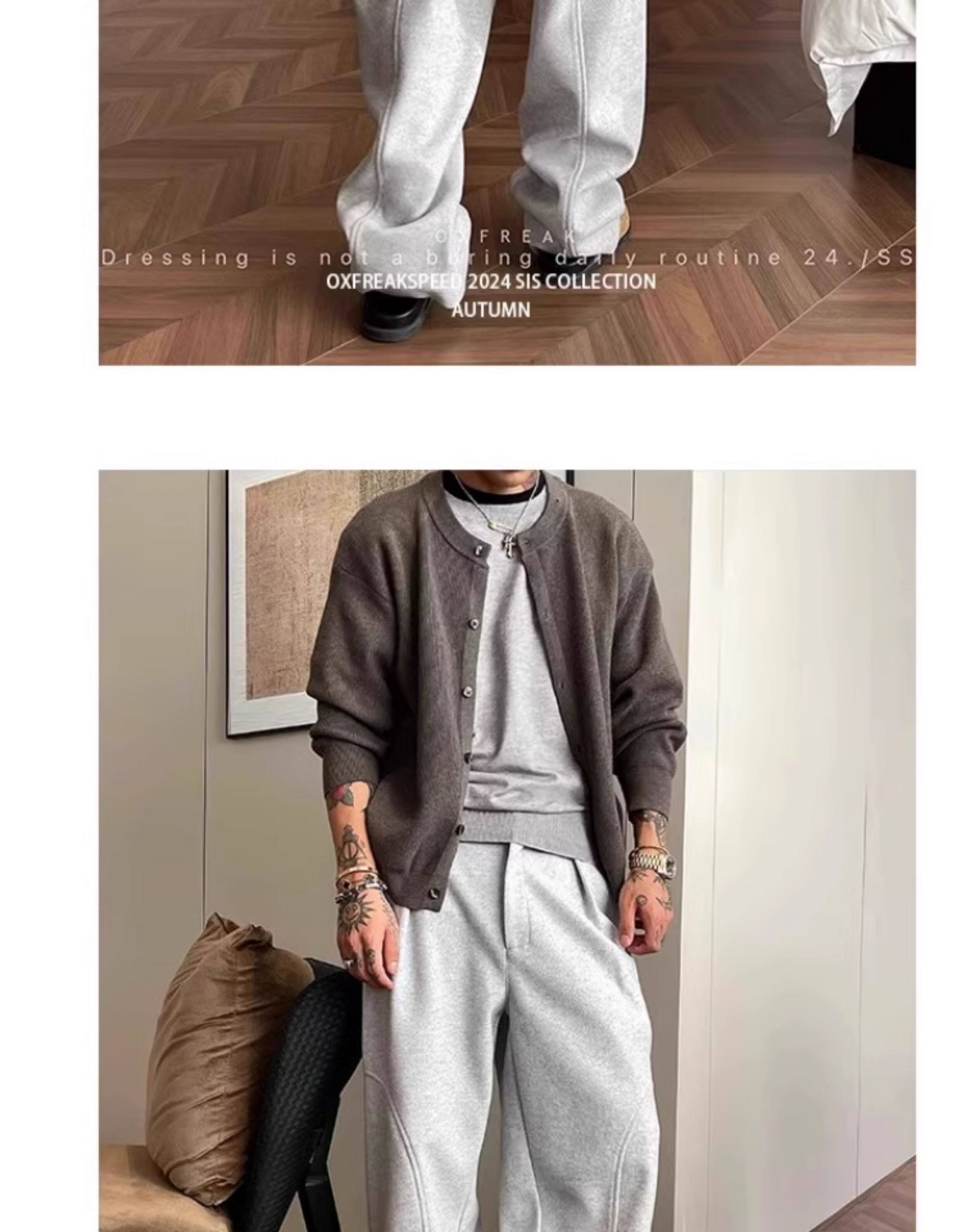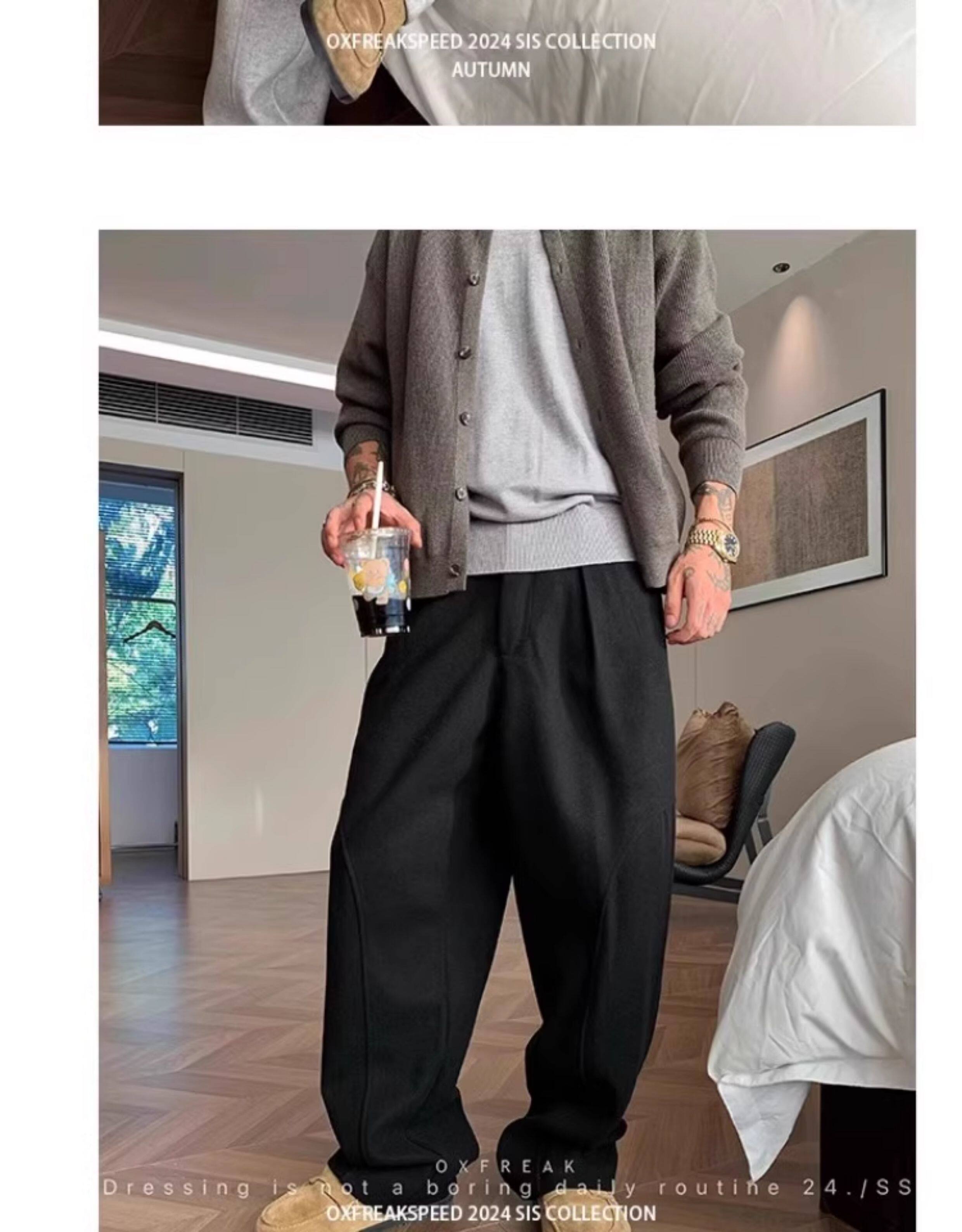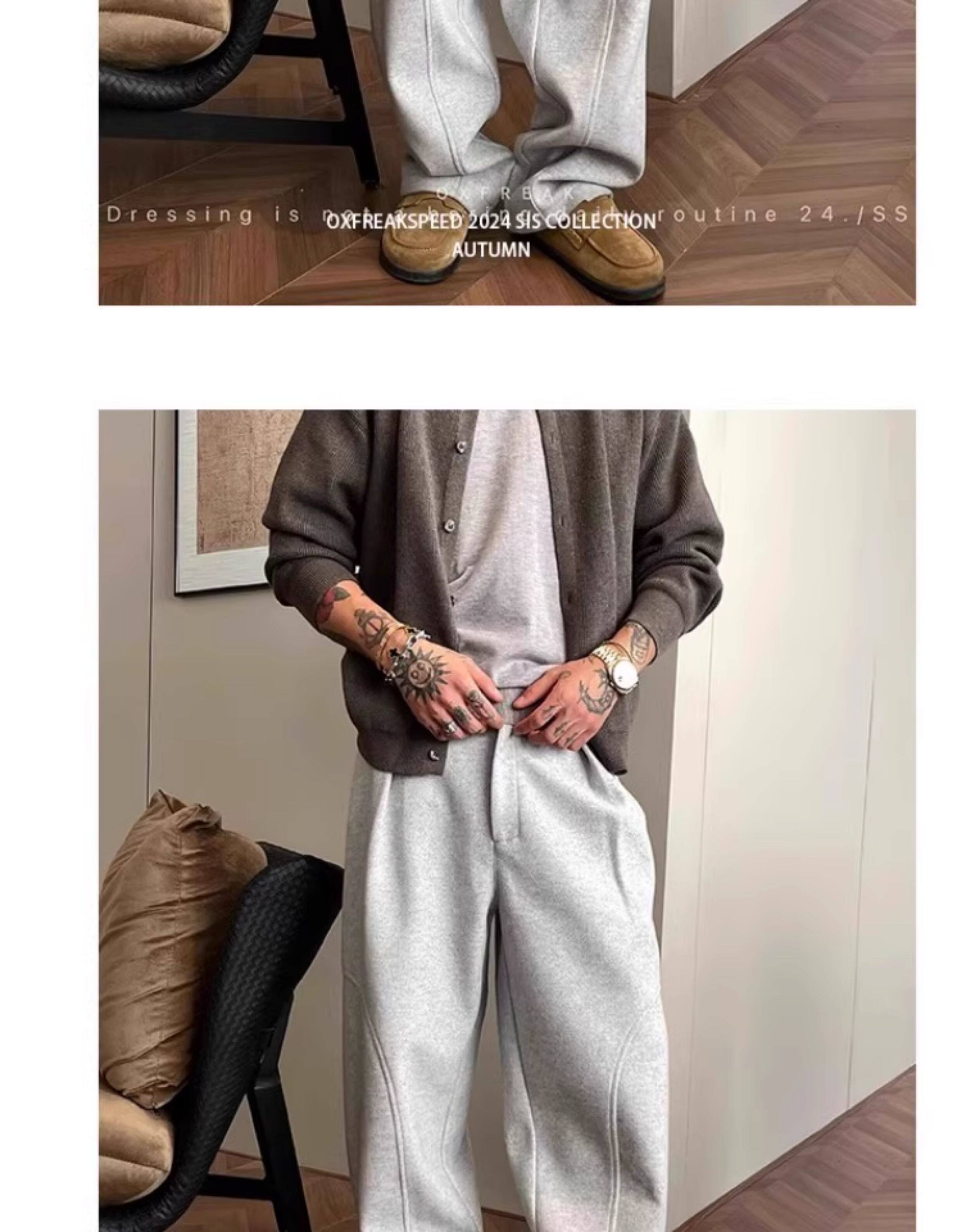 Oxfreak Heavy Knit Casual Pants for Men, Loose Fit, Gray Scimitar Pants with Three-Dimensional Tailoring and Inward Pleats