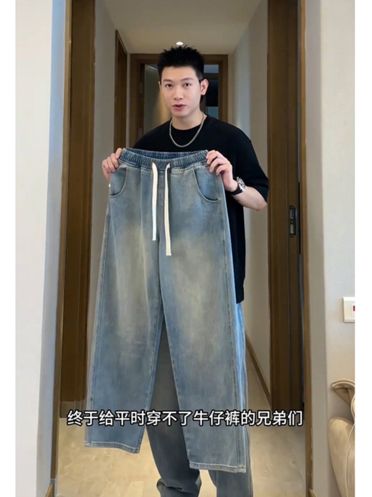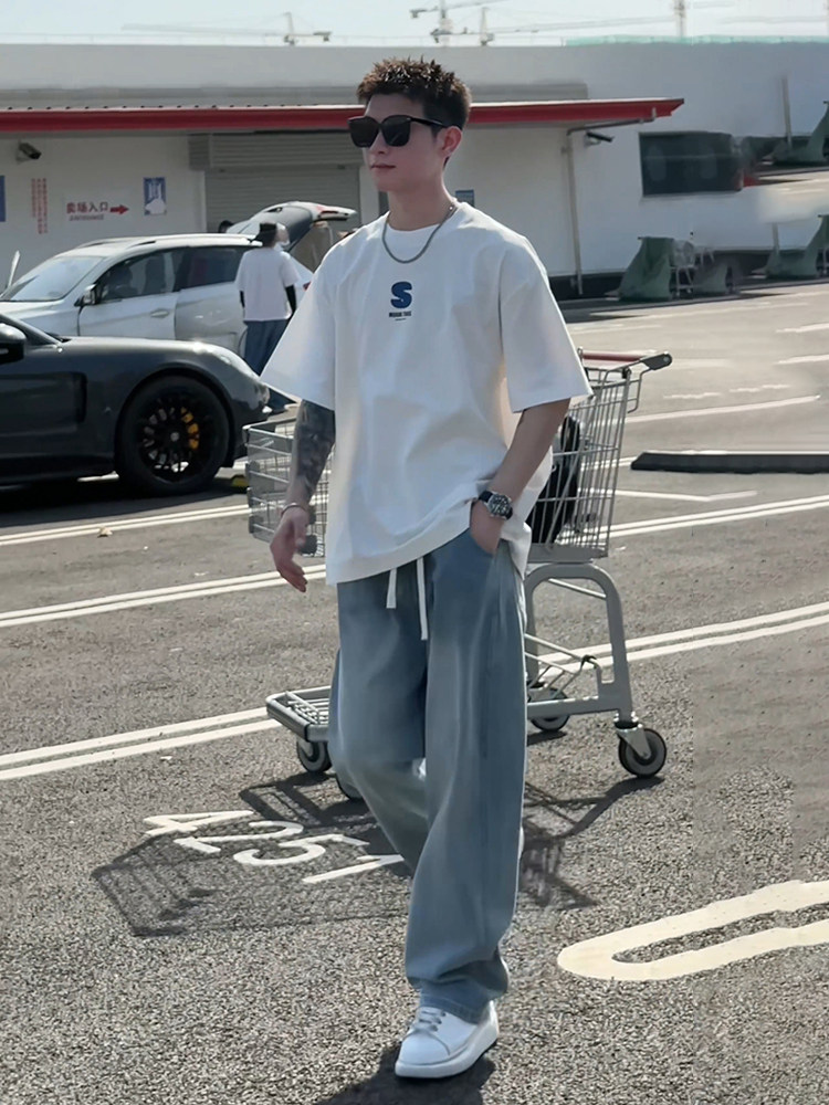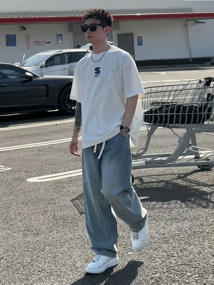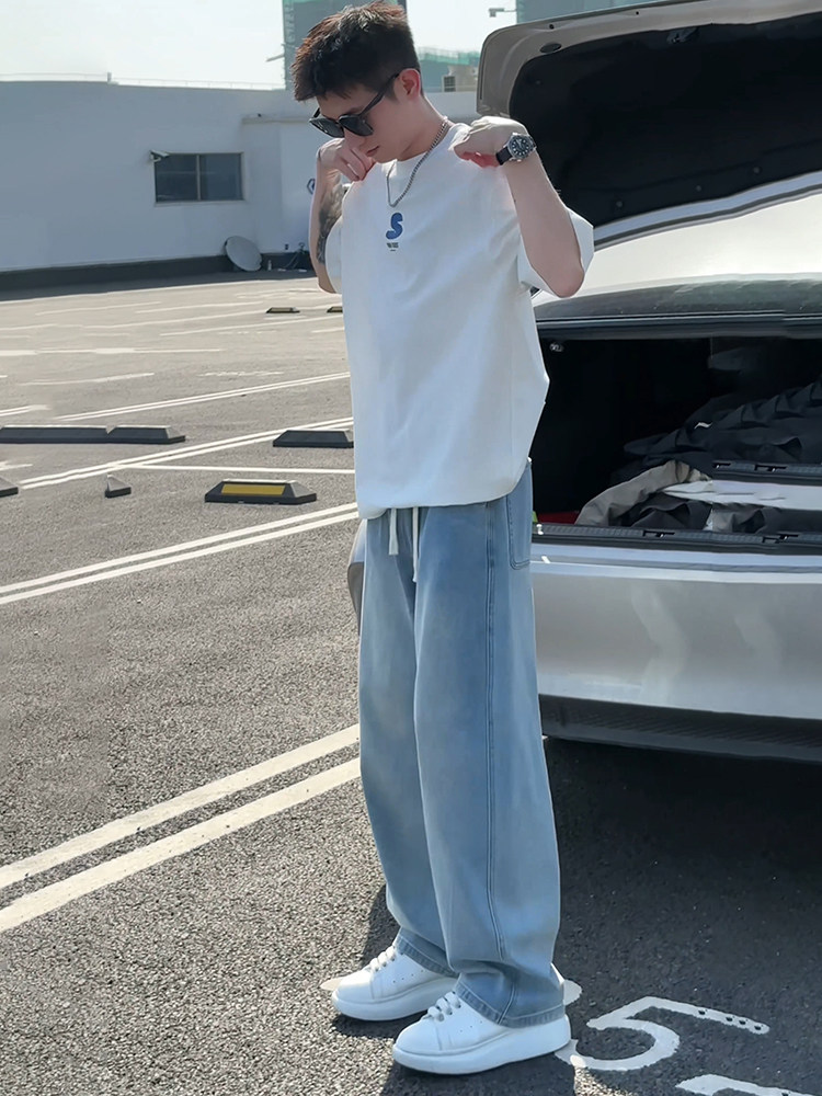 Light Blue Ice Silk Jeans for Men, Summer Thin Style, American Style, Cool and Handsome Pants for Teenagers, Straight Loose Wide-Leg Pants