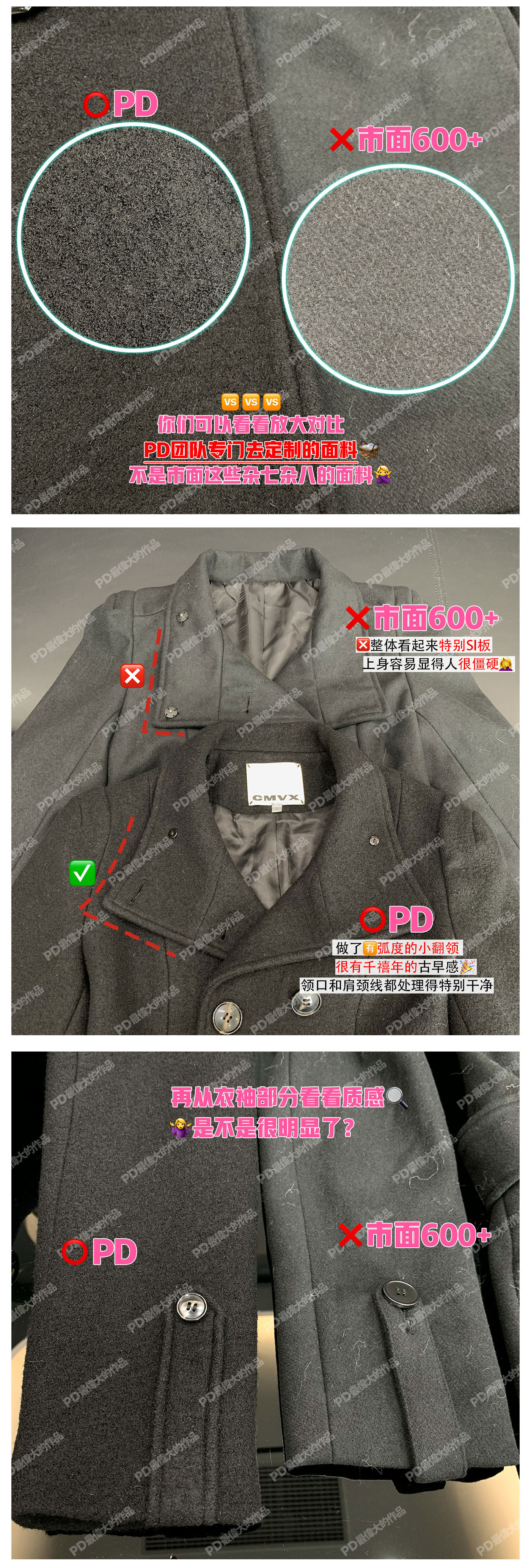 关于这件大衣的每一个细节 PD团队都认真打磨过 很多配件都是专门开模定制的 每件大货出来前 都有人工检查版型、缝线和接口 保证你们拿到手感觉物超所值