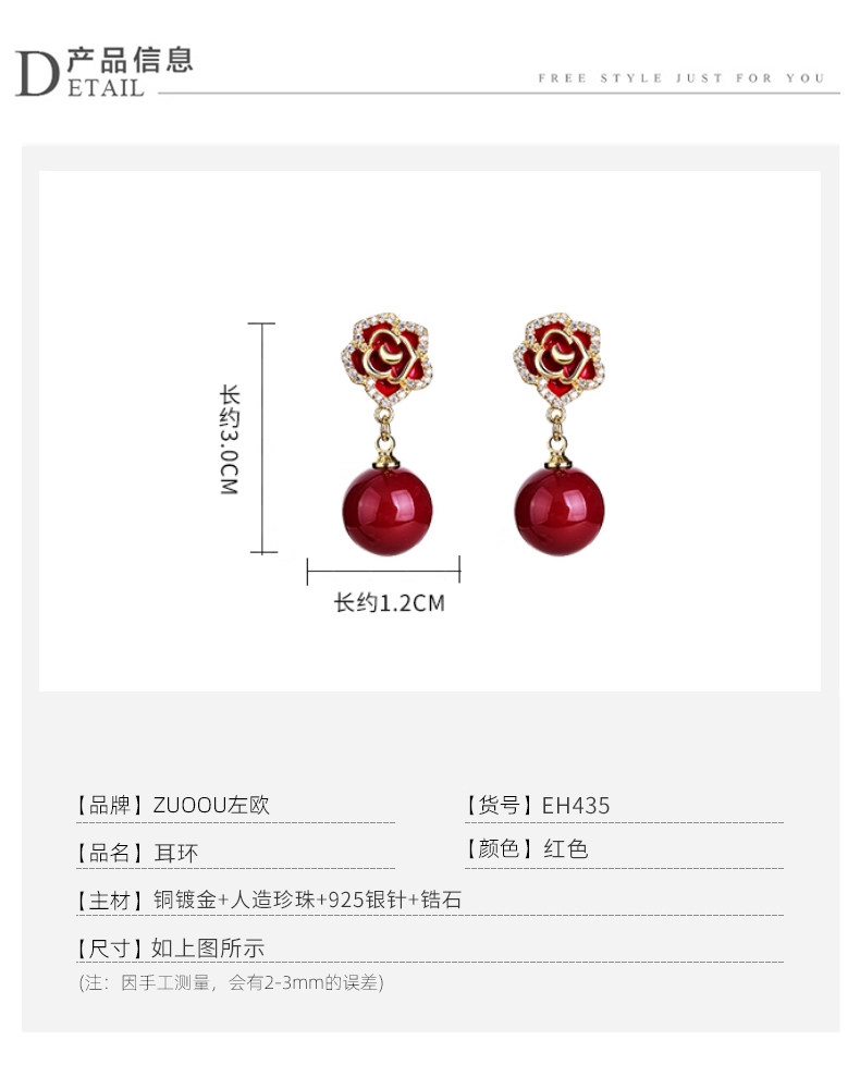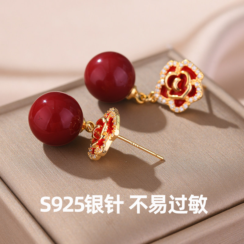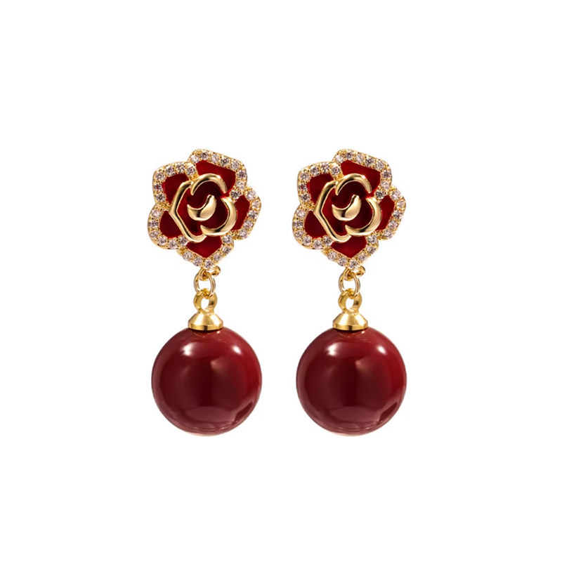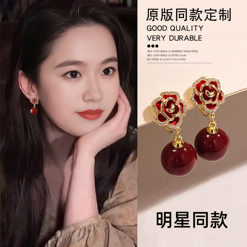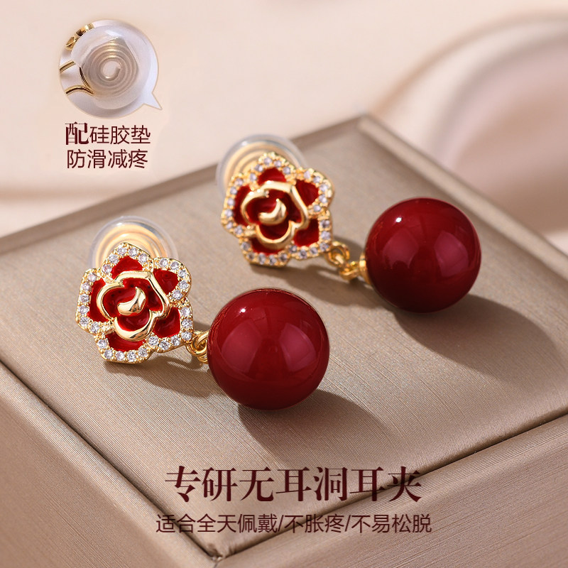 Red Pearl Clip-On Earrings for Women Without Pierced Ears, High-End Earrings, 2025 New Popular Style, Light Luxury Camellia Stud Earrings