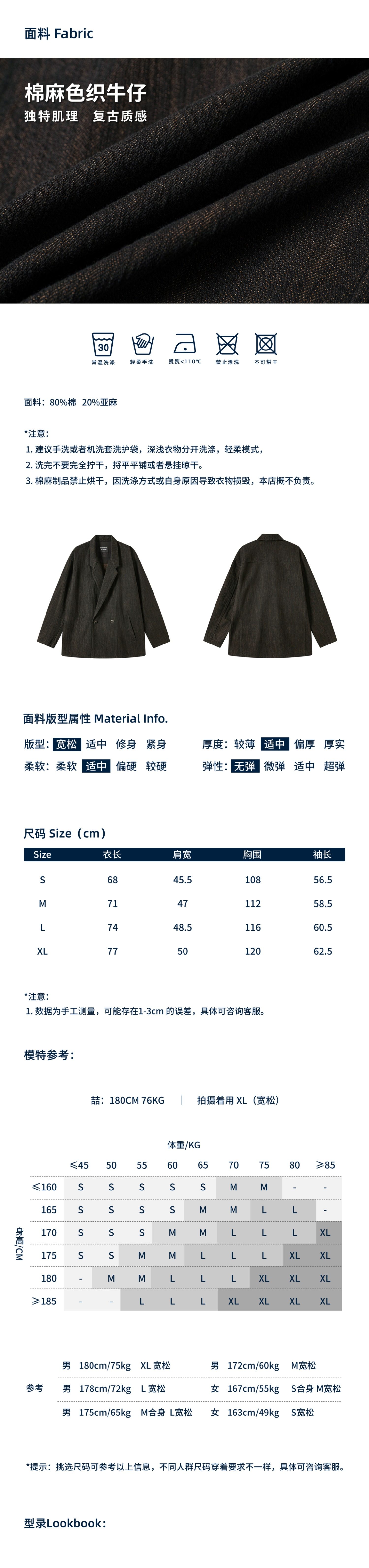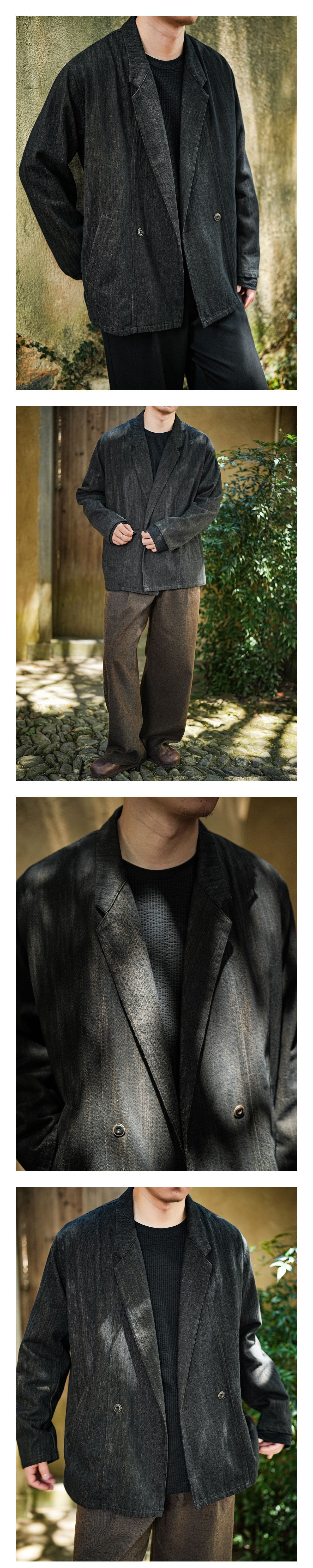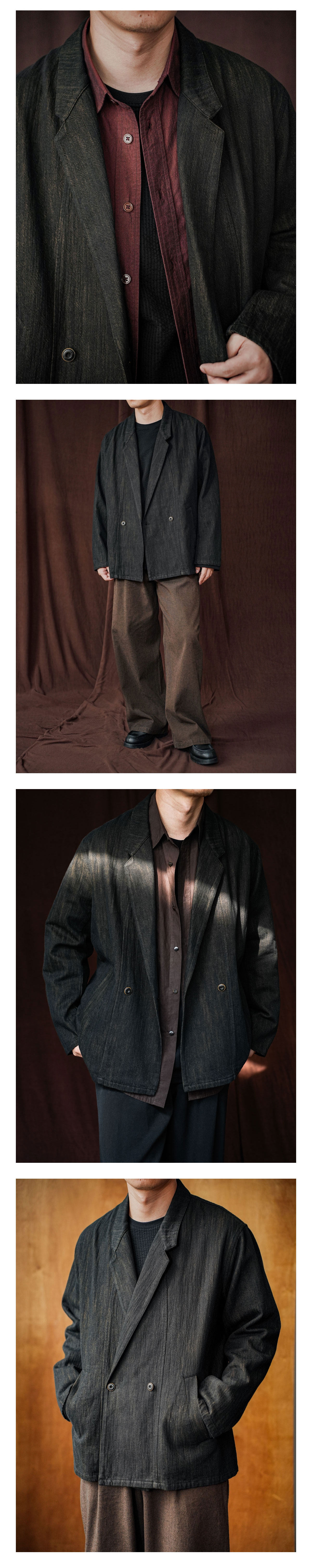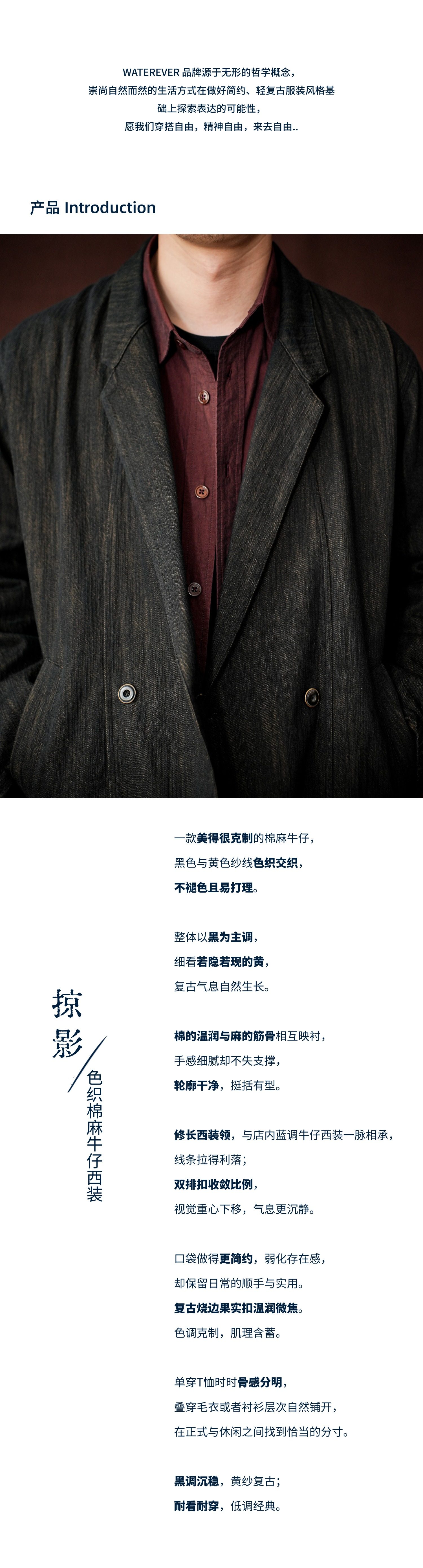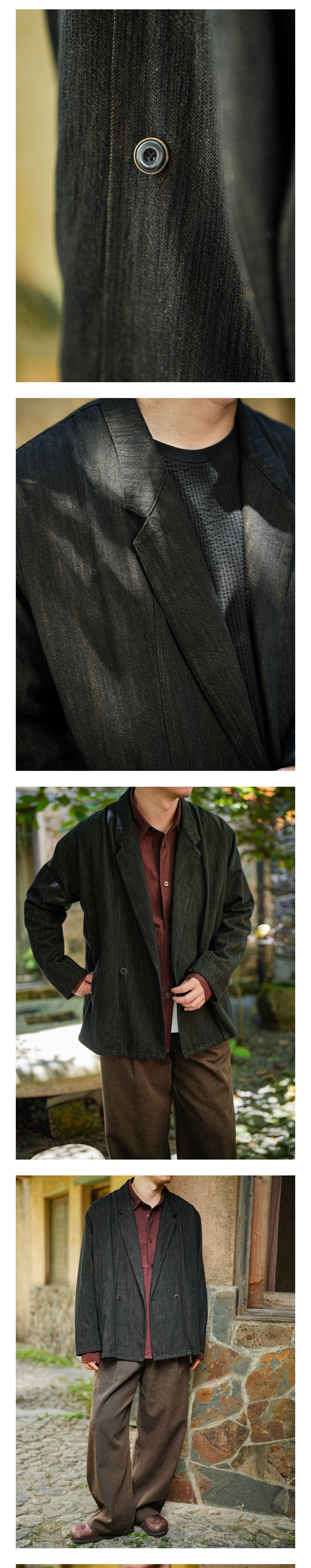 Waterever'Glimpse' Black Woven Cotton Linen Double-Breasted Denim Blazer with a High-End Feel and Non-Fading Color
