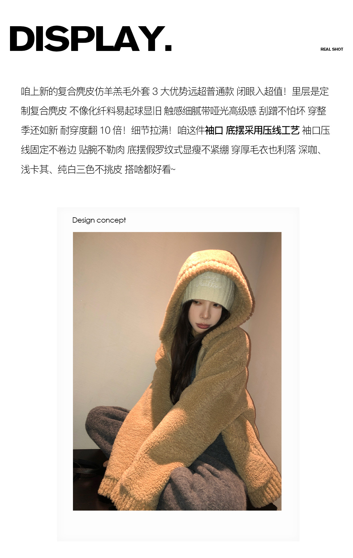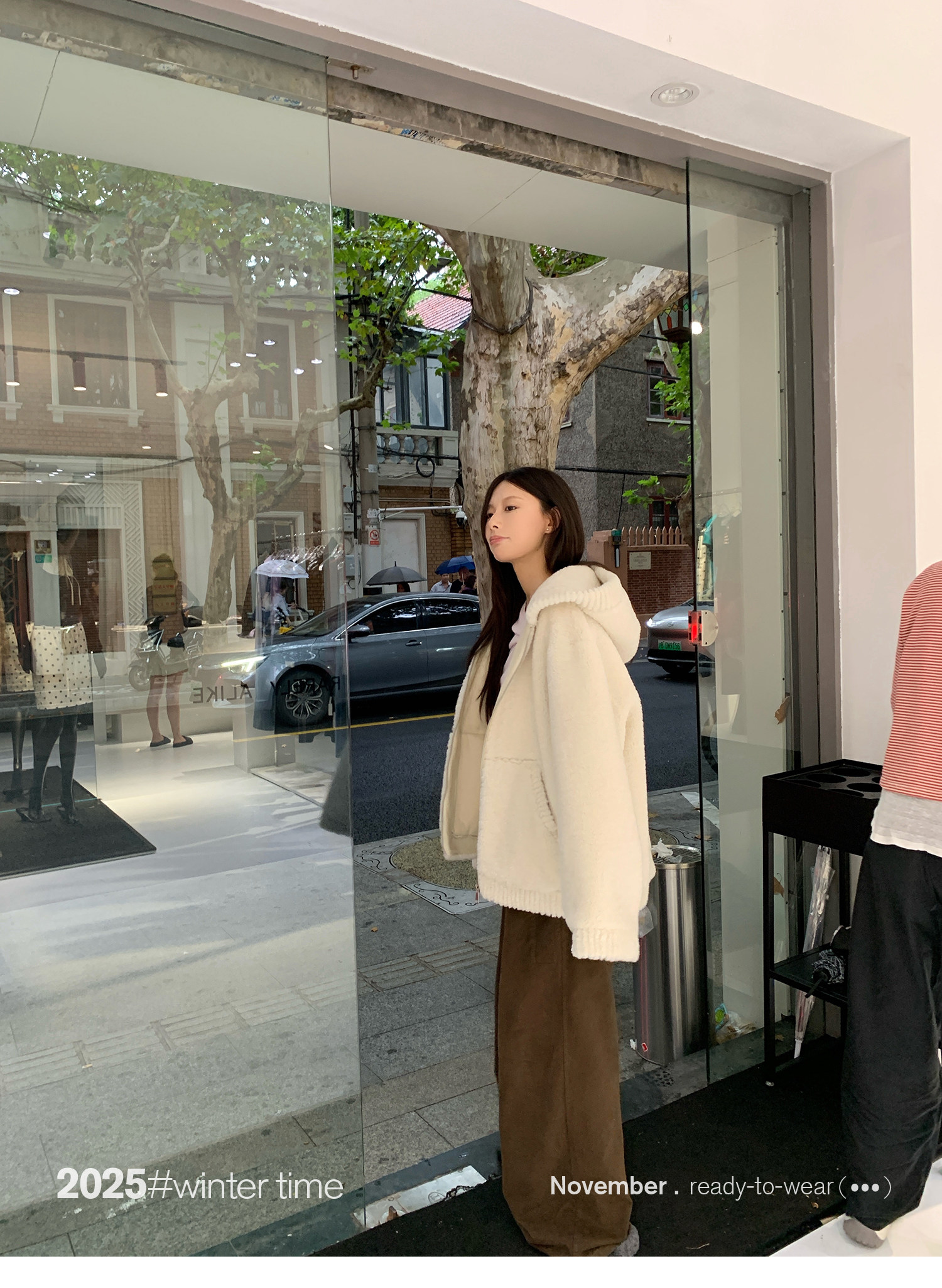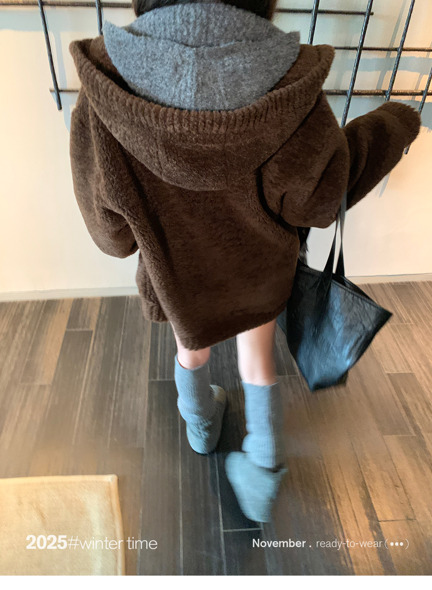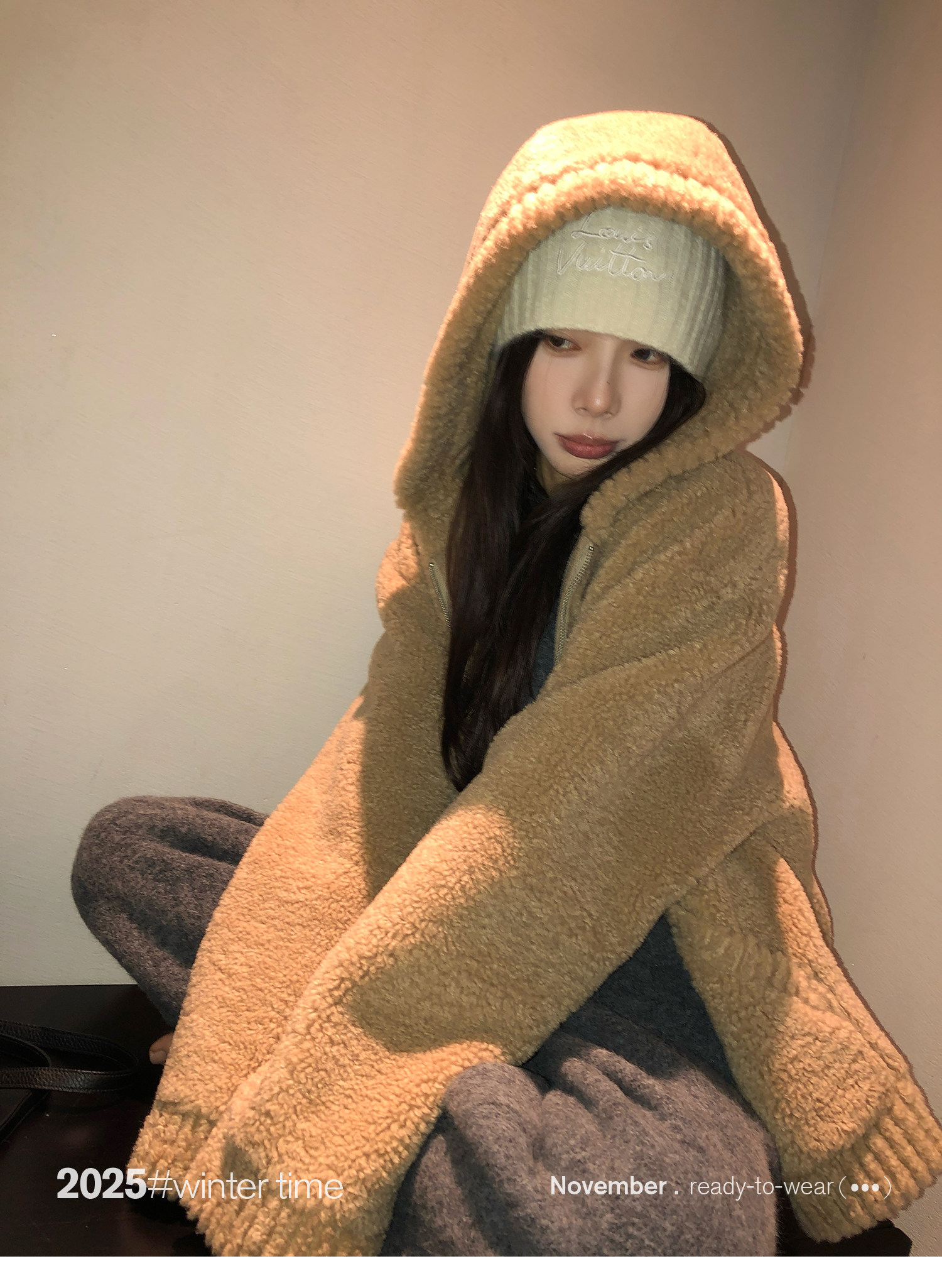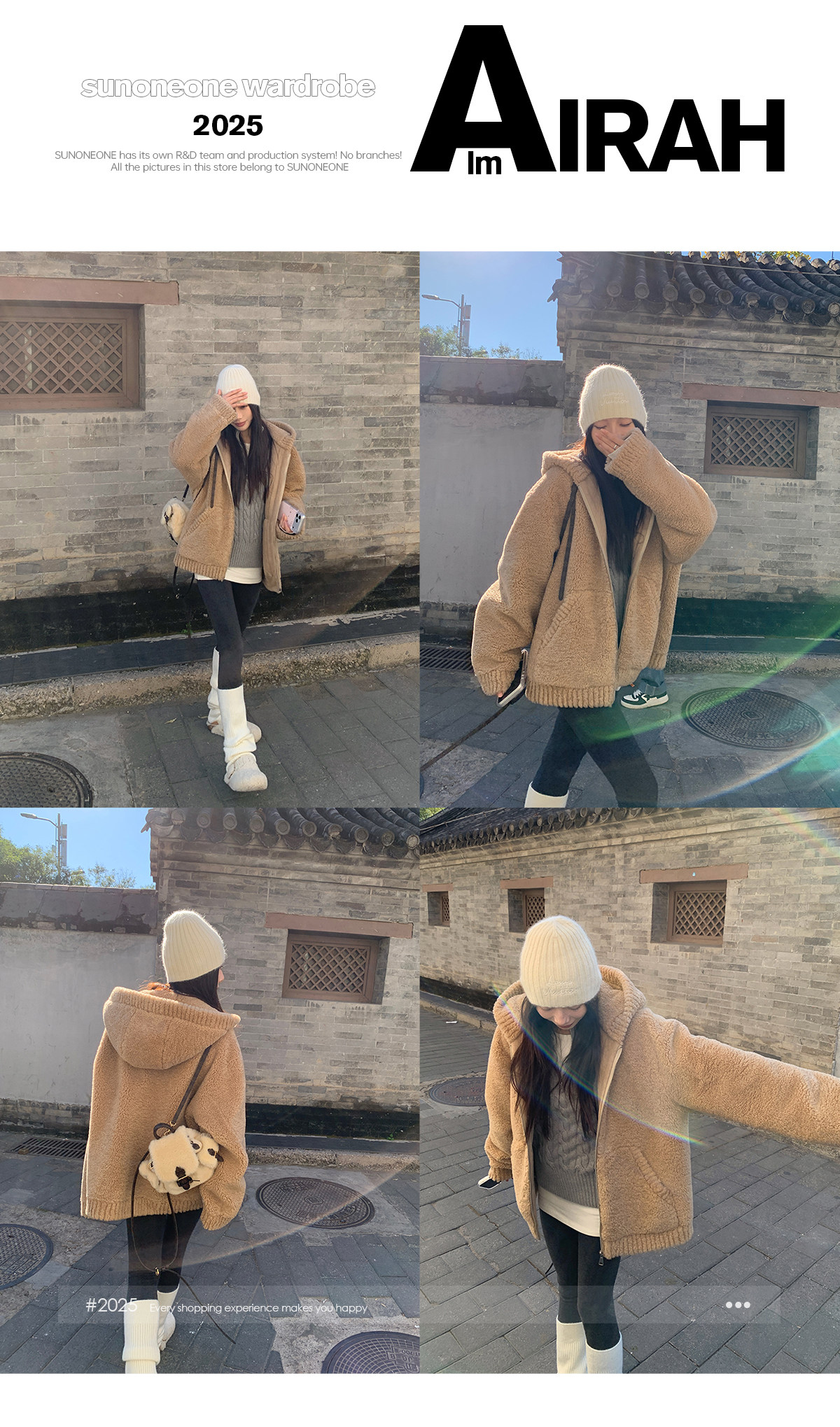 Sunoneone Hooded Pocket Loose Faux Shearling Wool Coat for Women, Winter Woolen Short Coat for Petite Women