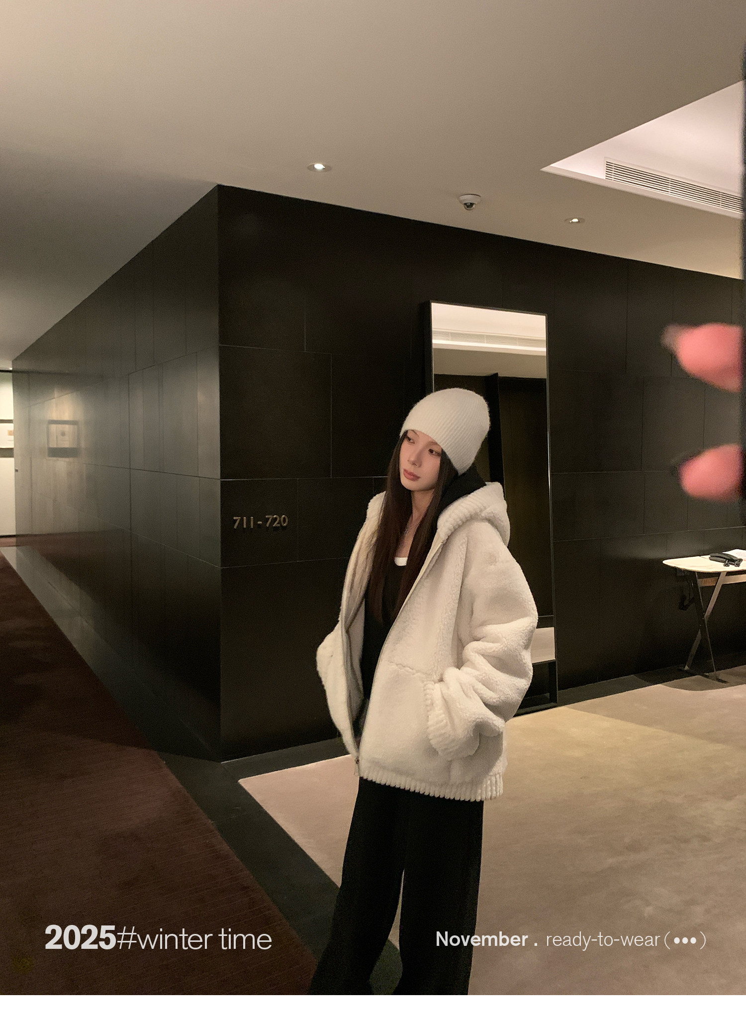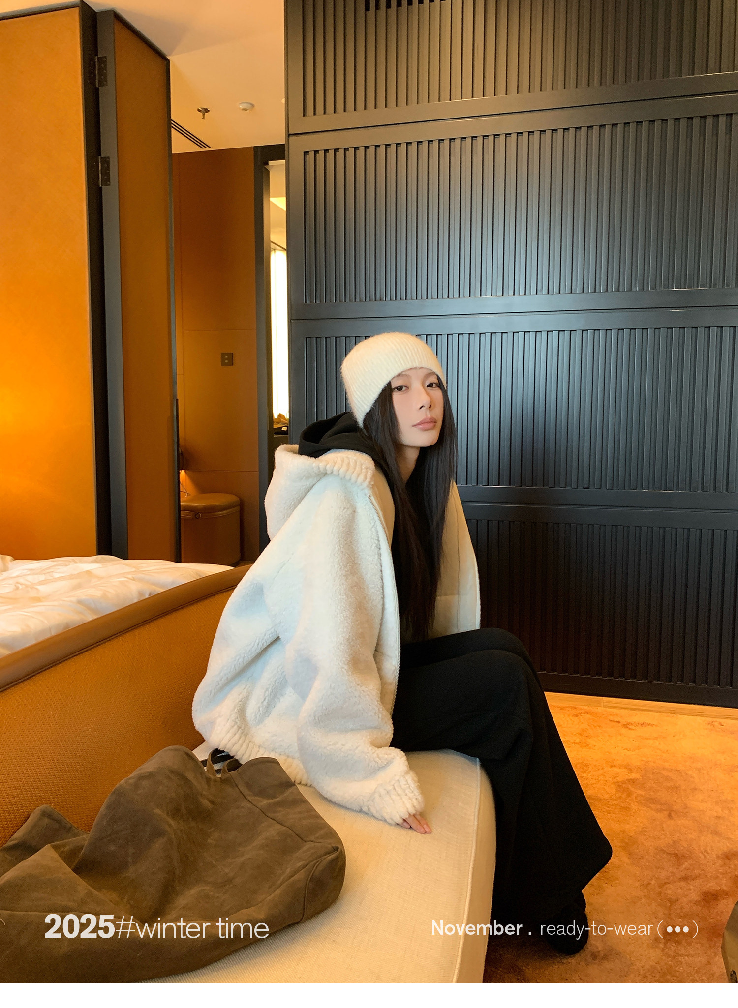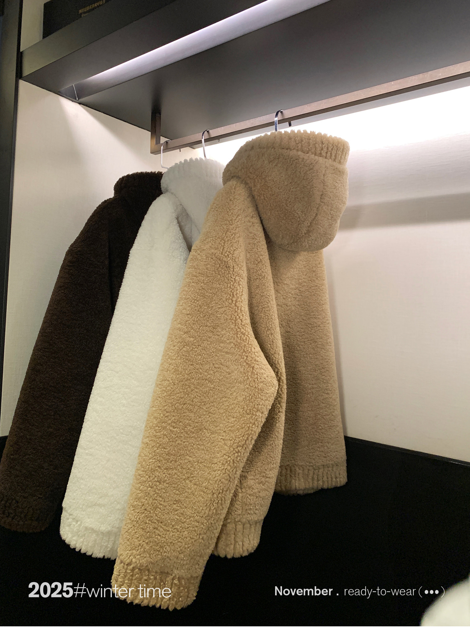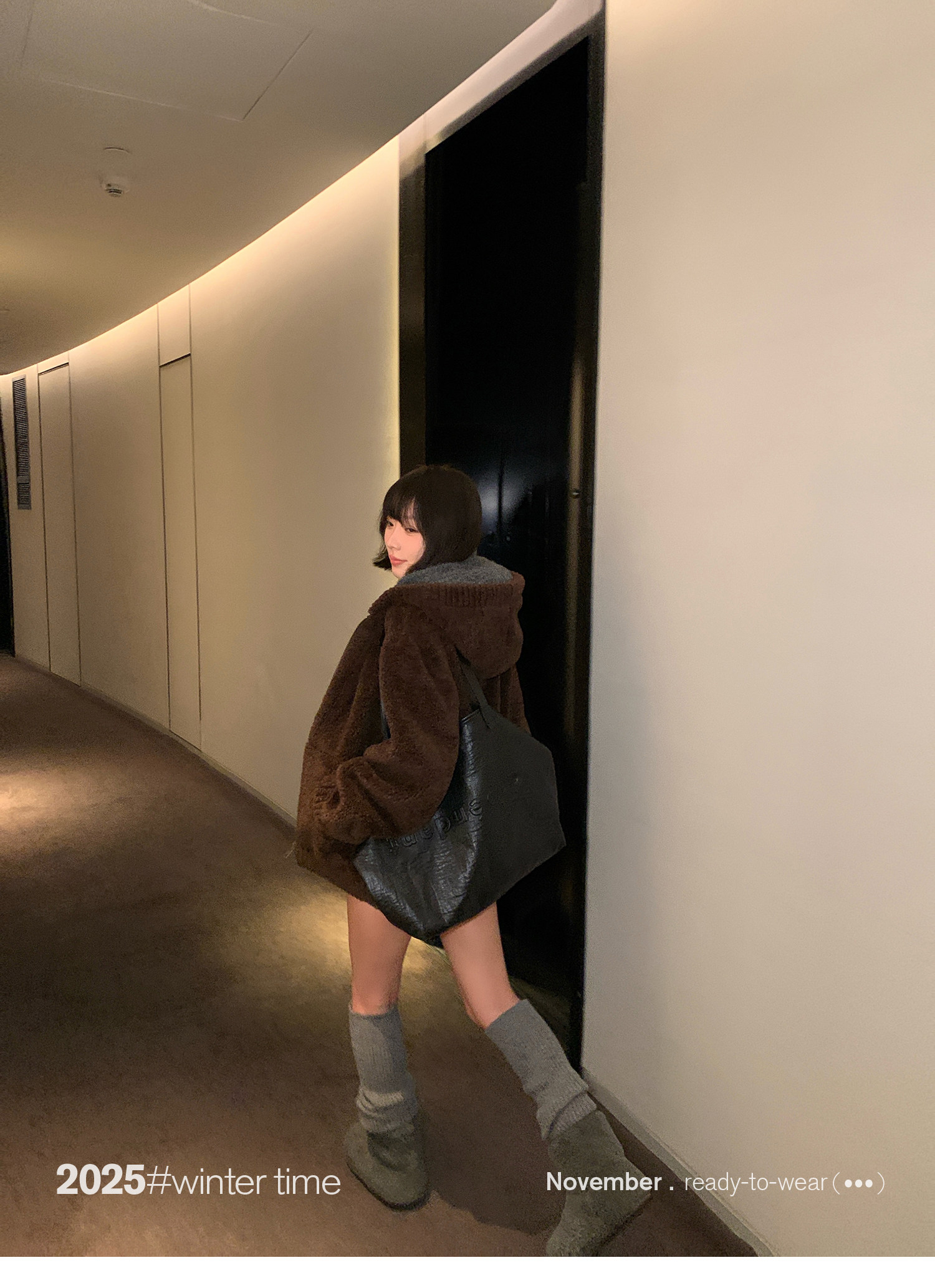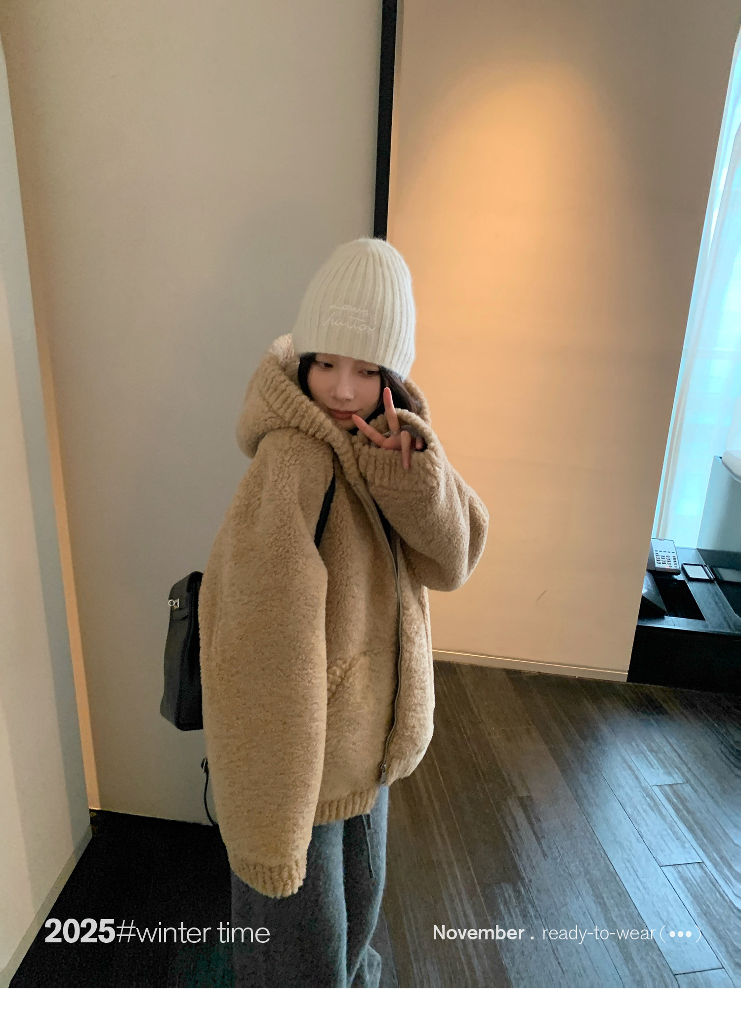 Sunoneone Hooded Pocket Loose Faux Shearling Wool Coat for Women, Winter Woolen Short Coat for Petite Women