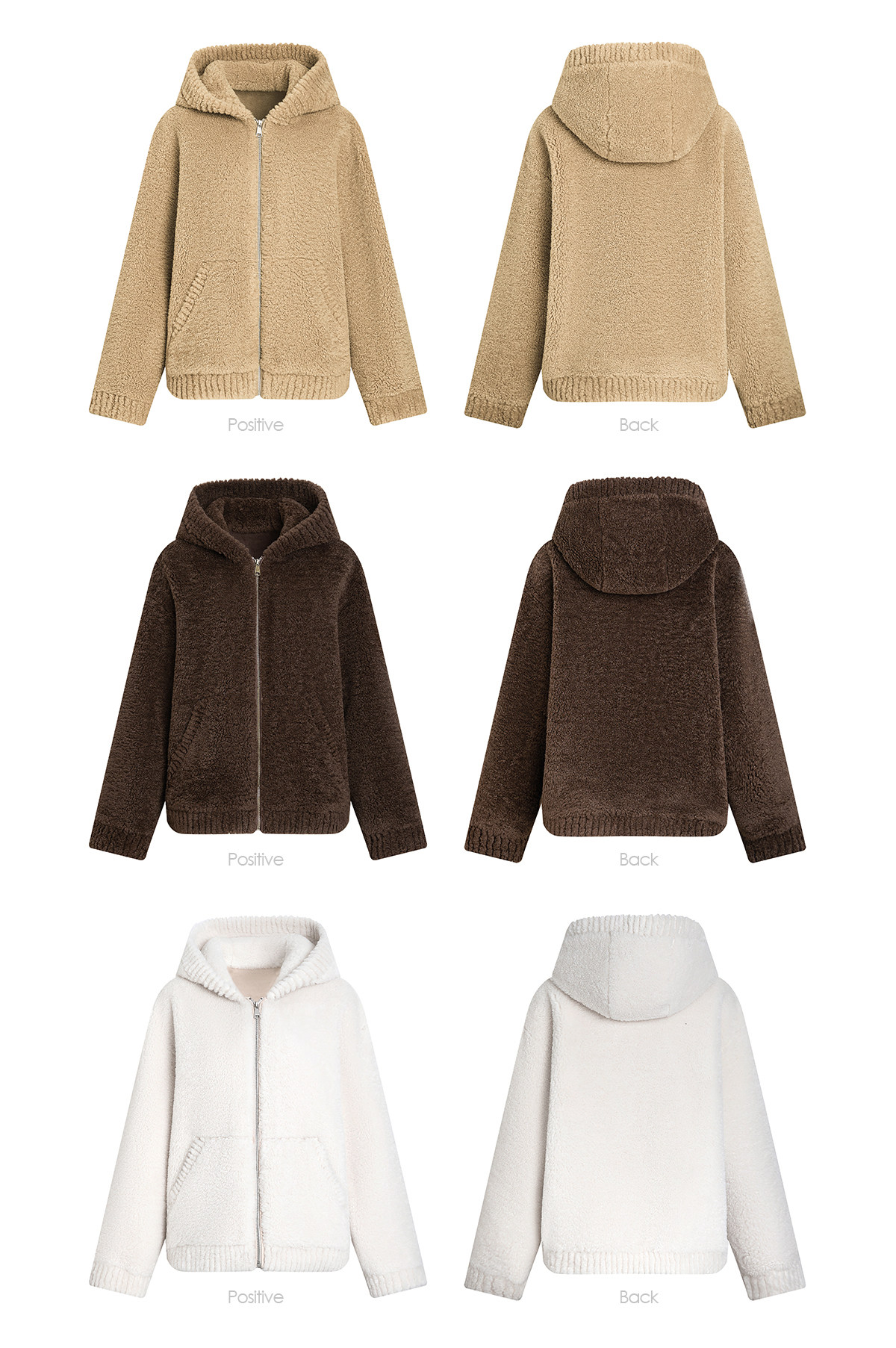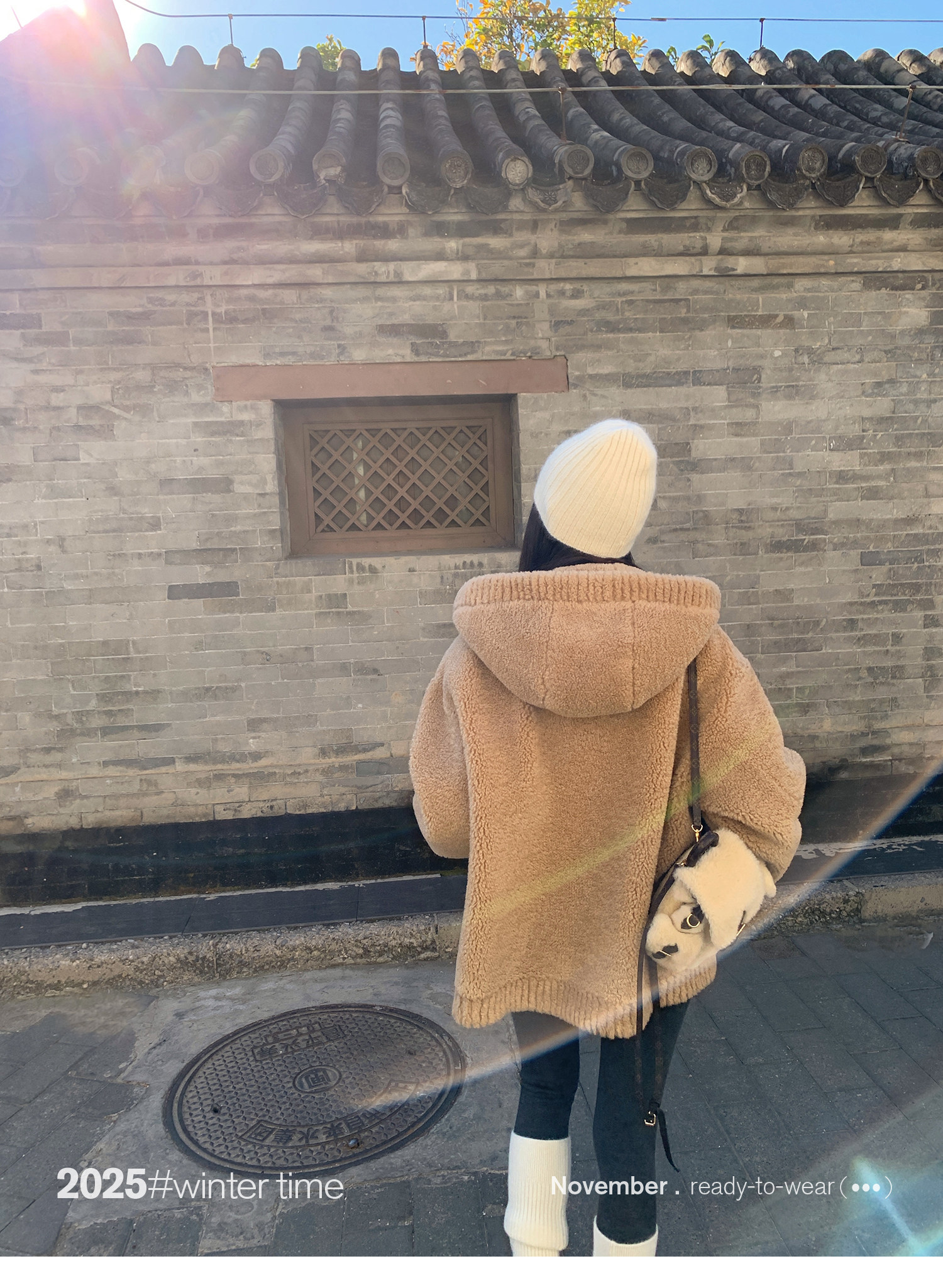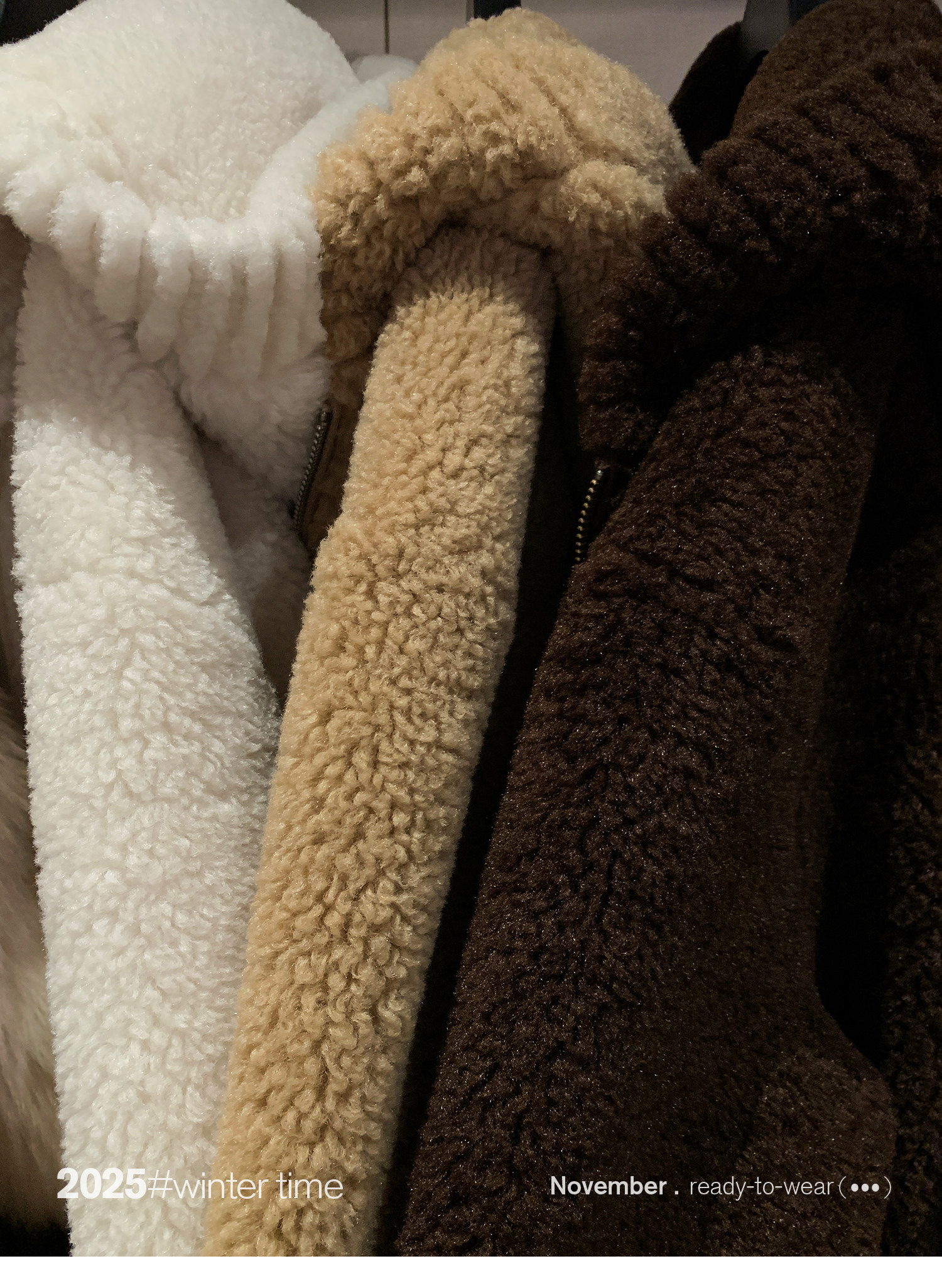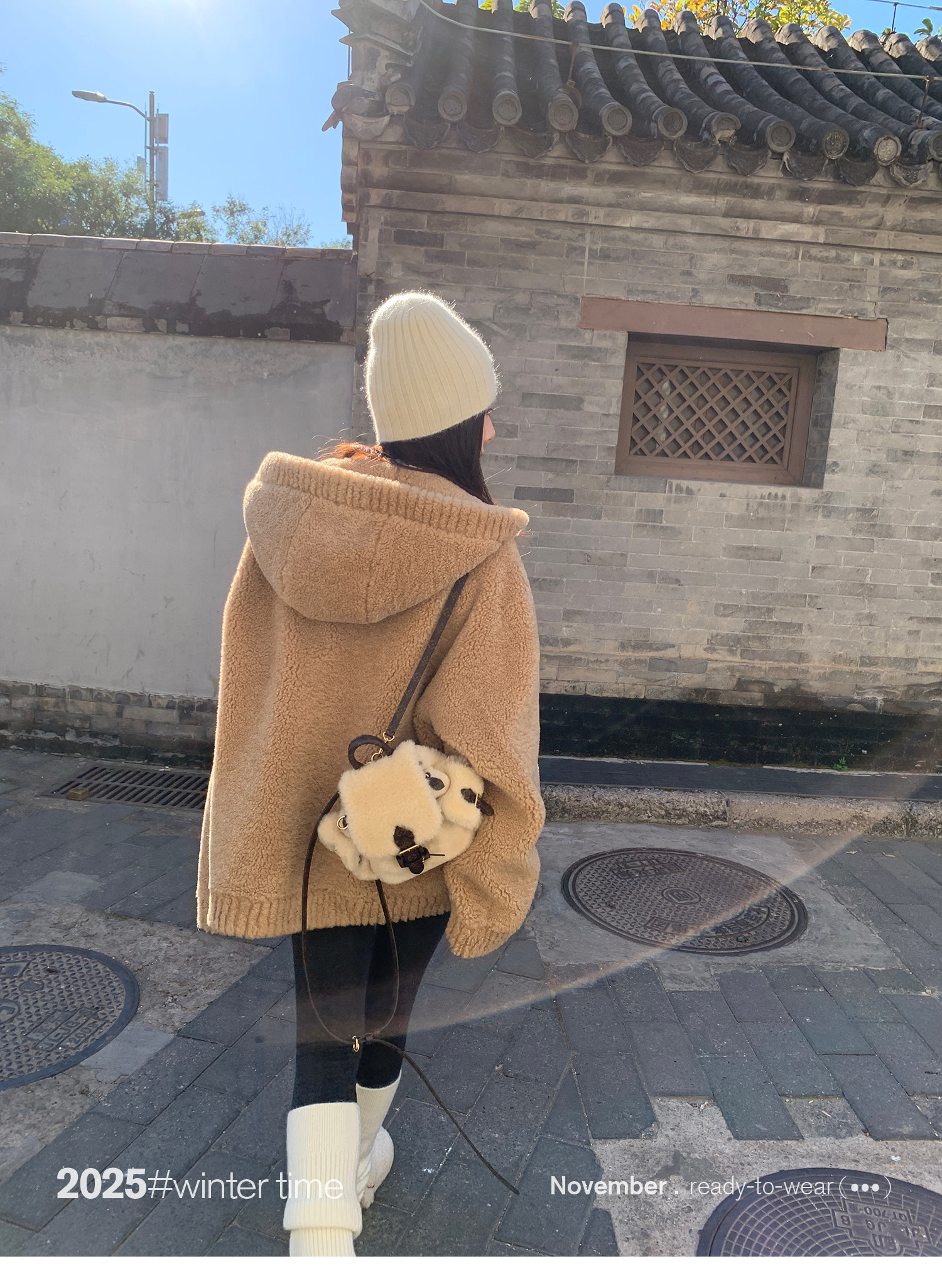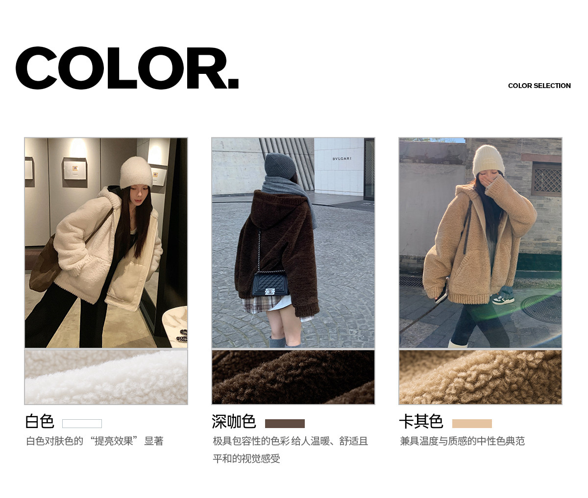 Sunoneone Hooded Pocket Loose Faux Shearling Wool Coat for Women, Winter Woolen Short Coat for Petite Women