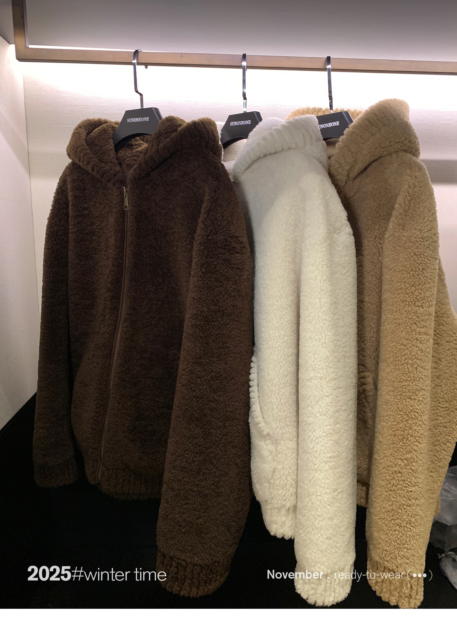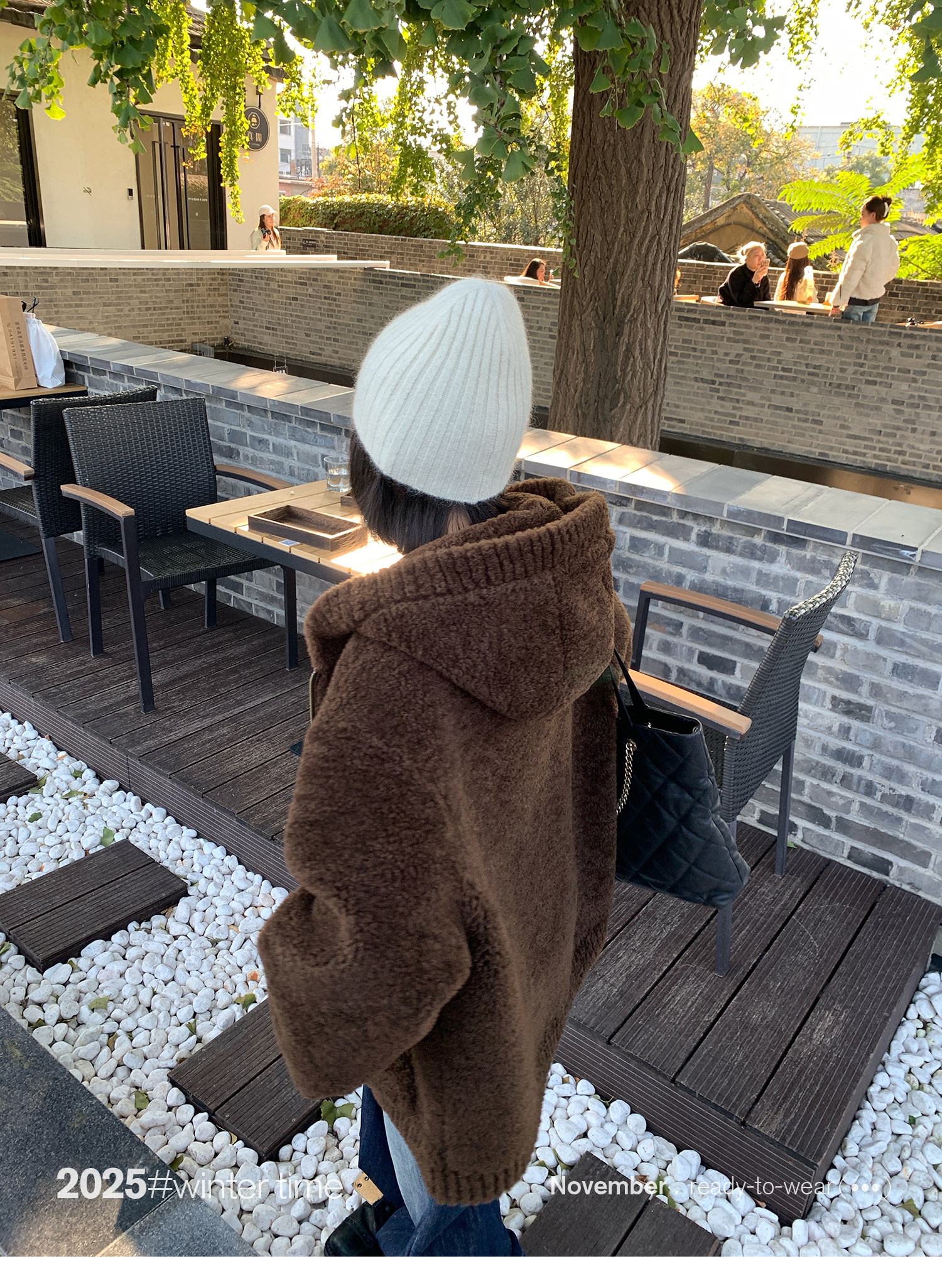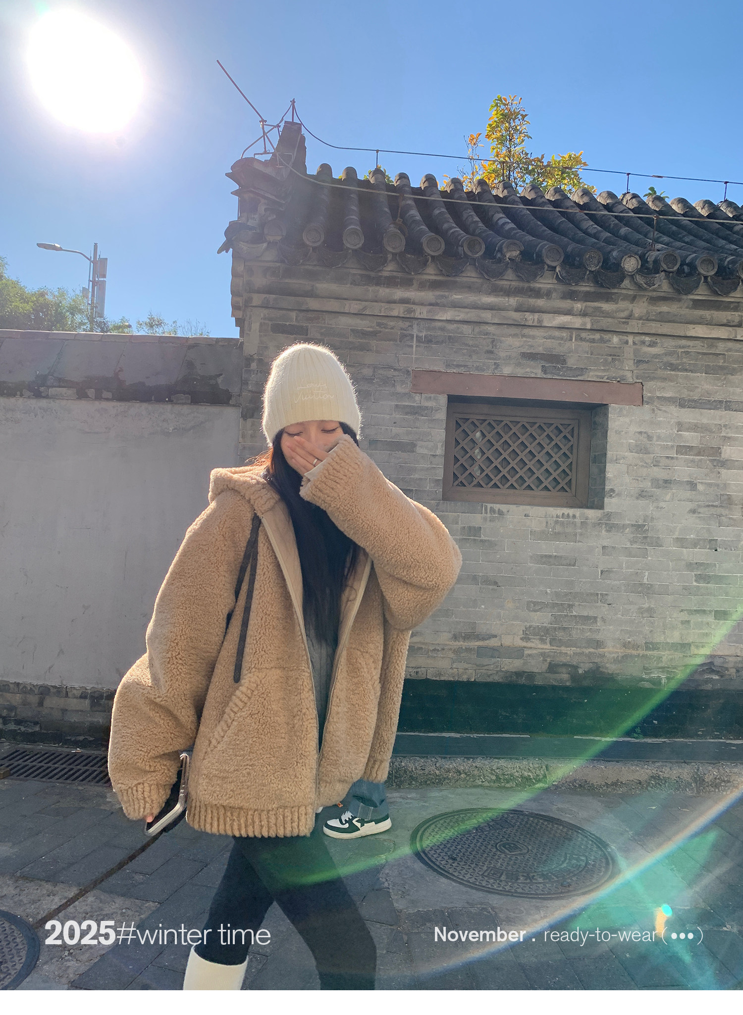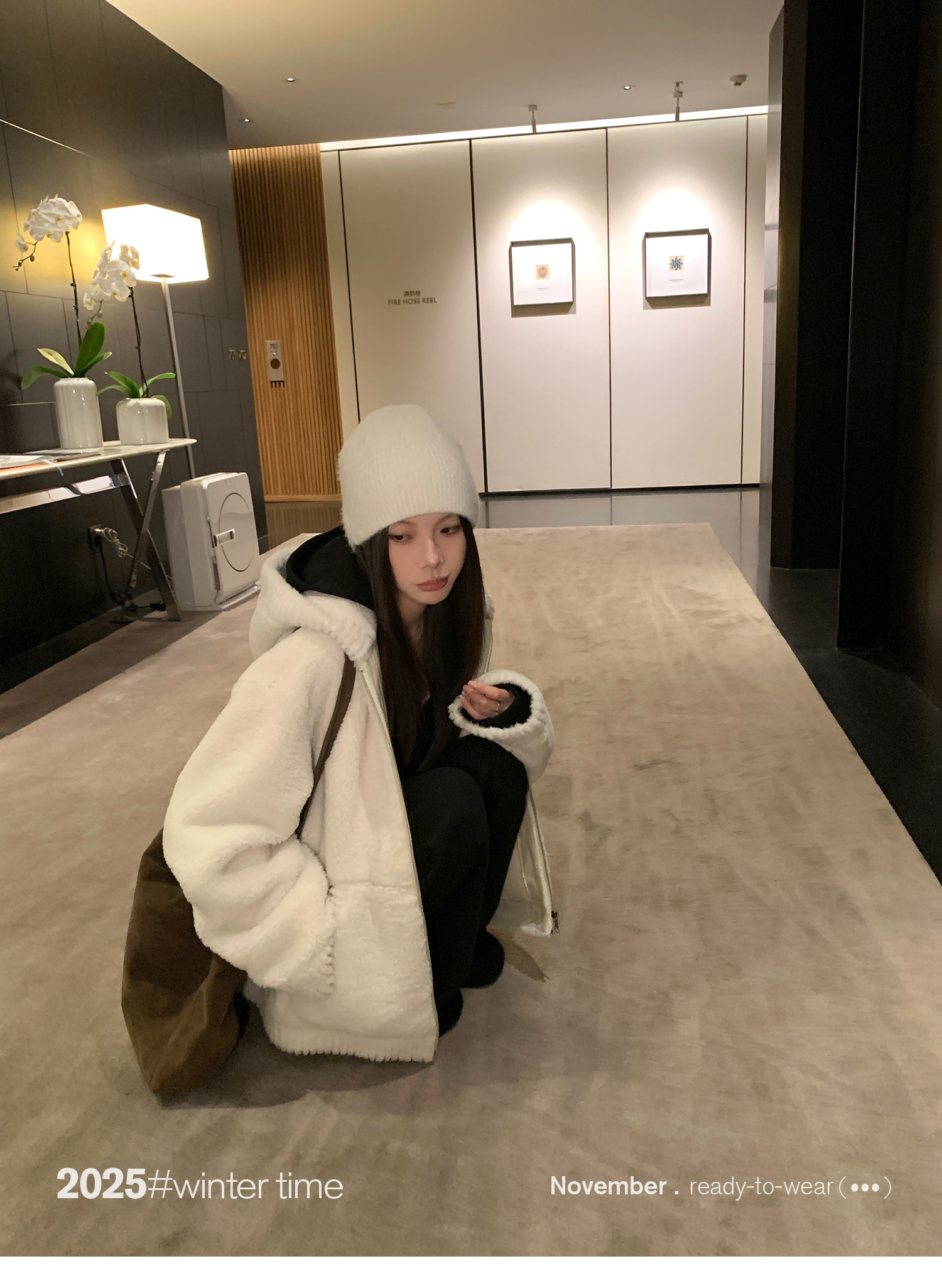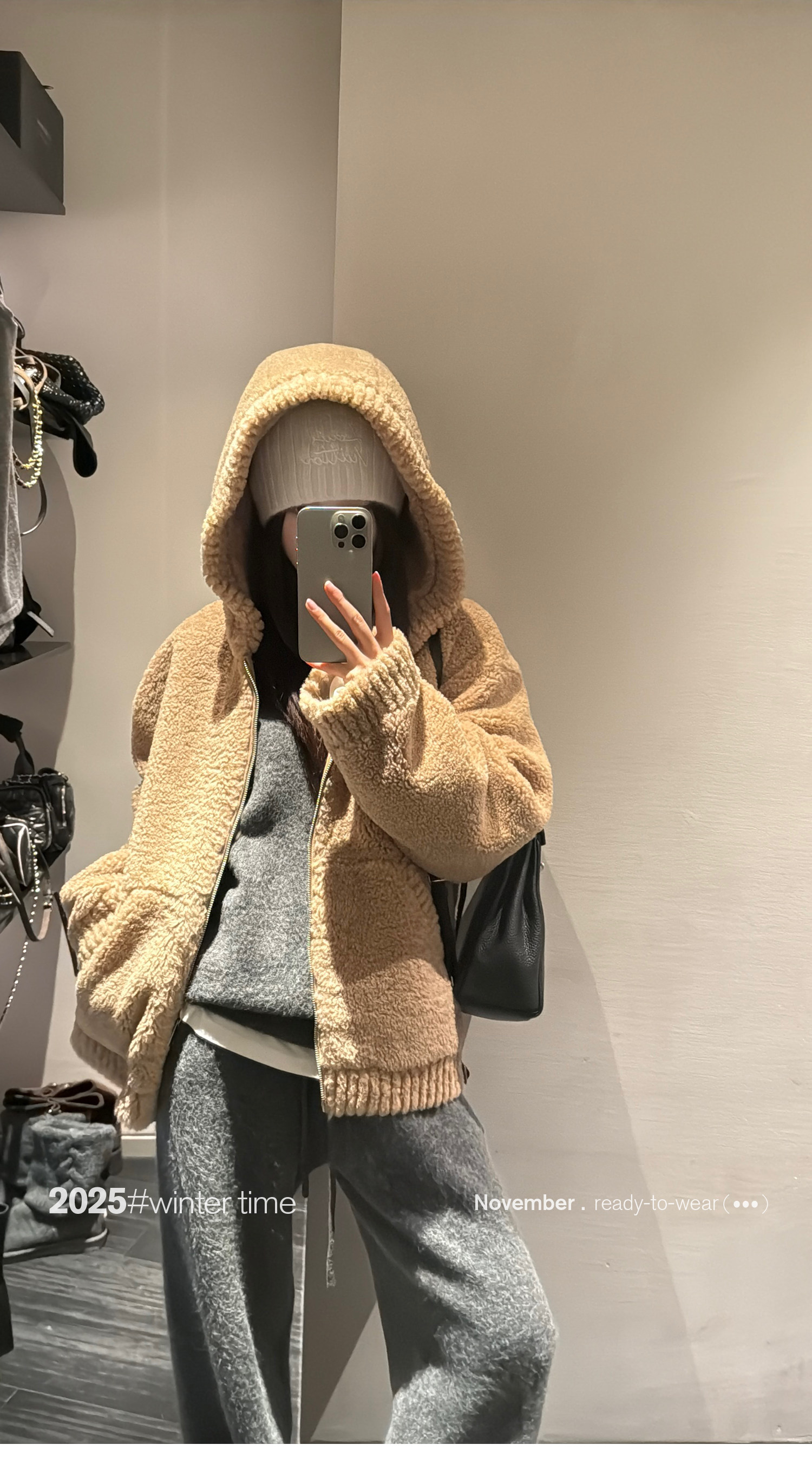 Sunoneone Hooded Pocket Loose Faux Shearling Wool Coat for Women, Winter Woolen Short Coat for Petite Women
