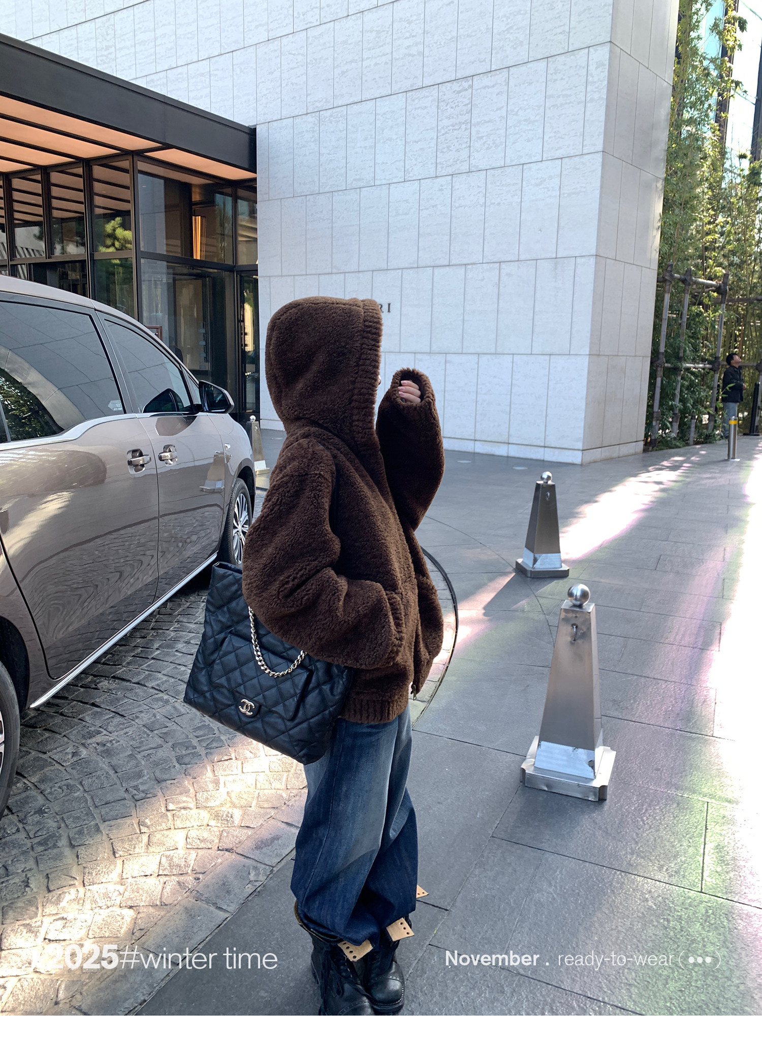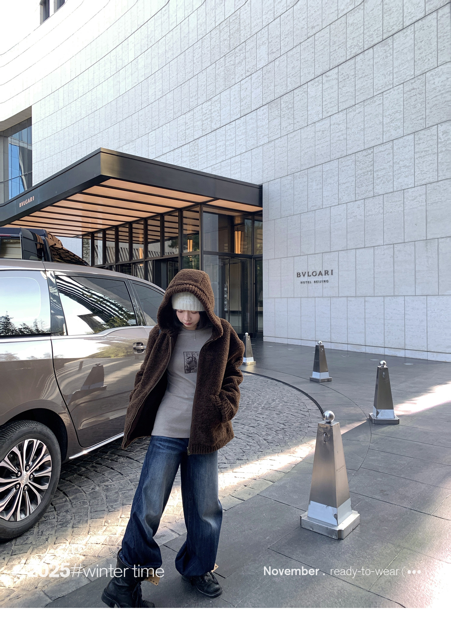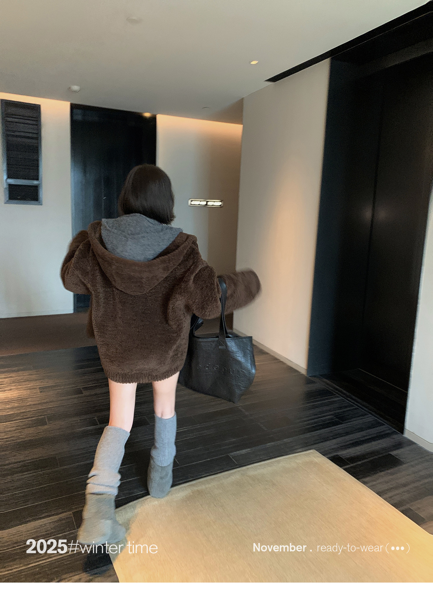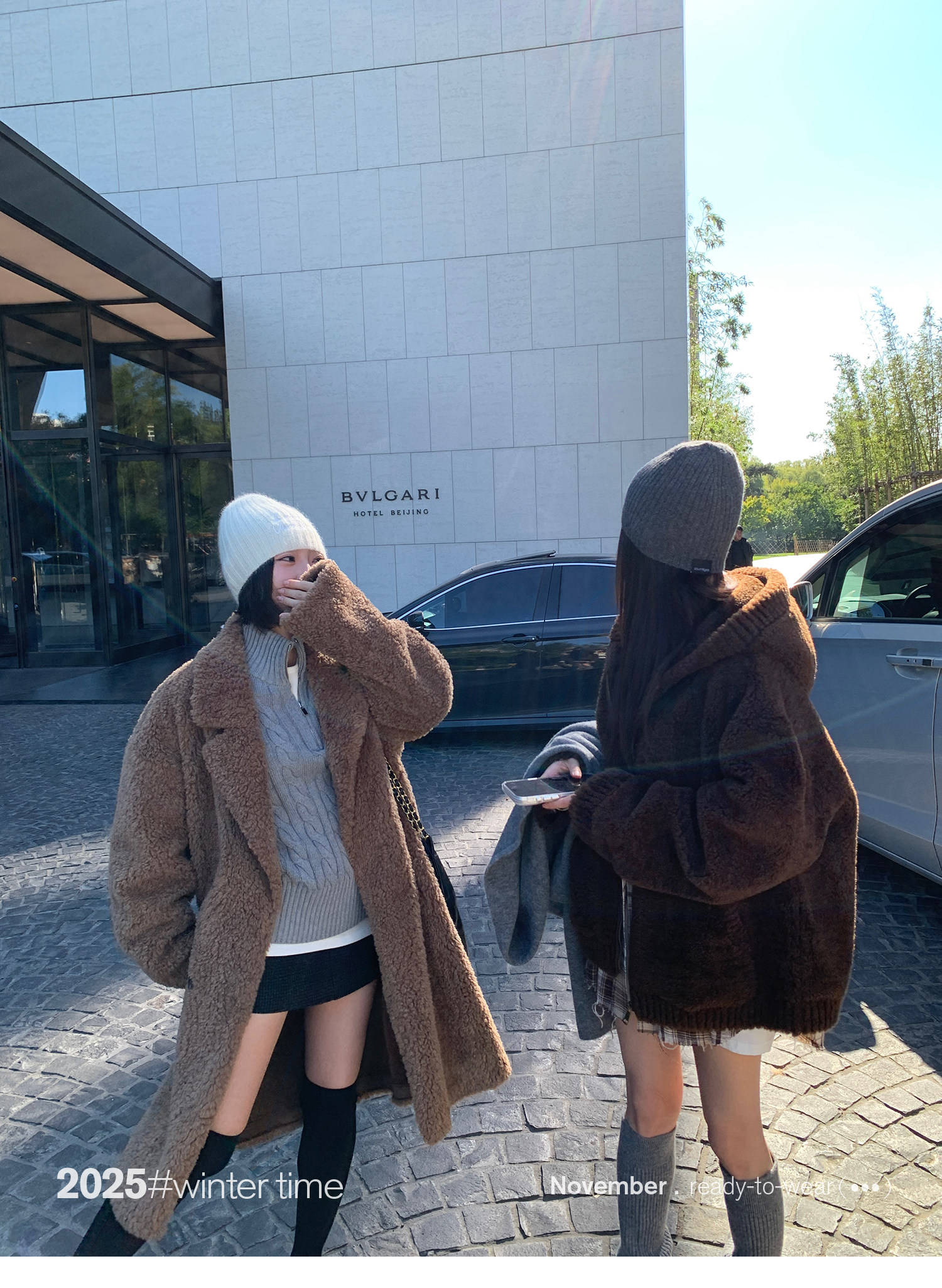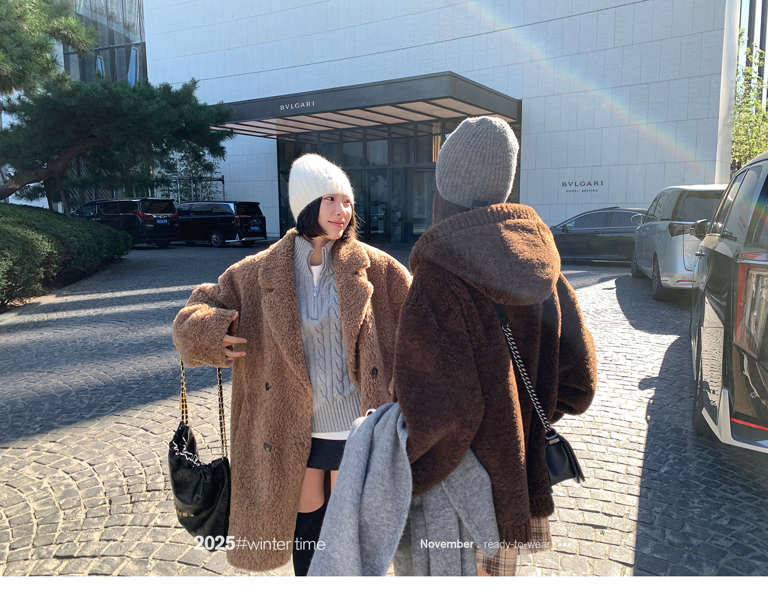 Sunoneone Hooded Pocket Loose Faux Shearling Wool Coat for Women, Winter Woolen Short Coat for Petite Women