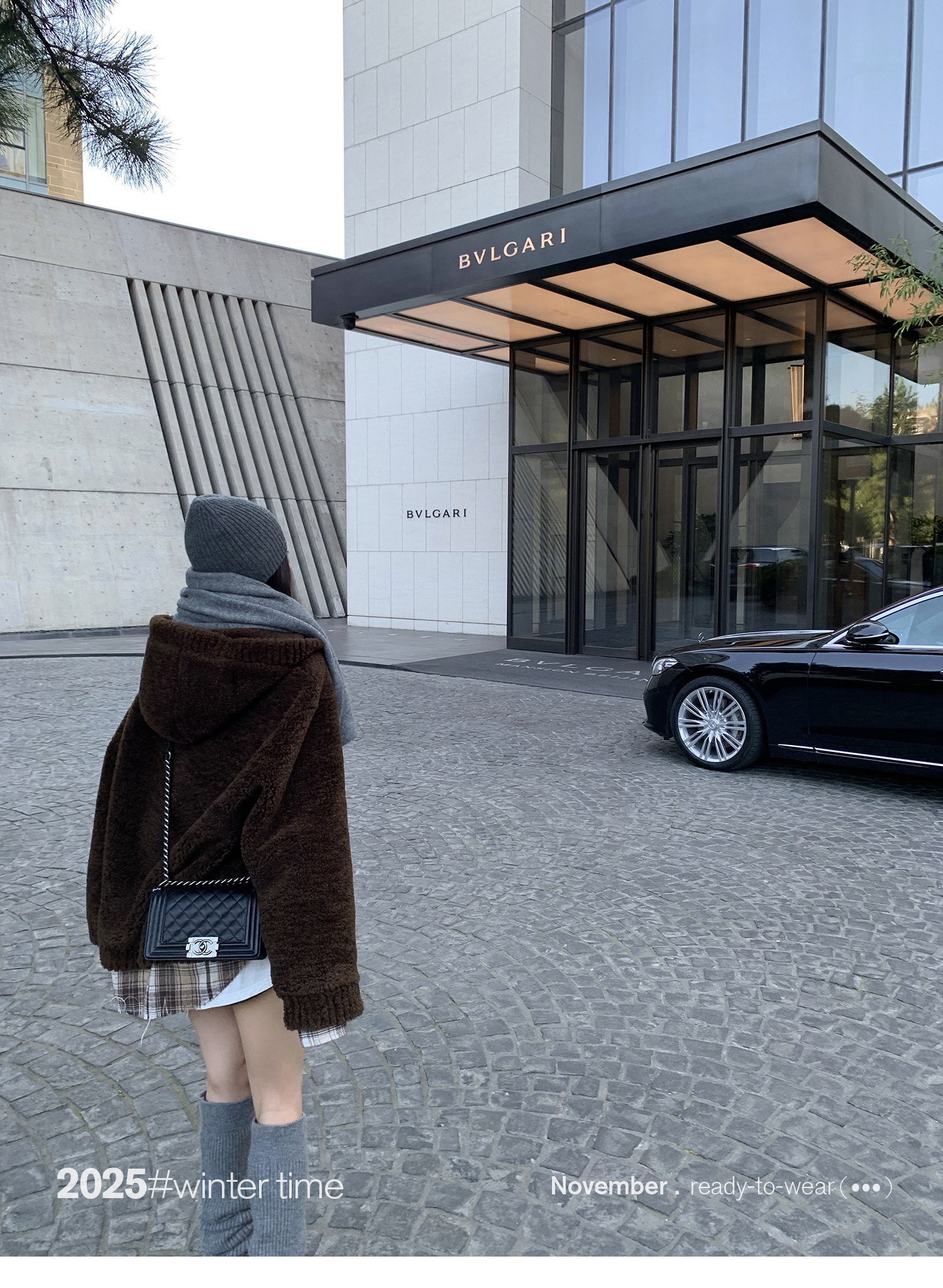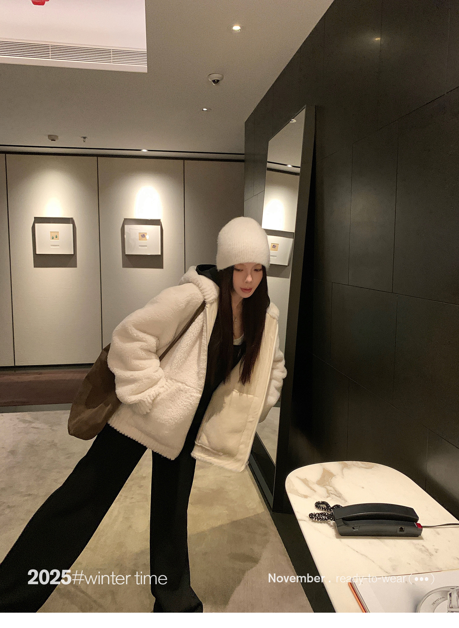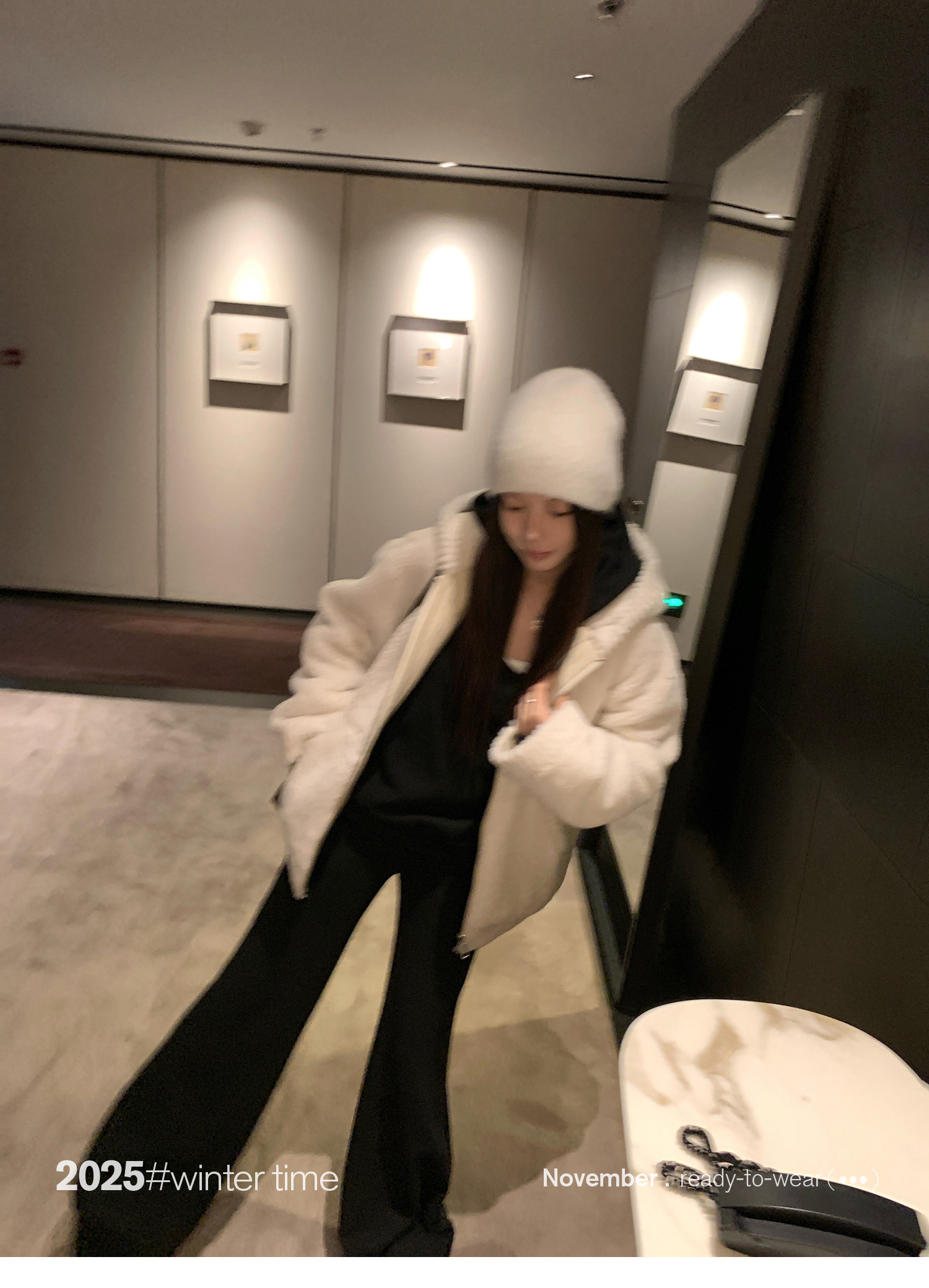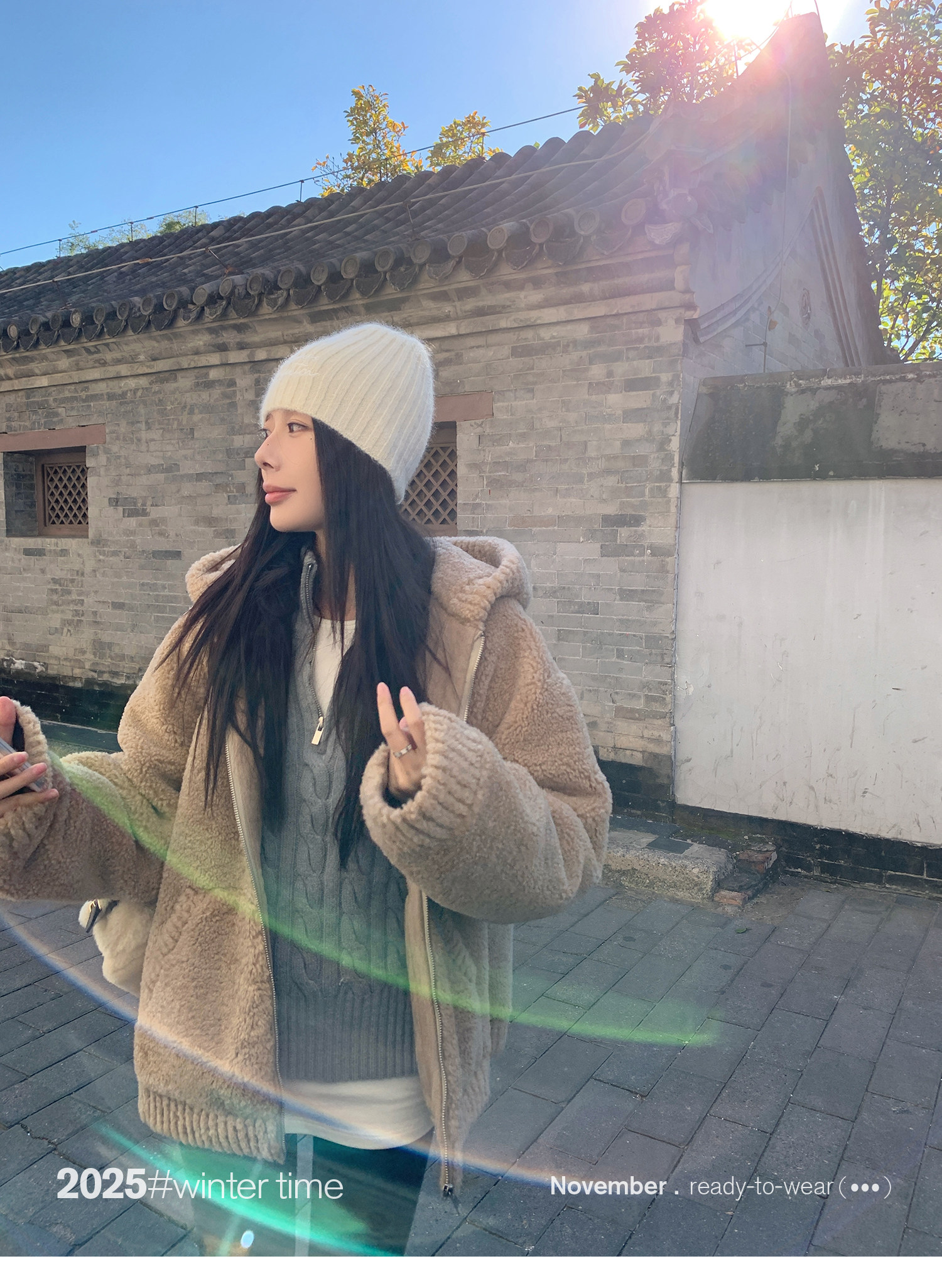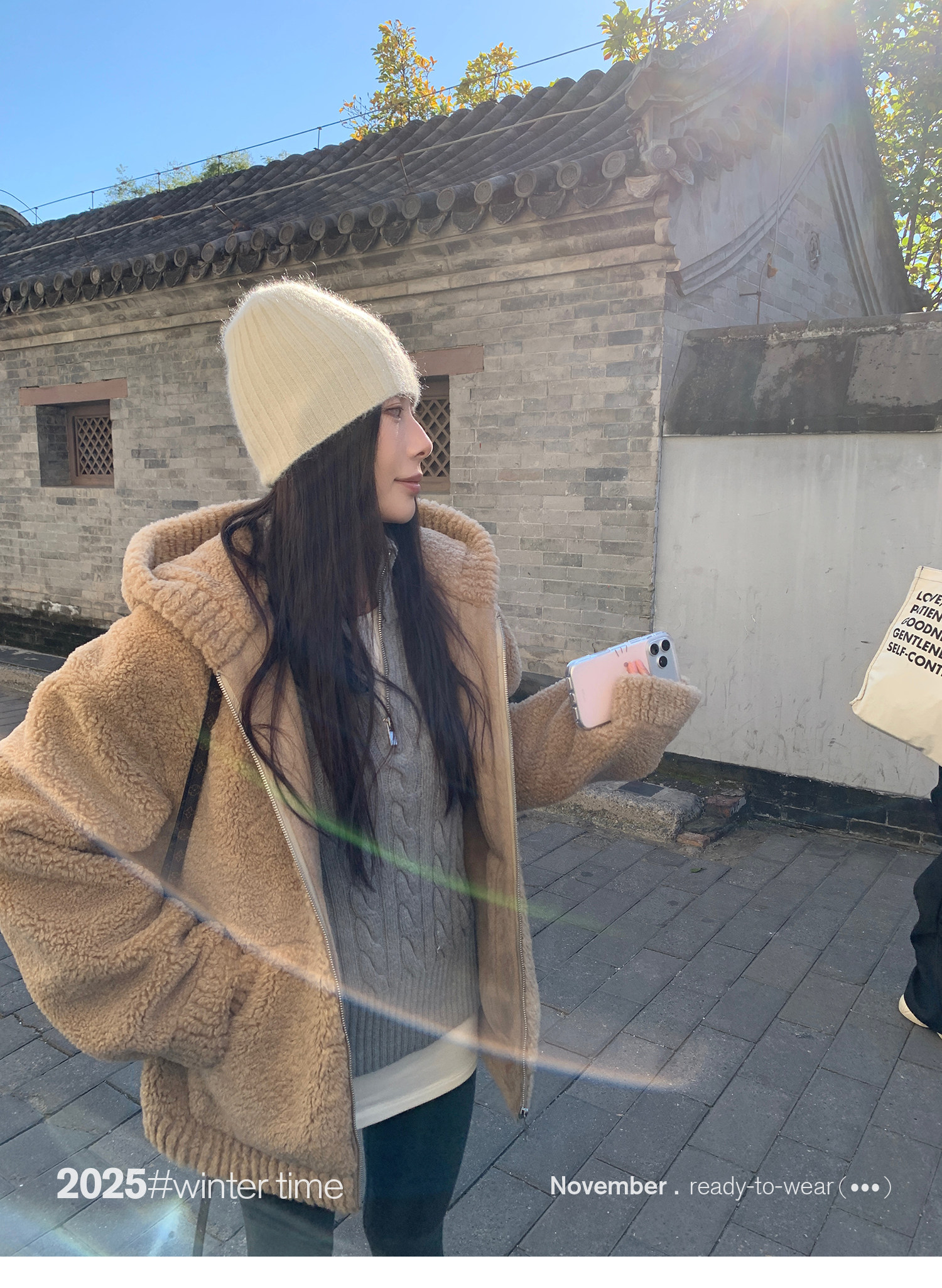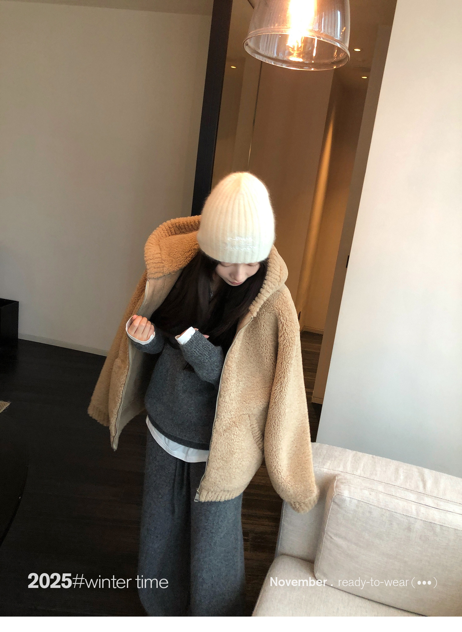 Sunoneone Hooded Pocket Loose Faux Shearling Wool Coat for Women, Winter Woolen Short Coat for Petite Women