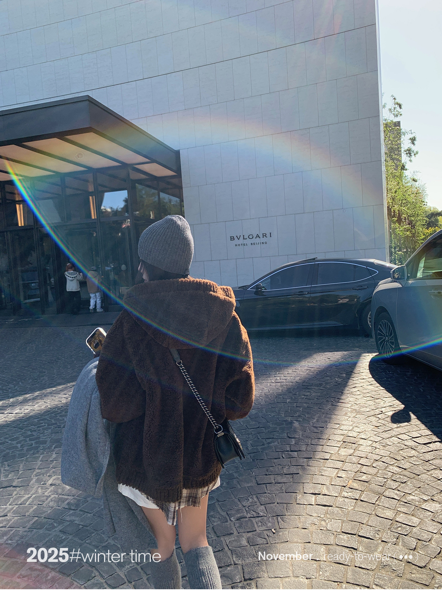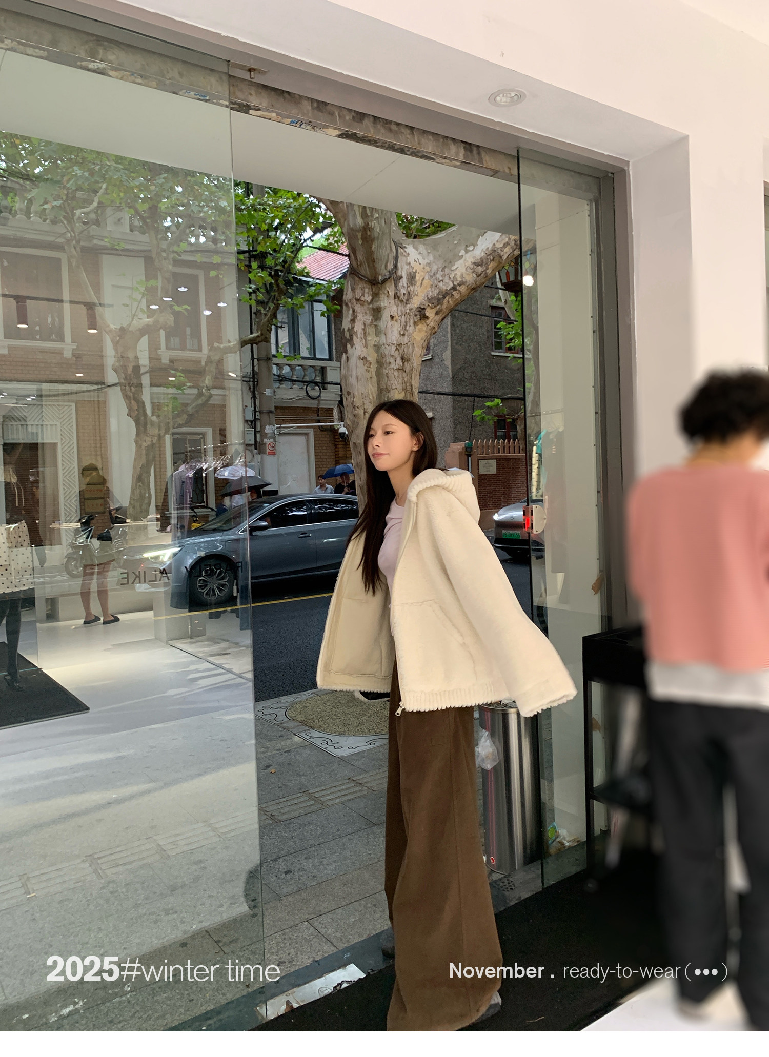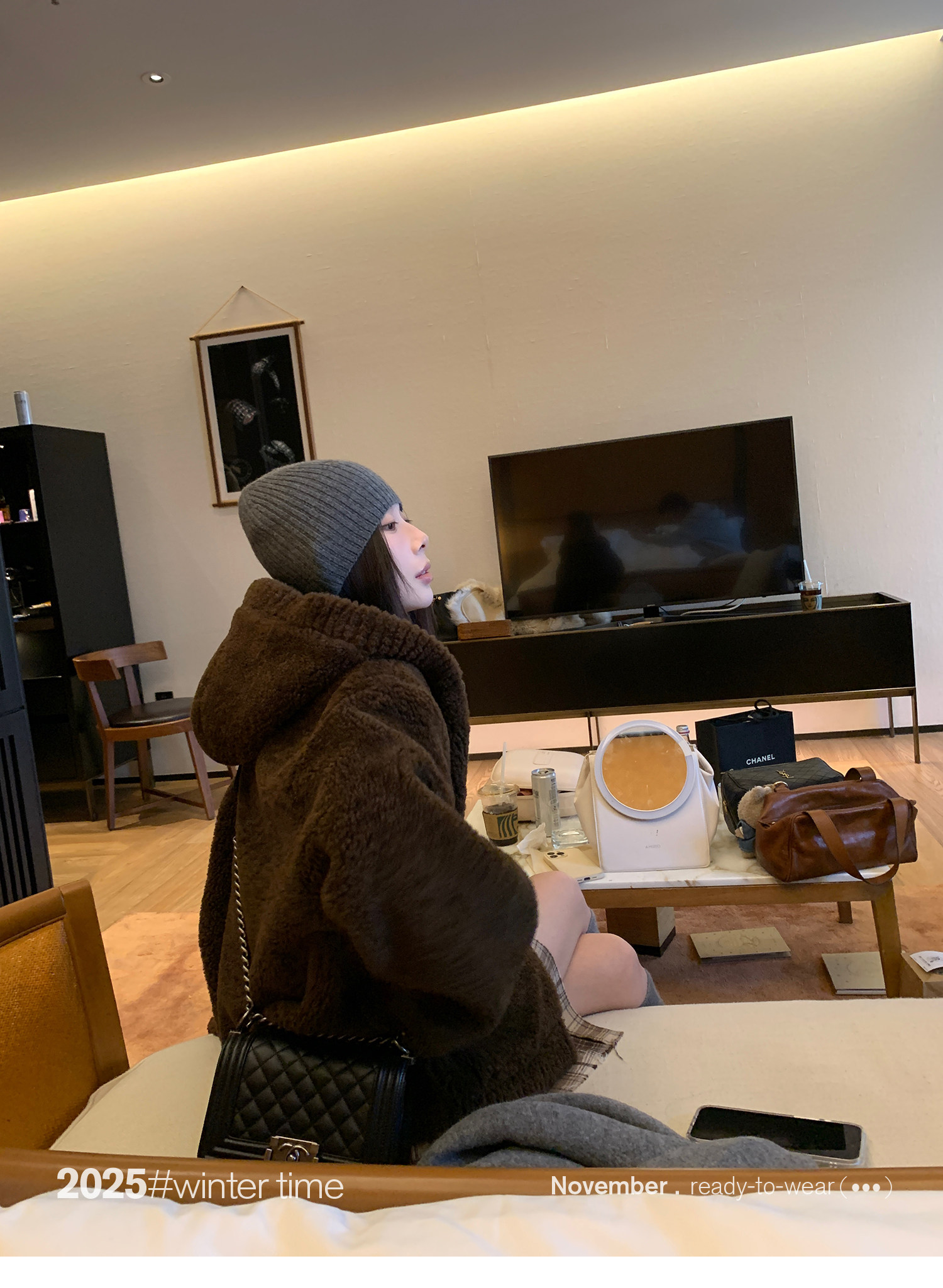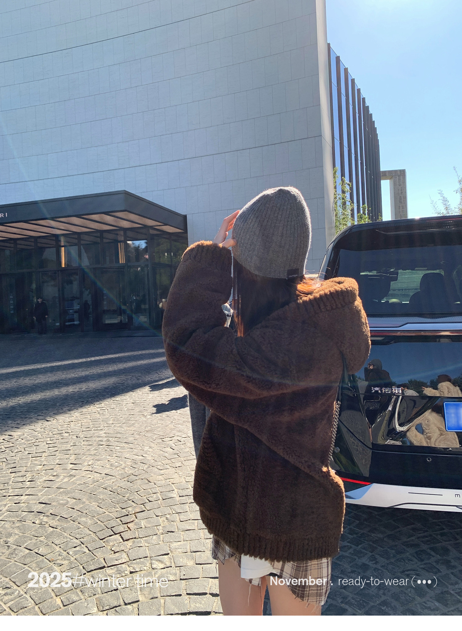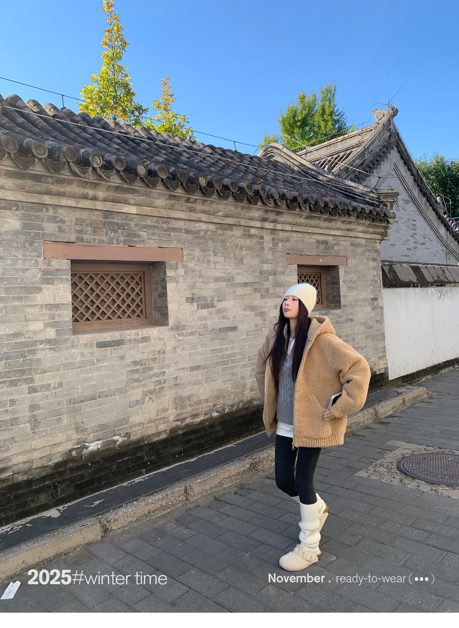 Sunoneone Hooded Pocket Loose Faux Shearling Wool Coat for Women, Winter Woolen Short Coat for Petite Women
