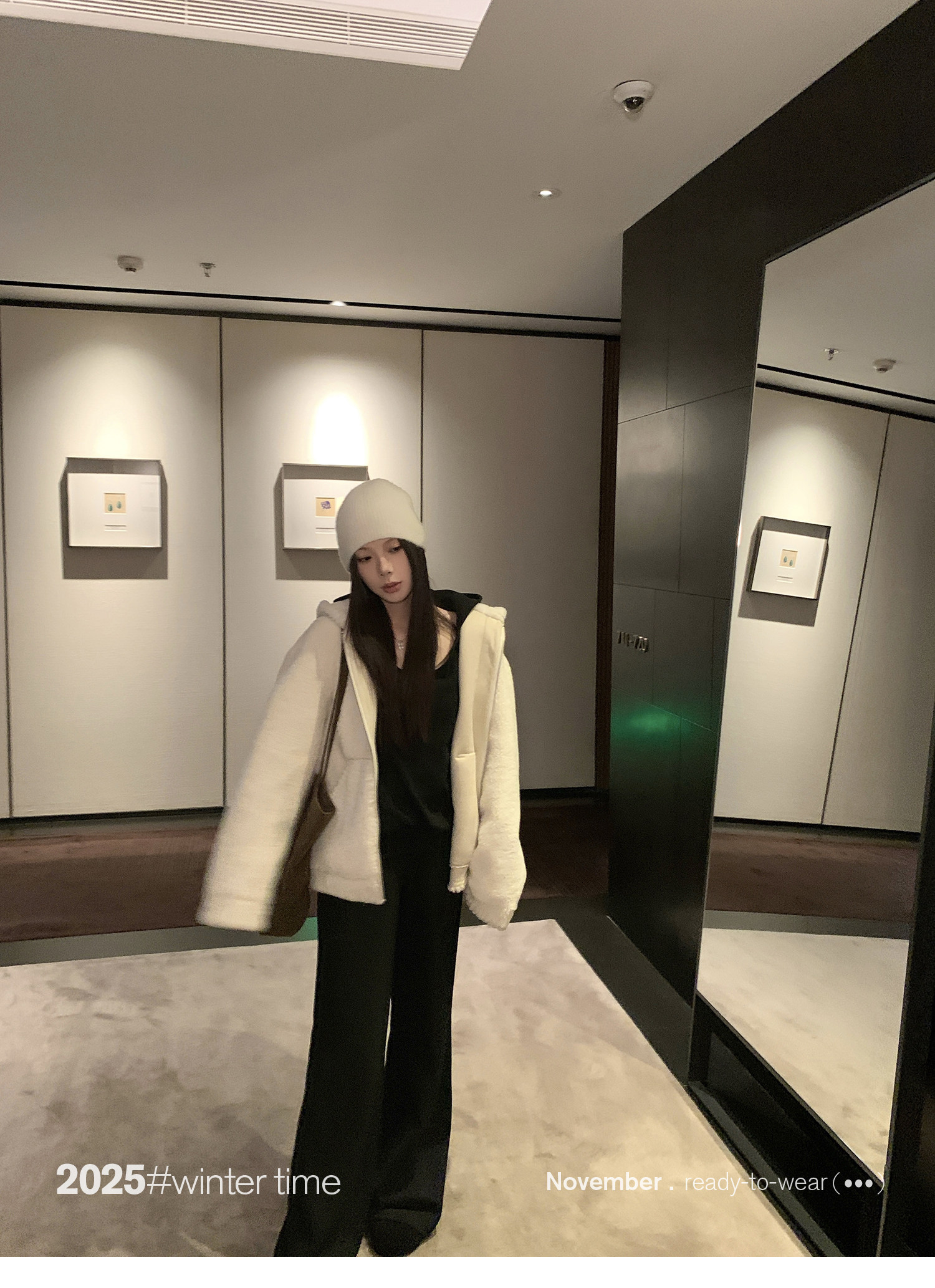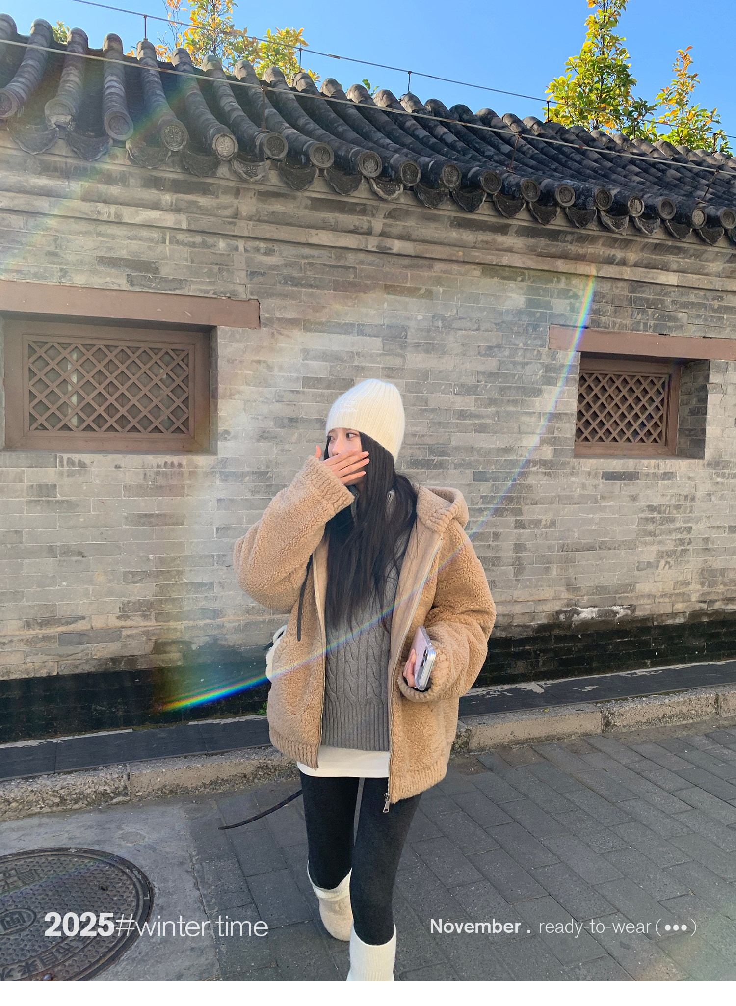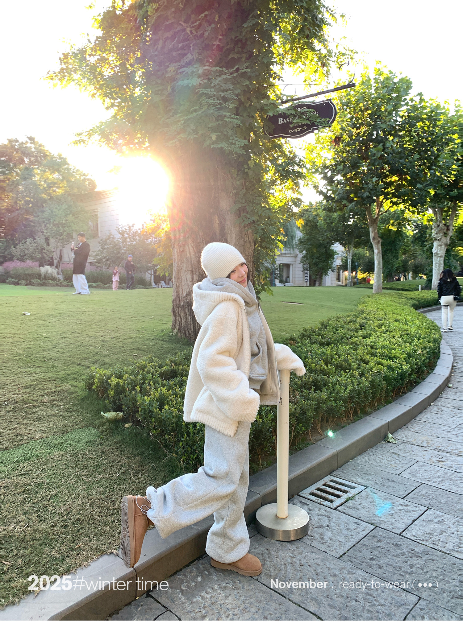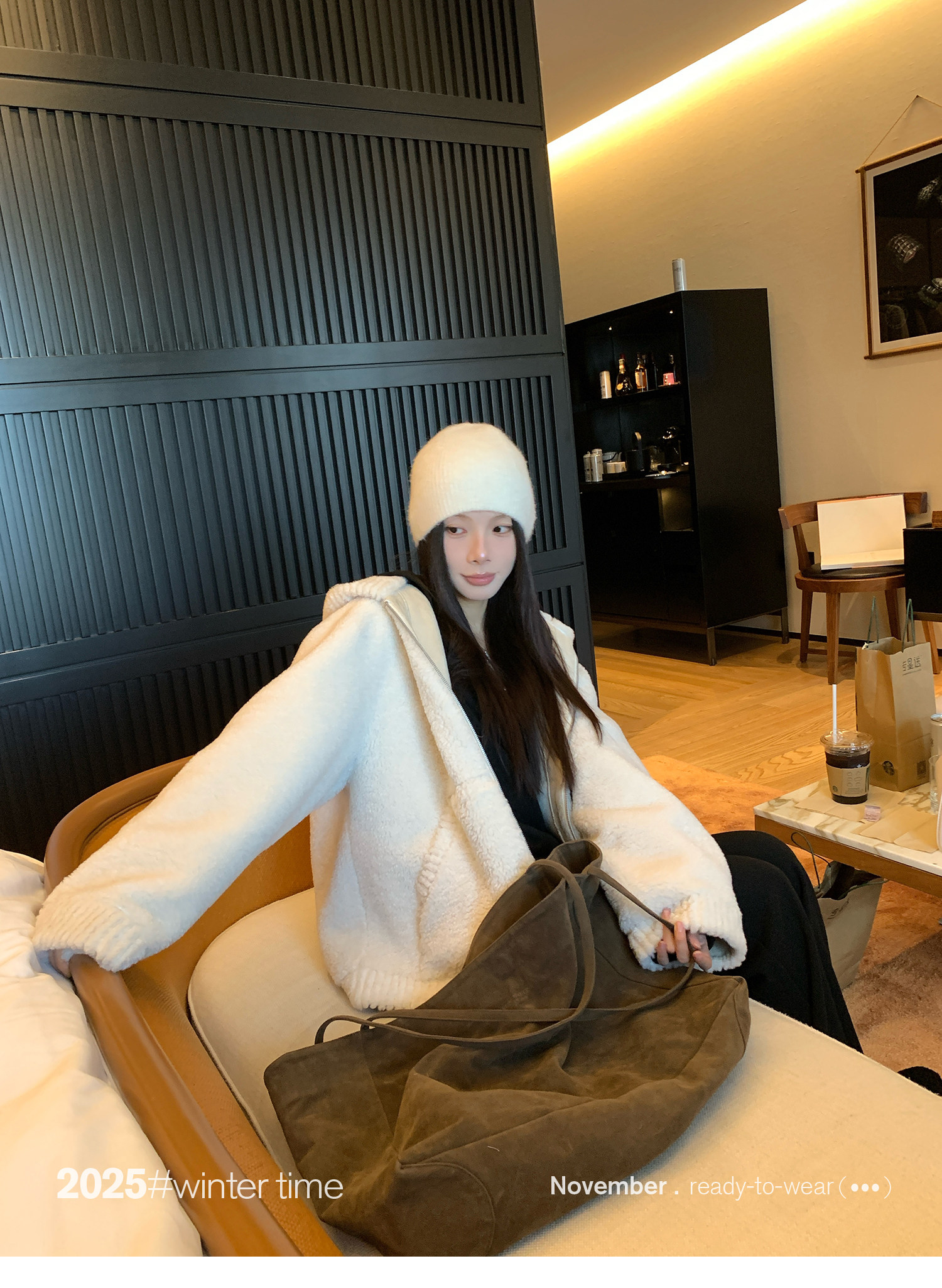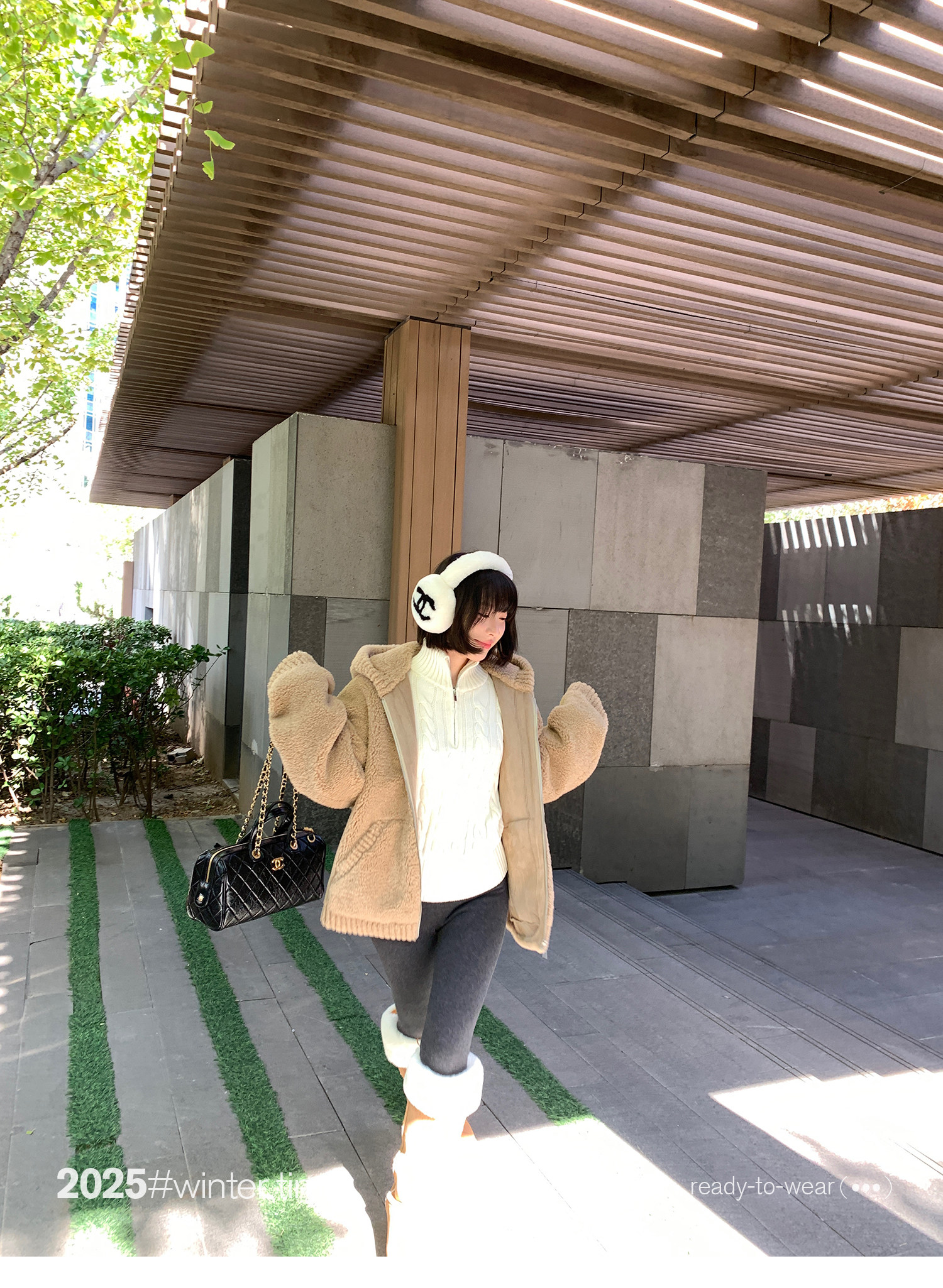 Sunoneone Hooded Pocket Loose Faux Shearling Wool Coat for Women, Winter Woolen Short Coat for Petite Women