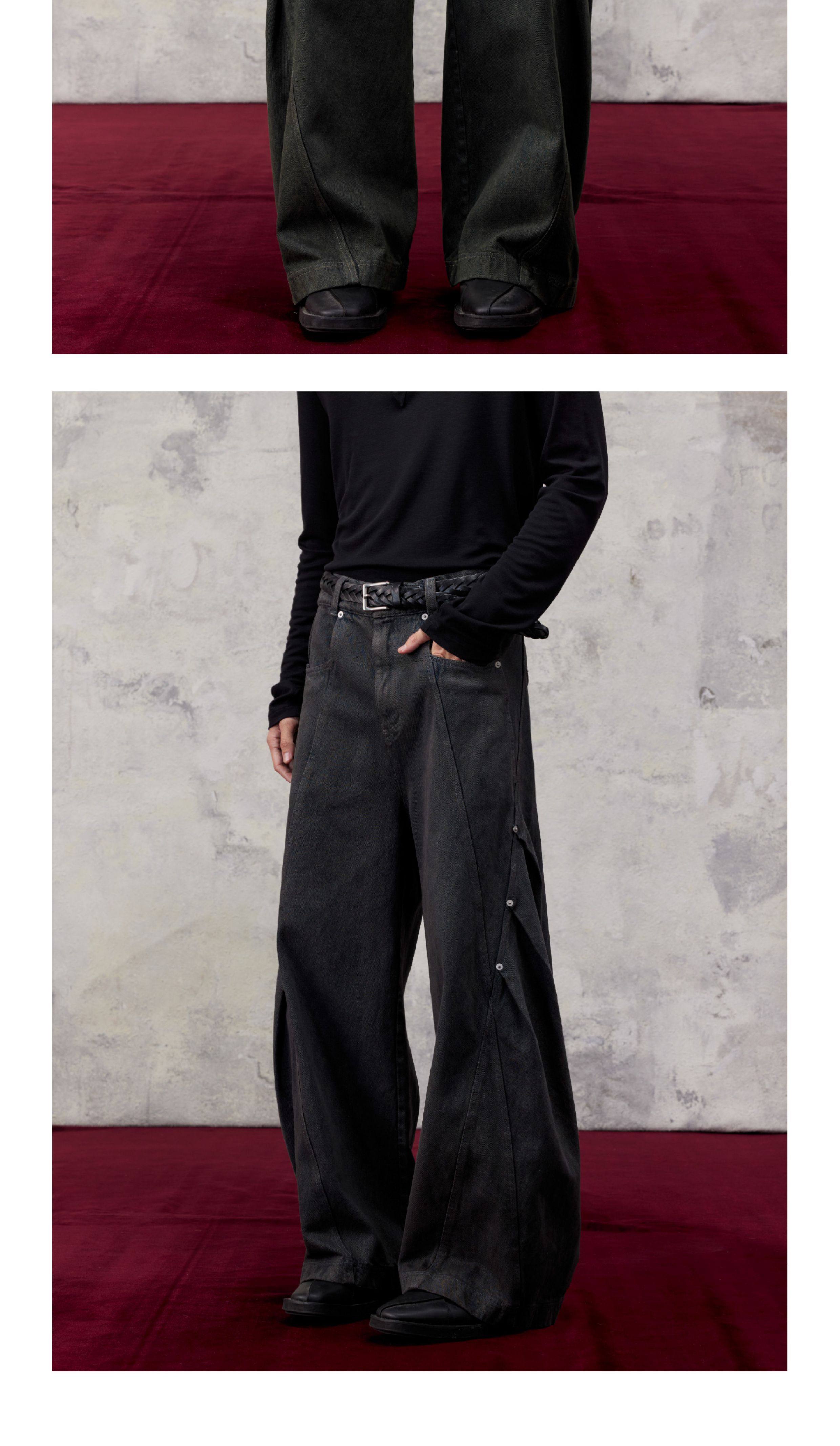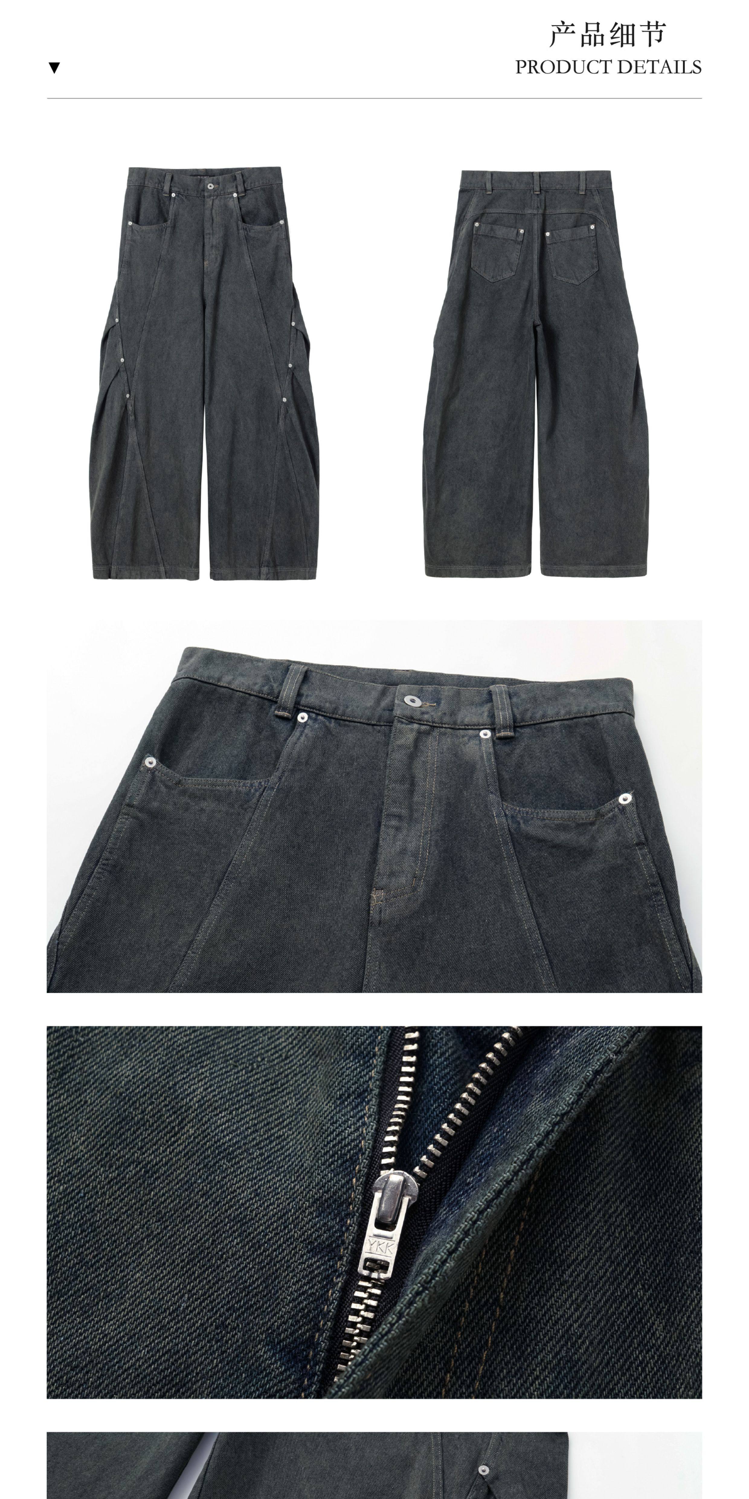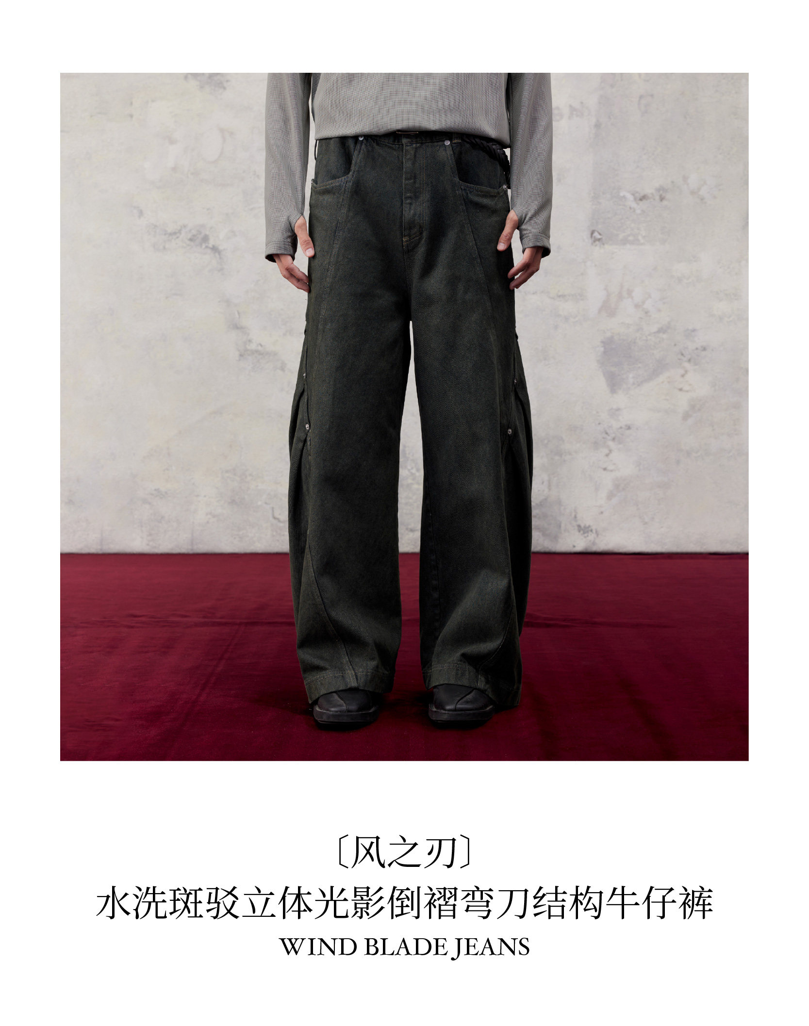 Yunyi [Wind Blade] Washed Distressed Three-Dimensional Light and Shadow Pleated Curved Knife Heavy Denim Silhouette Structure Jeans