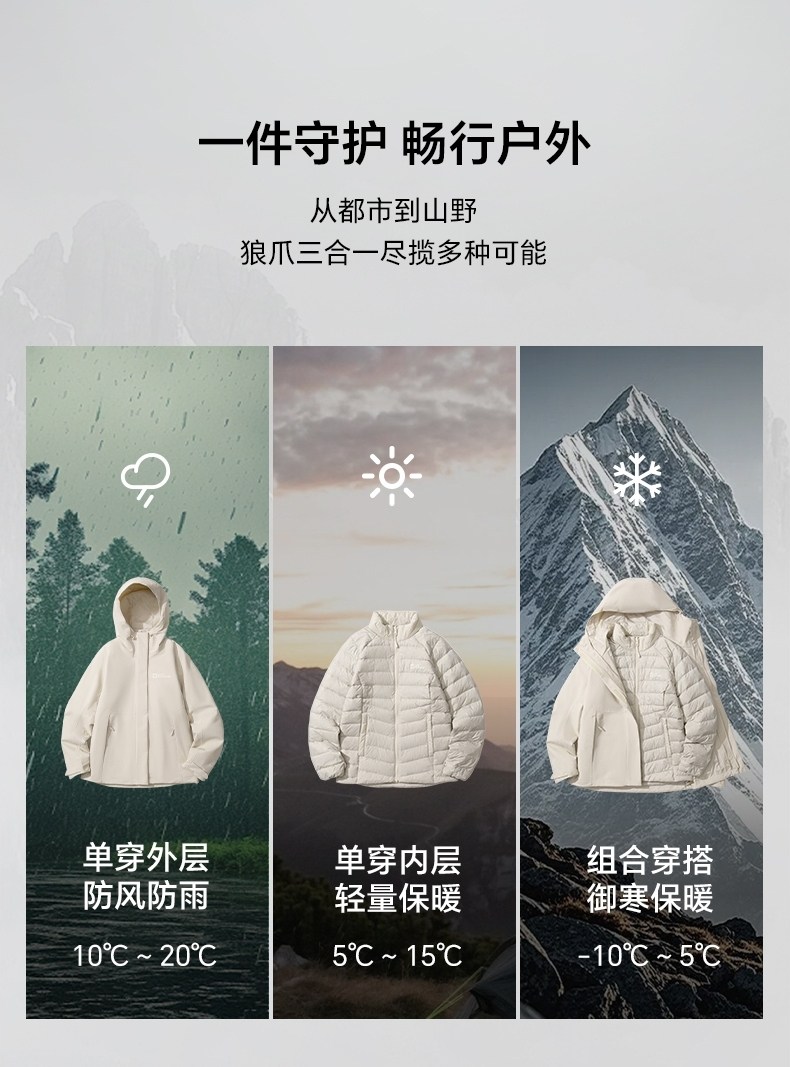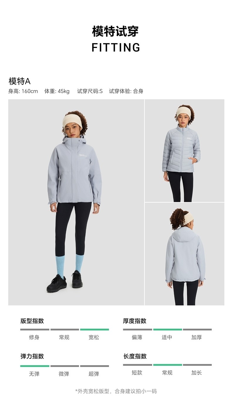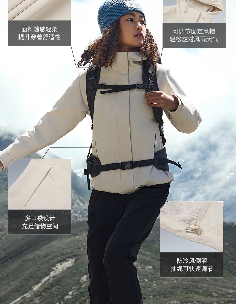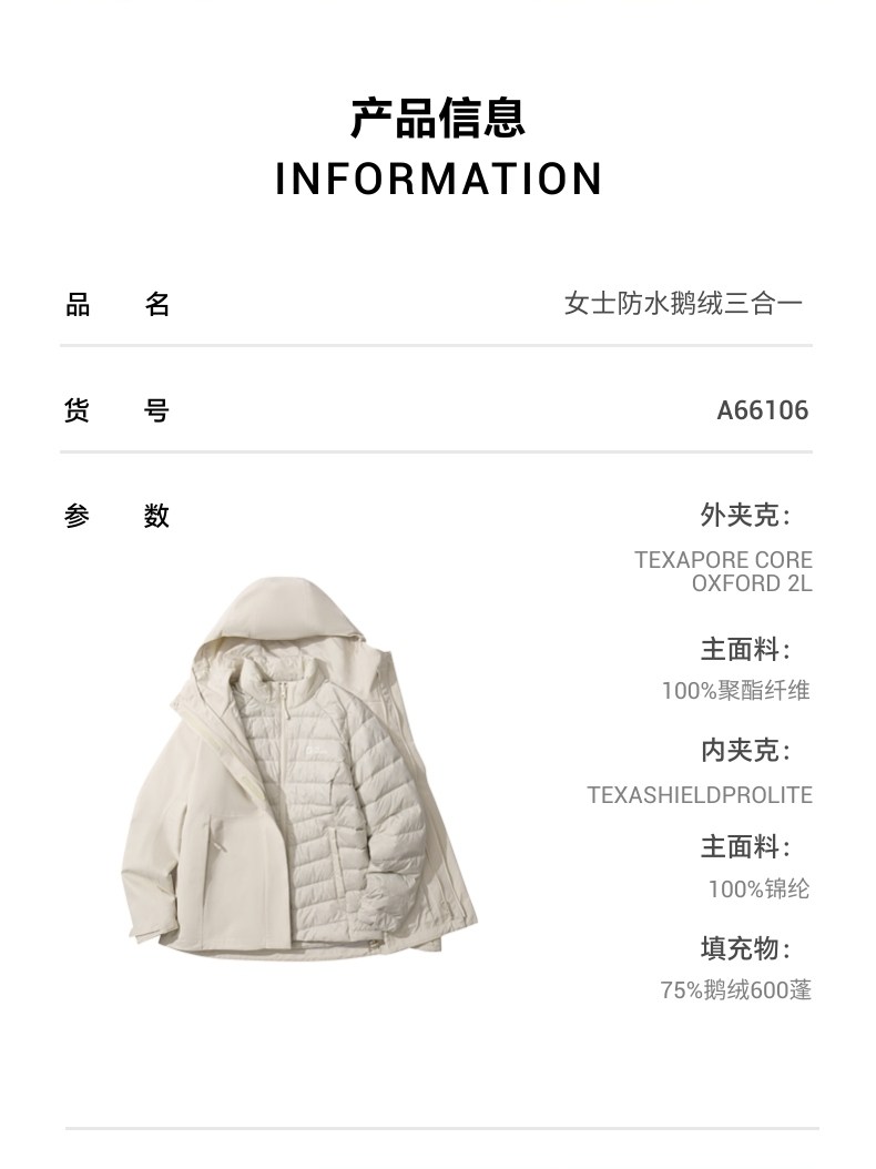 Jackwolfskin Wolf Claw 25 Autumn and Winter New Women's Windproof and Waterproof Goose down Three-In-One Jacket A66106