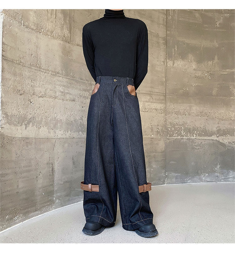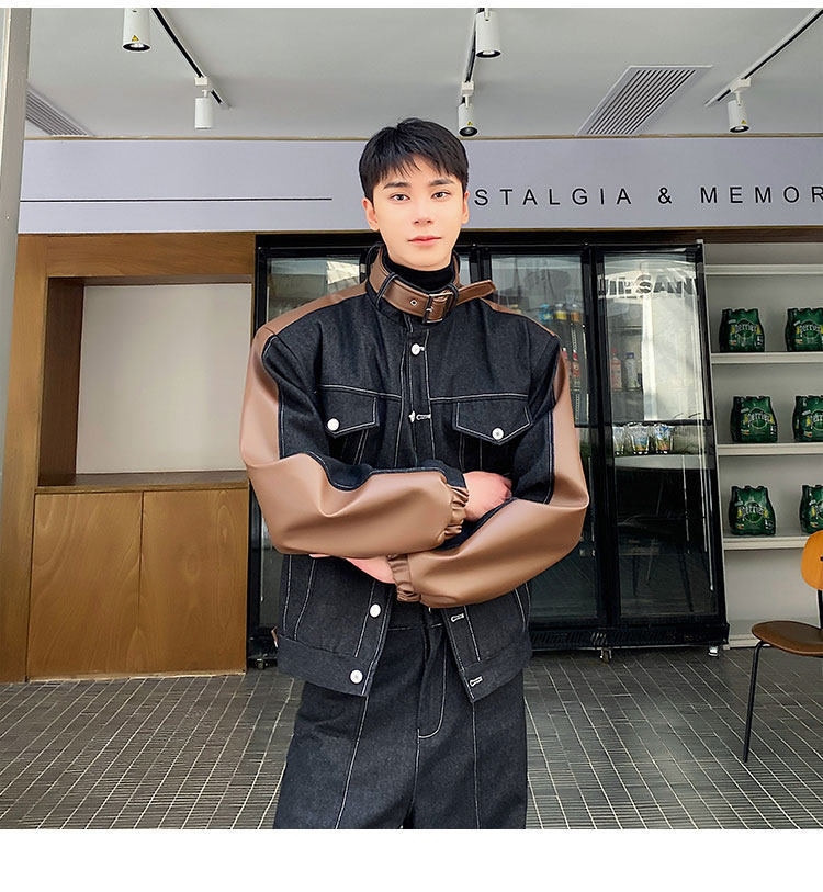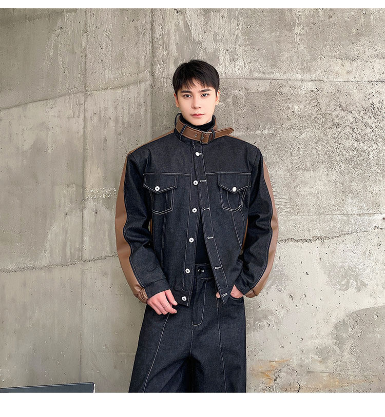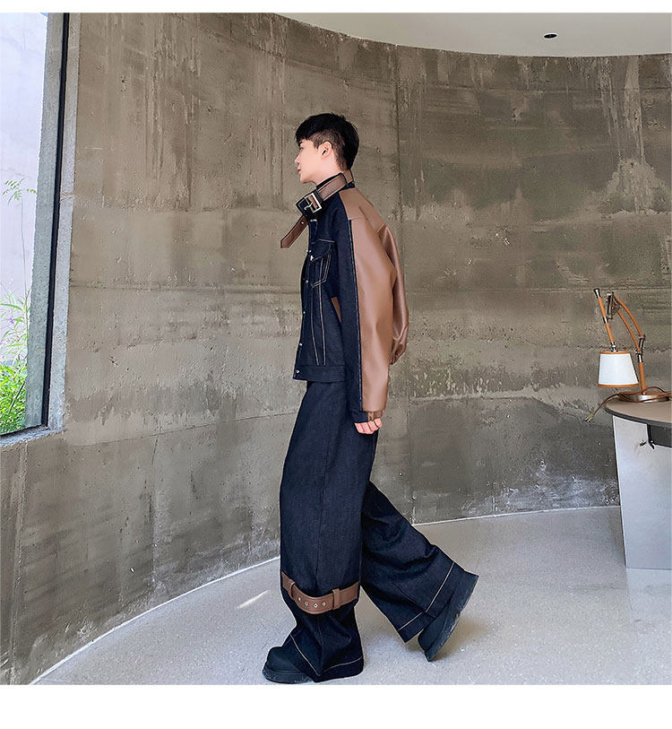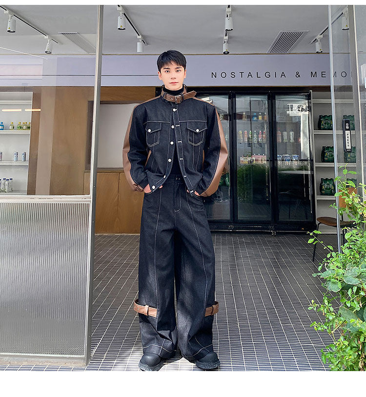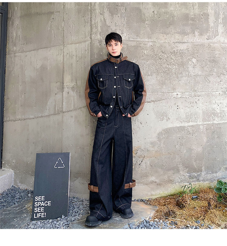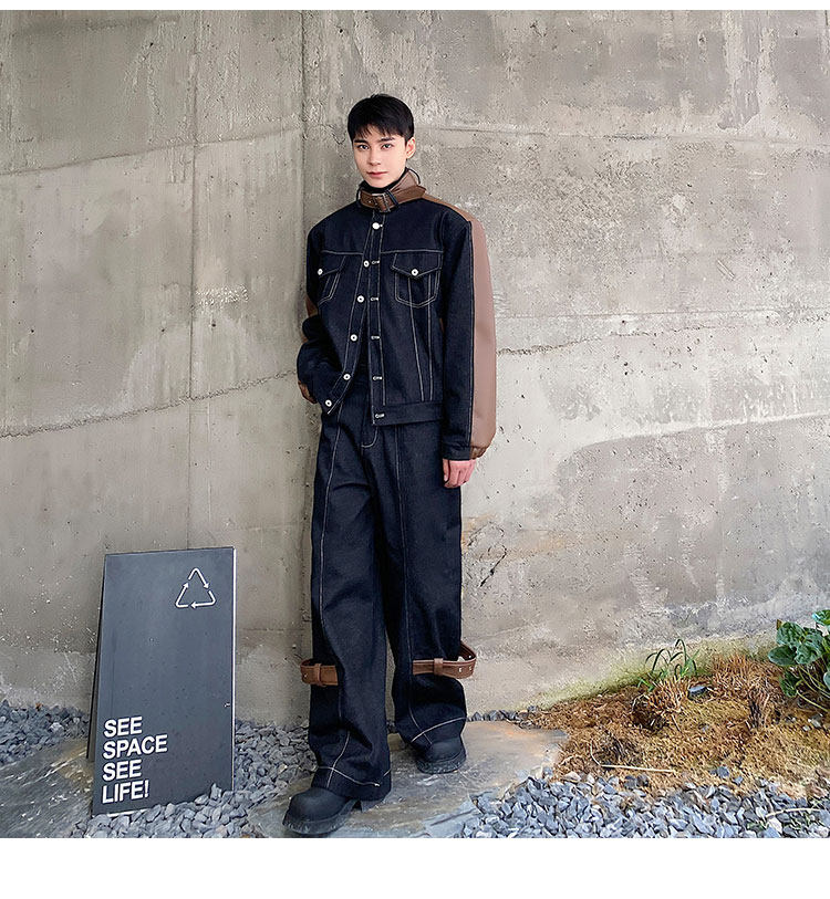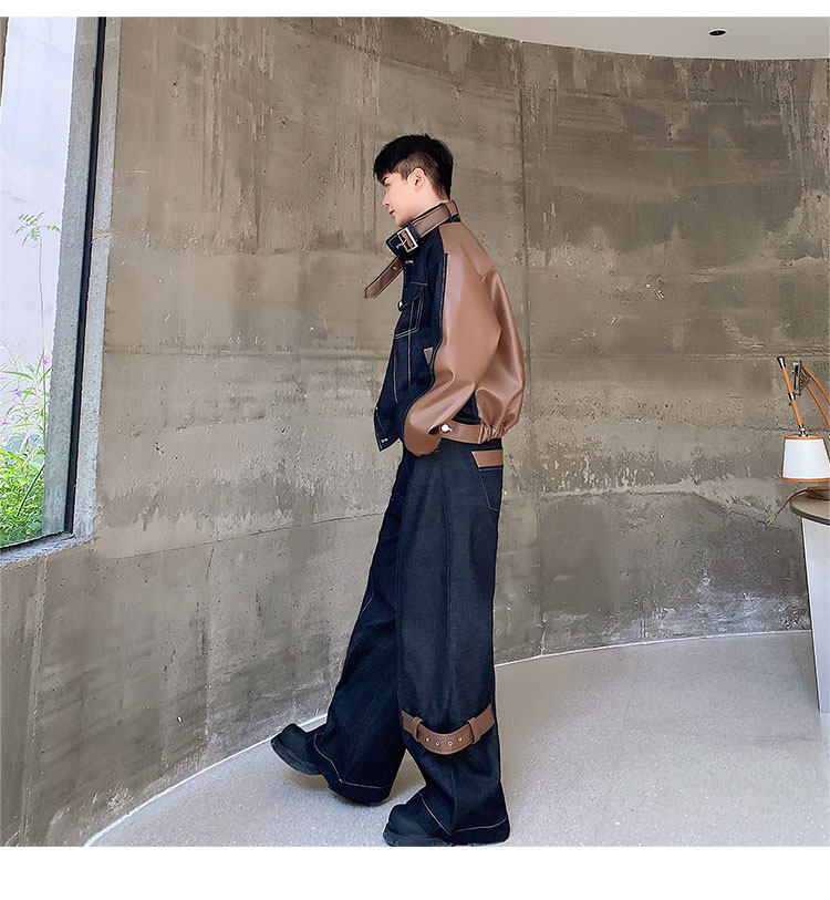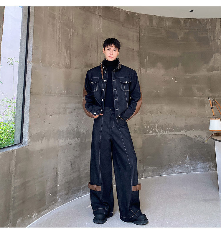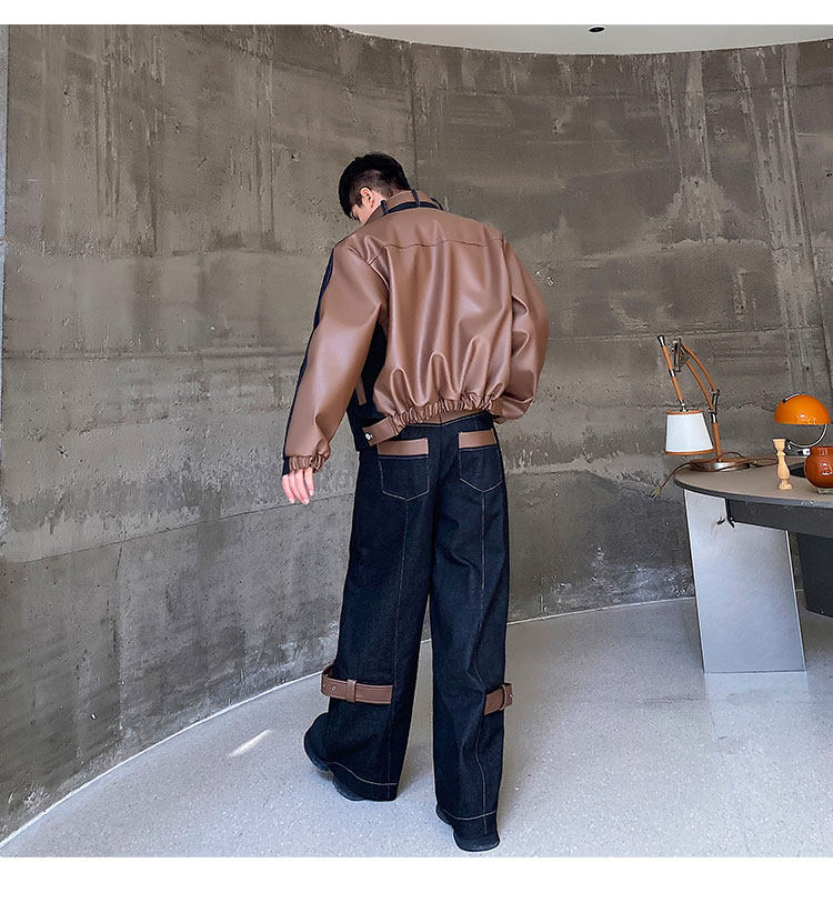 Autumn and Winter Thickened Denim Suit with Unique Pu Patchwork Stand-Up Collar Jacket and Wide-Leg Denim Pants Two-Piece Set, Niche Trendy Brand