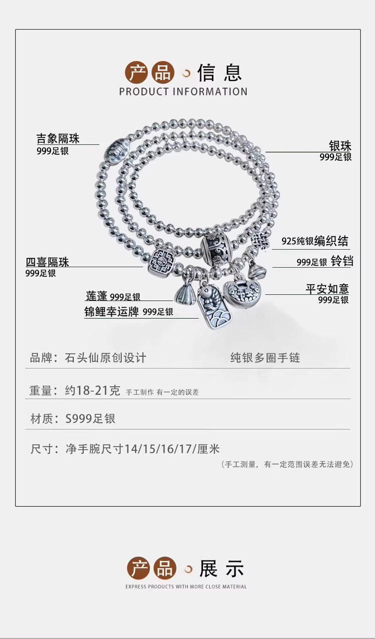 Stone Fairy Genuine 999 Pure Silver Multi-Layer Silver Bracelet for Women, Ruyi Niche Design, Ancient Style Bell Winding Silver Bracelet