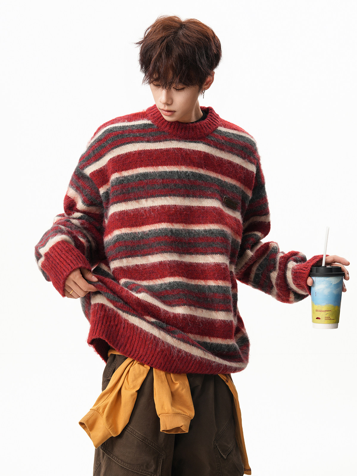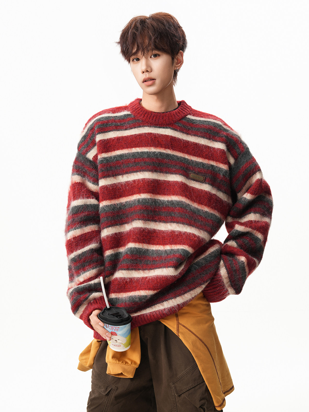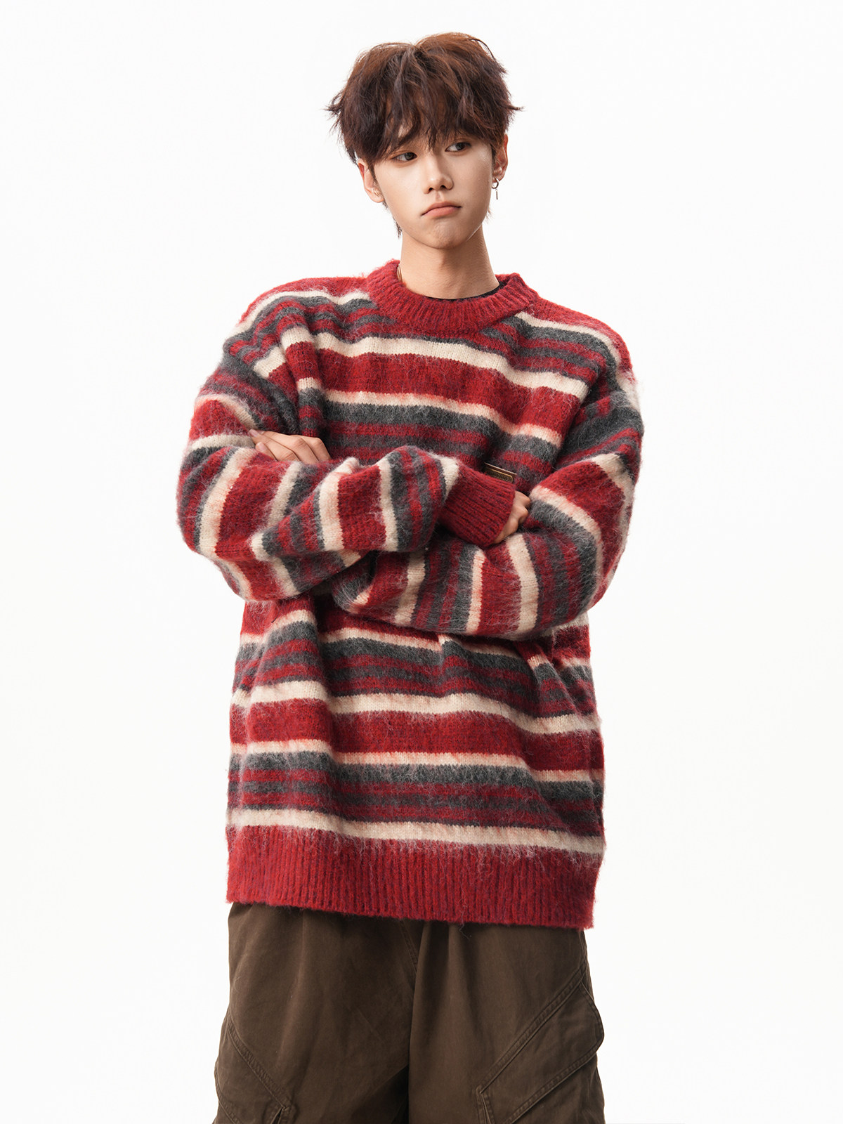 American-Style Mohair Striped Color-Blocked Crew Neck Sweater for Men and Women, Autumn and Winter Lazy Style Knitted Sweater, Christmas Red Coat
