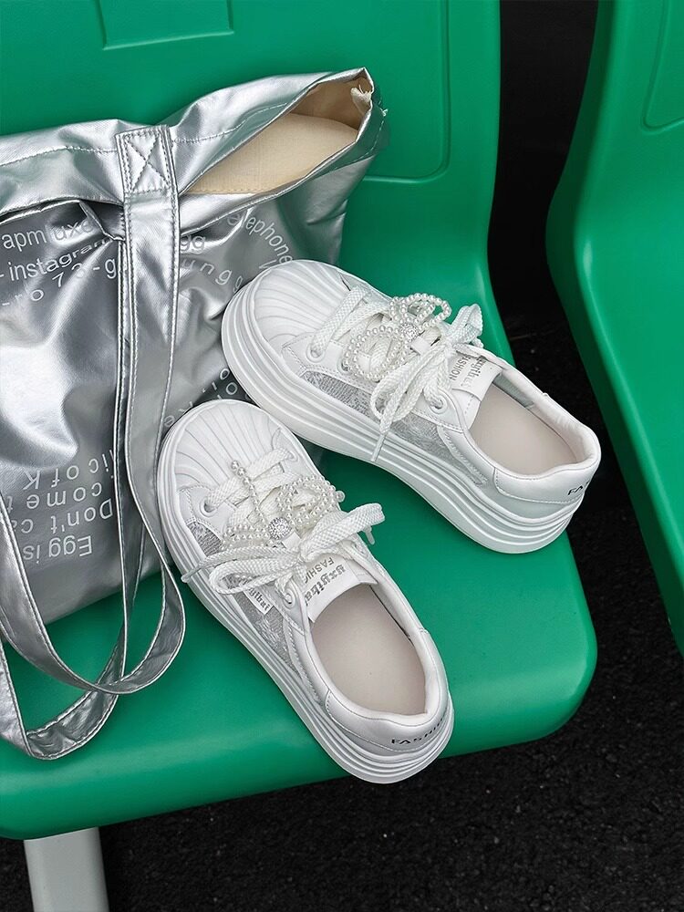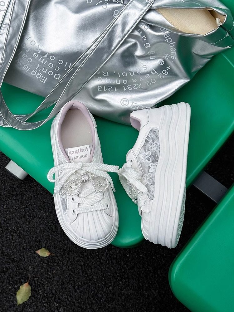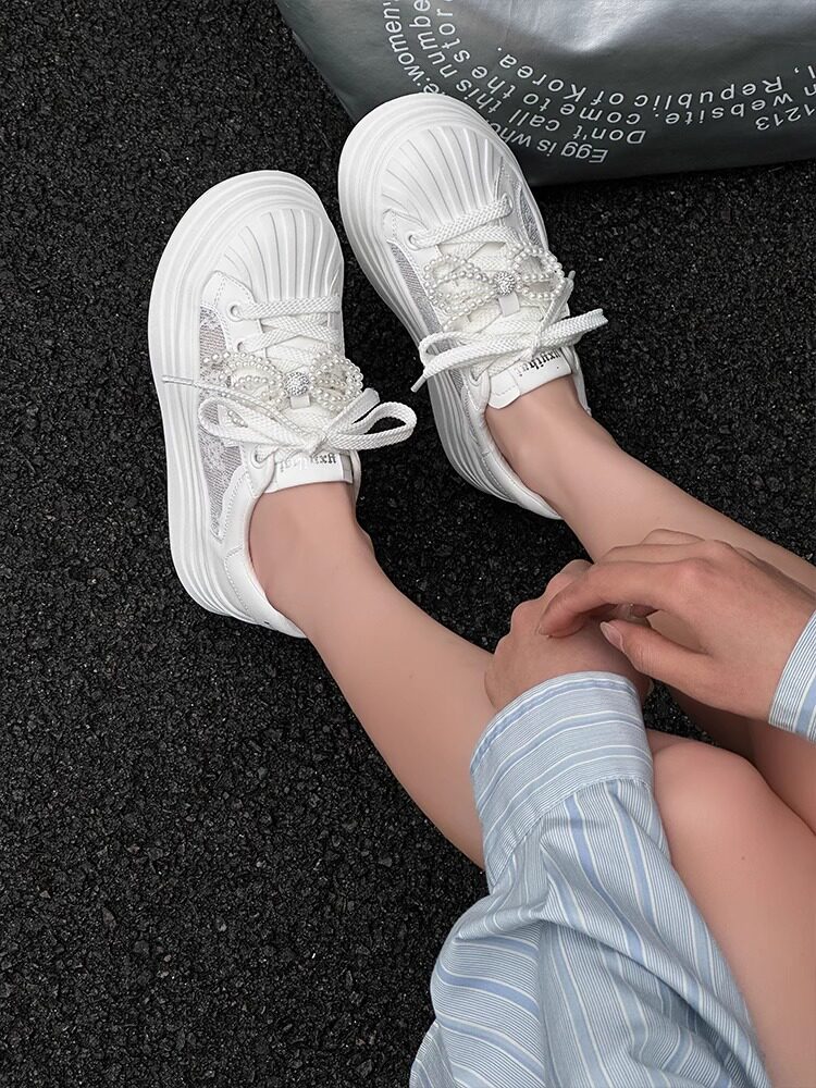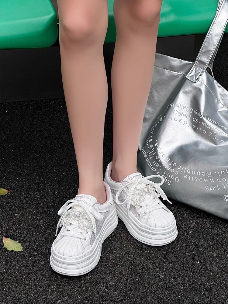 Hong Kong Niche Shell-Toe Mesh Breathable Sneakers for Women 2025 Summer New Versatile Casual Thick-Soled Height-Increasing White Shoes