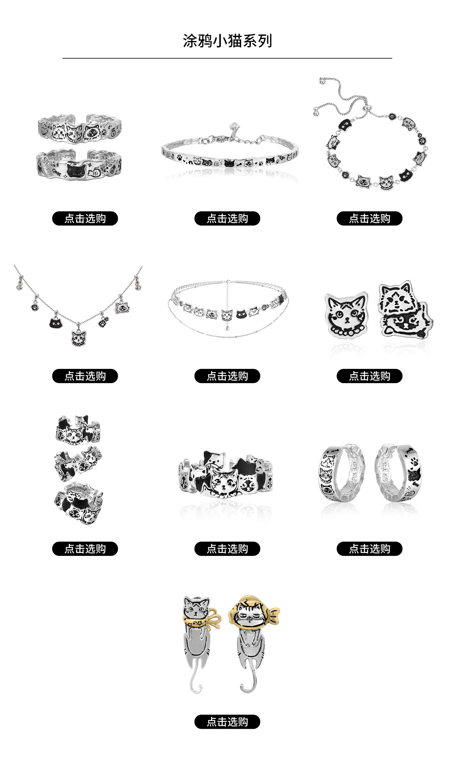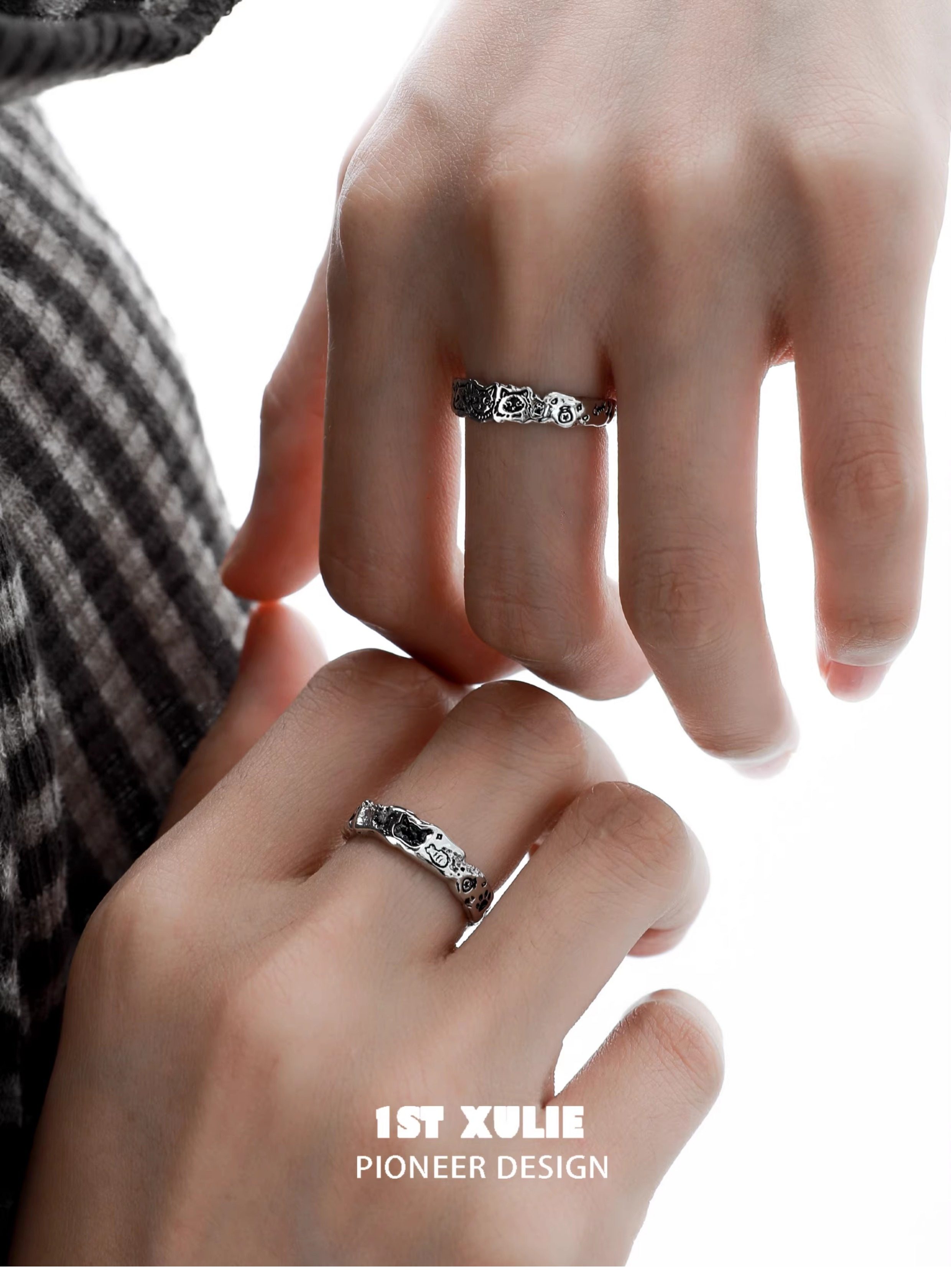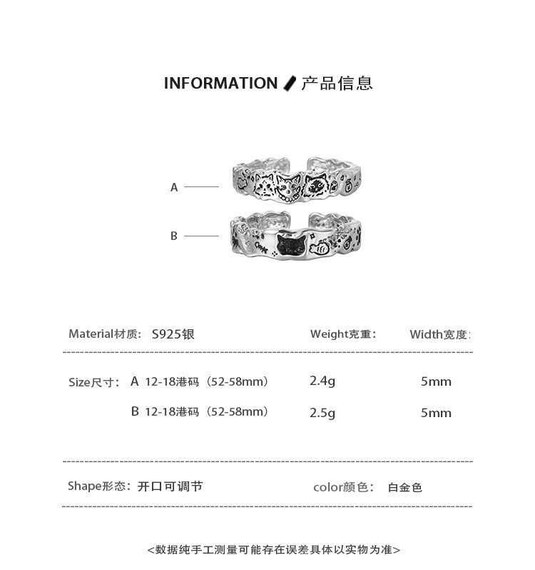 1Stxulie Graffiti Cat Couple Rings Sterling Silver Ring Original Niche Design High-End Open Ring Non-Fading