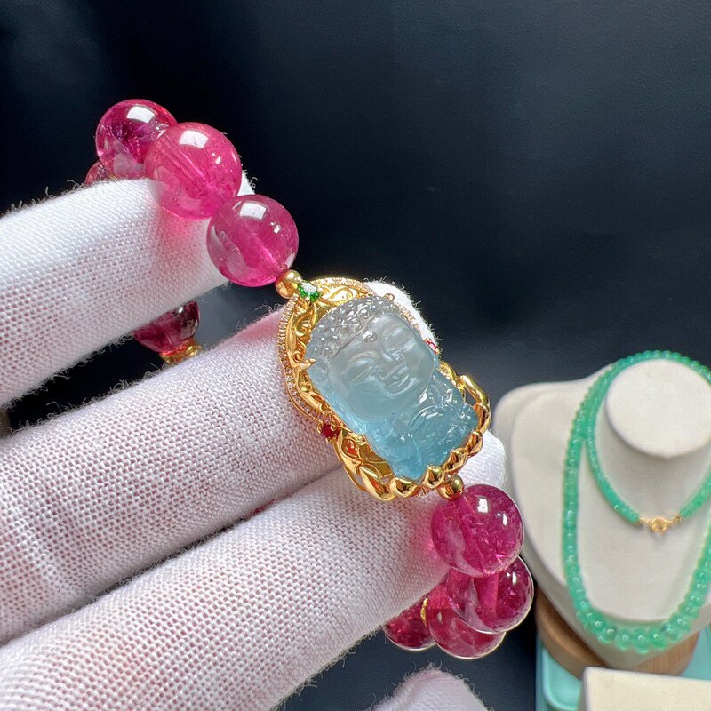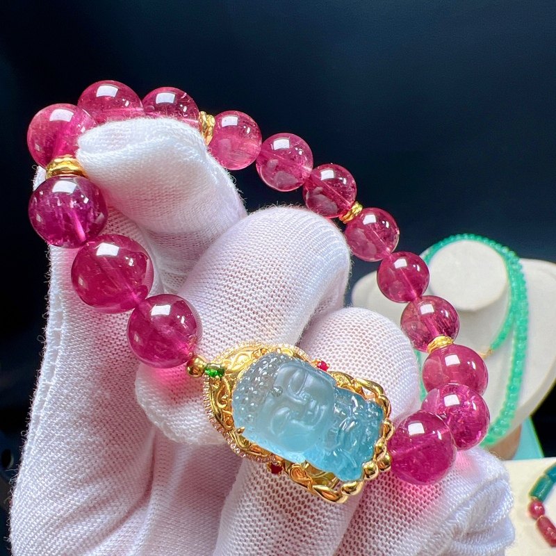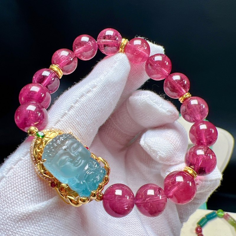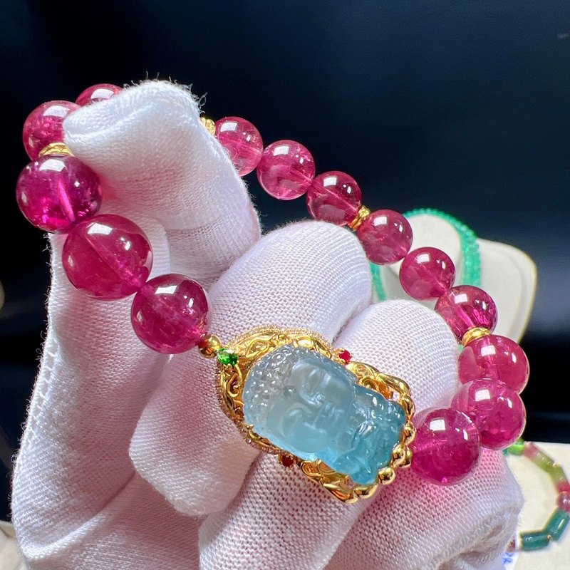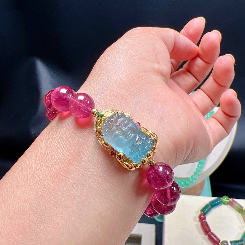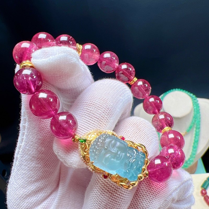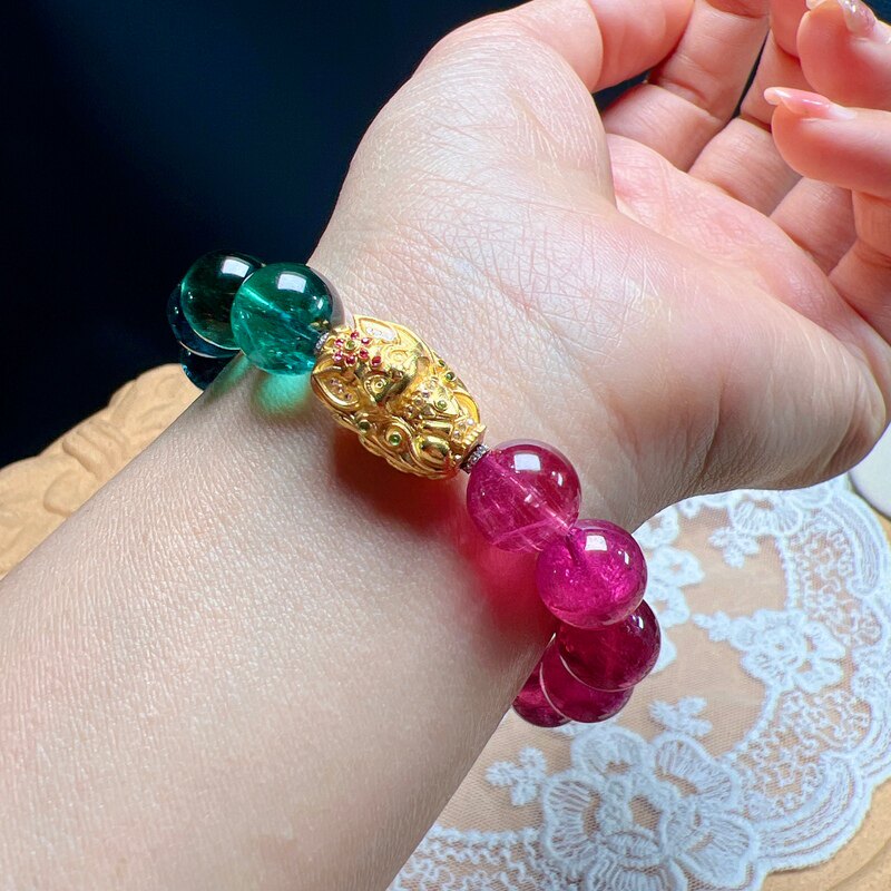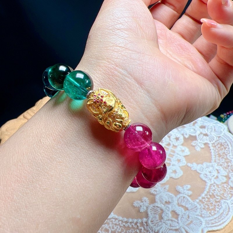 描述:半红半蓝,稀缺料,满满的珠宝感,天然红蓝碧玺手链,颗颗精选,浓郁配色,卢比来红,蓝碧,蓝绿,晶体通透润泽,水亮,18K金点坠,雕工精湛,佩戴显气质,精致美丽,高性价比