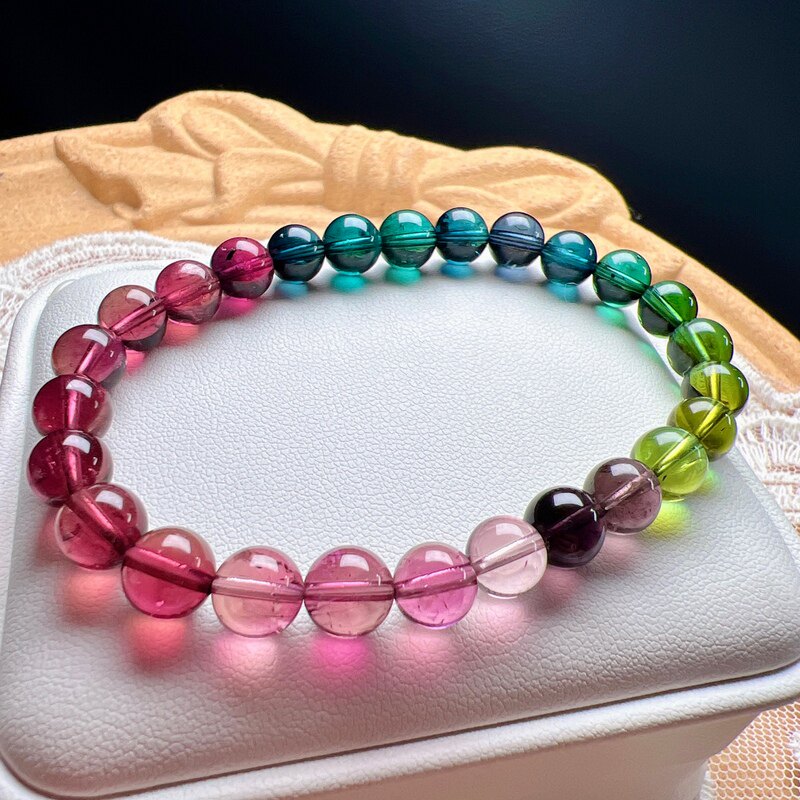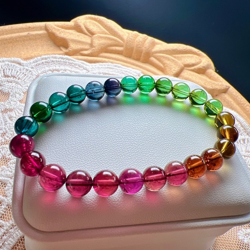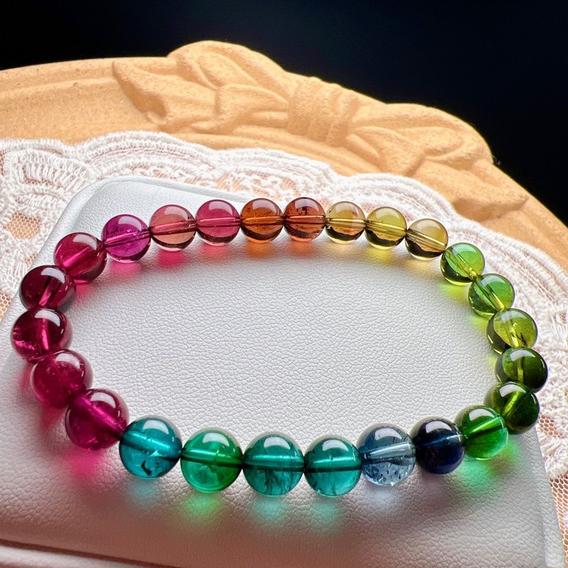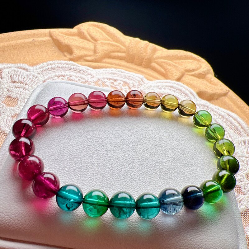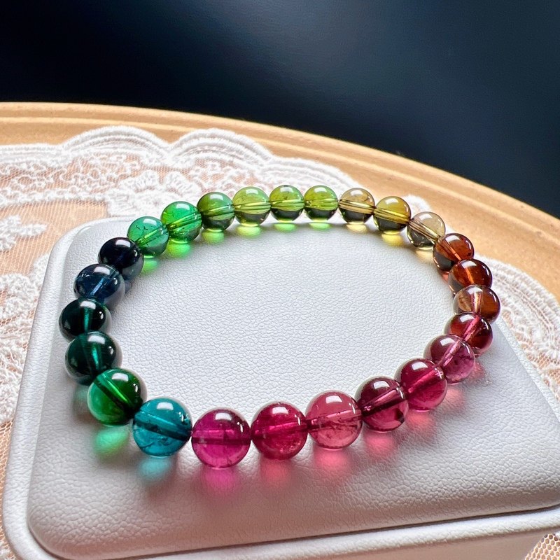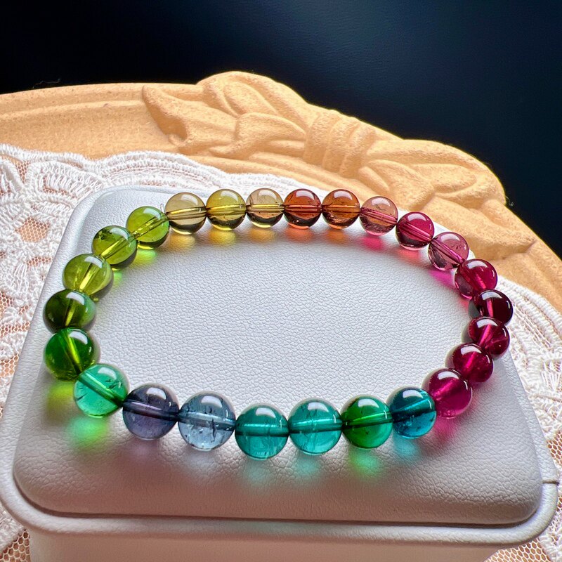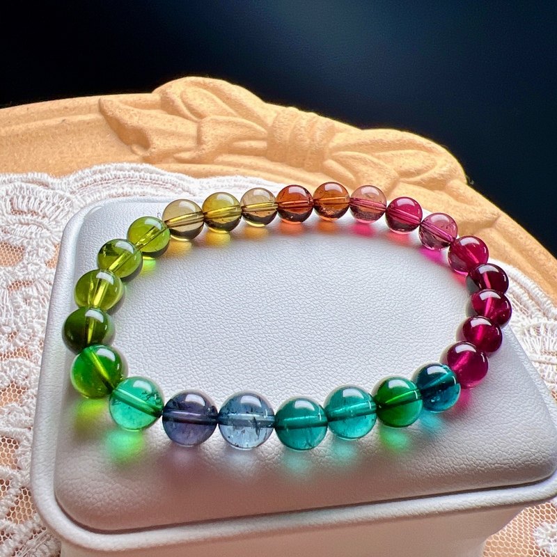 编号:HT01天然彩虹碧玺手链(图如下) 价:6280 尺寸:7.2mm 重:15.18g 描述:颜色浓郁色标料,天然彩虹碧玺手链,浓郁的美,美人品质,珠子水润透亮,鸽血红碧,靓丽卢比来红碧,蓝碧,绿碧都是珍贵色,颜色丰富,贵气十足,佩戴有韵味,重量:高性价比!仅一款,看缘分!