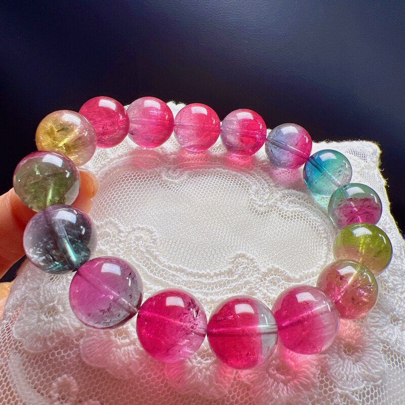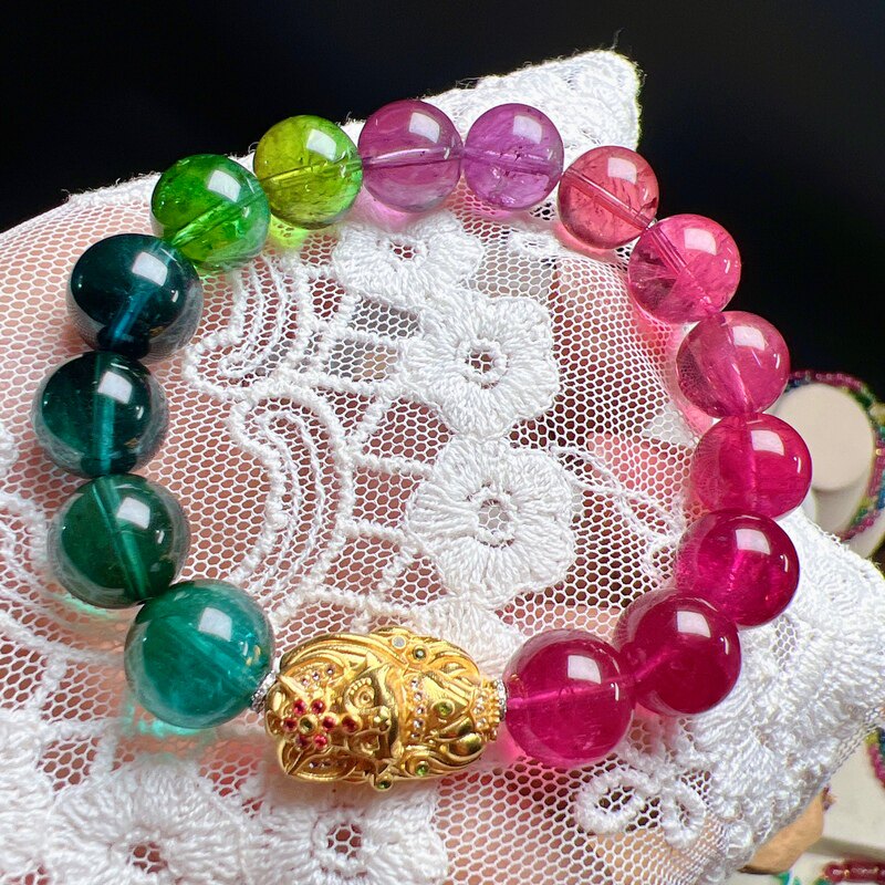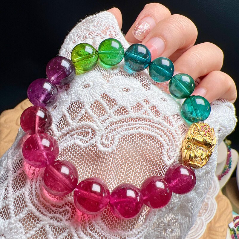 编号:CH-08天然彩虹碧玺手链(图如下) 价:5380 尺寸:9.5mm 重:28.8g 描述:仙女色,美丽人鱼色,冰淇凌甜美色,天然彩虹碧玺单圈手链,荧光满满,颜色美丽,蓝碧,绿碧,红碧,粉碧,紫碧玺,珠子油亮亮,颗颗精选饱满靓丽珠子,晶体通透,高性价比!