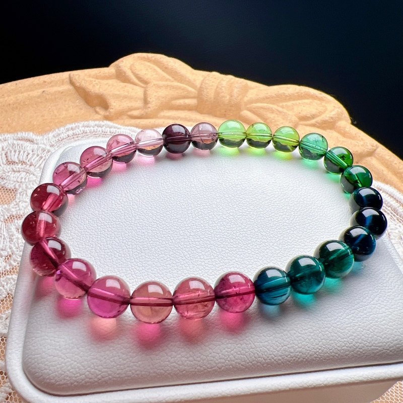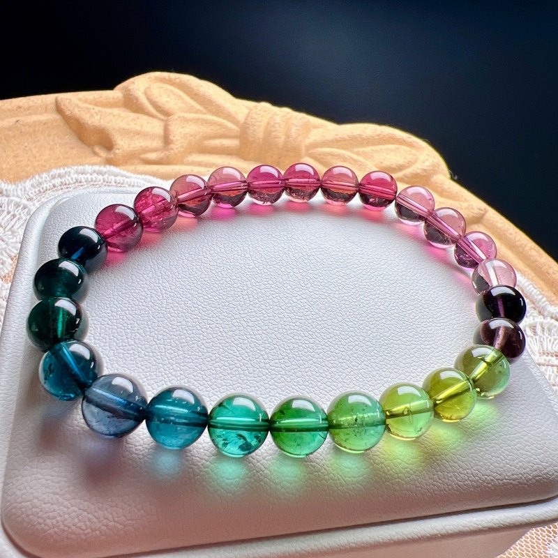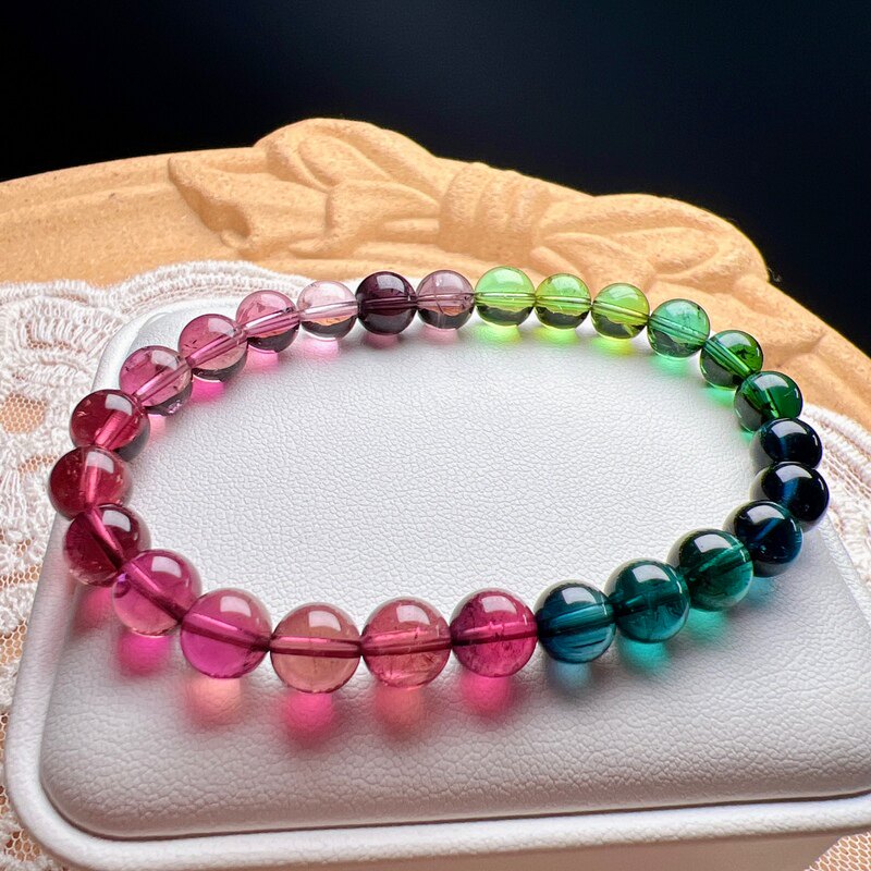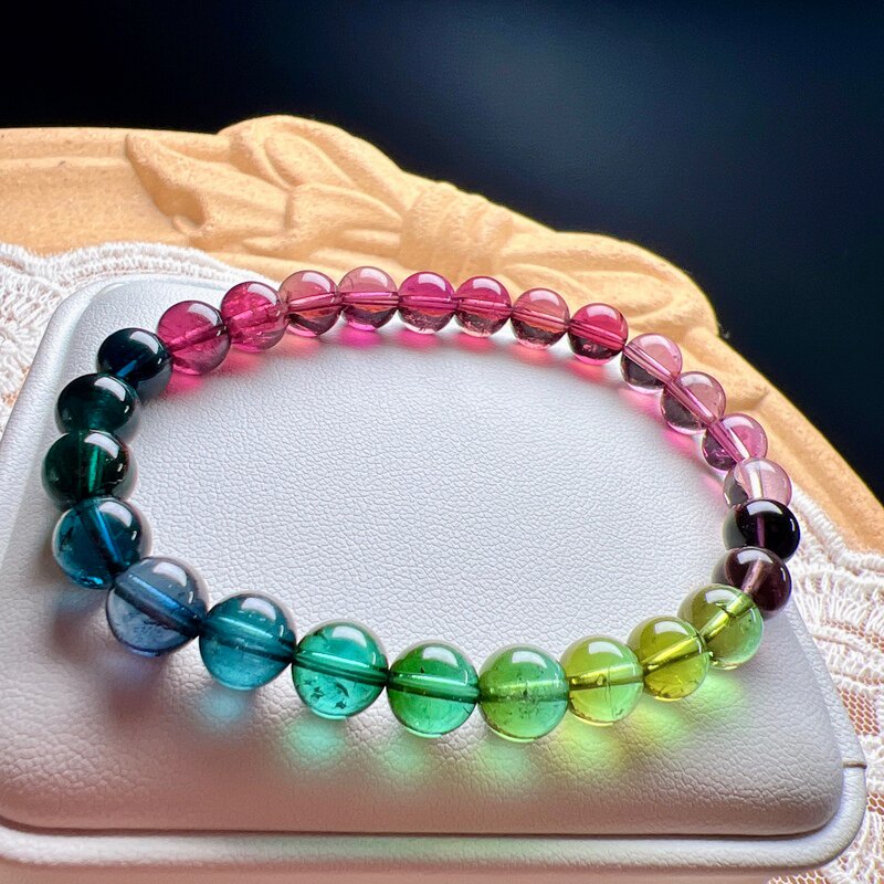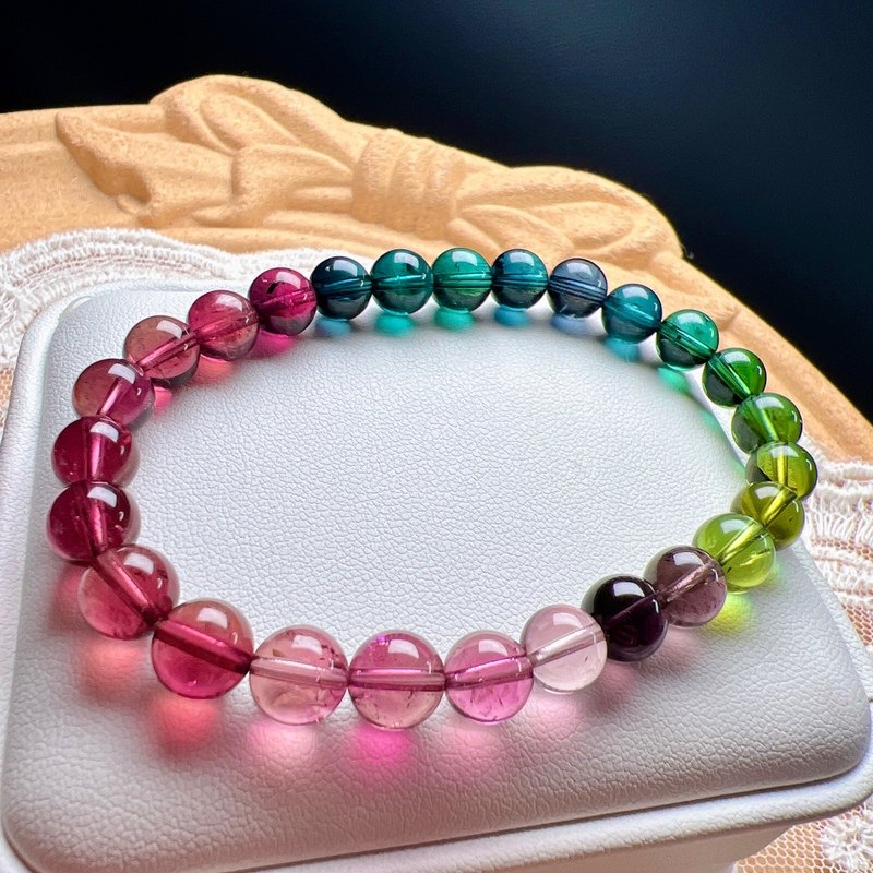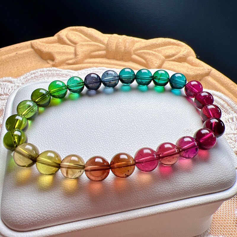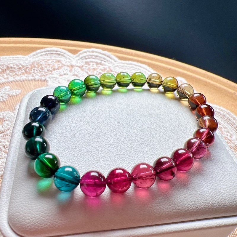 编号:HT02天然彩虹碧玺手链(图如下) 价:5280 尺寸:7.2mm 重:14.48g 描述:颜色浓郁色标料,天然彩虹碧玺手链,浓郁的美,美人品质,珠子水润透亮, 鸽血红碧,靓丽卢比来红碧,蓝碧,绿碧都是珍贵色,颜色丰富,贵气十足,佩戴有韵味,重量:高性价比!仅一款,看缘分!