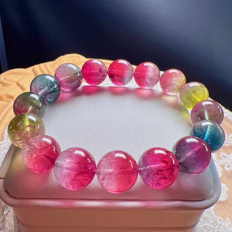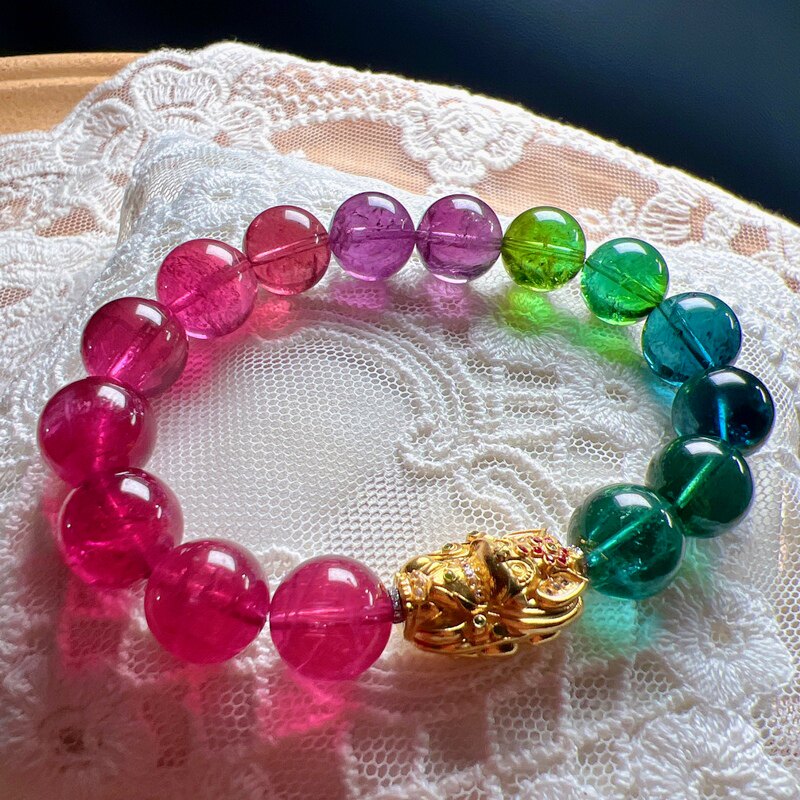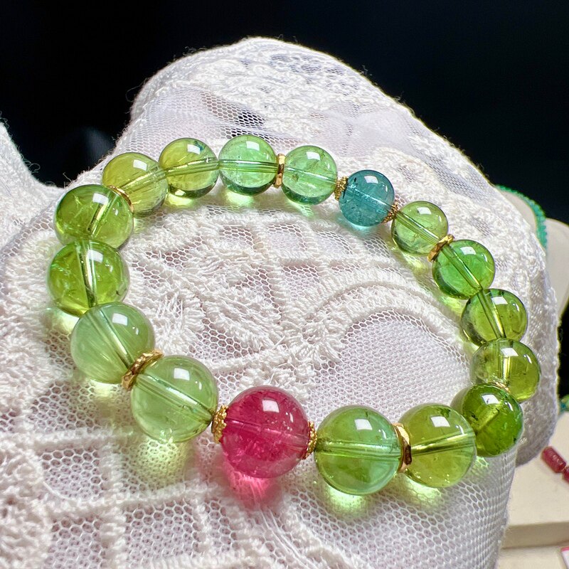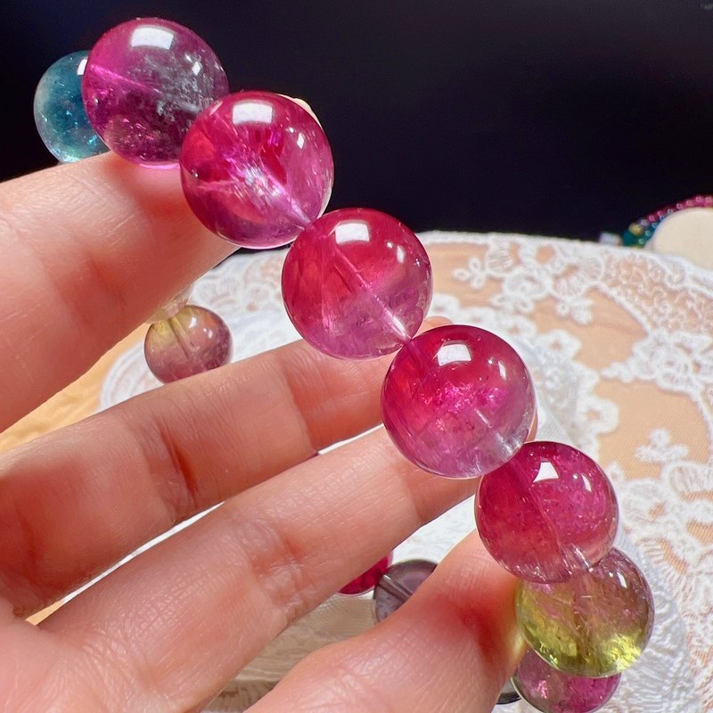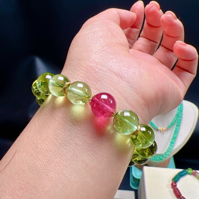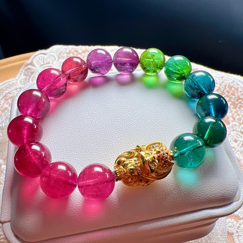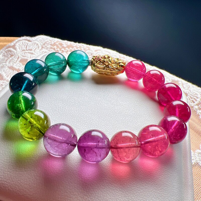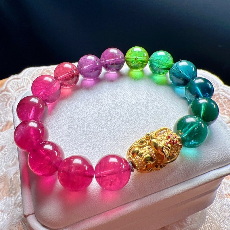 编号:CH-06天然彩虹碧玺手链(图如下) 价:4580 尺寸:9.2mm 重:25.62g 描述:甜美,高性价比,玻璃体,天然彩虹碧玺手链,珠子水润透亮,帕拉伊巴蓝碧,卢比来红碧,靓丽绿碧,橙碧,粉碧,都是珍贵色,颜色丰富,贵气十足,佩戴有韵味,仅一款,看缘分!