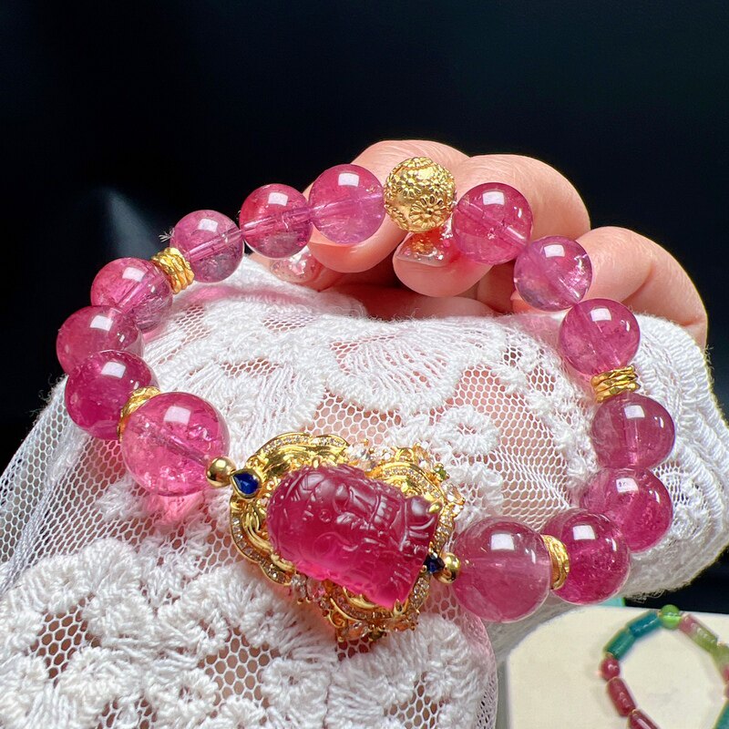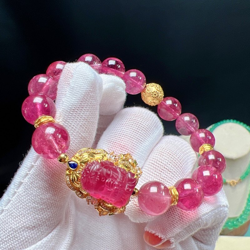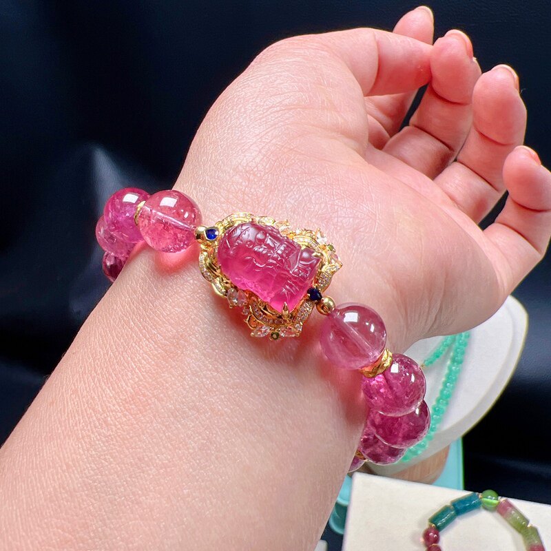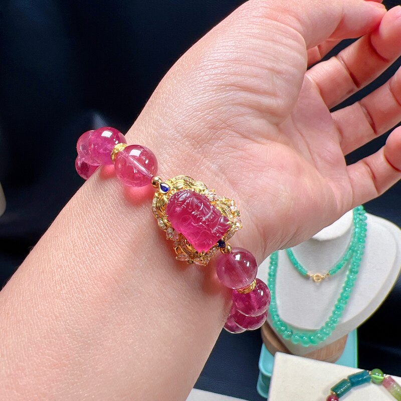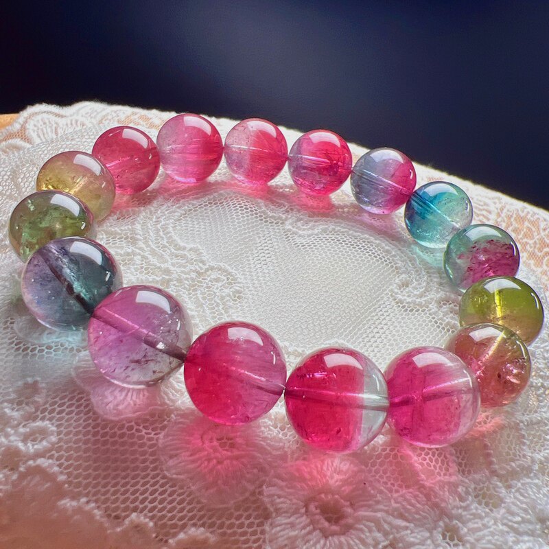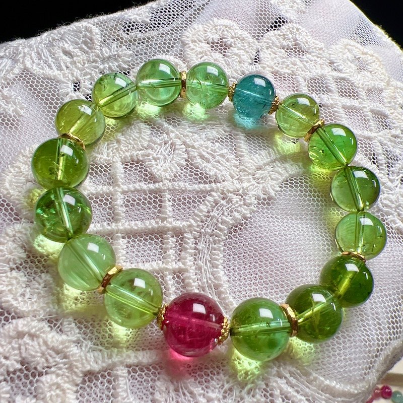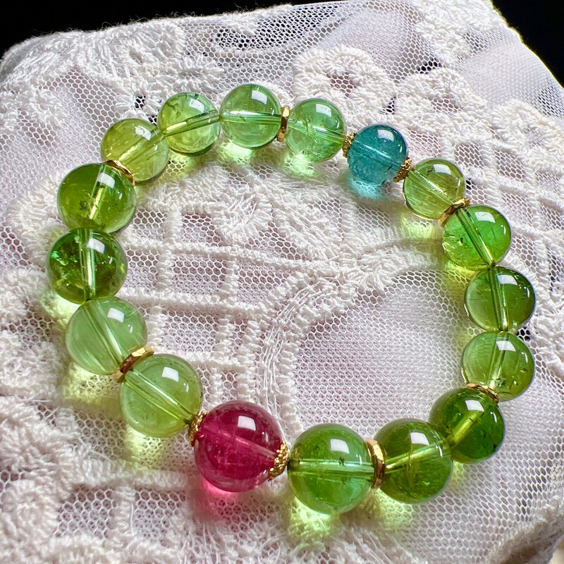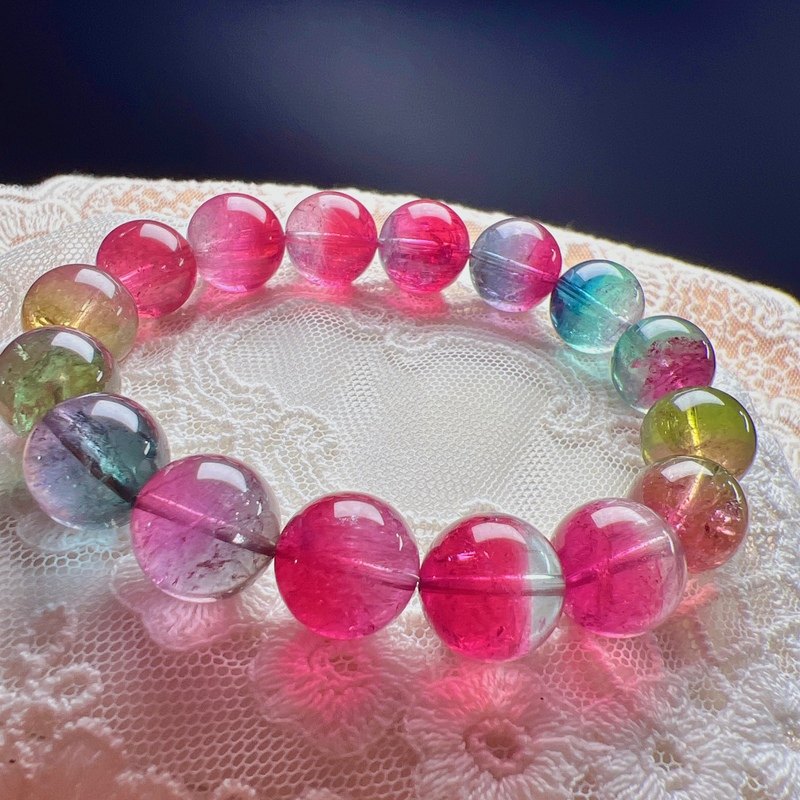 编号:CH-06天然彩虹碧玺手链(图如下) 价:4580 尺寸:9.2mm 重:25.62g 描述:甜美,高性价比,玻璃体,天然彩虹碧玺手链,珠子水润透亮,帕拉伊巴蓝碧,卢比来红碧,靓丽绿碧,橙碧,粉碧,都是珍贵色,颜色丰富,贵气十足,佩戴有韵味,仅一款,看缘分!