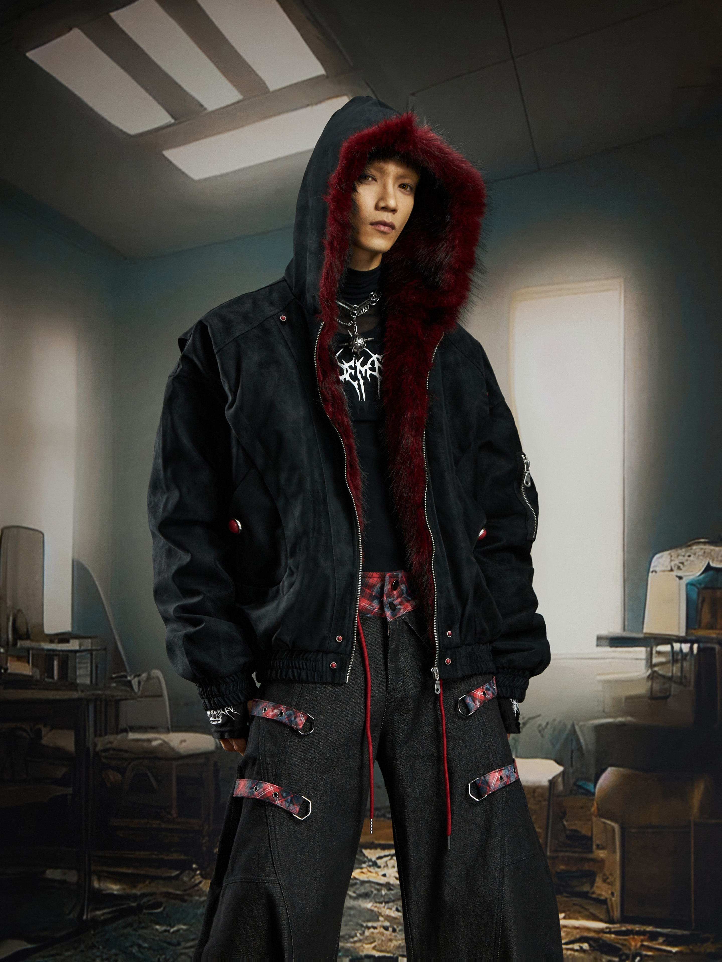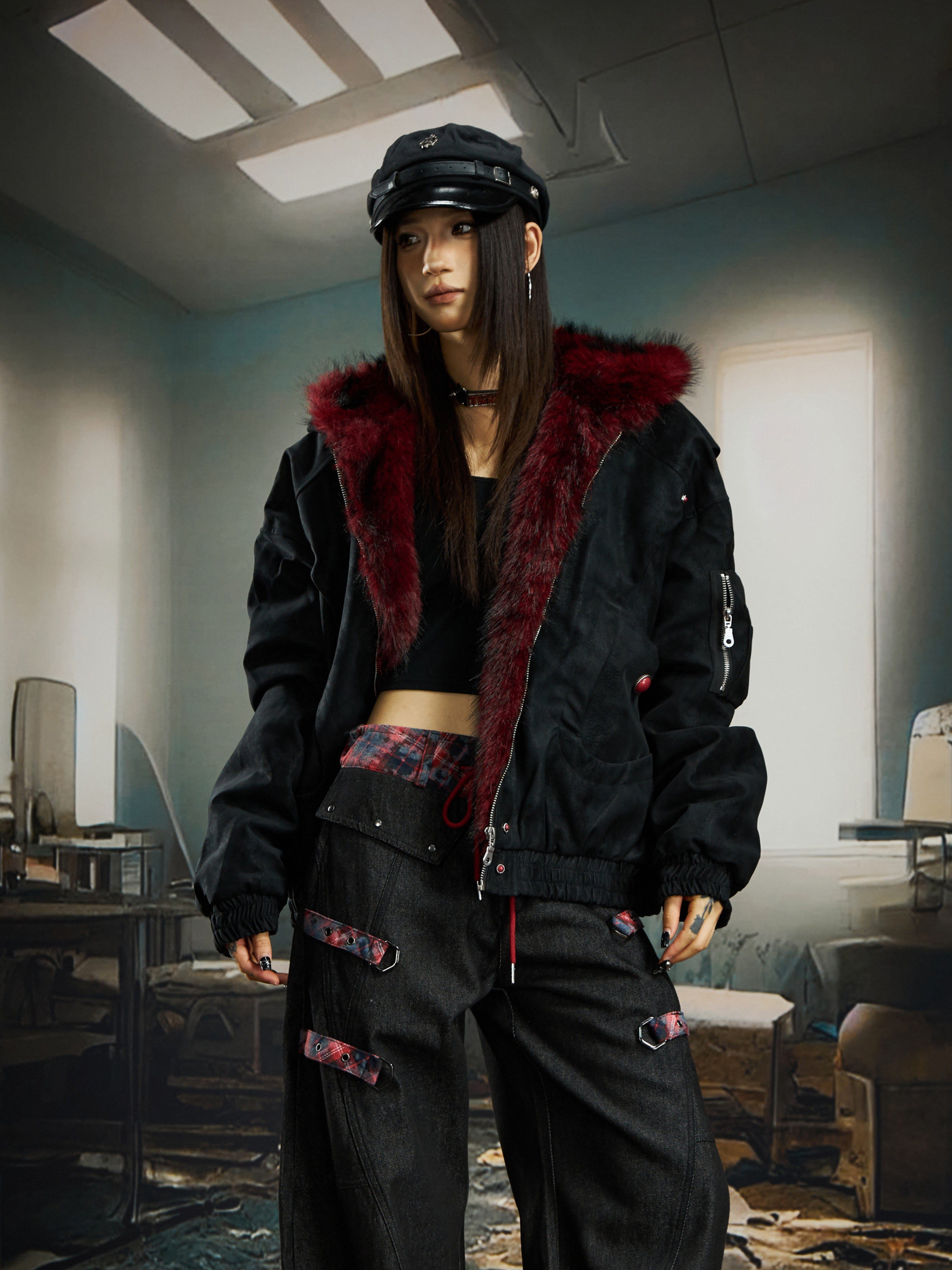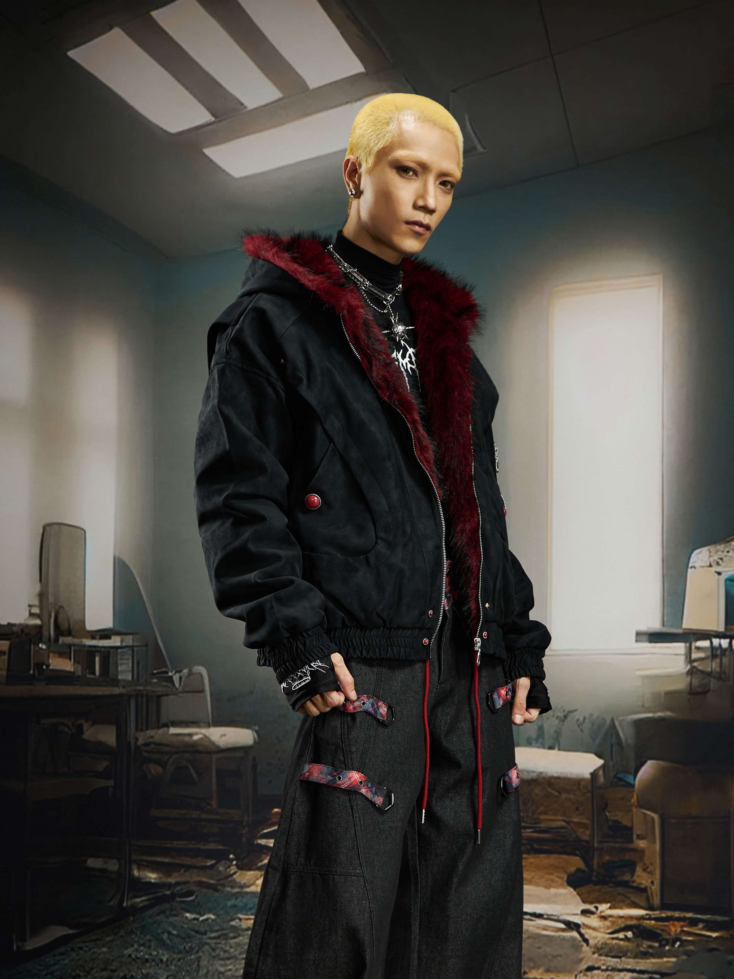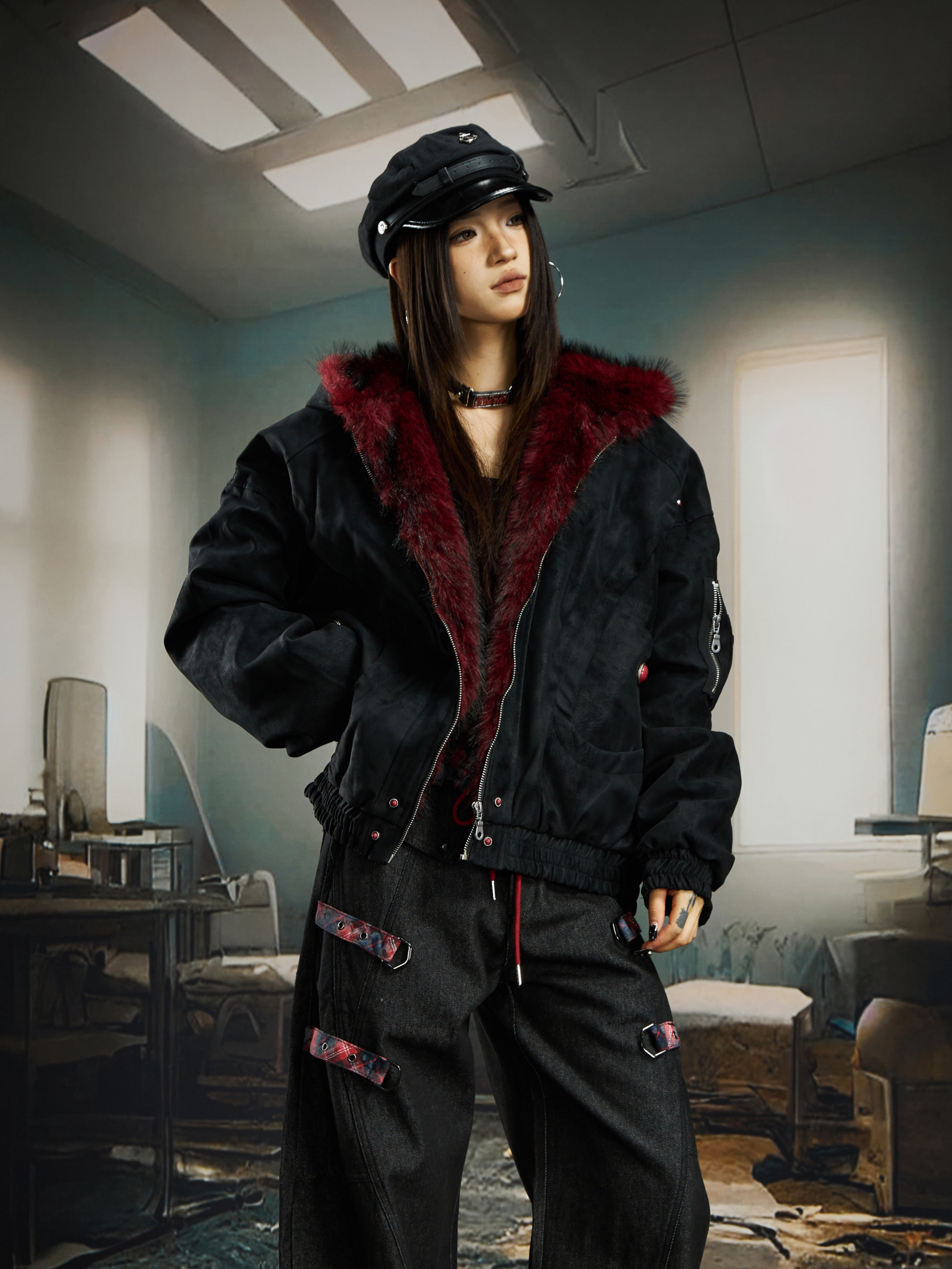 No Man's Land Original Red Mountain Eagle Texture Pu Dark Short Loose Furry Thickened Cotton Jacket