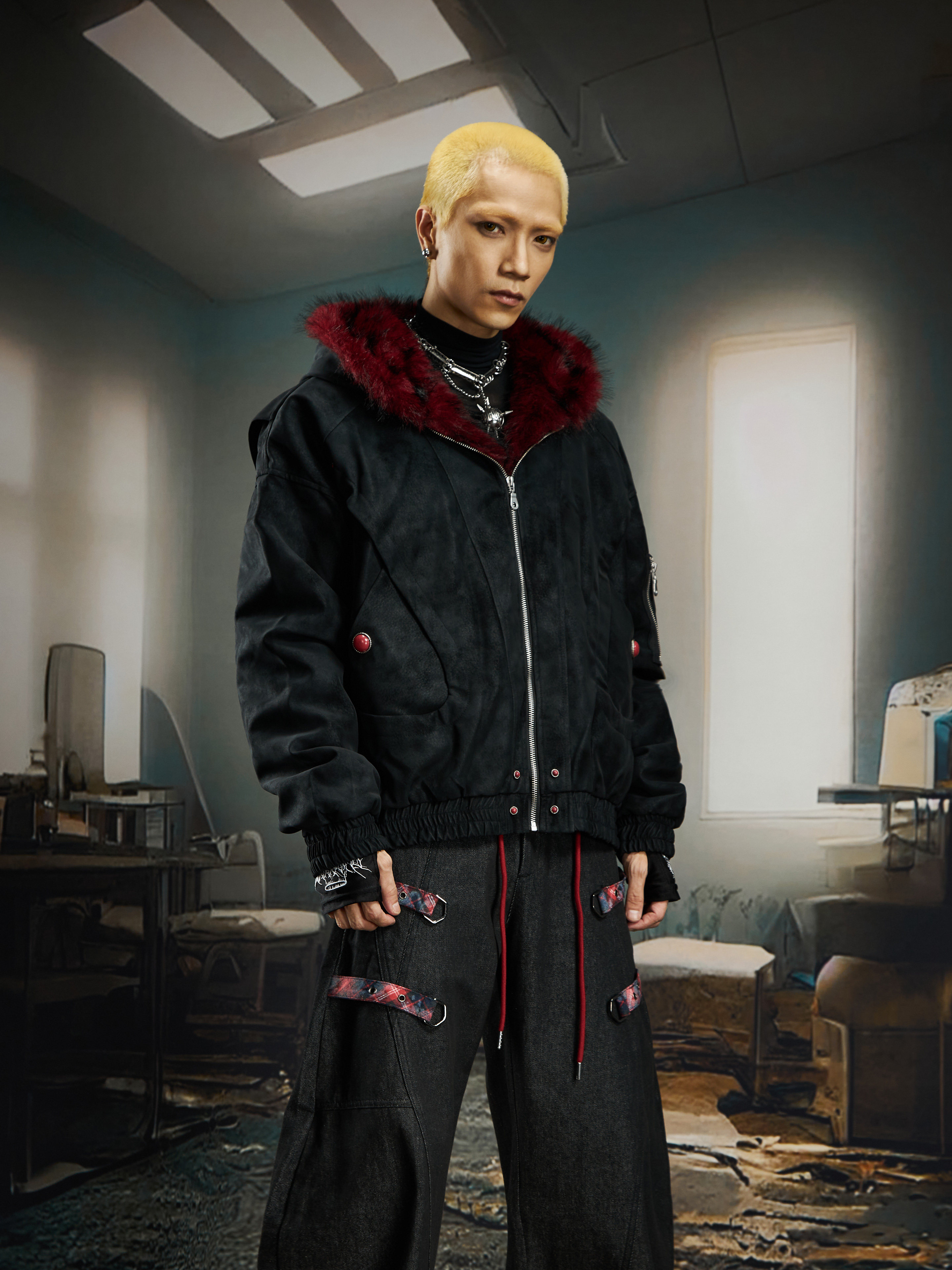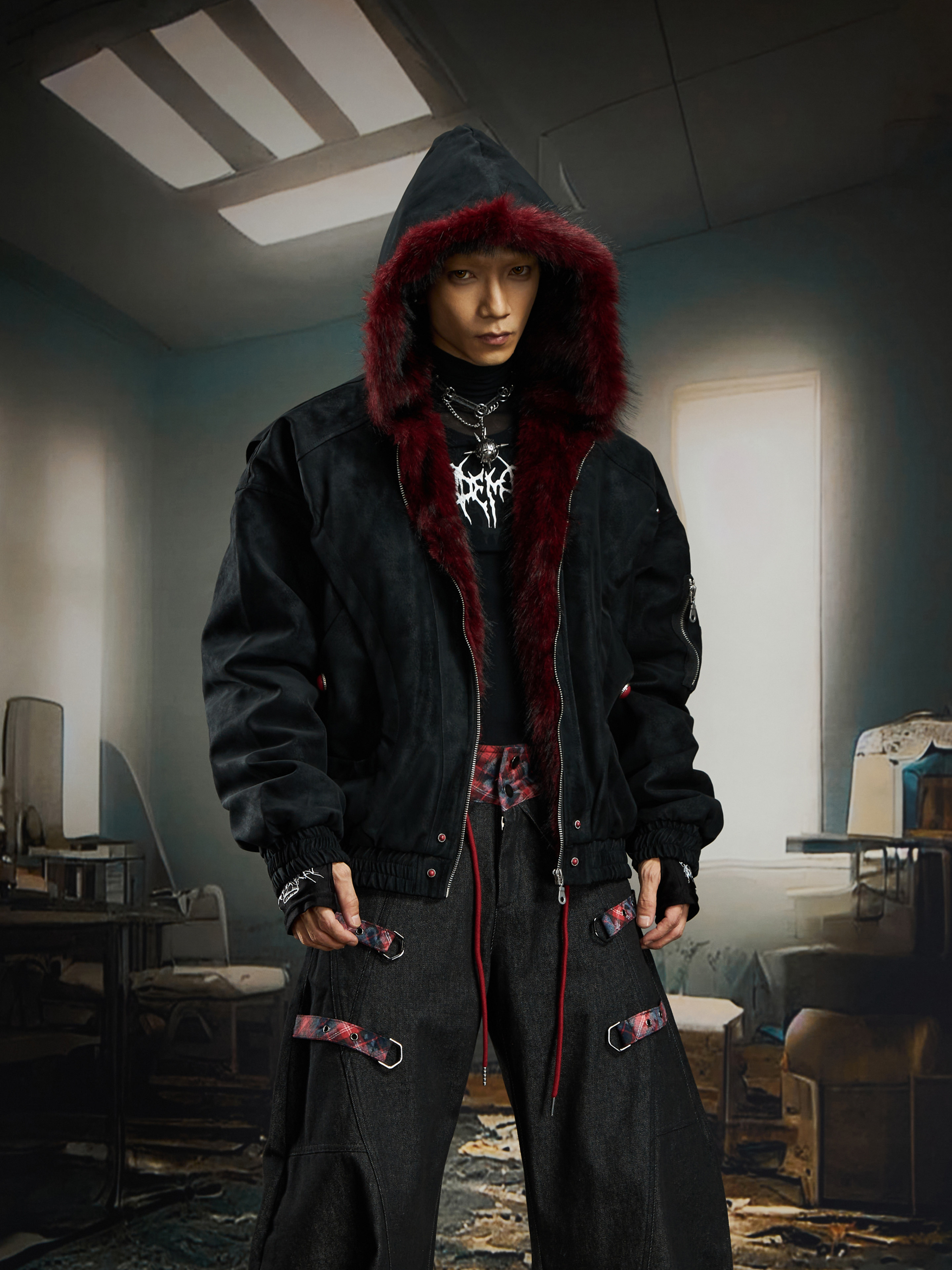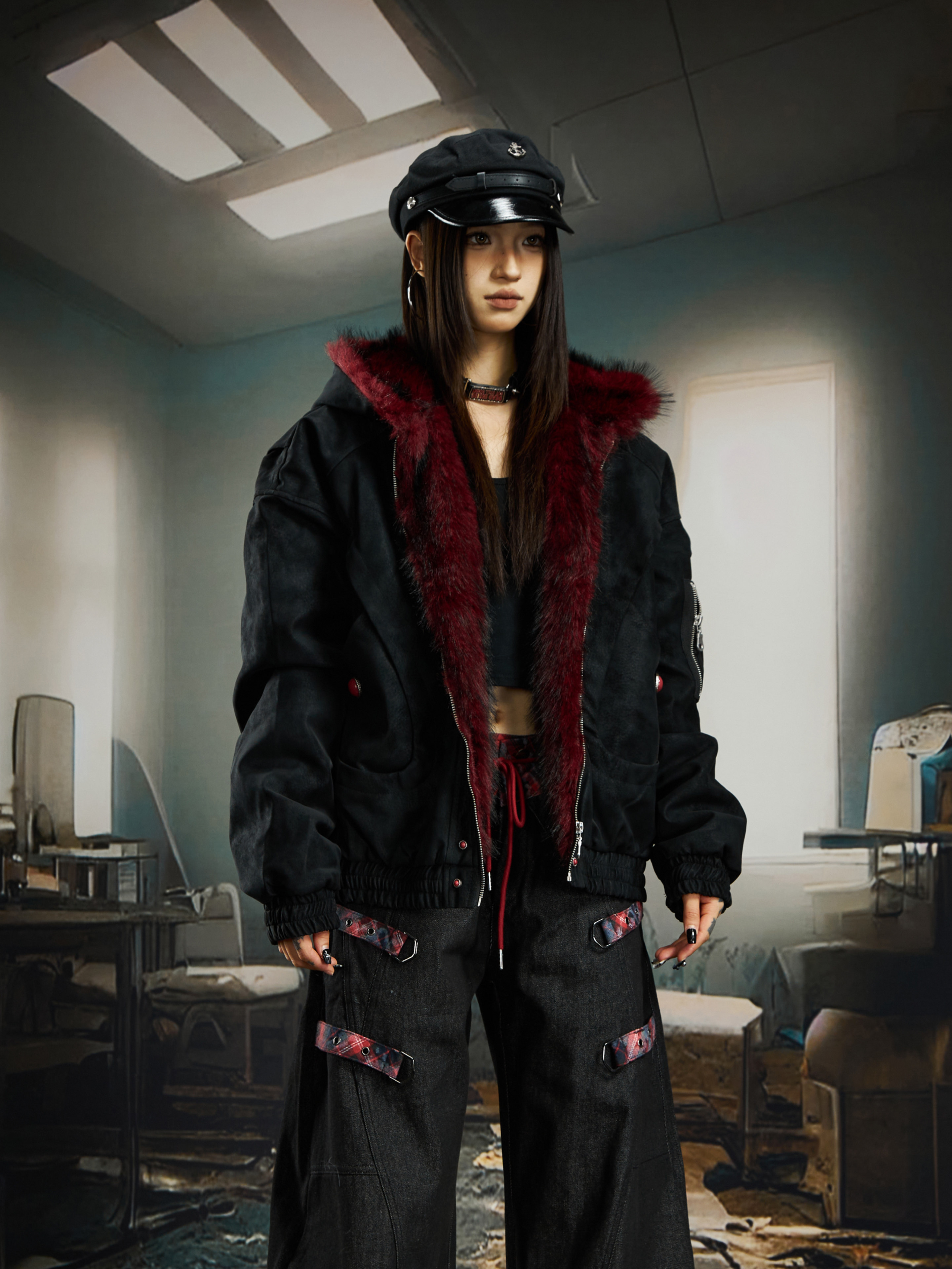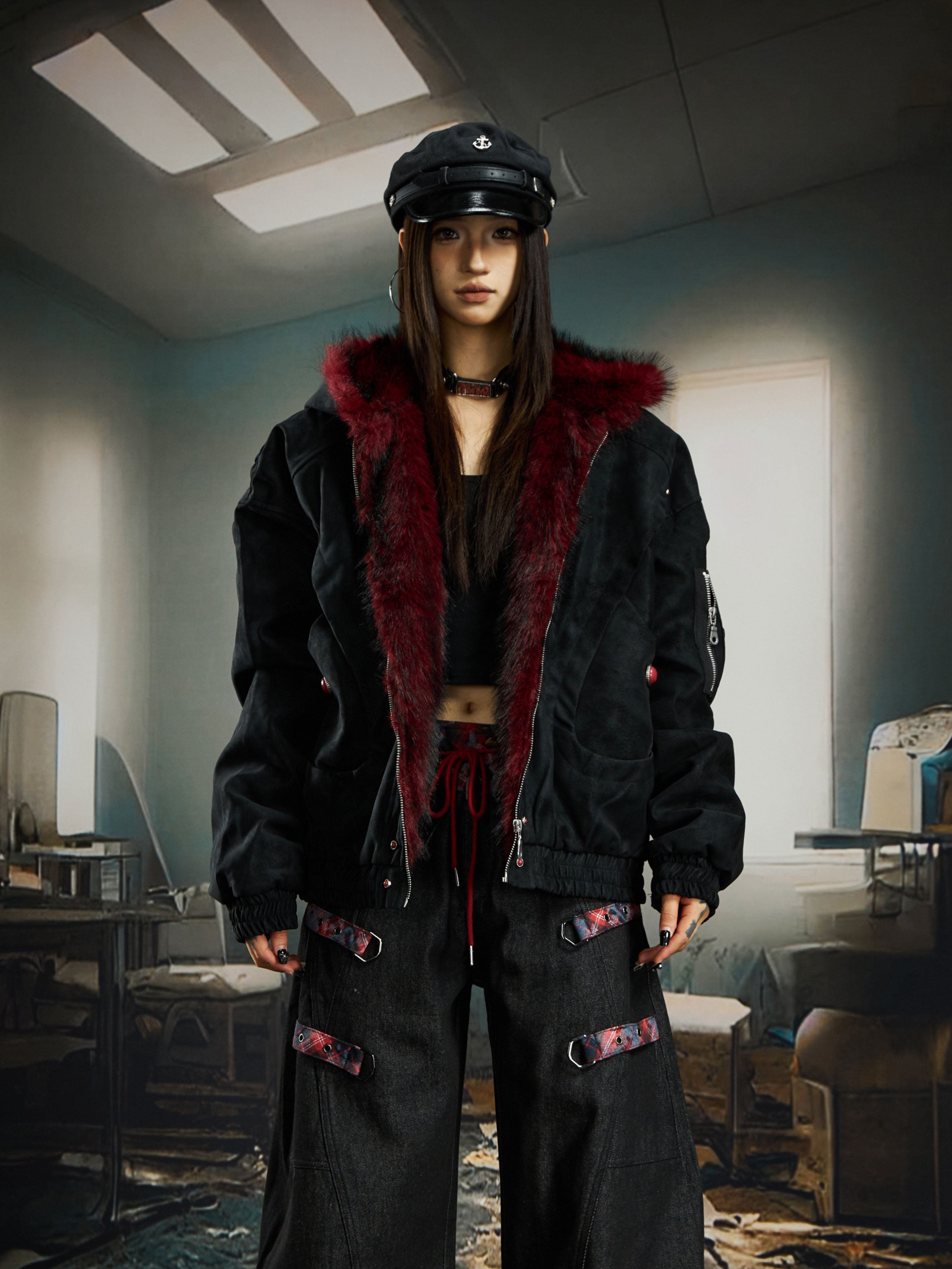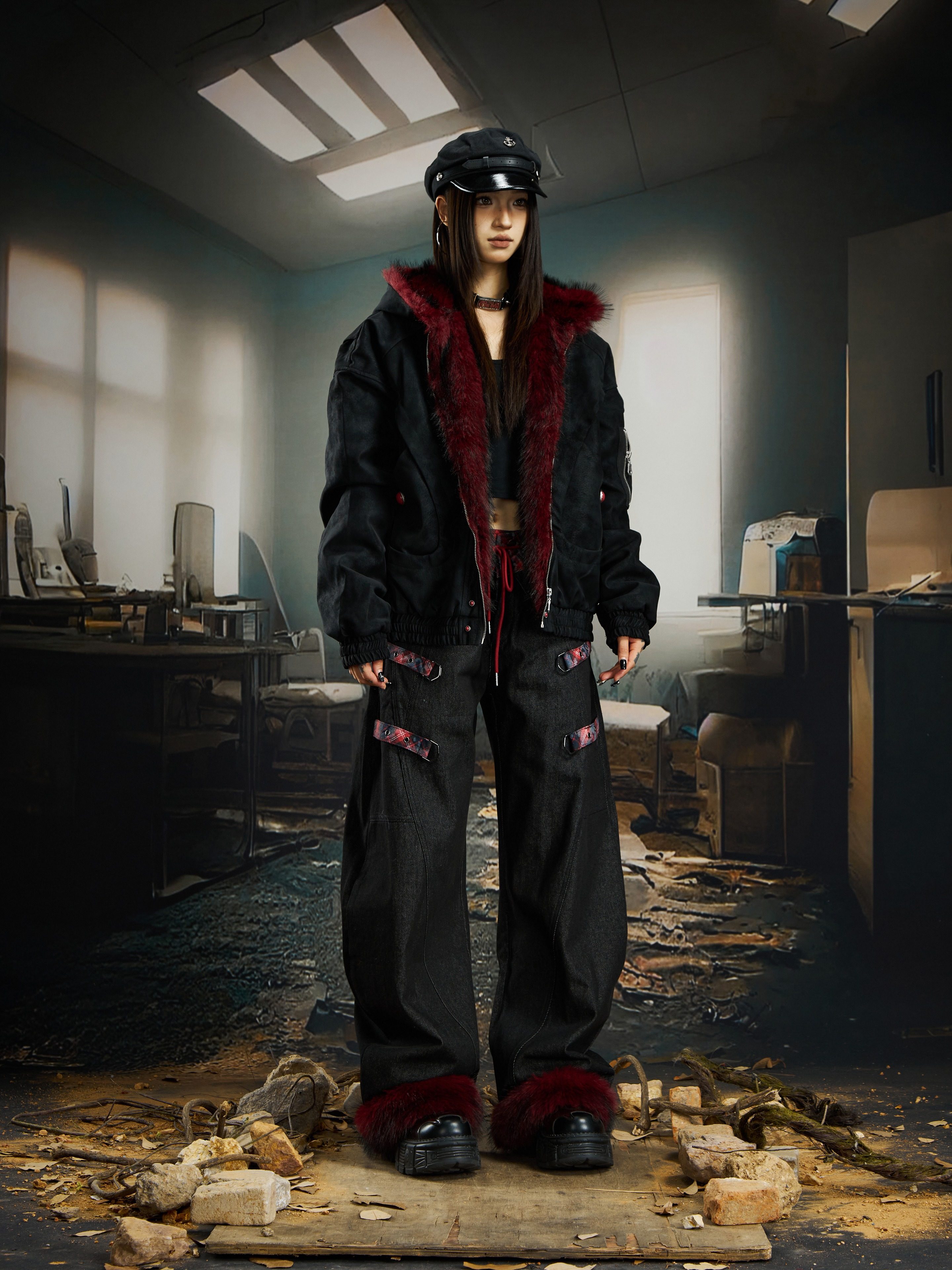 No Man's Land Original Red Mountain Eagle Texture Pu Dark Short Loose Furry Thickened Cotton Jacket
