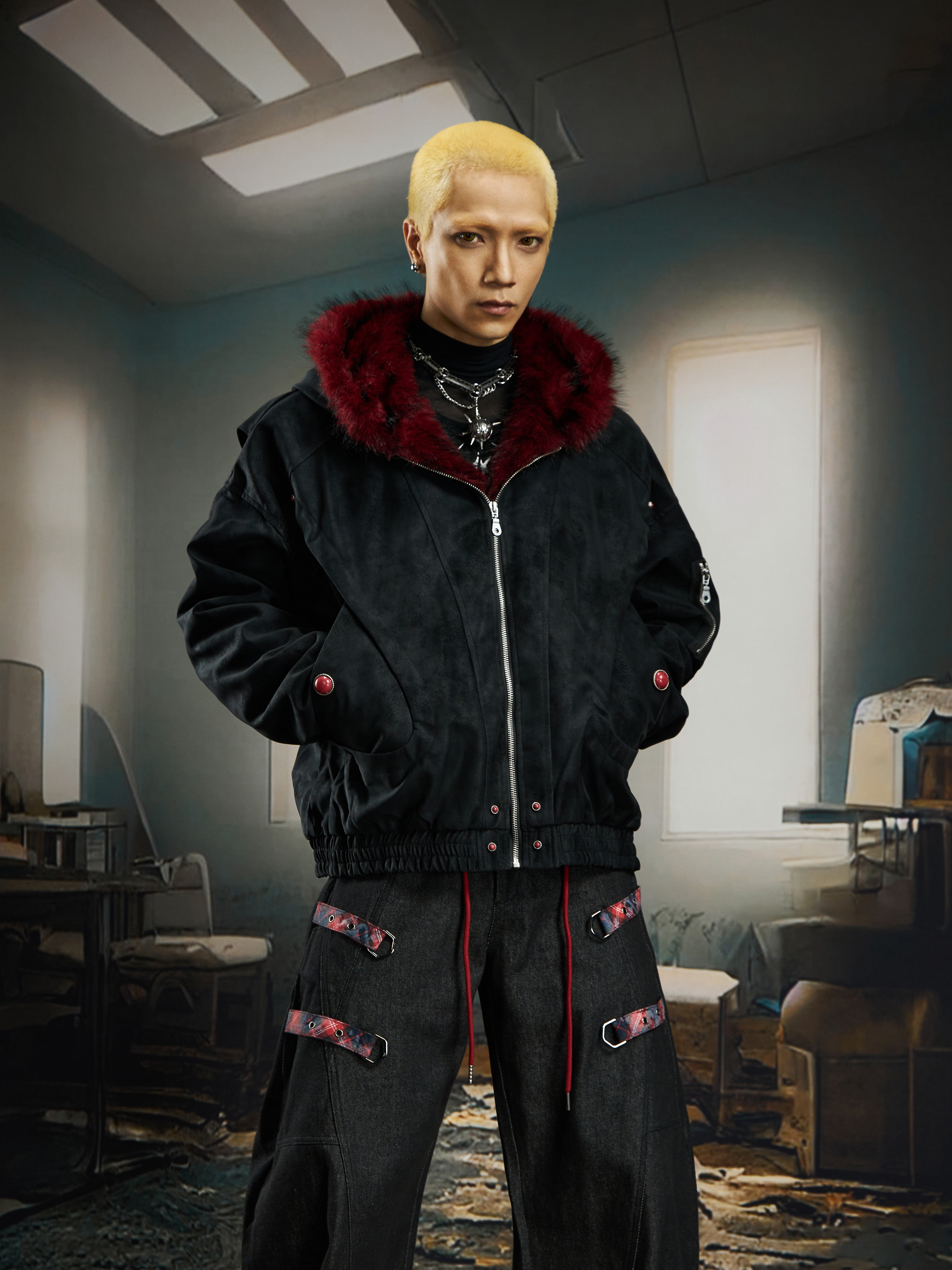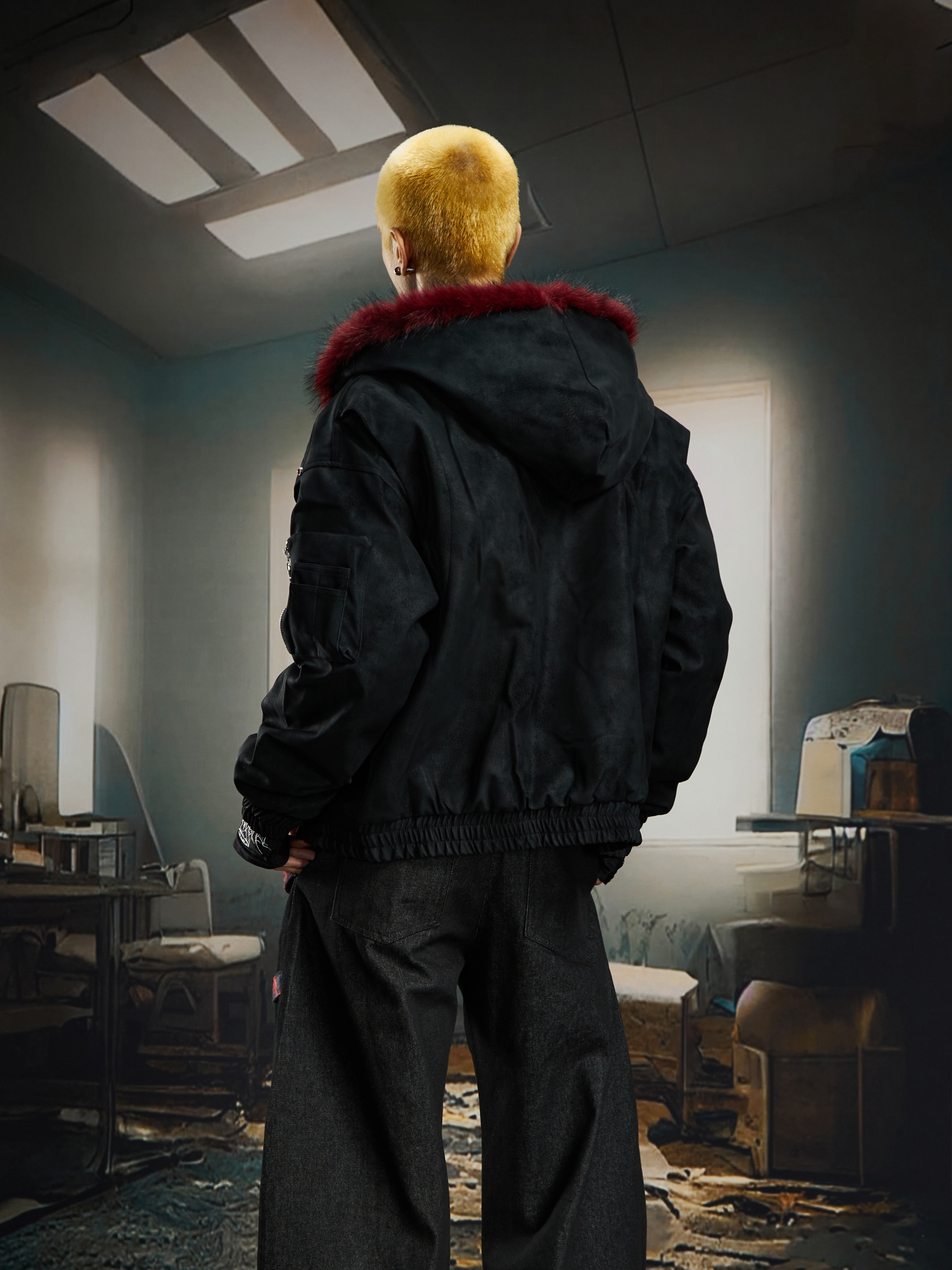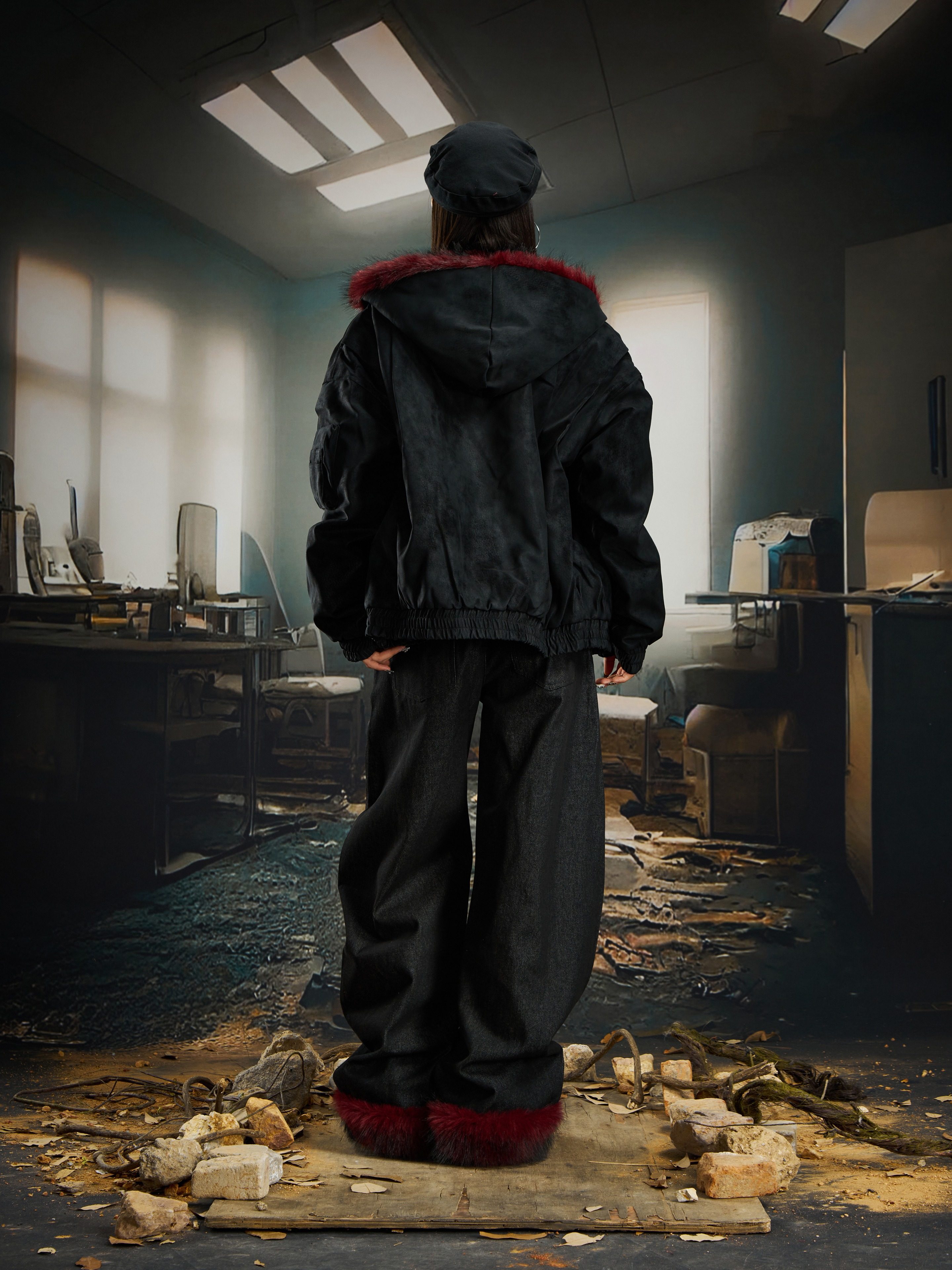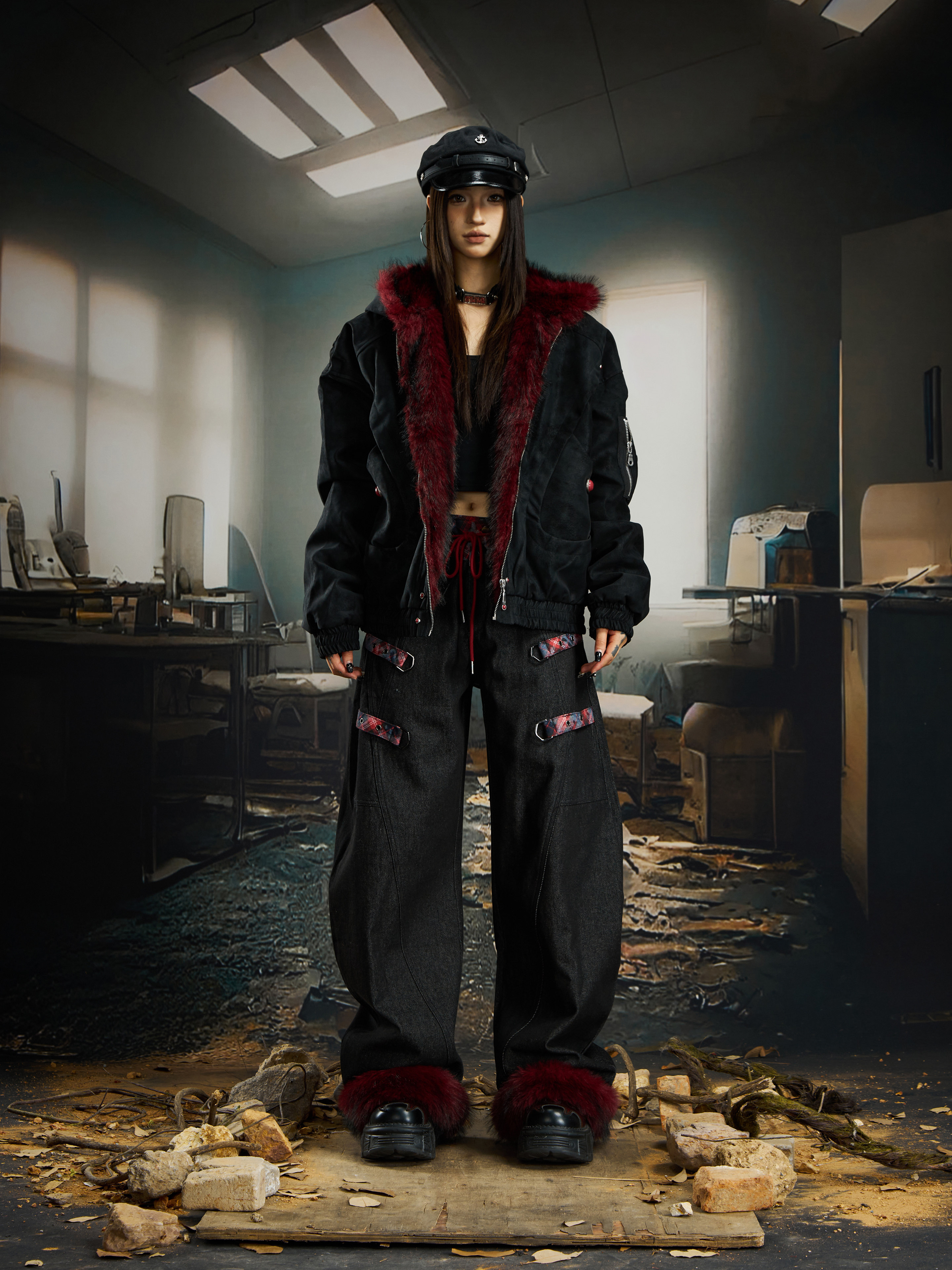 No Man's Land Original Red Mountain Eagle Texture Pu Dark Short Loose Furry Thickened Cotton Jacket