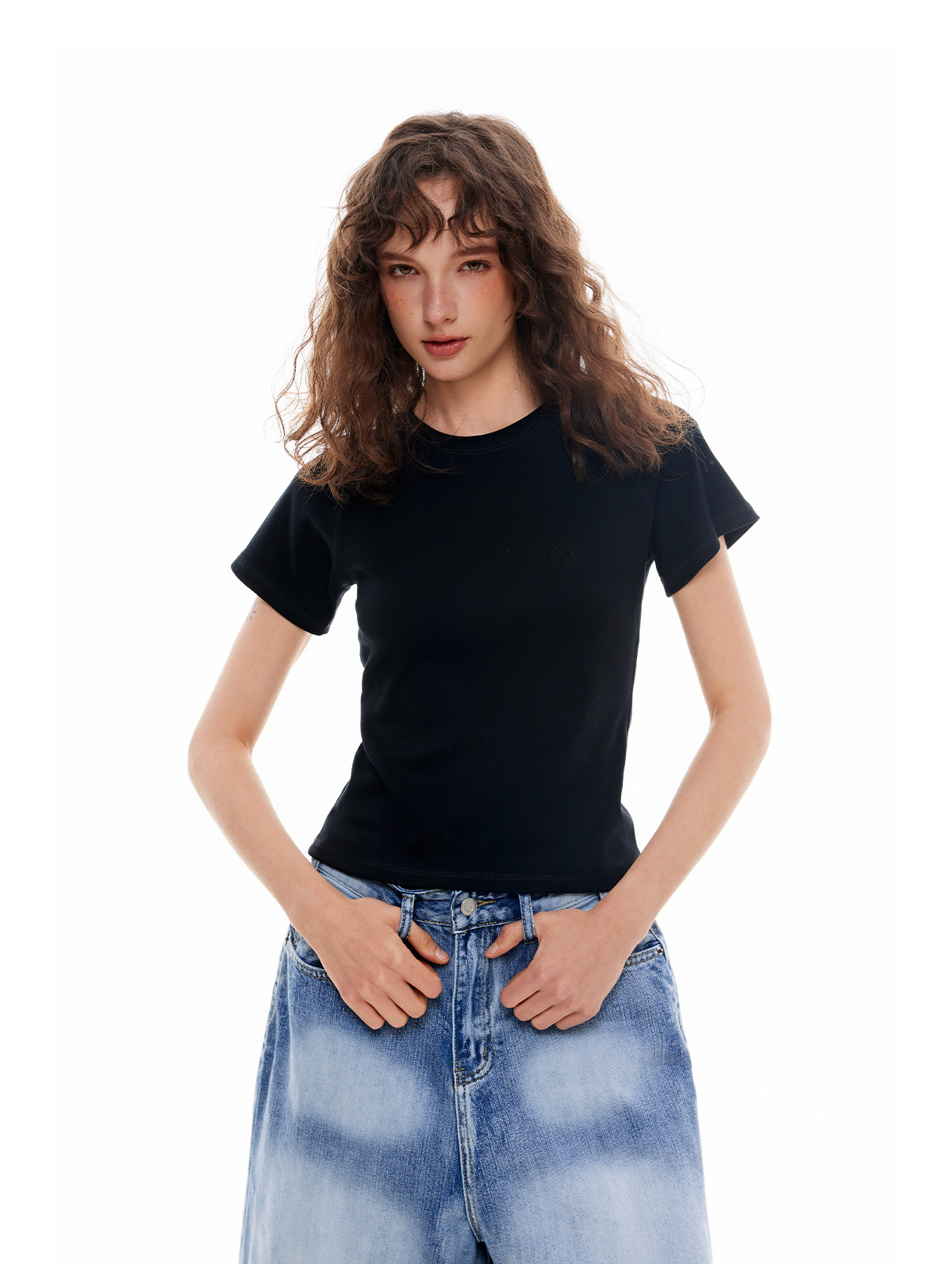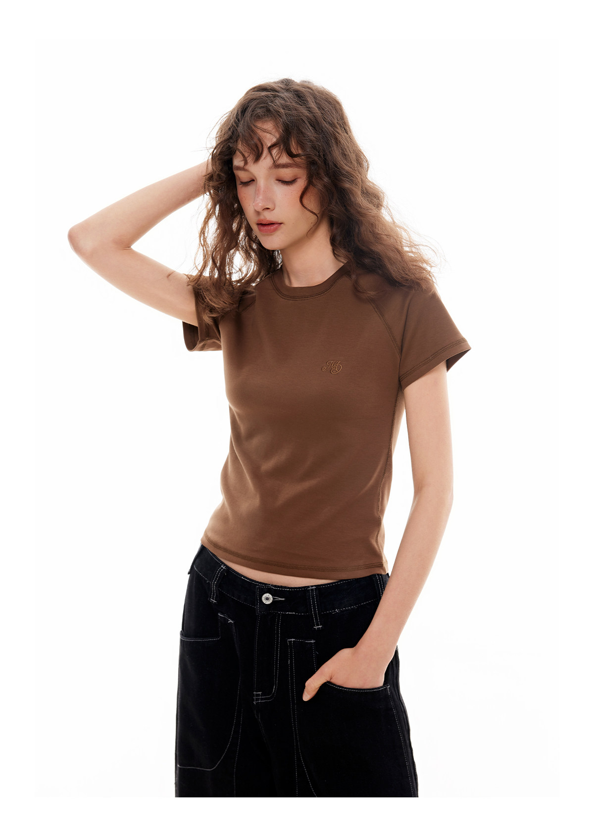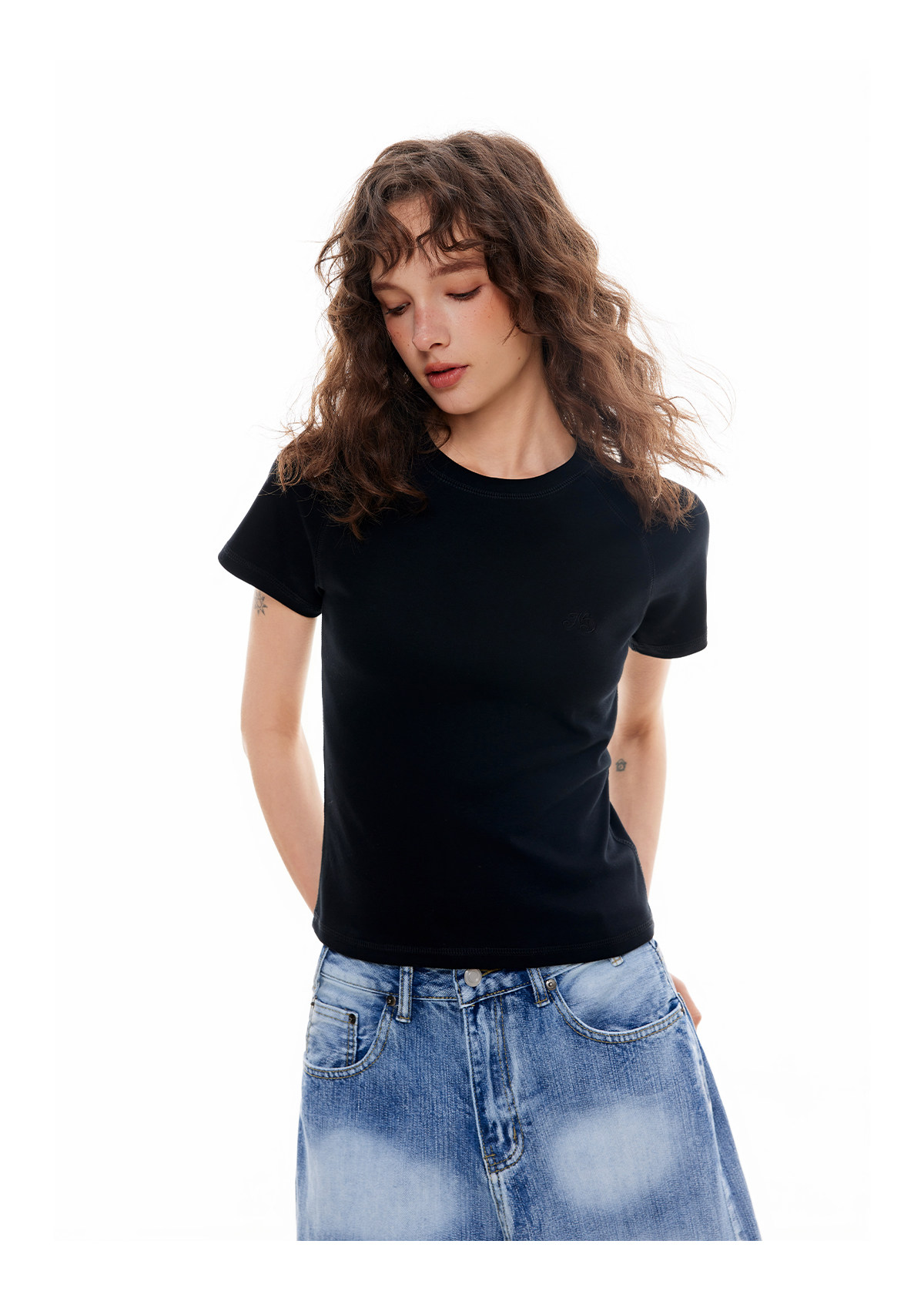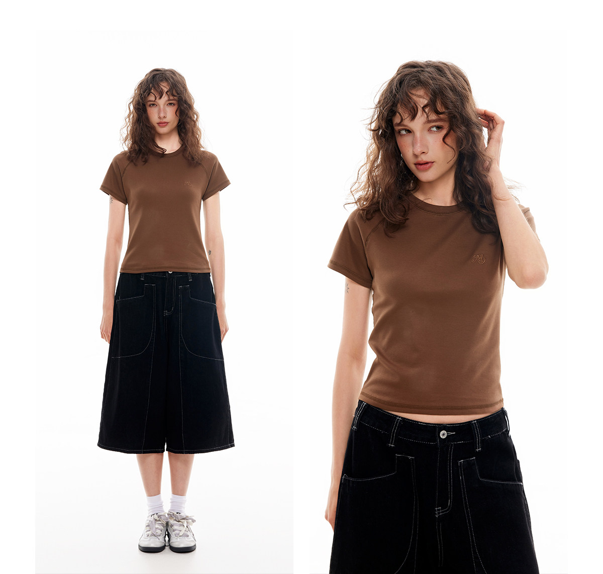 Moodberry American Retro Slim-Fit Short Shoulder T-Shirt for Women, Summer Solid Color Basic Versatile Short-Sleeve Top