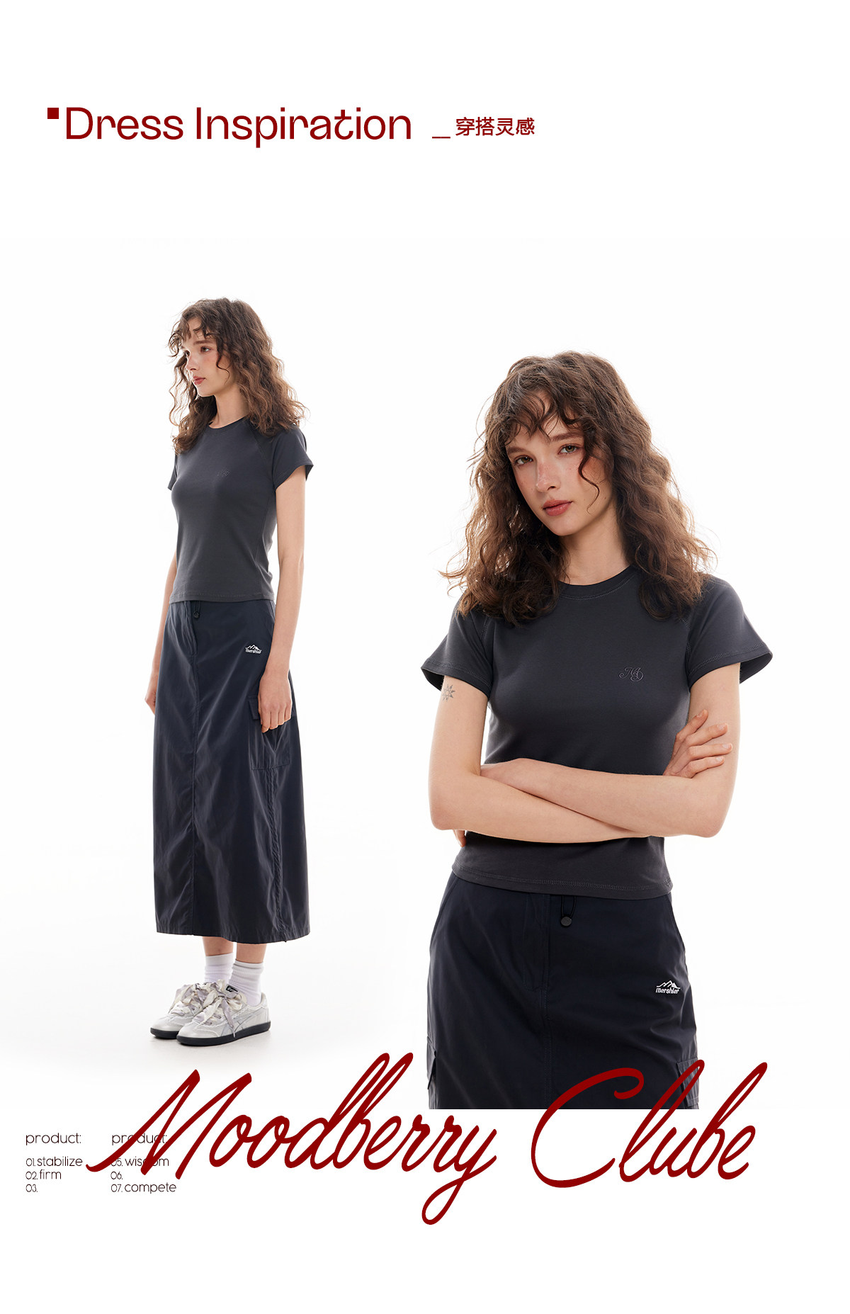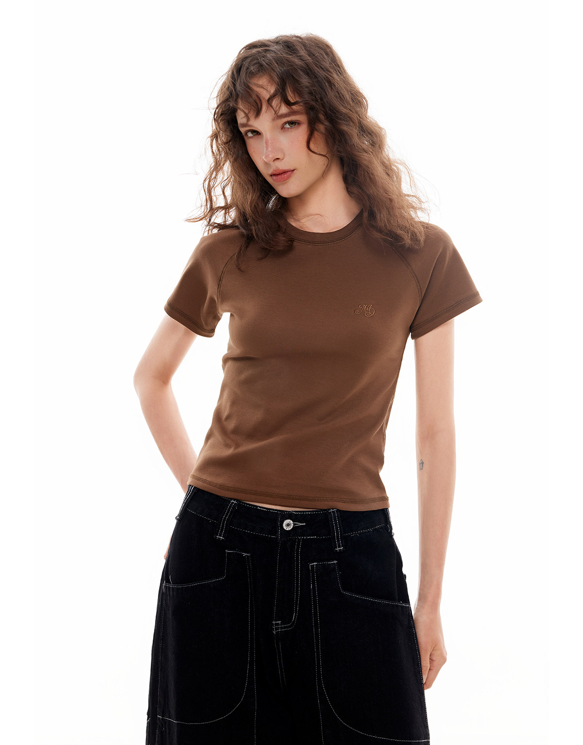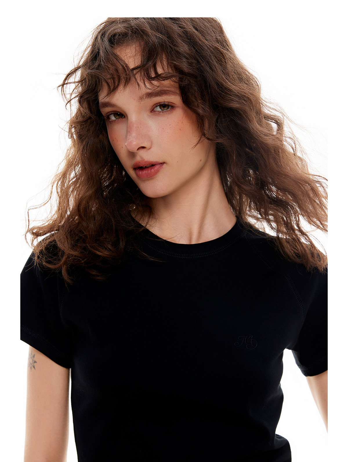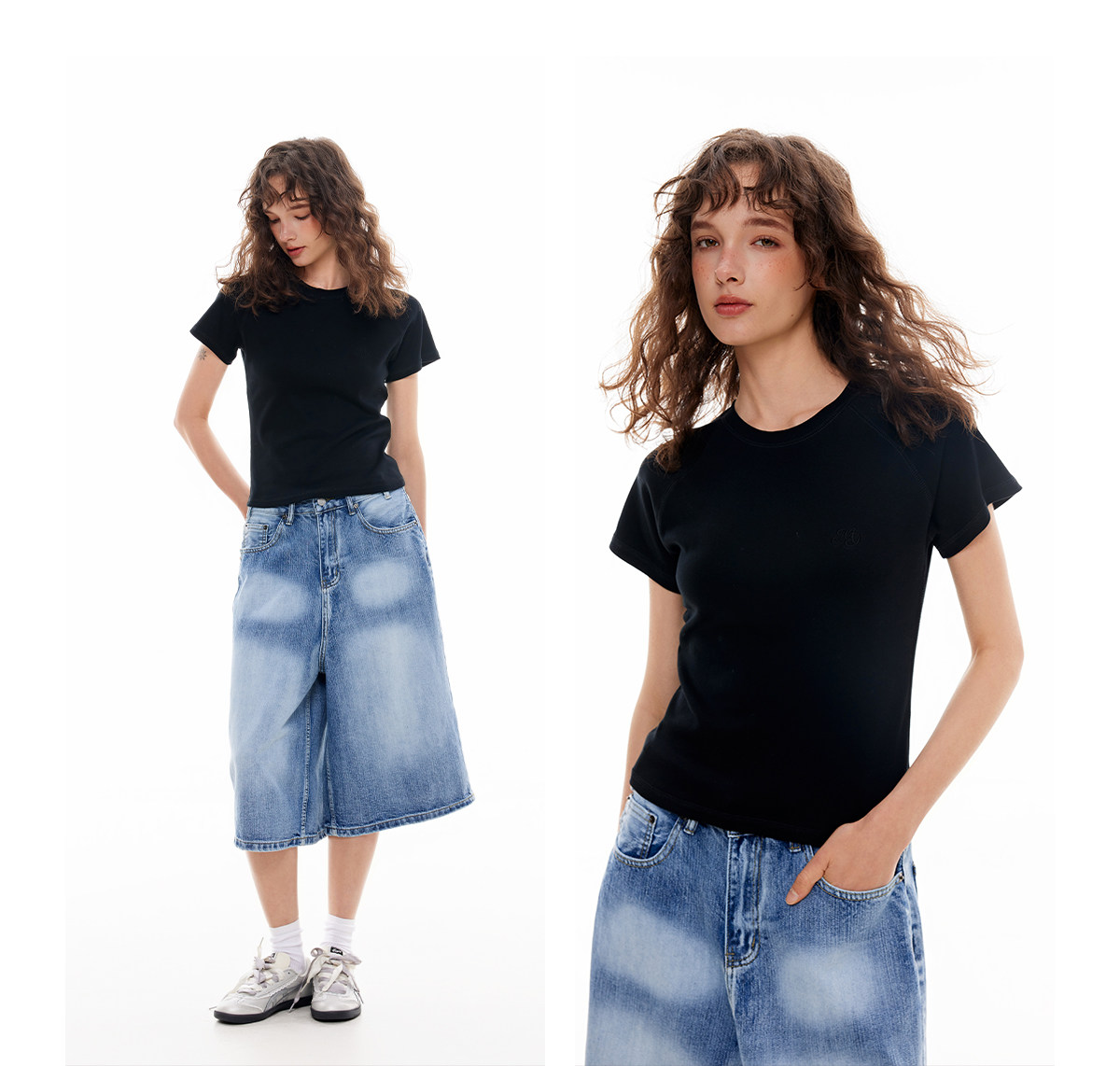 Moodberry American Retro Slim-Fit Short Shoulder T-Shirt for Women, Summer Solid Color Basic Versatile Short-Sleeve Top