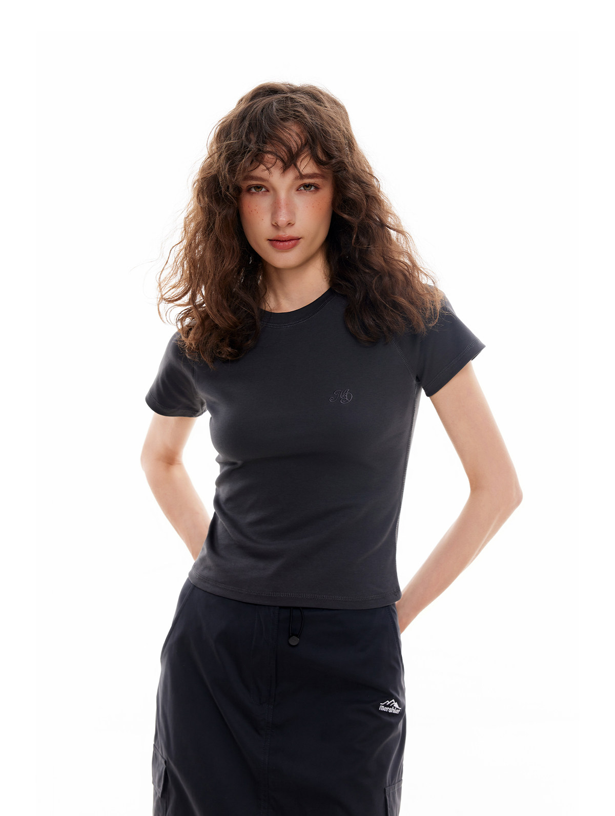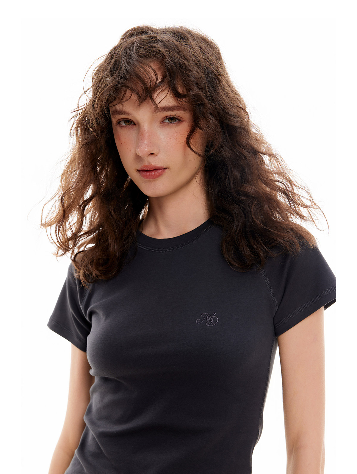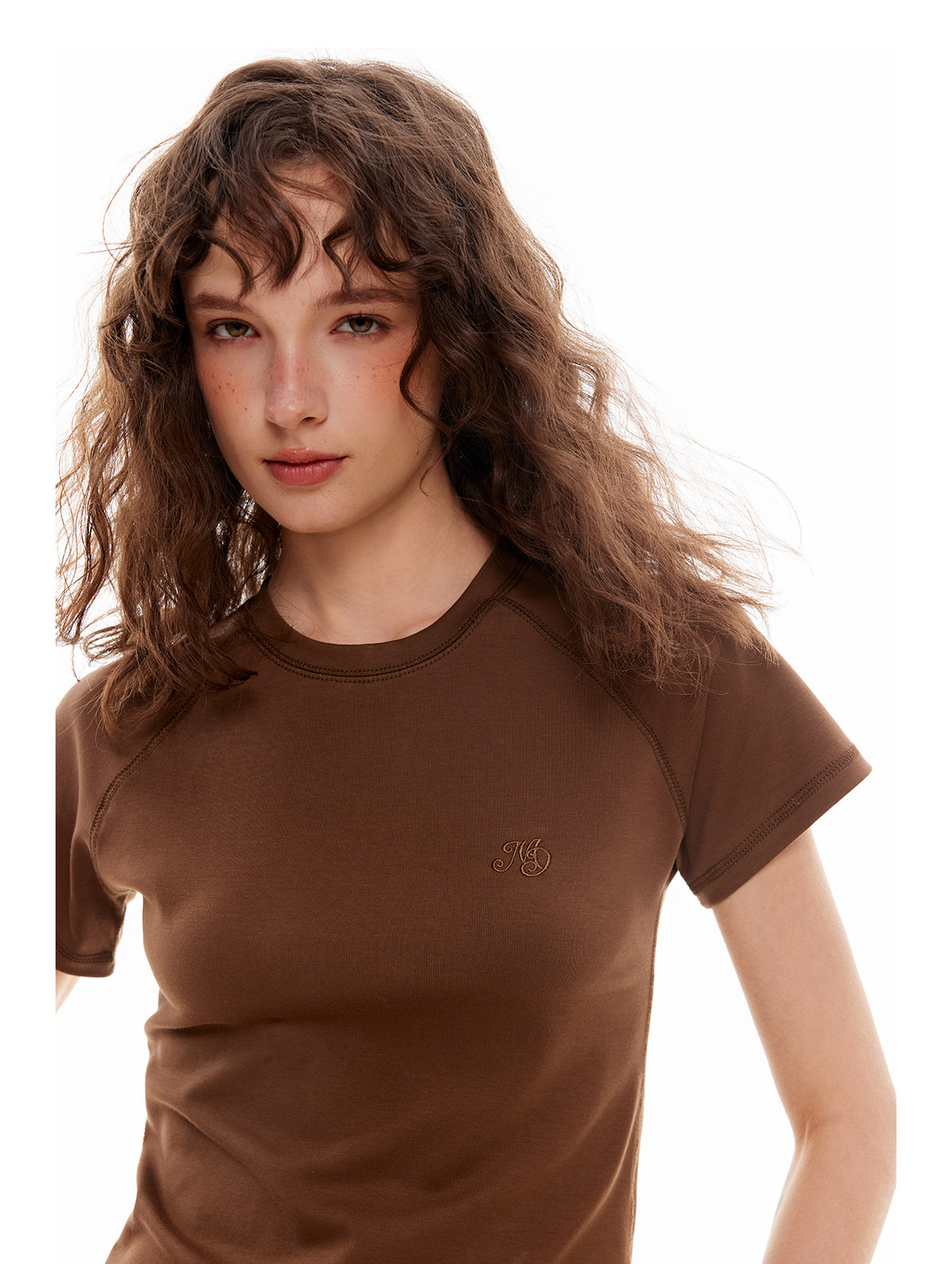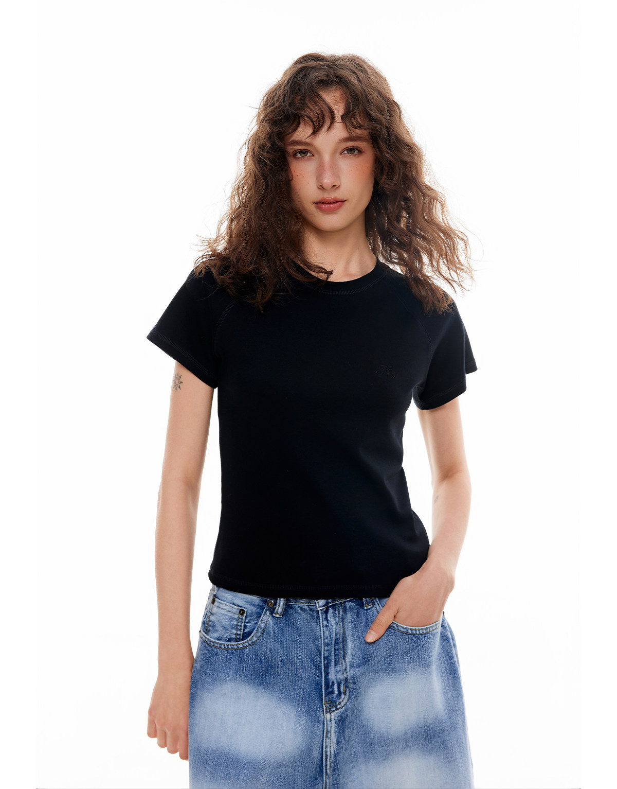 Moodberry American Retro Slim-Fit Short Shoulder T-Shirt for Women, Summer Solid Color Basic Versatile Short-Sleeve Top