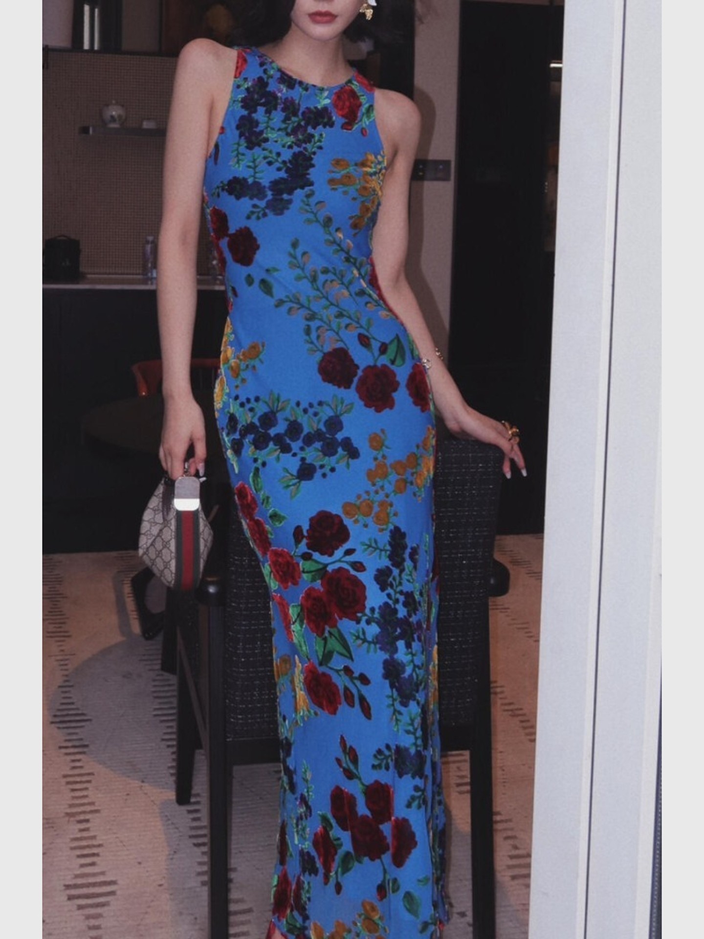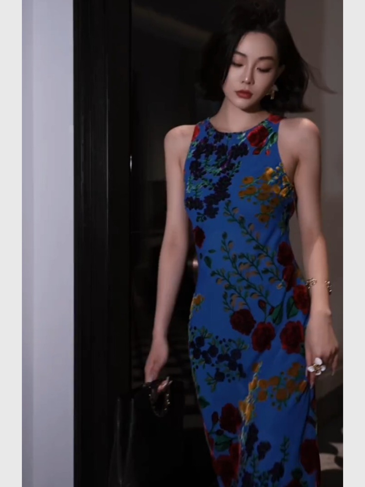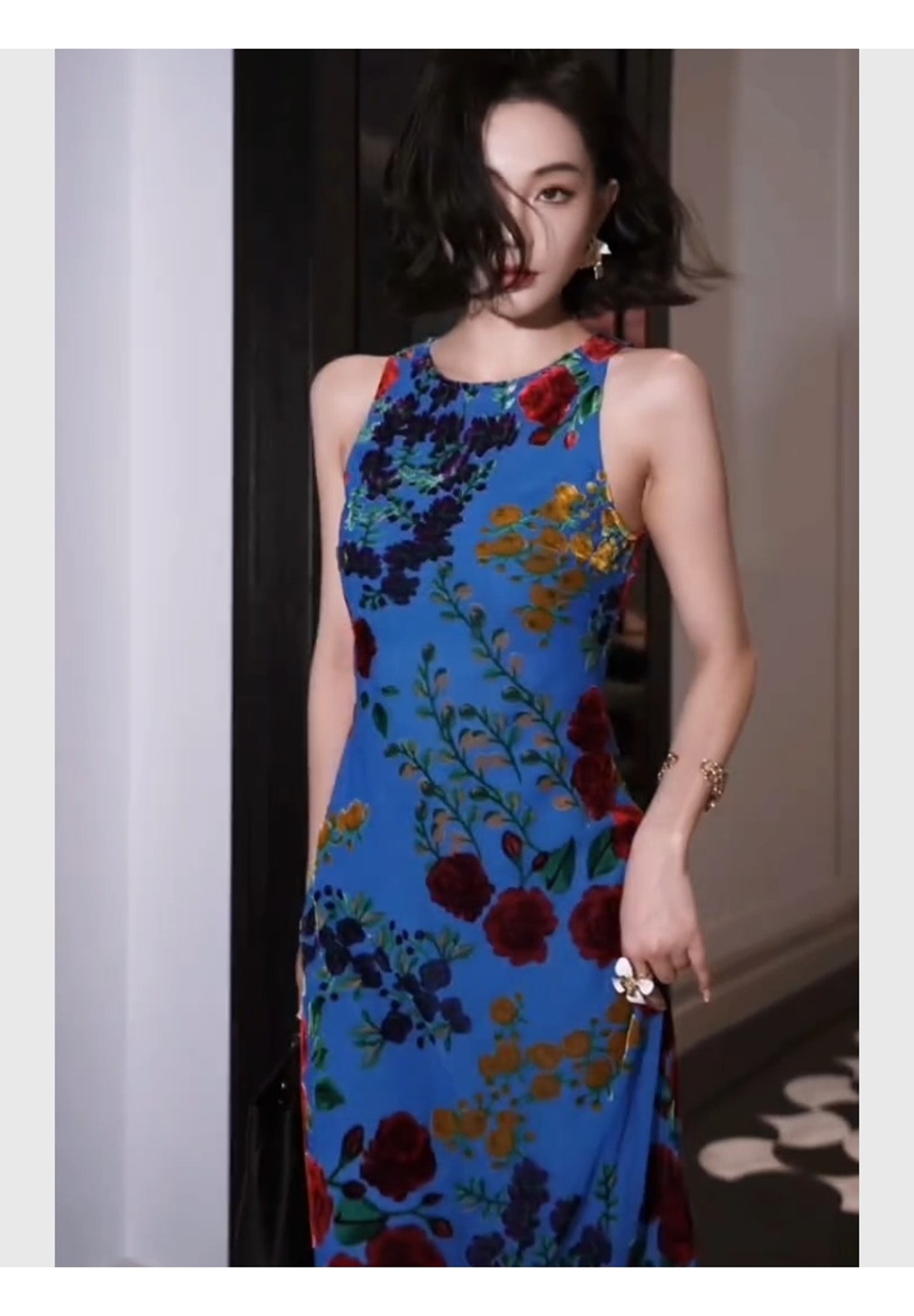 New Chinese-Style Women's Clothing, Blue Round-Neck Printed Sleeveless Improved Cheongsam Dress, Summer High-End National Style Vest Dress