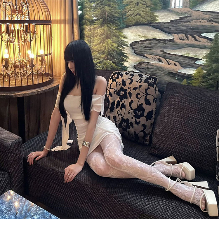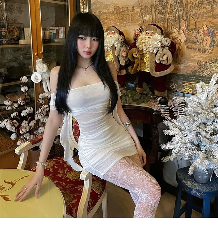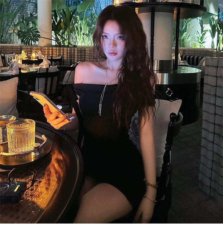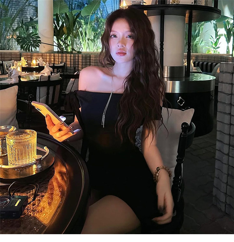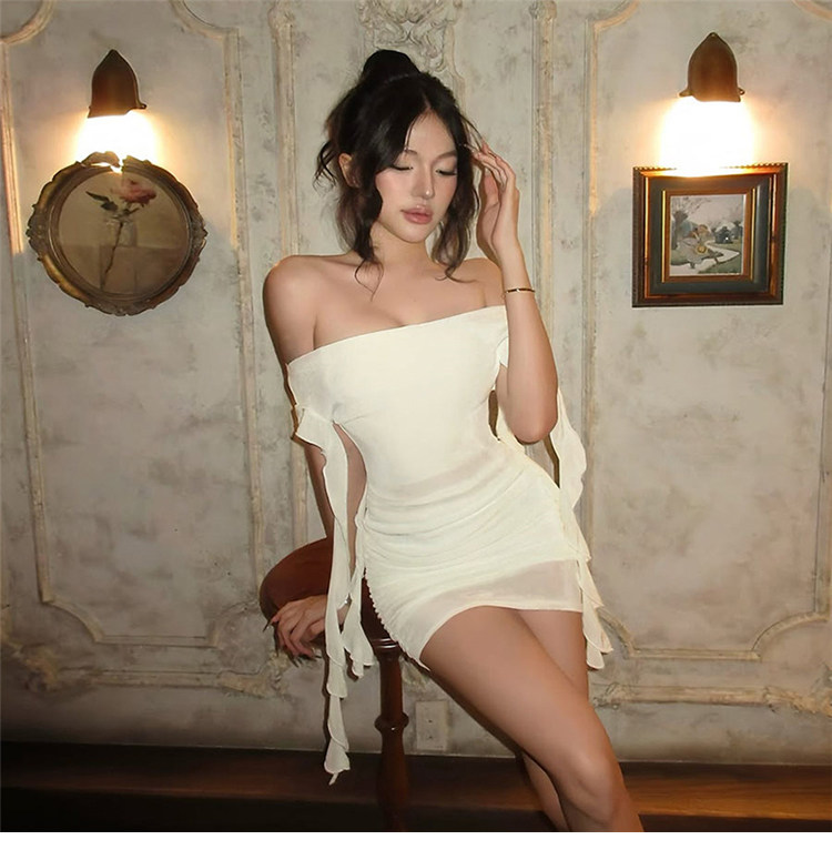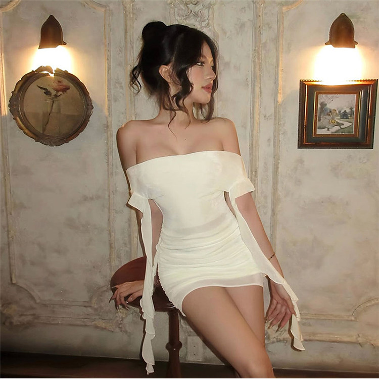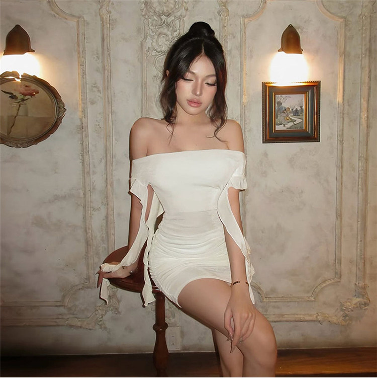 Kliou Pure and Alluring Atmosphere Ribbon Off-Shoulder Dress for Women, Vintage Niche Pleated Slimming Unique Bodycon Dress