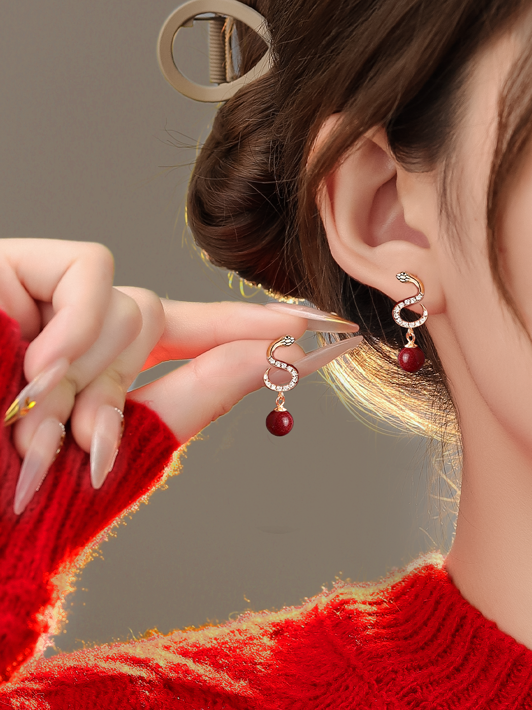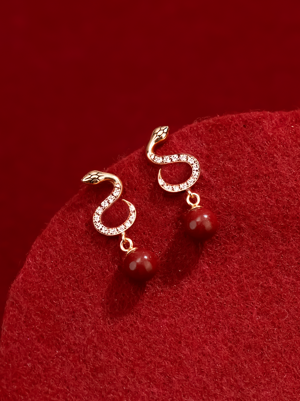 S925 Sterling Silver Red Cinnabar Snake Earrings 2025 New Hot-Selling Model for the New Year and Birth Year, High-End Earrings for Women
