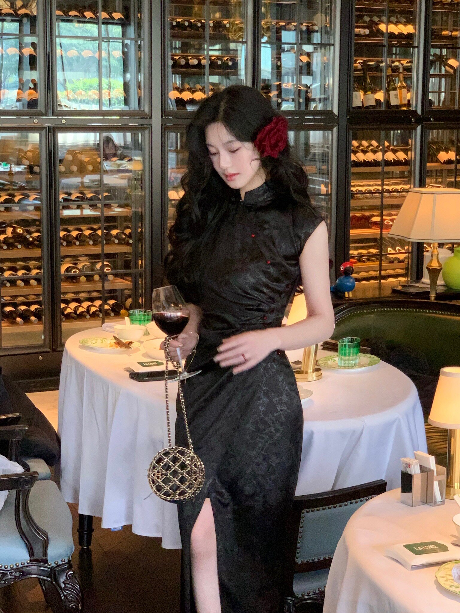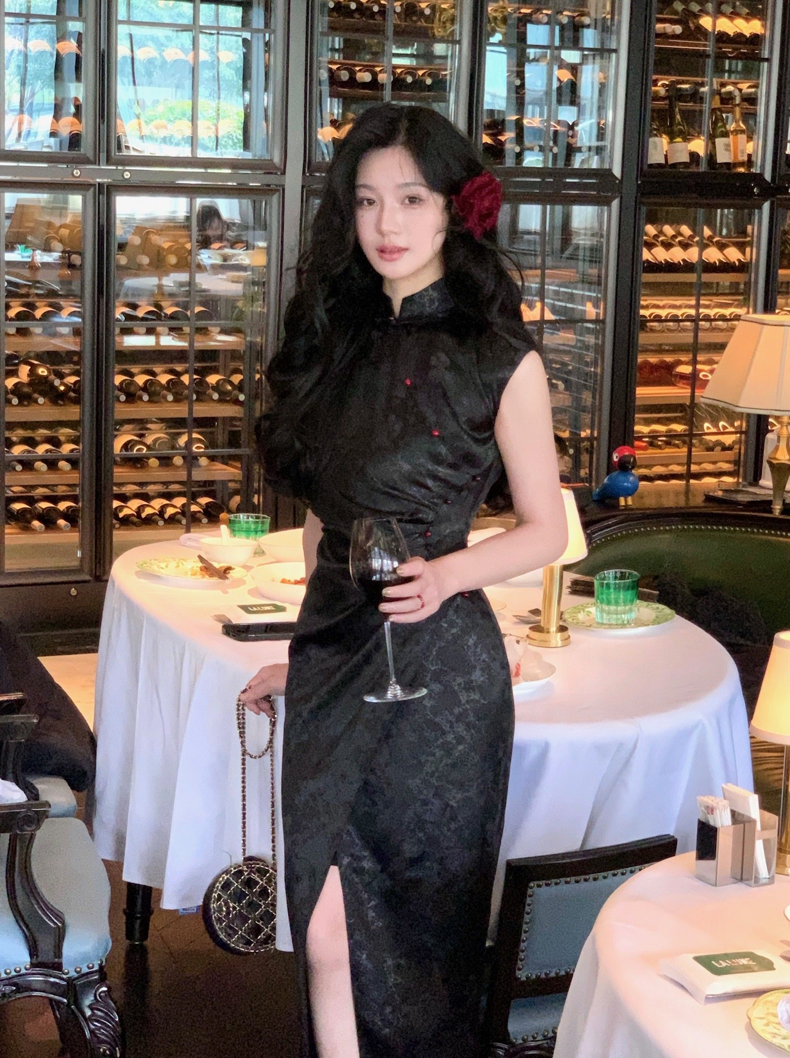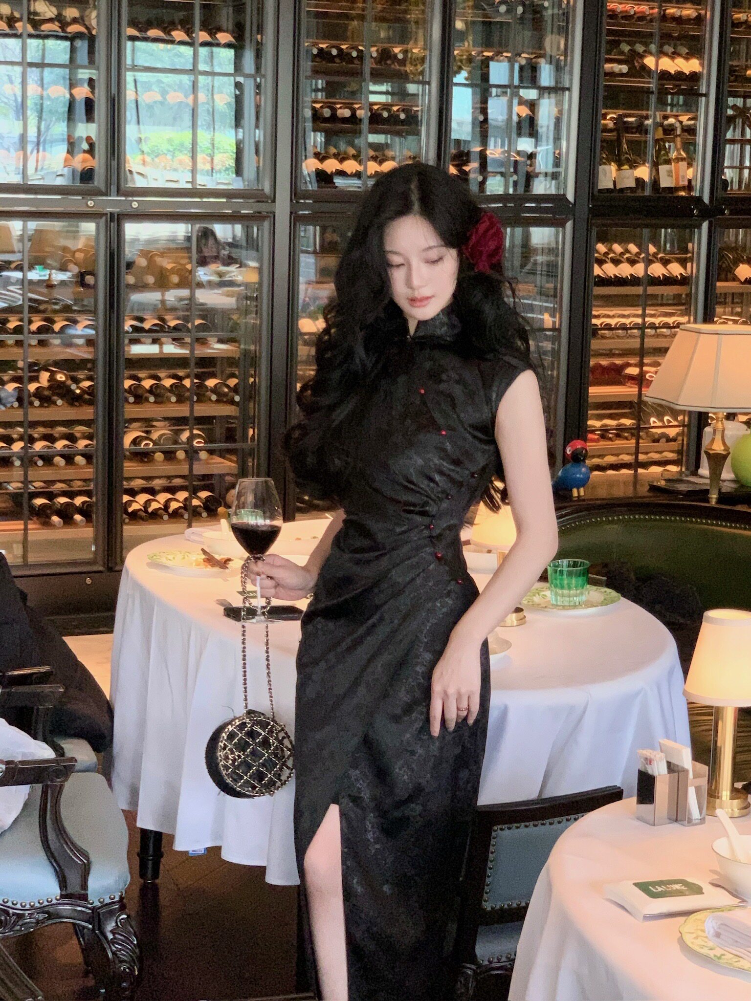 黑色款酒红珠点缀