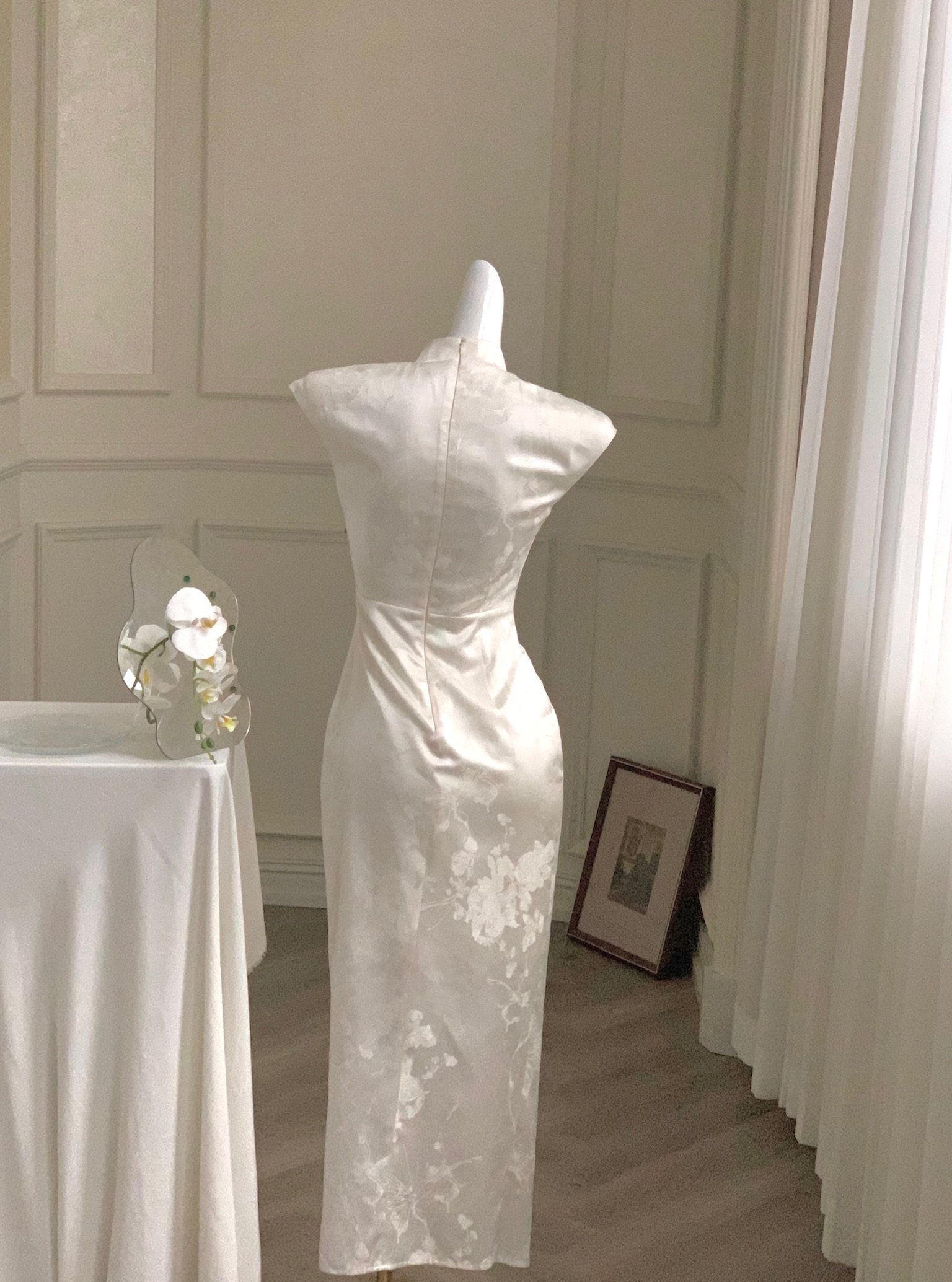 这款旗袍的亮点在于腰侧的单边C型腰设计