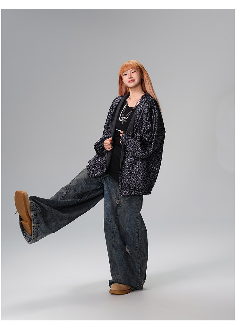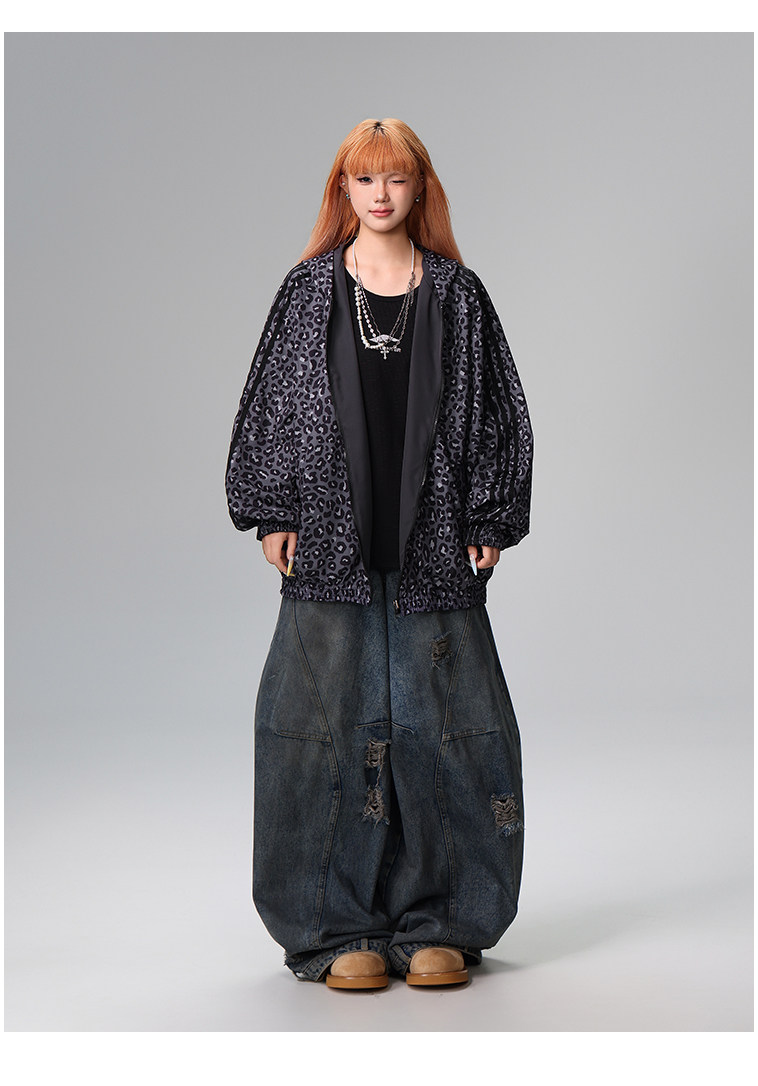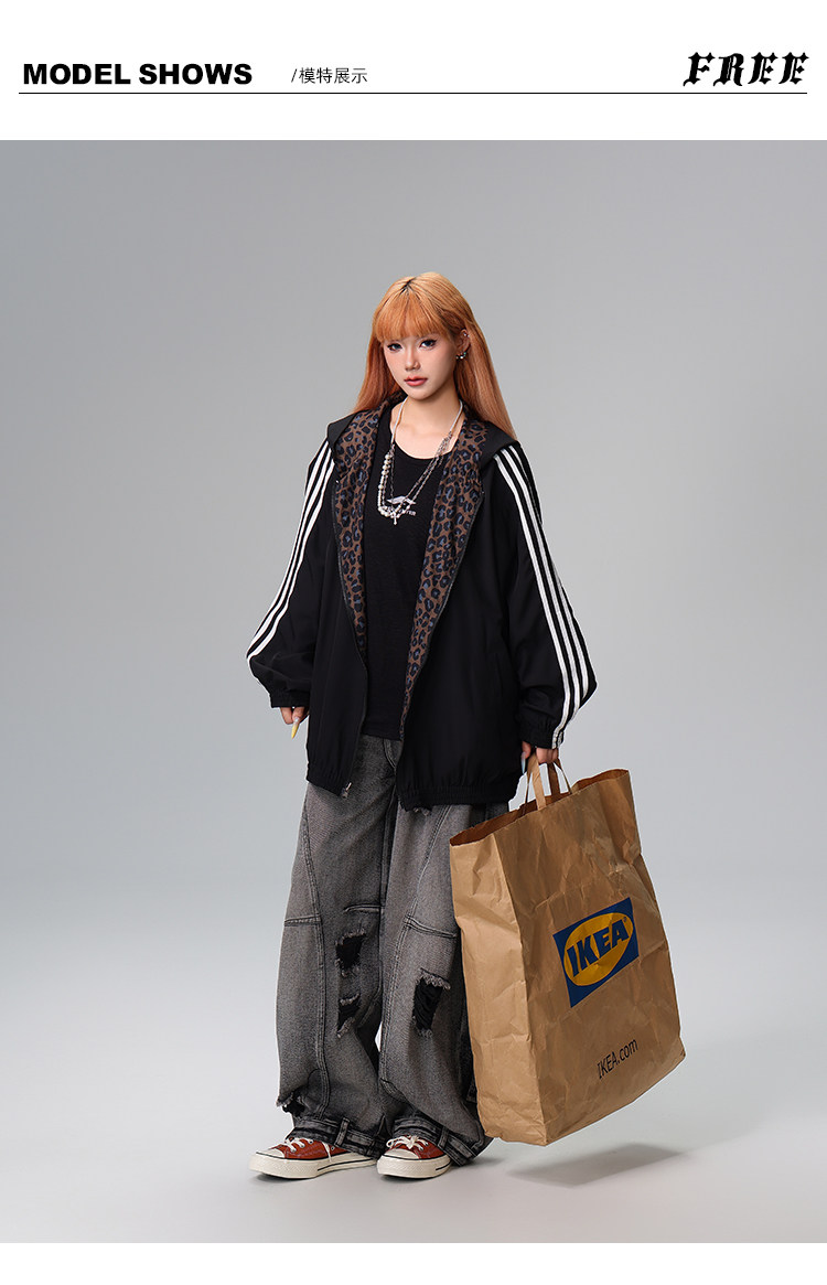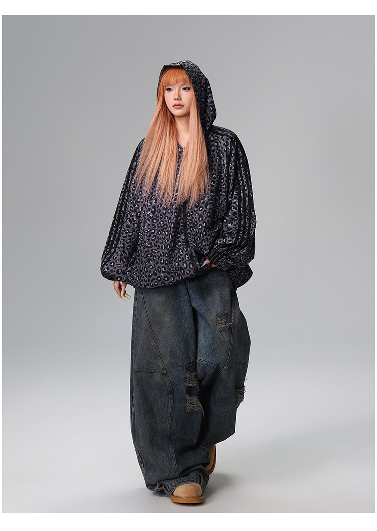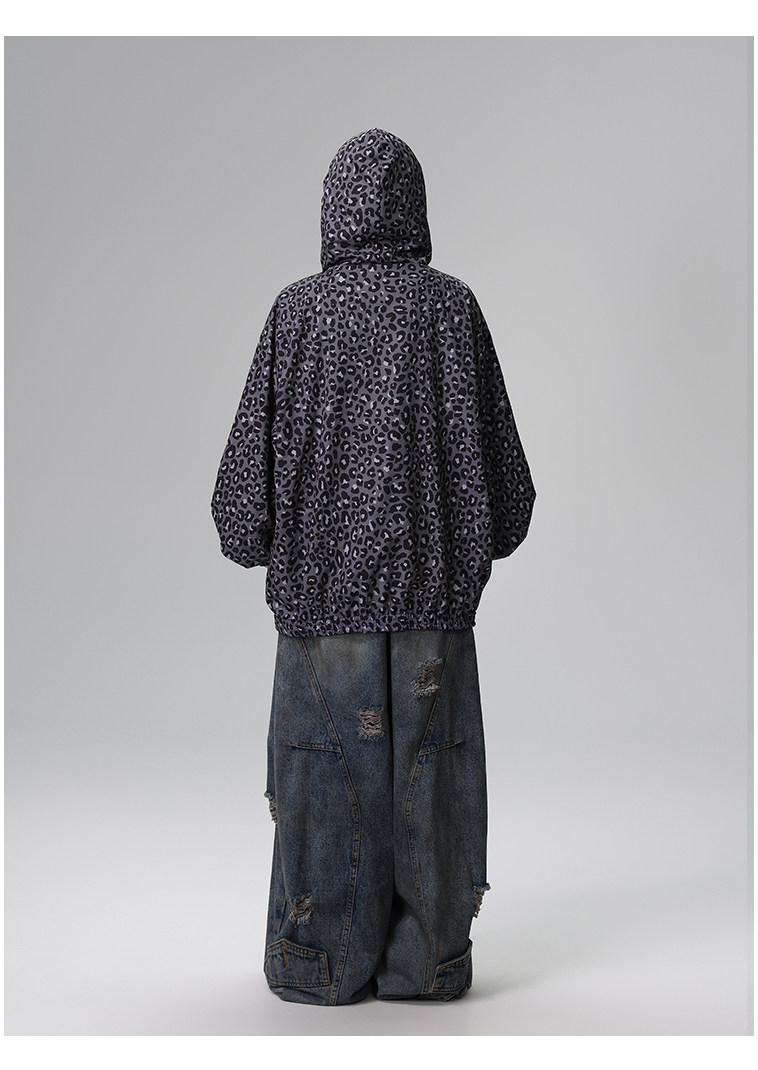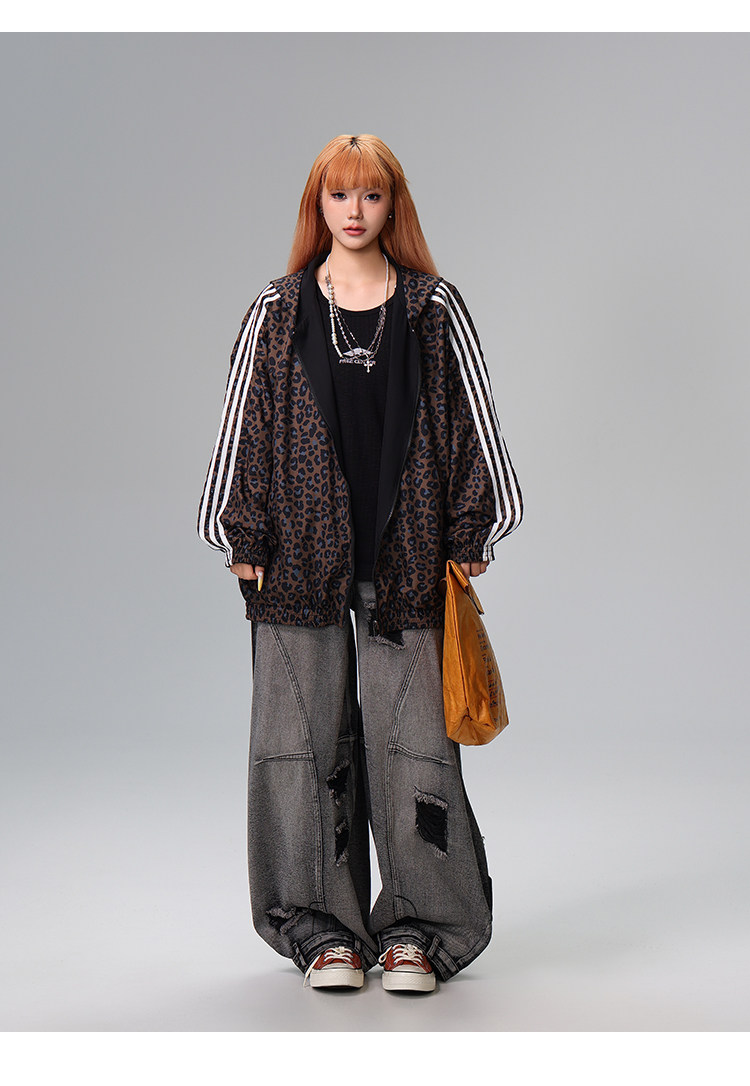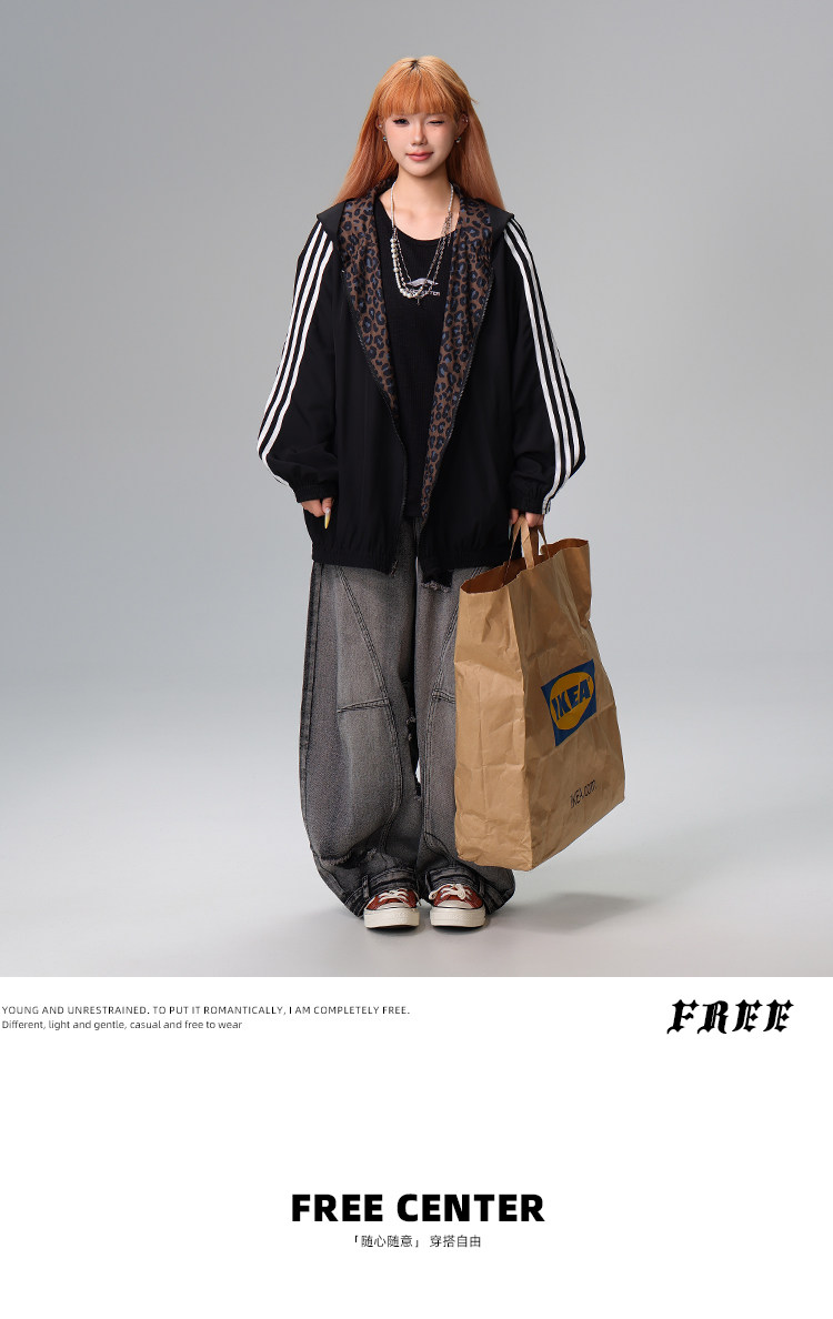 Free Center Reversible American Retro Leopard Print Jacket for Men and Women, Loose Hooded Casual Coat, Autumn Top