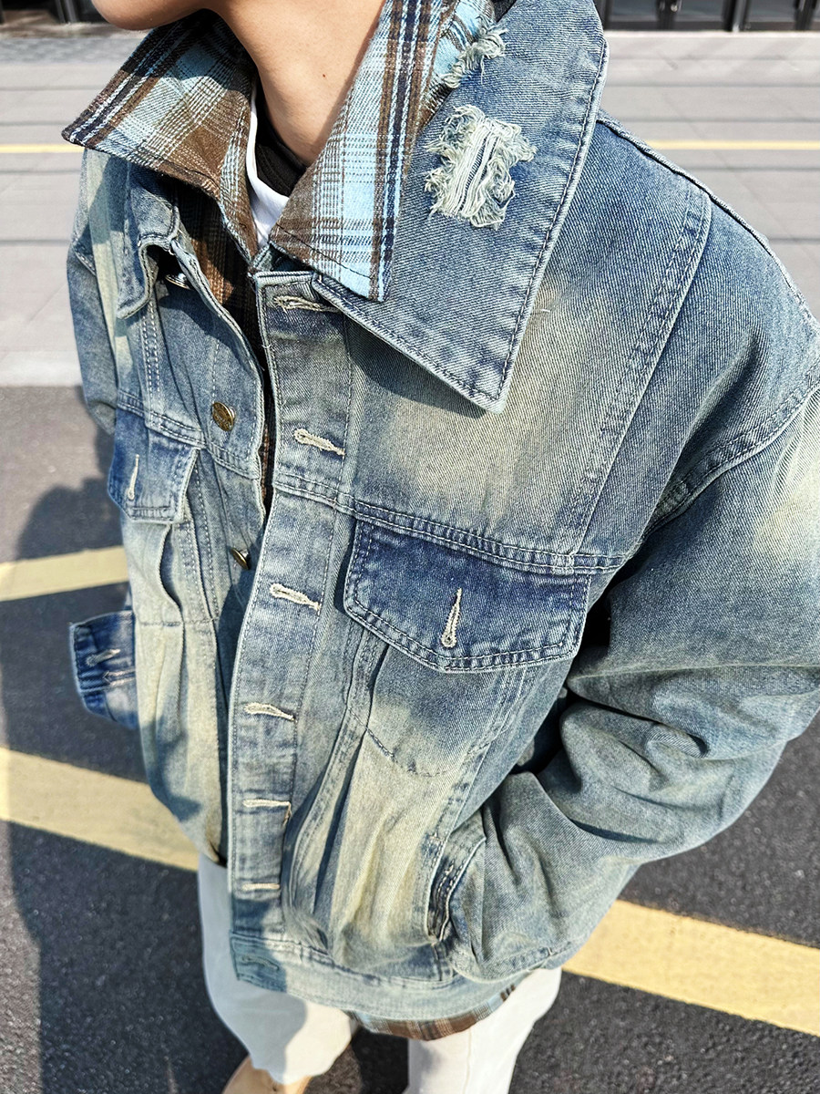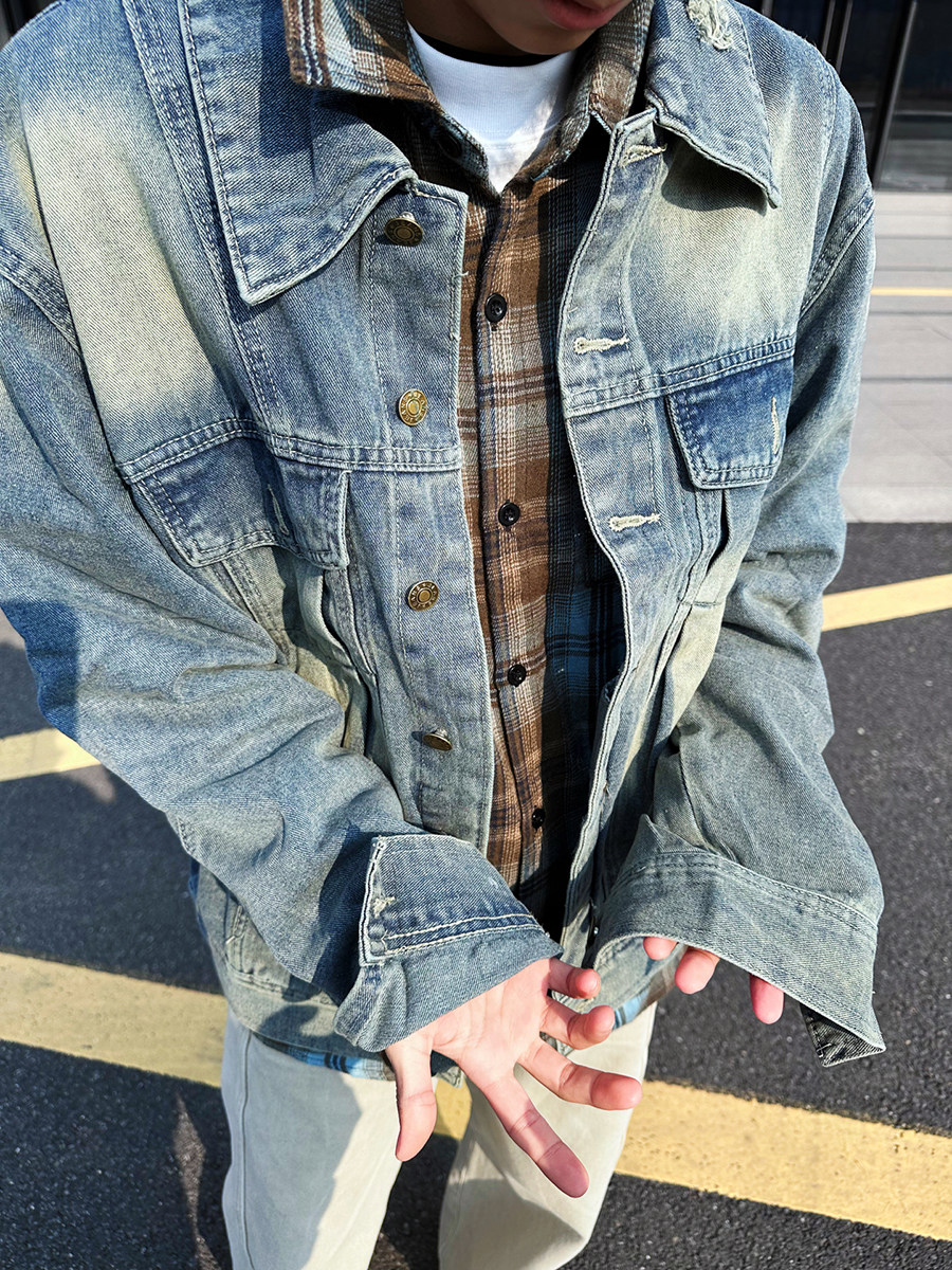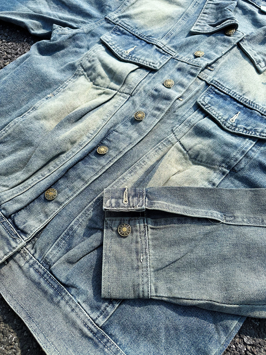 Blue Short Denim Jacket for Men, Spring American High Street Style, Washed Denim, Cleanfit Lapel Work Jacket