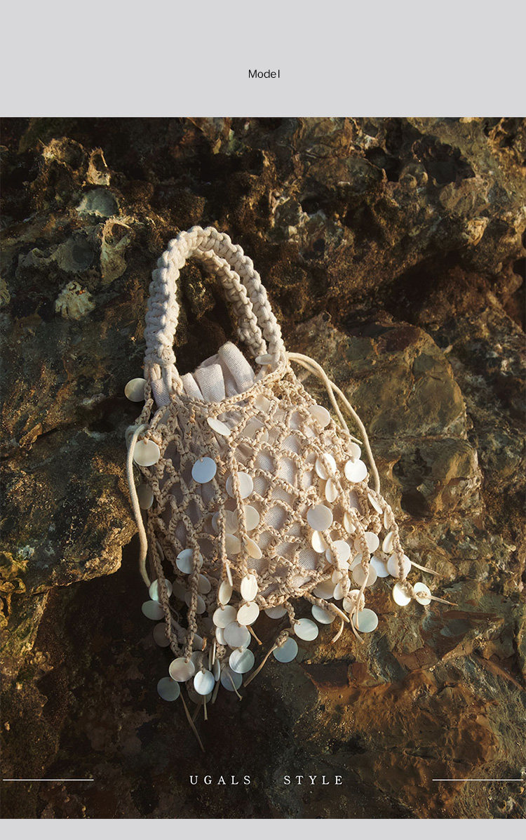 Ugals French Retro Sequin Woven Tassel Cotton and Linen Shell Hollow Bucket Party Elegant Clutch Crossbody Bag