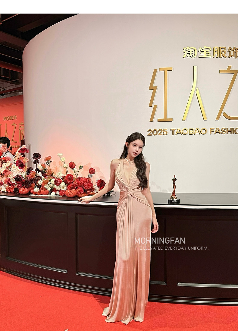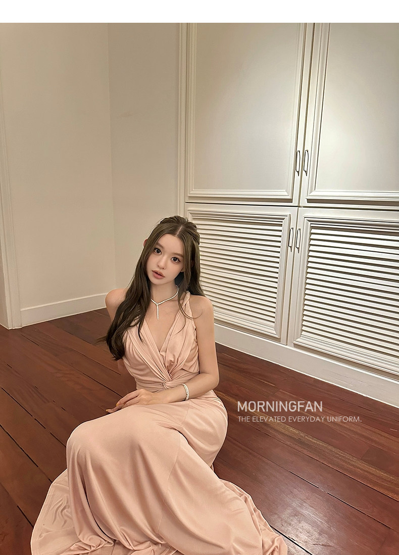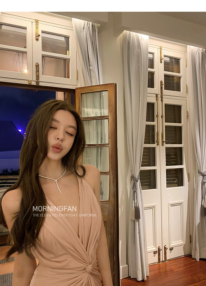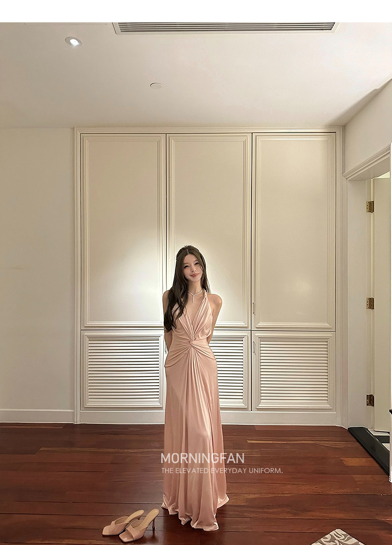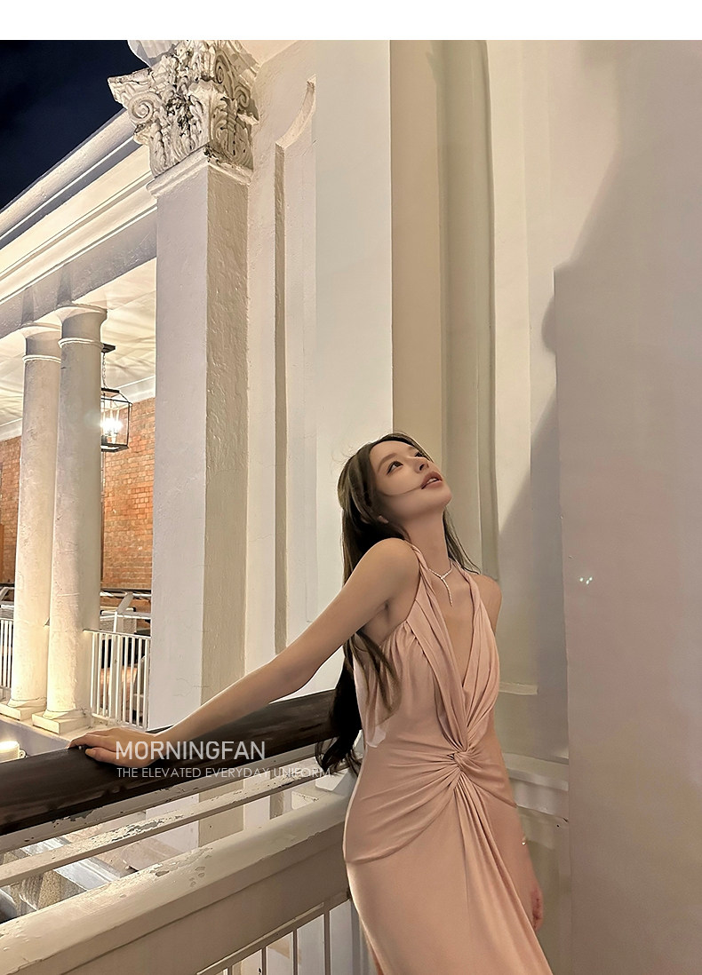 扭结挂脖的V领露背修身长连衣裙版型