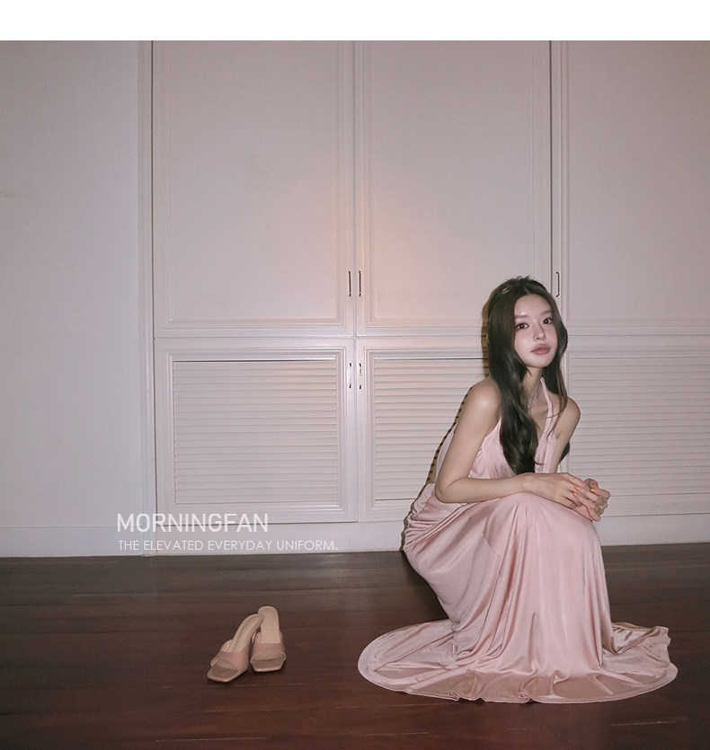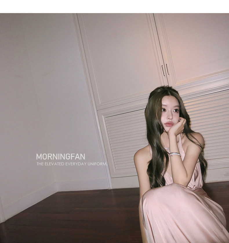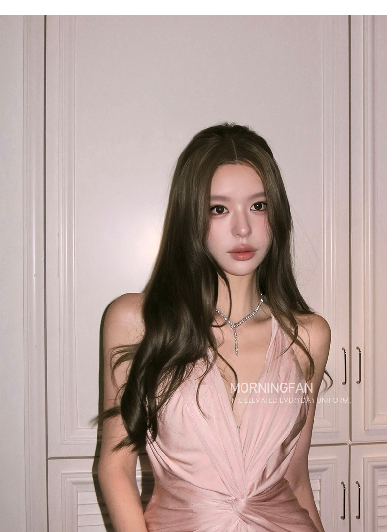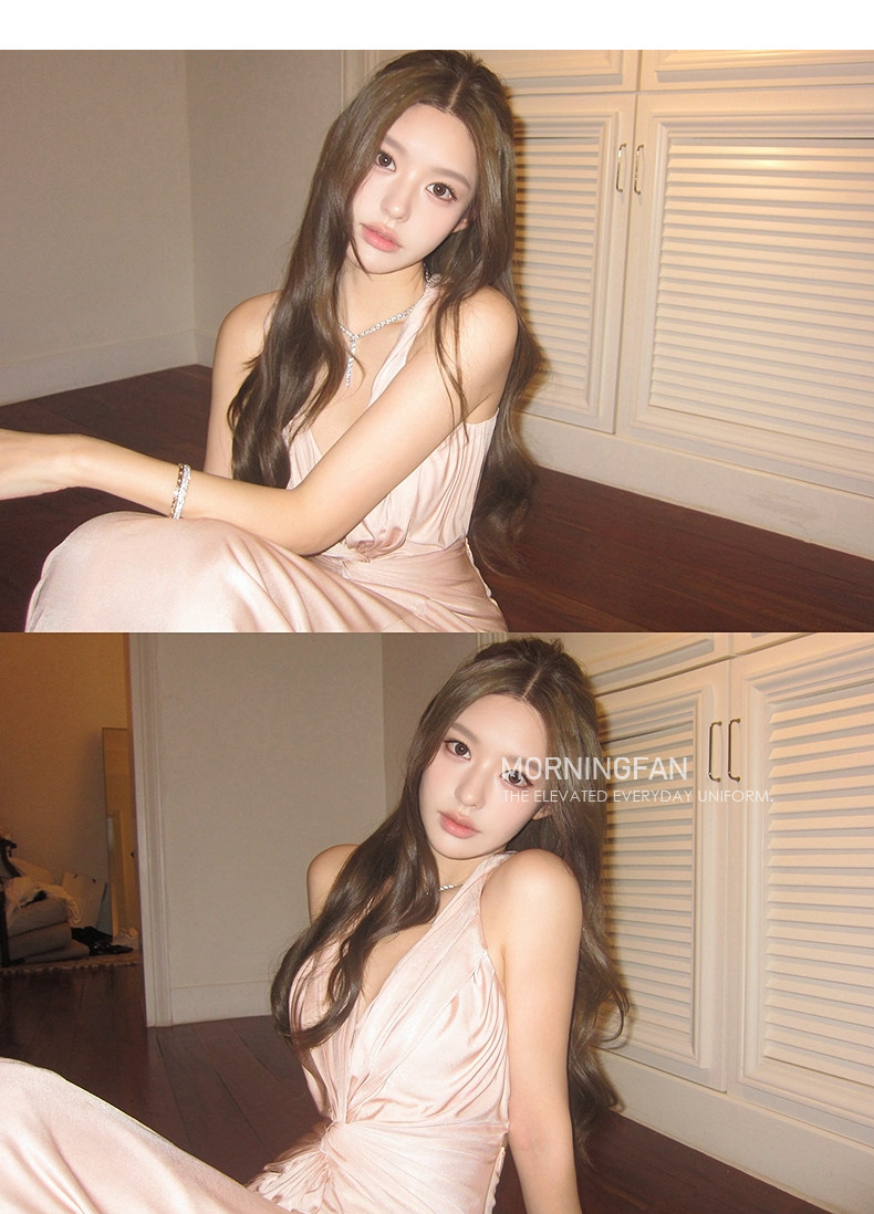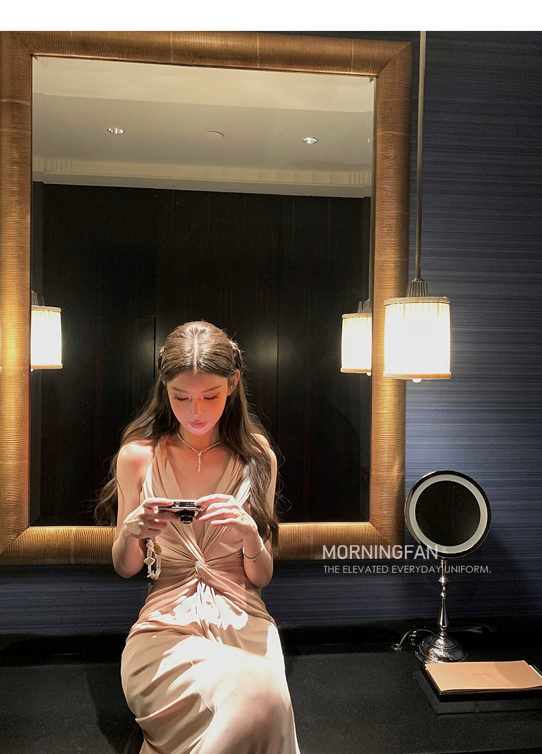 扭结挂脖的V领露背修身长连衣裙版型