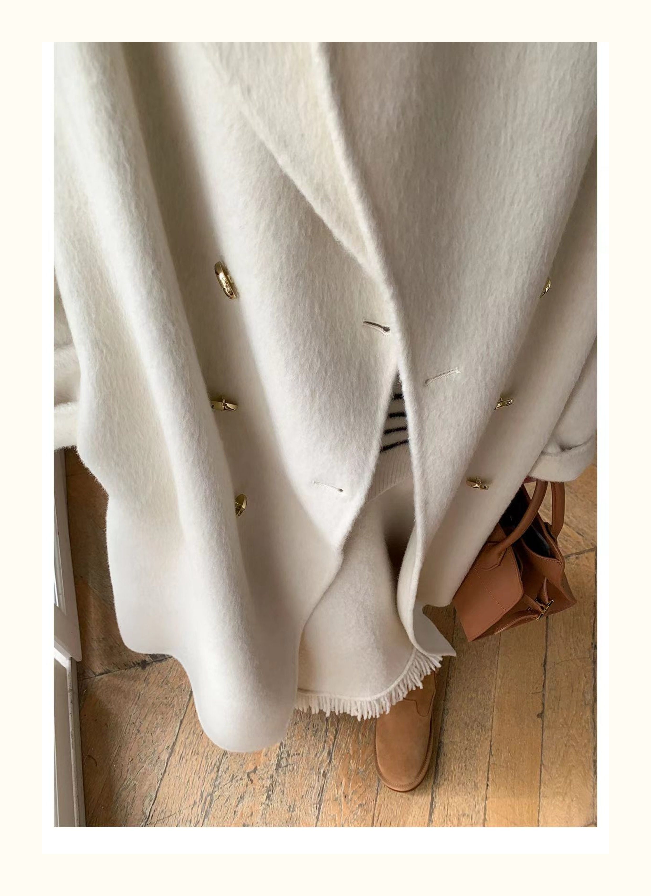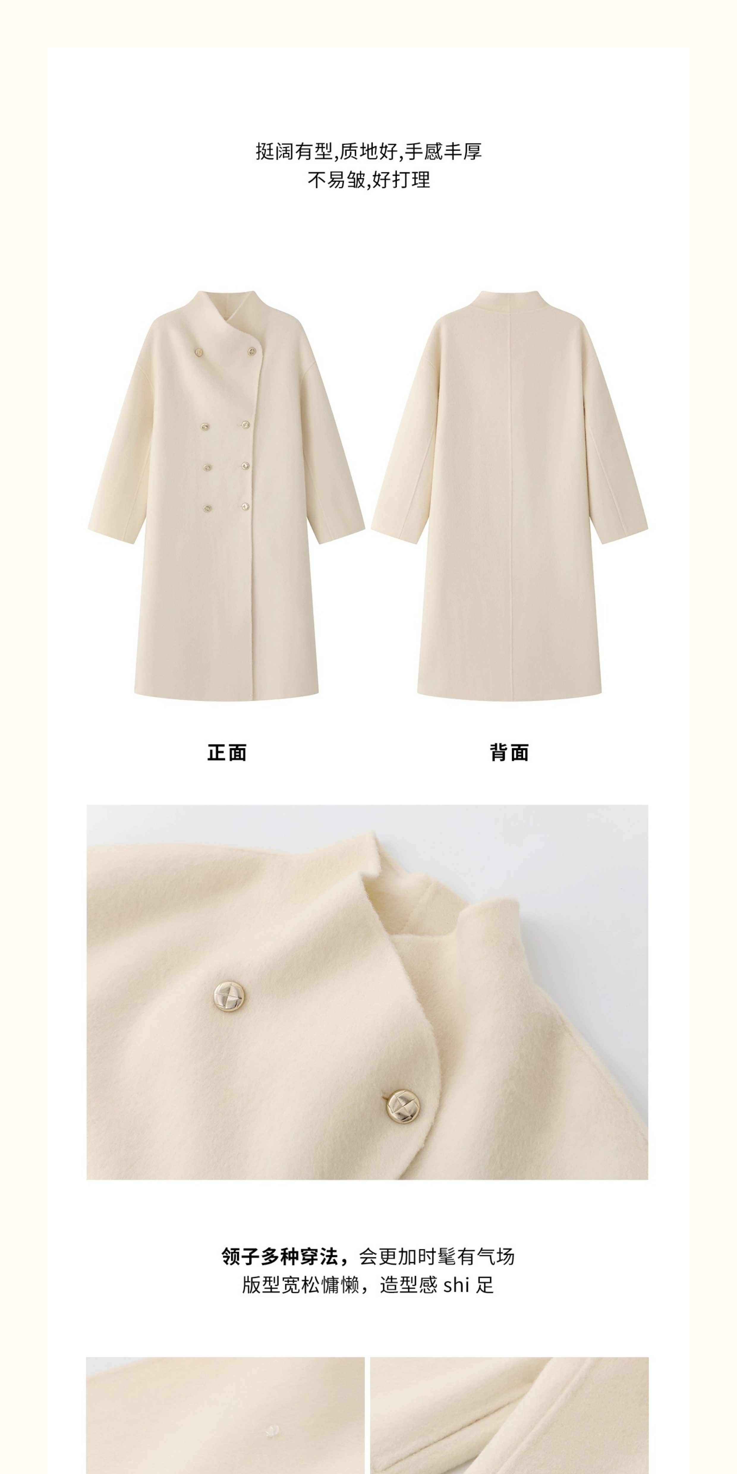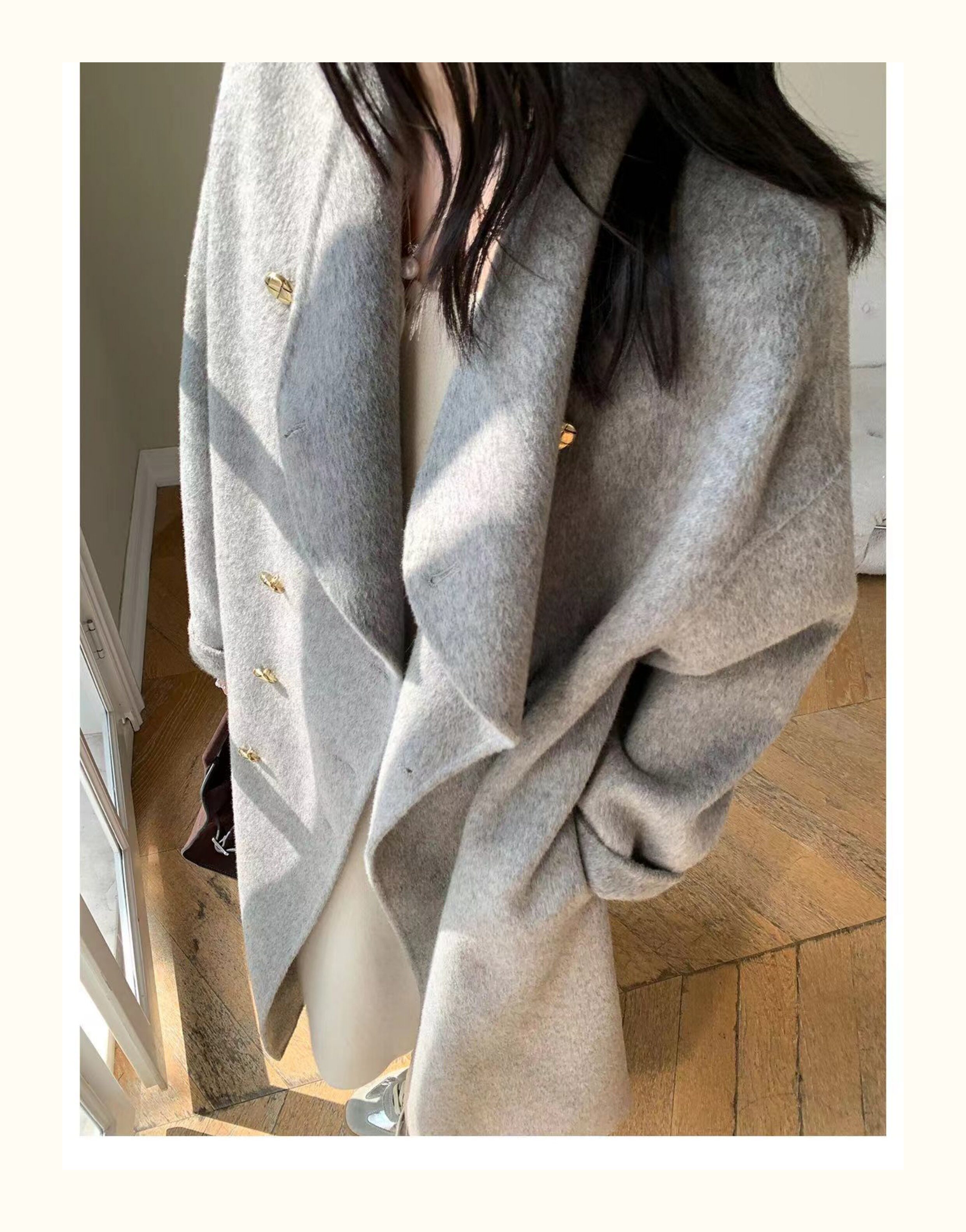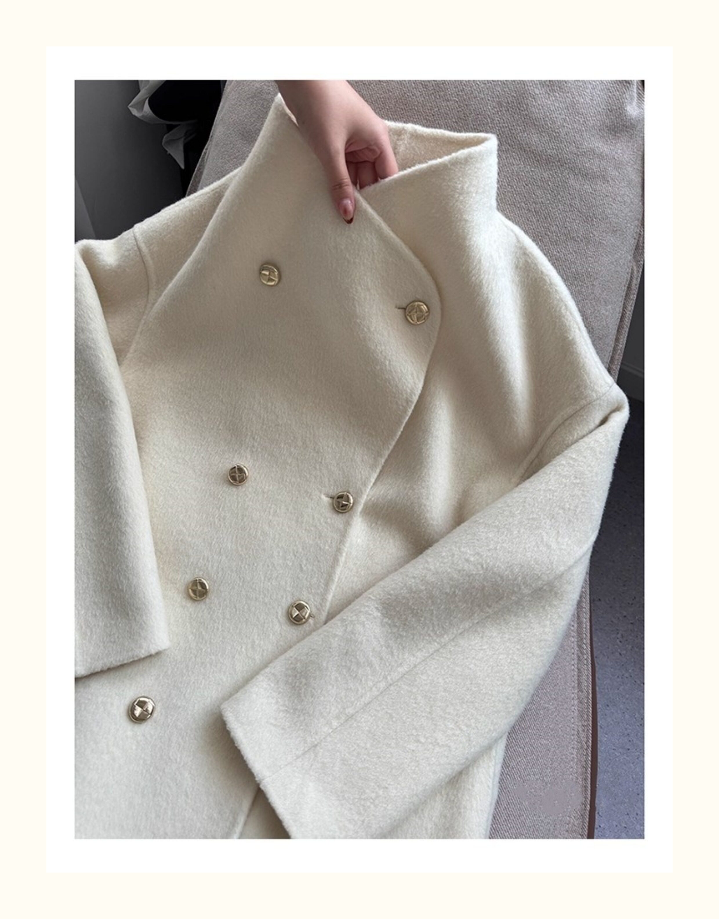 Gold-Buckle Mid-Length Double-Sided Cashmere Coat for Women, 2025 Autumn and Winter, High-End Korean Style, Stand-Up Collar, Loose Woolen Coat