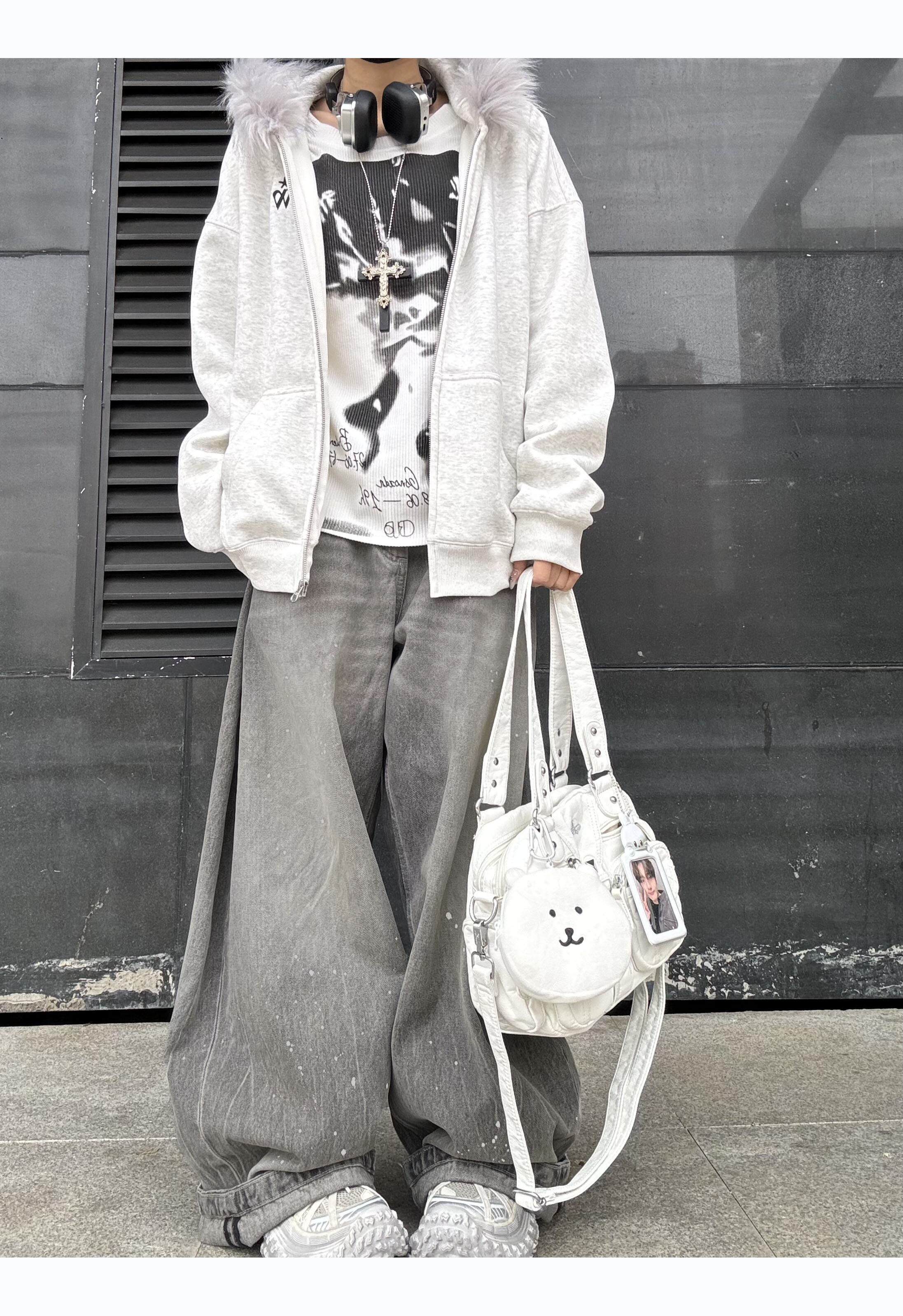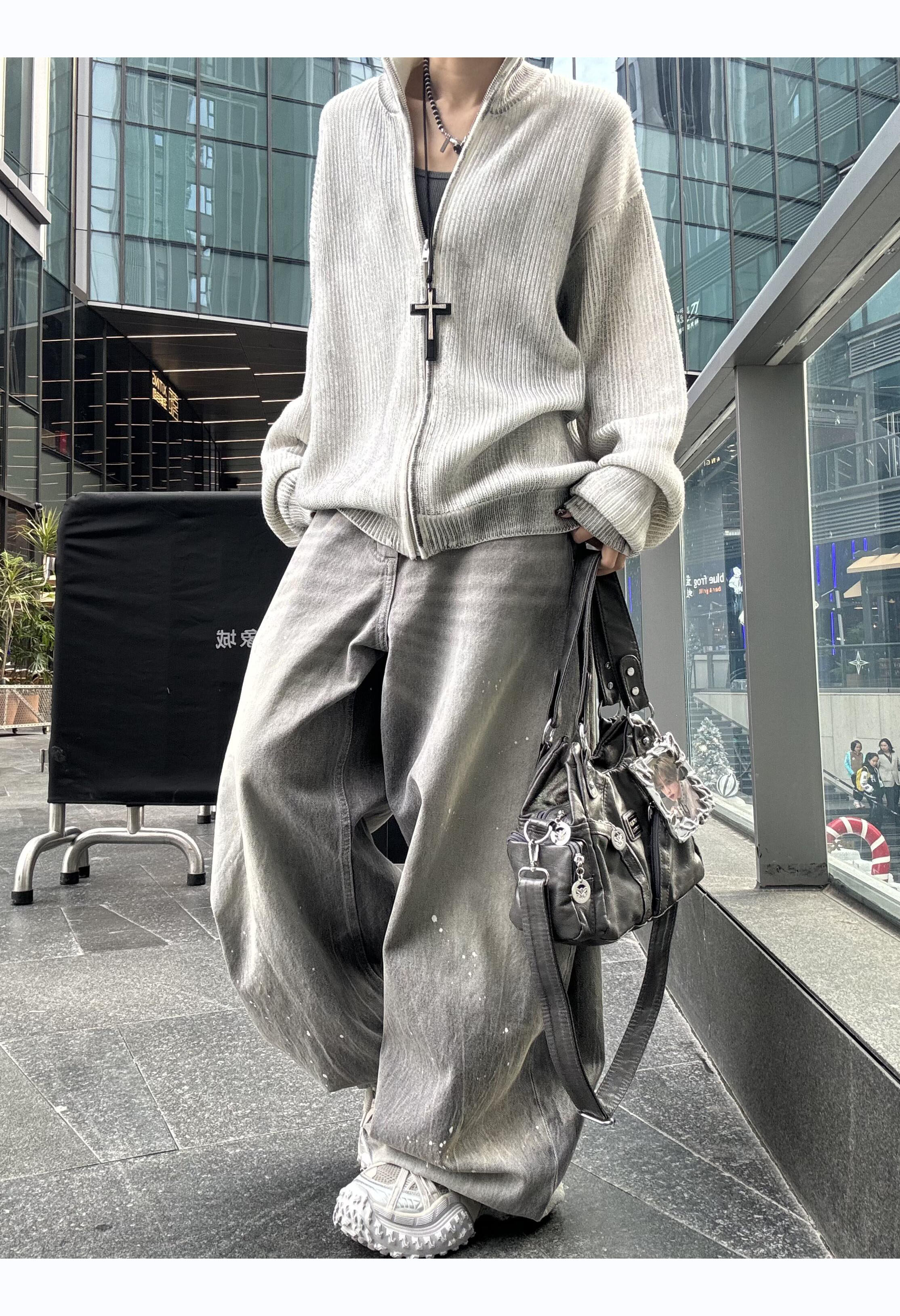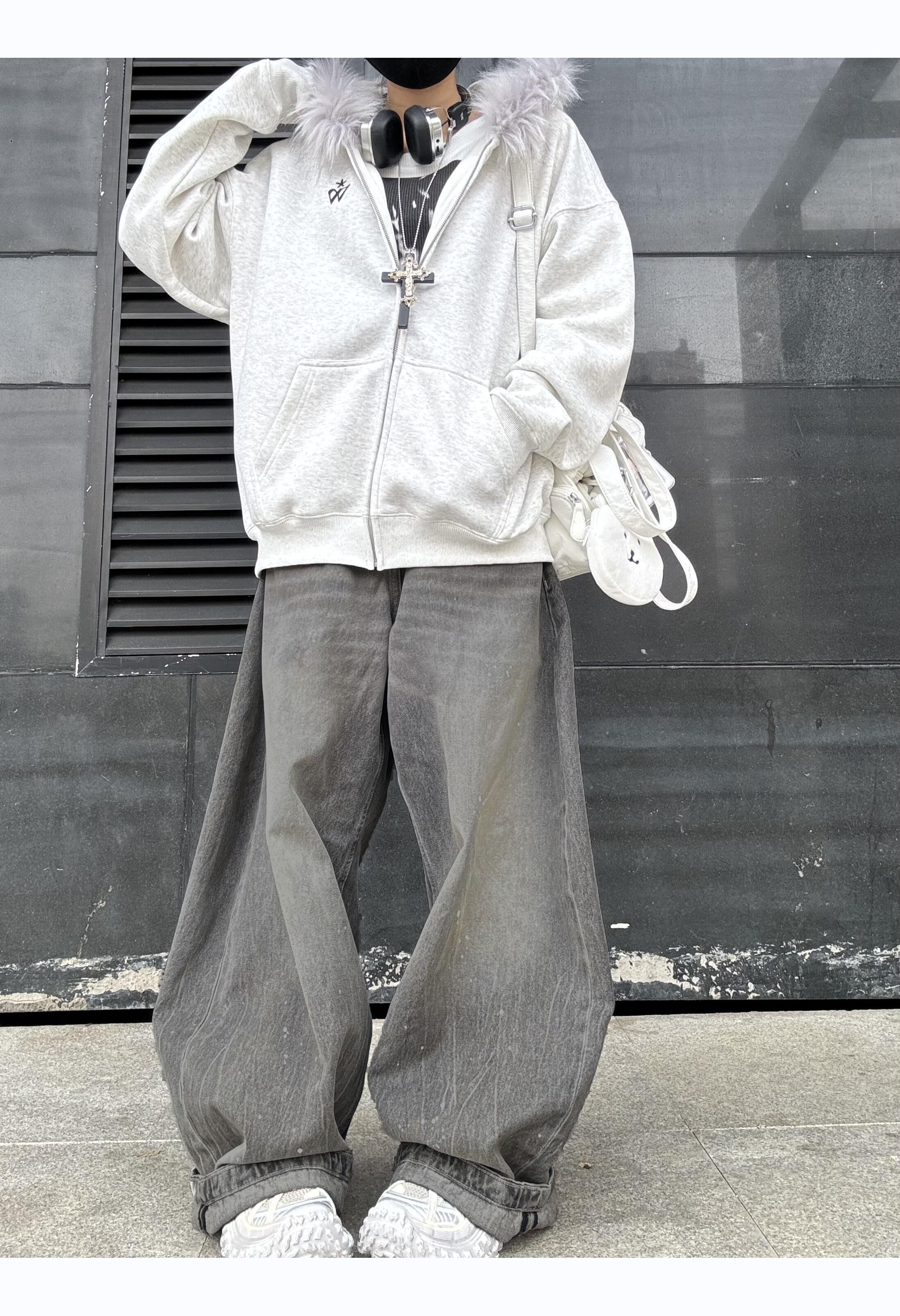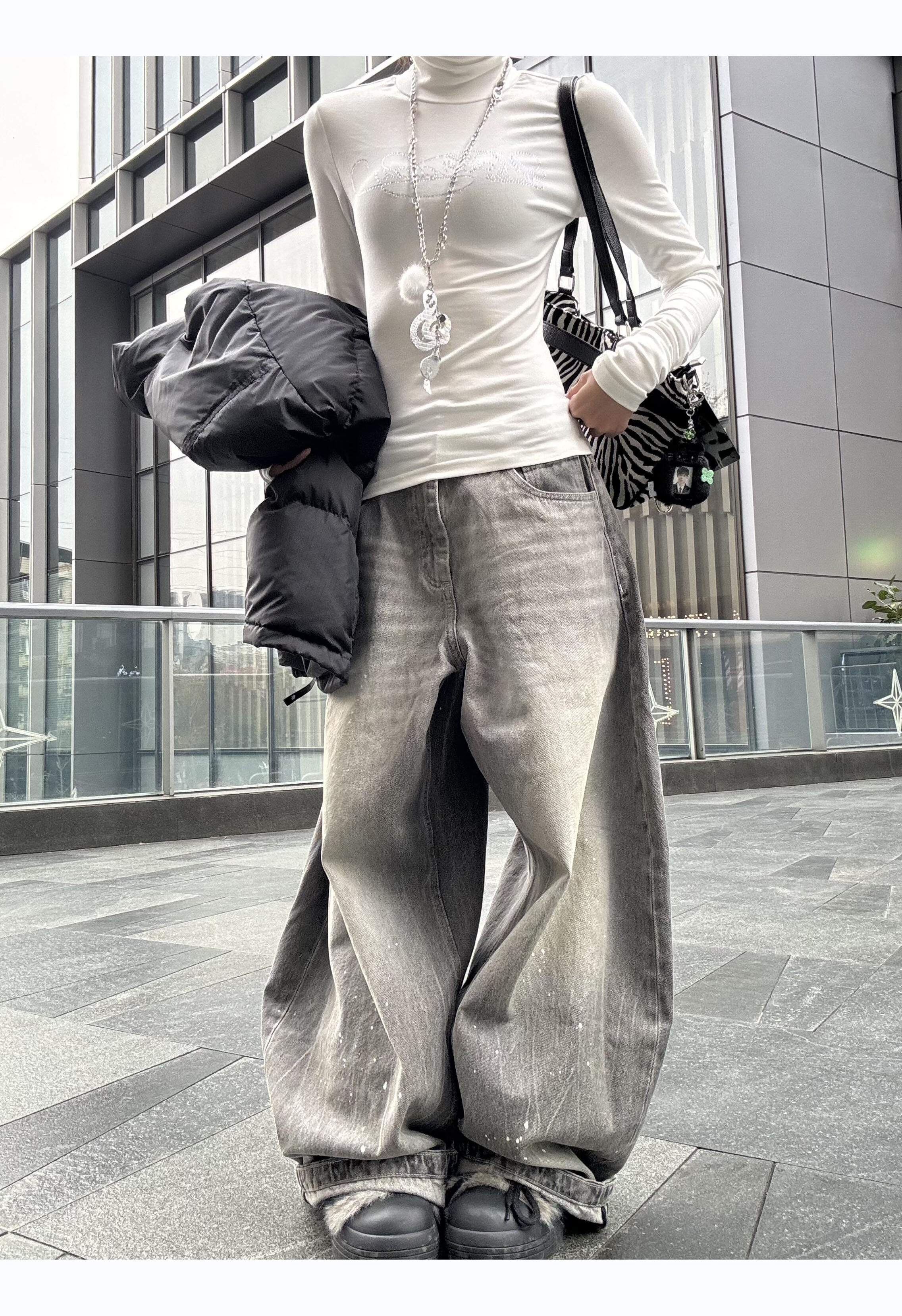 American Retro Washed Gray Distressed Splatter Denim Jeans for Men and Women, High Street Cool Casual Loose Wide-Leg Scimitar Pants