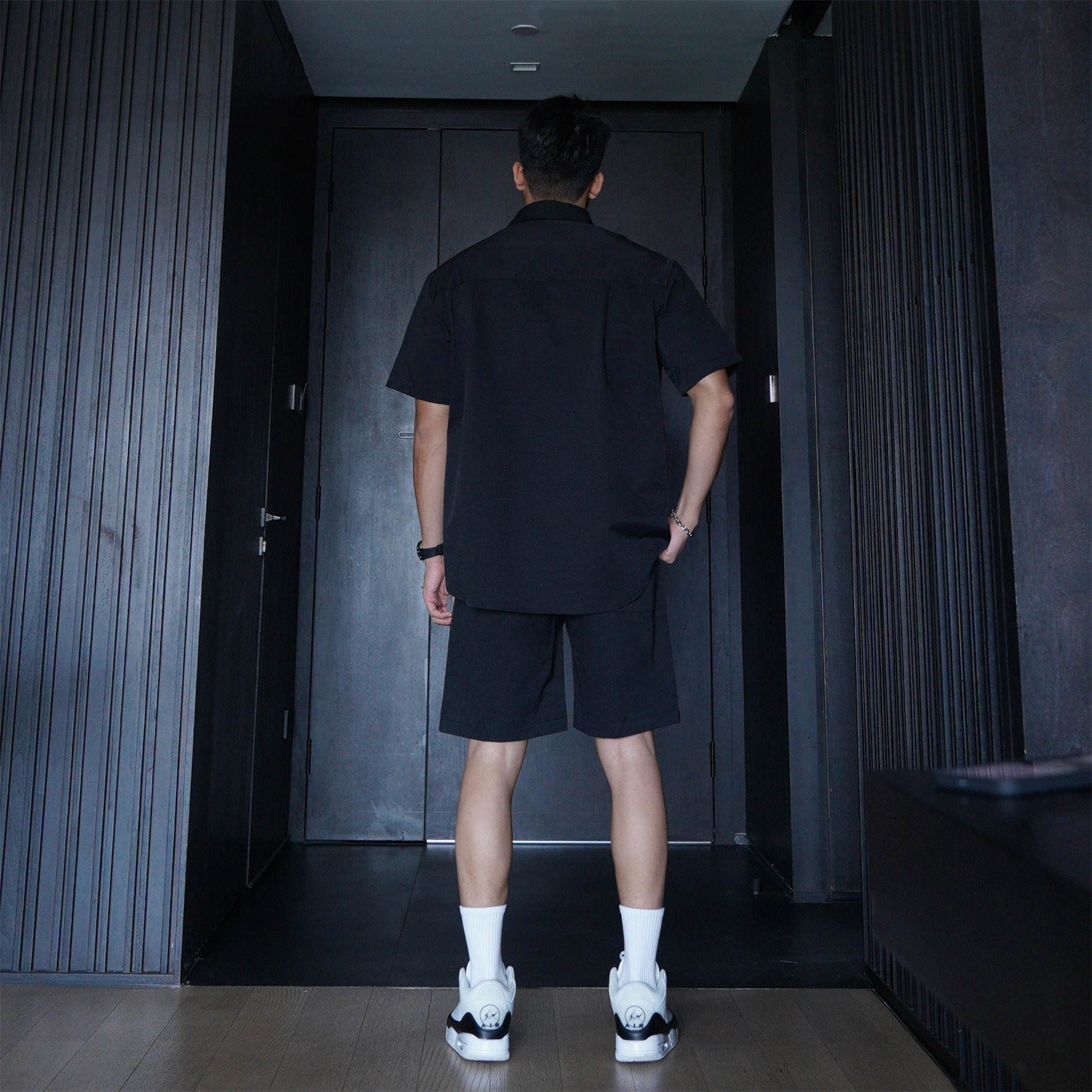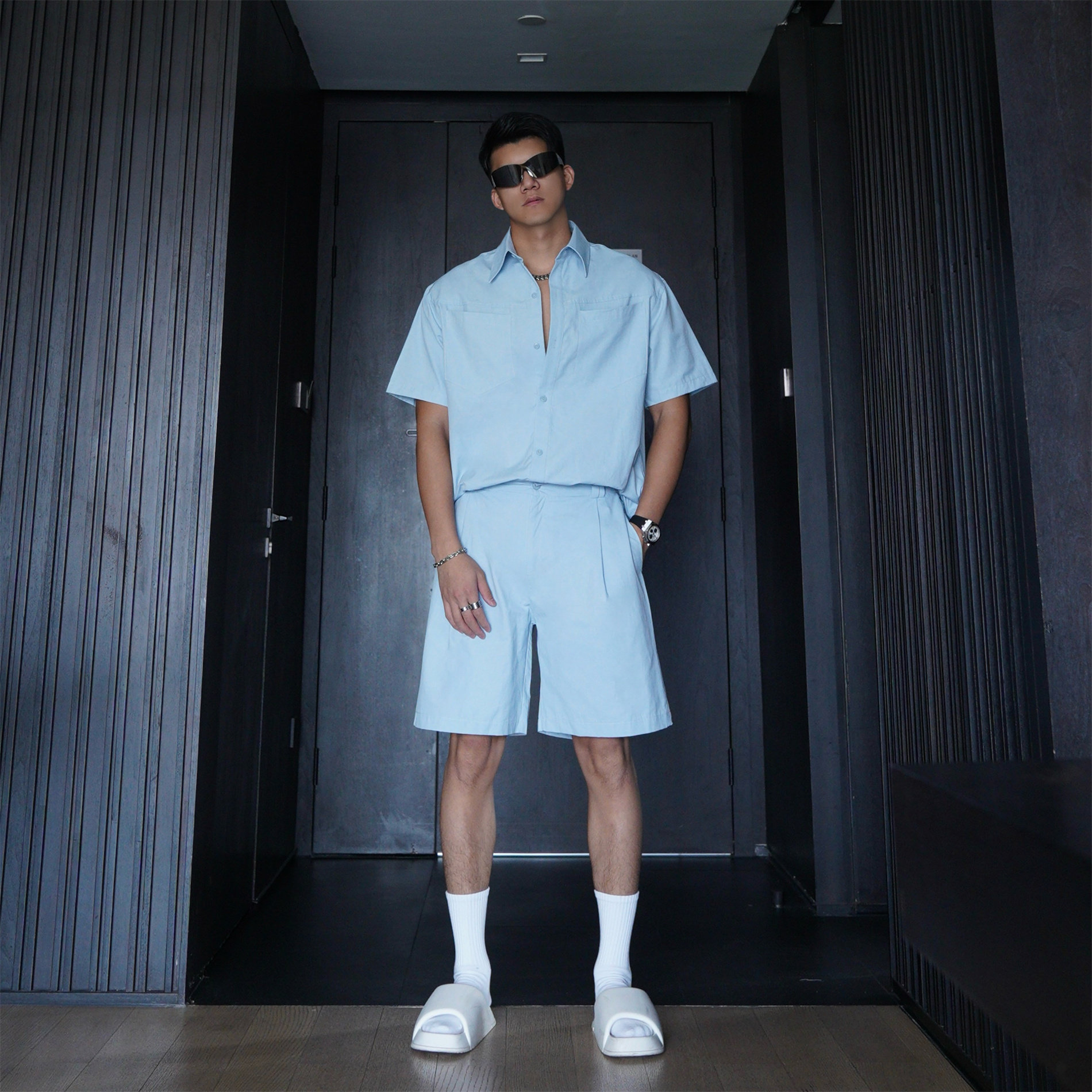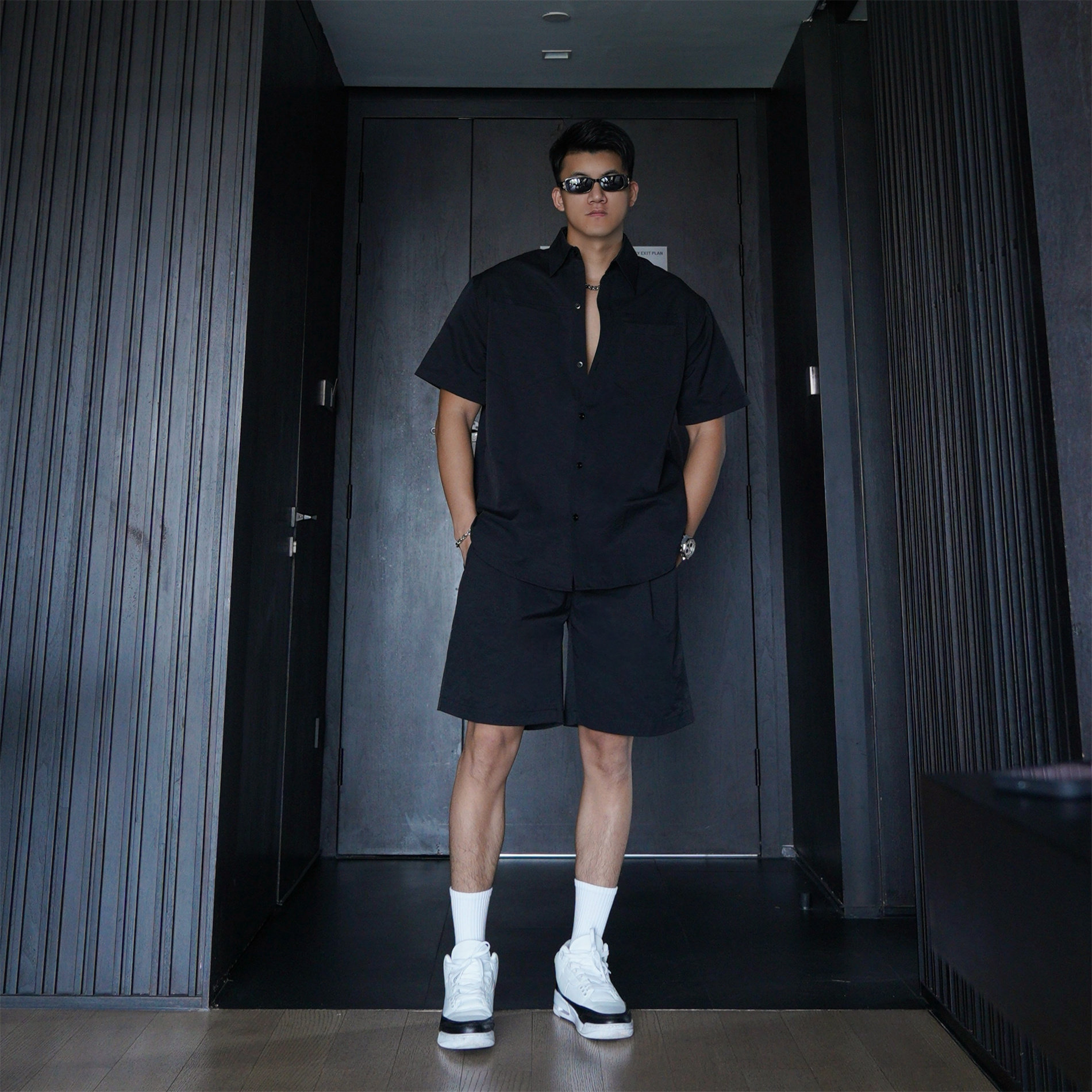 Jzd【Upper Body Looks Strong】American High Street Style Cool Fashion Set, Structured Loose Casual Short-Sleeve Shirt and Shorts