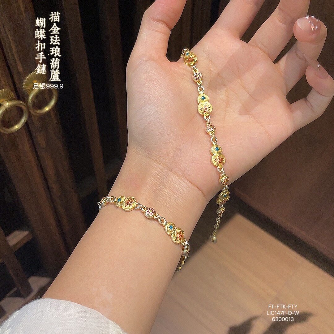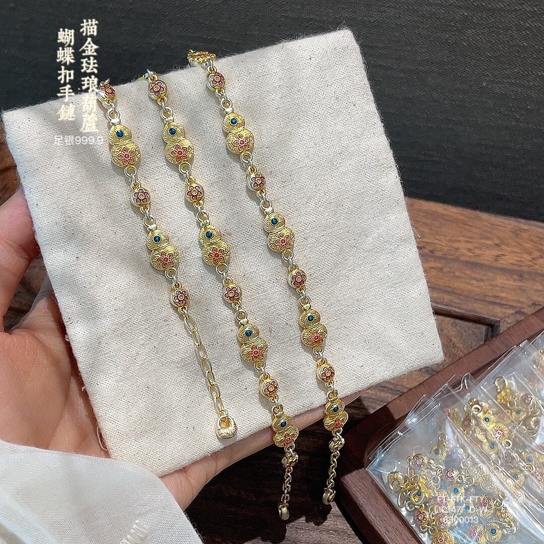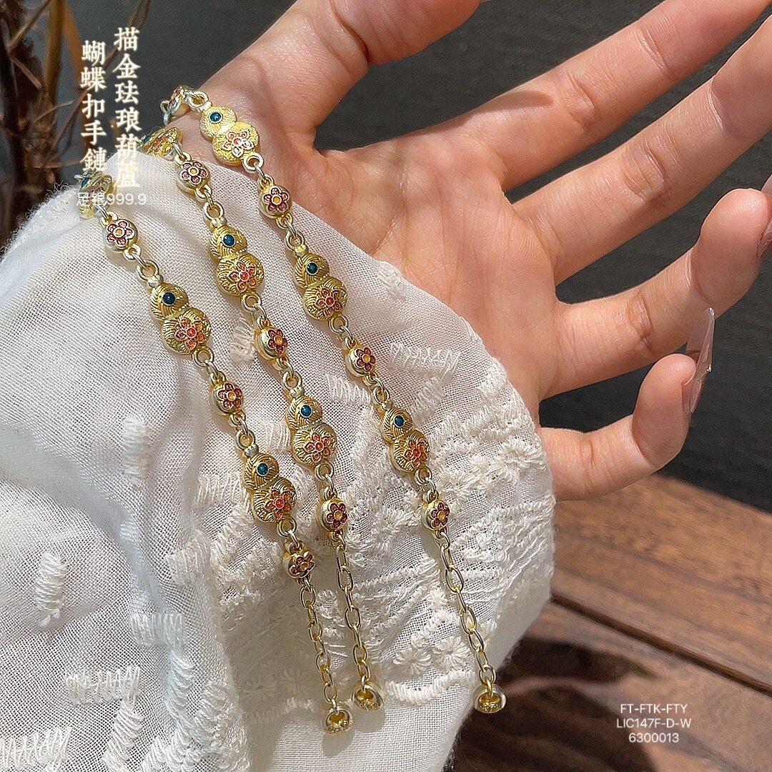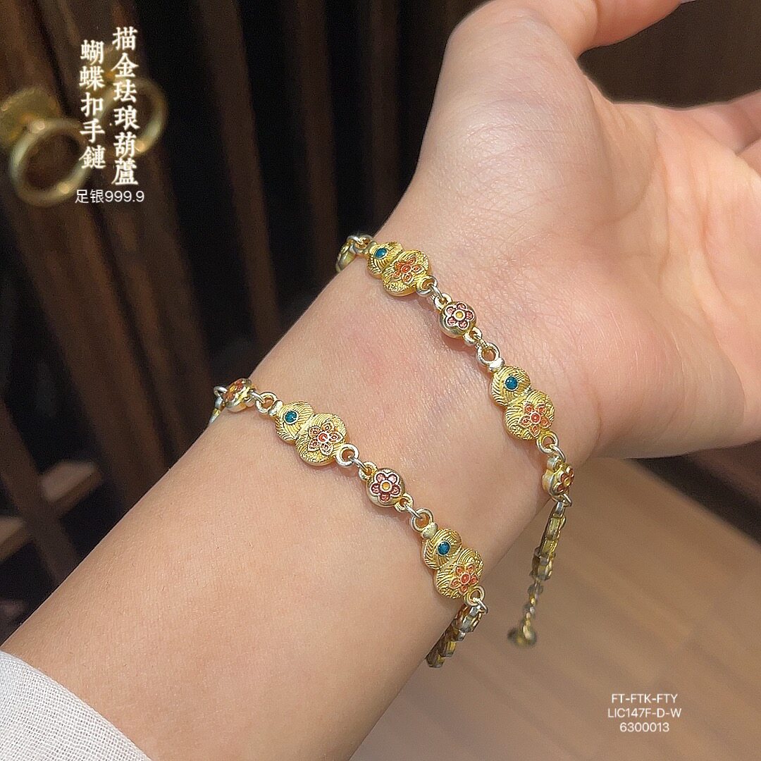 Hulu Bao Xiang Flower Bracelet Enamel Color Pure Silver 9999 Sterling Silver Gold-Plated Bracelet for Women New Chinese Style National Style Bracelet